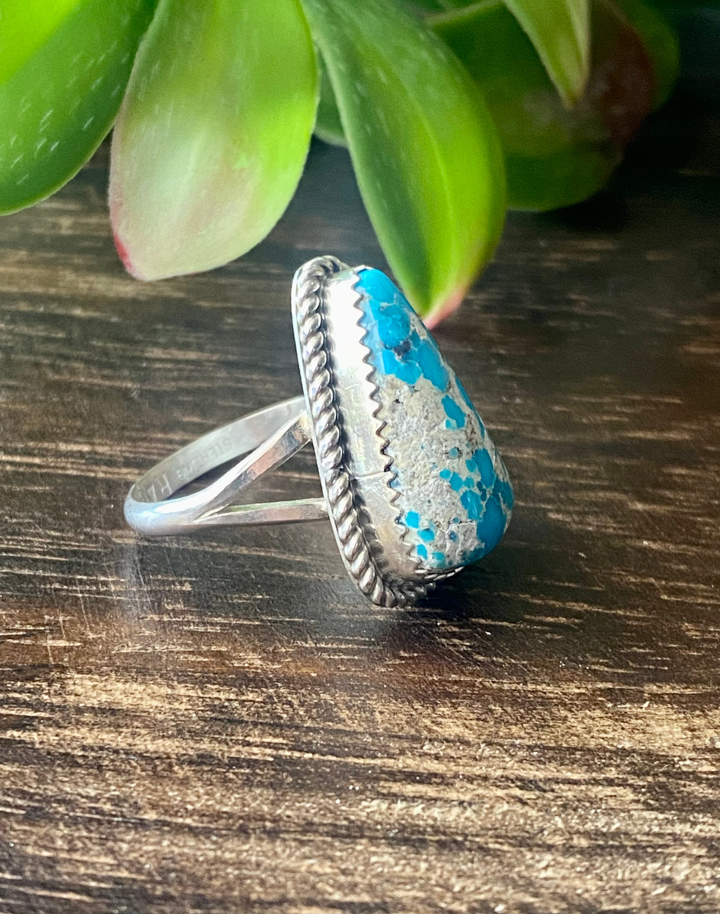 Reda Galvan South Hill Turquoise & Sterling Silver Ring Size 9.5. It measures 1 inch long and just under 3/4 of an inch wide. Signed by the artist and stamped sterling silver.