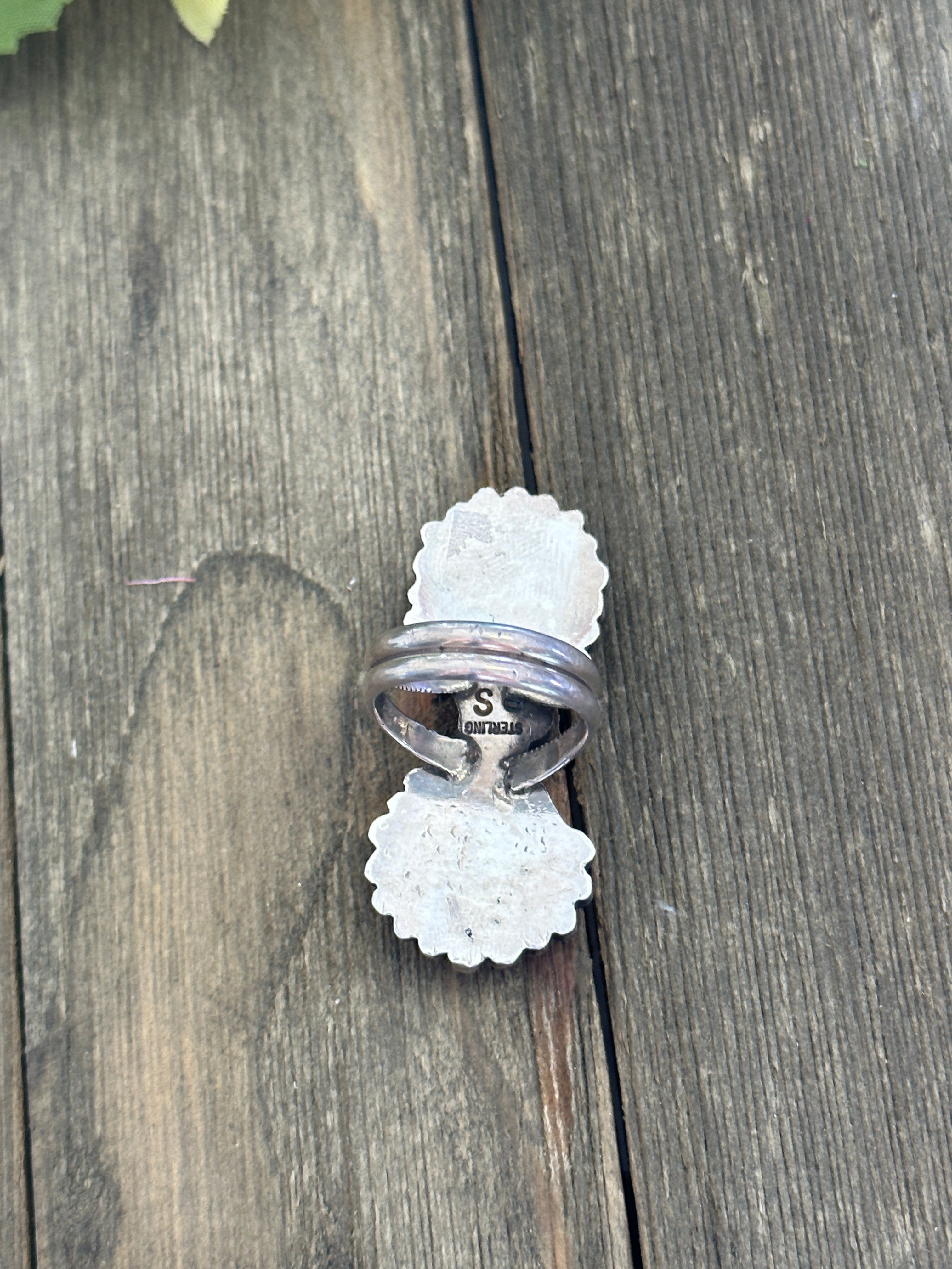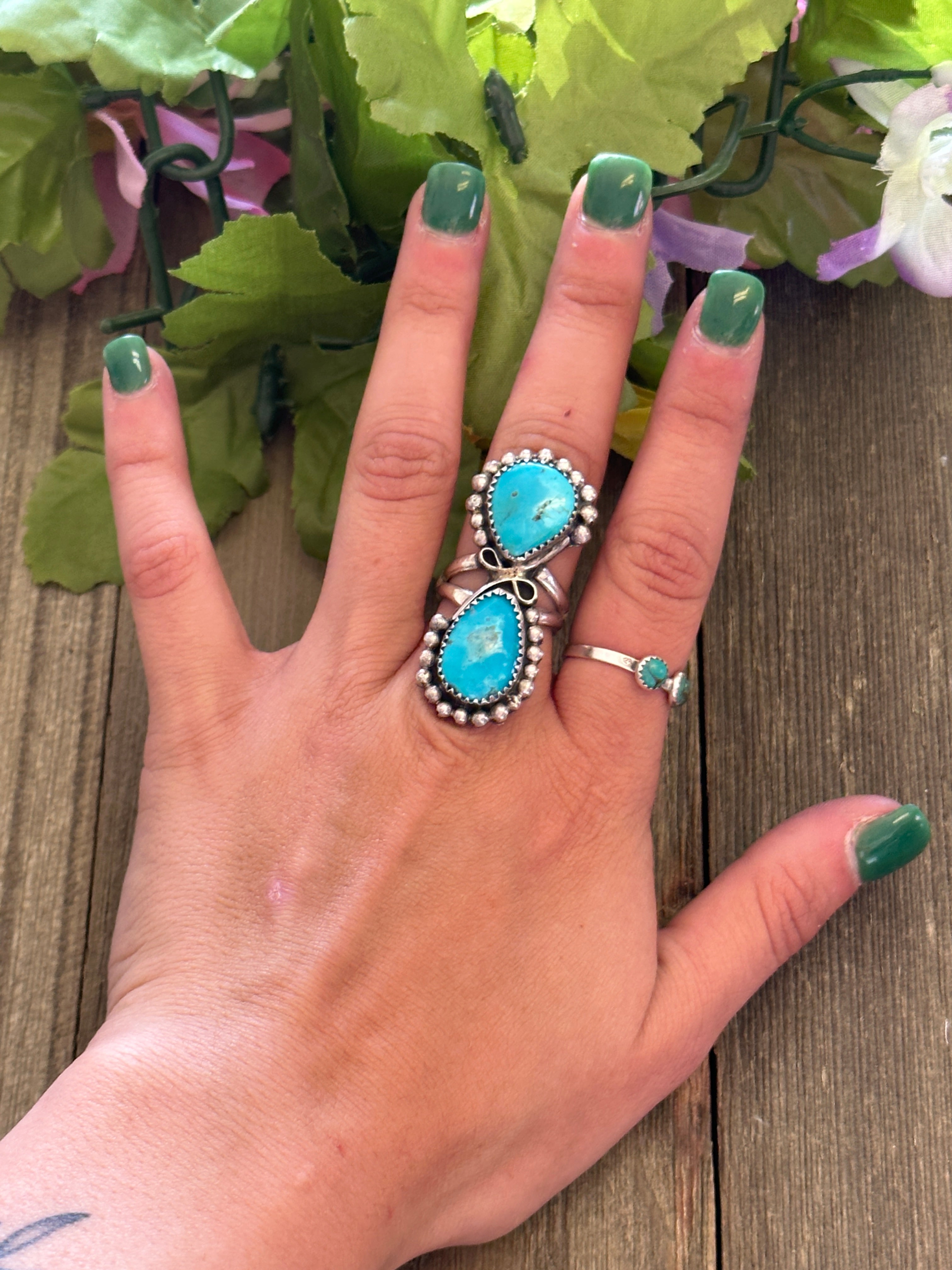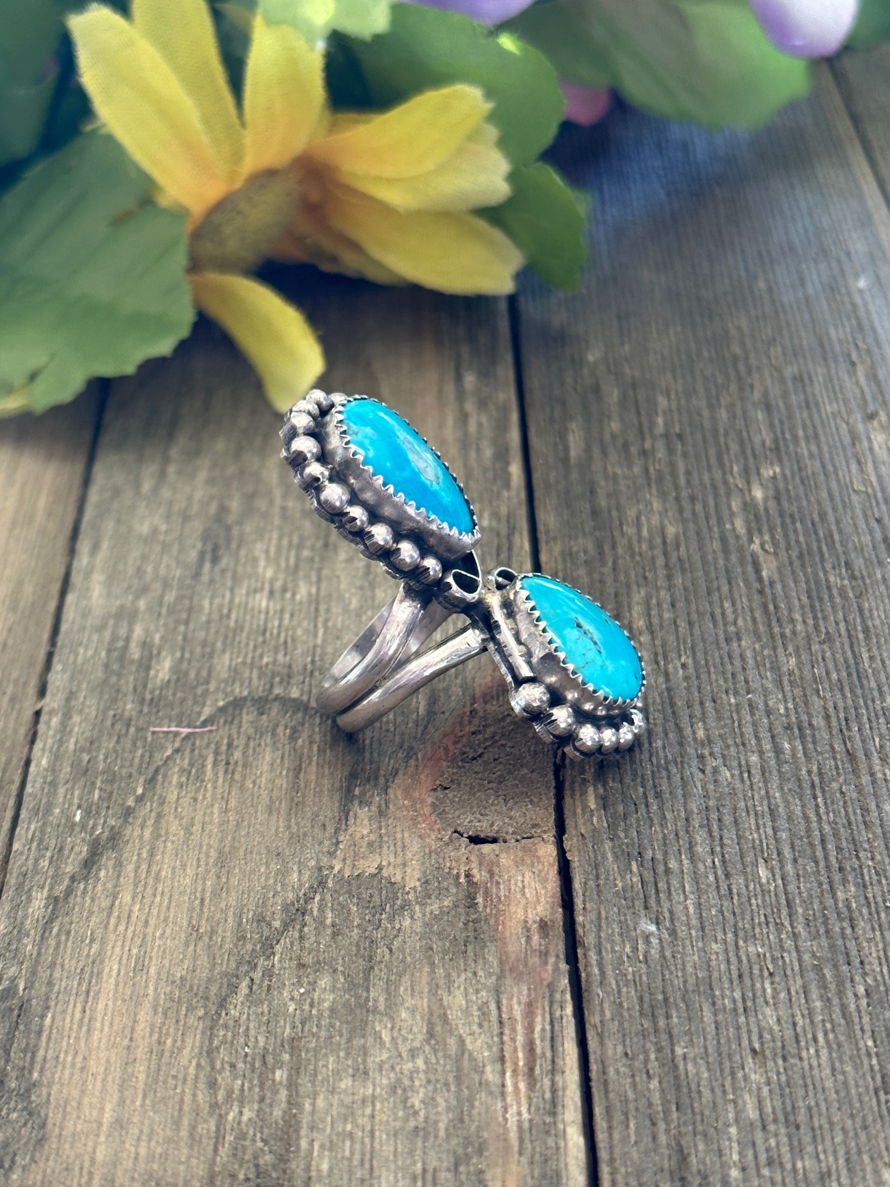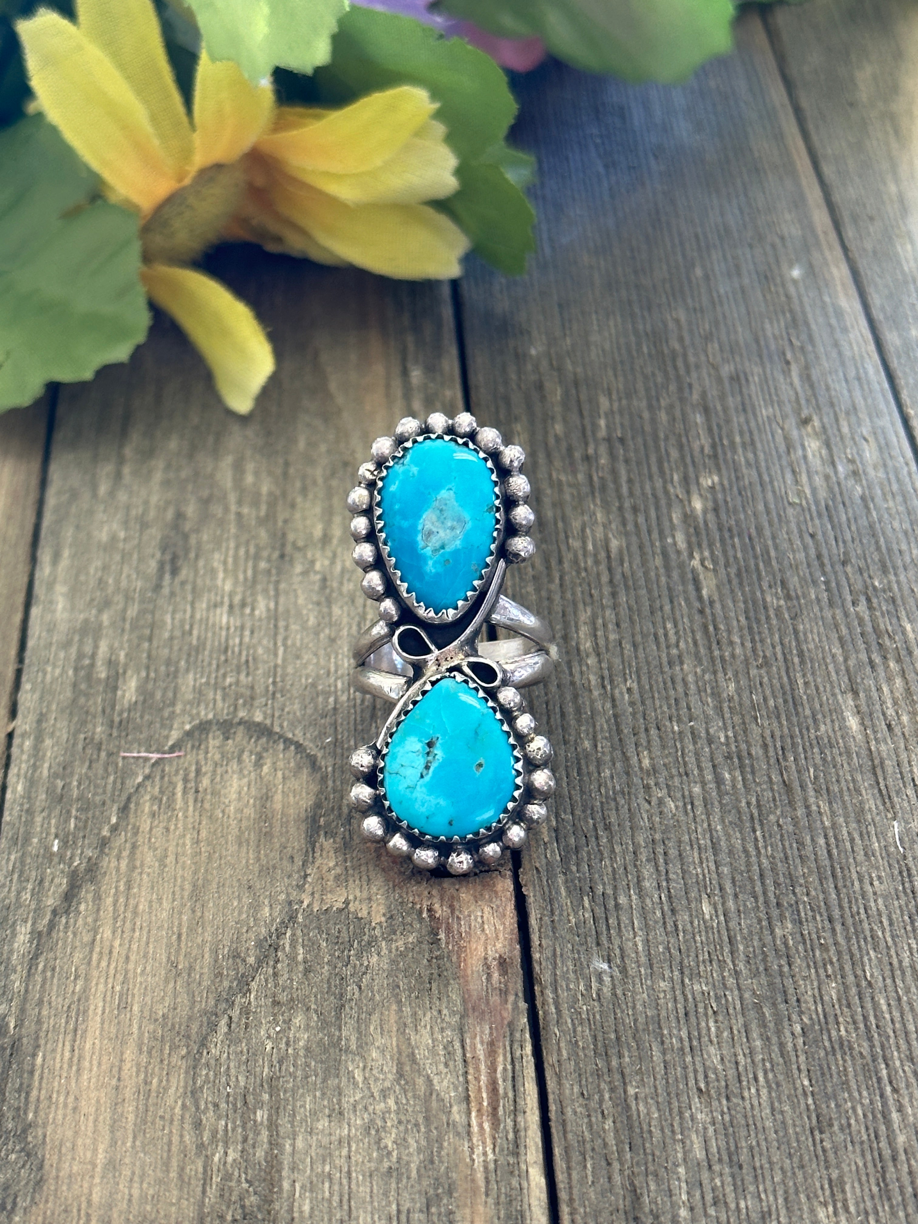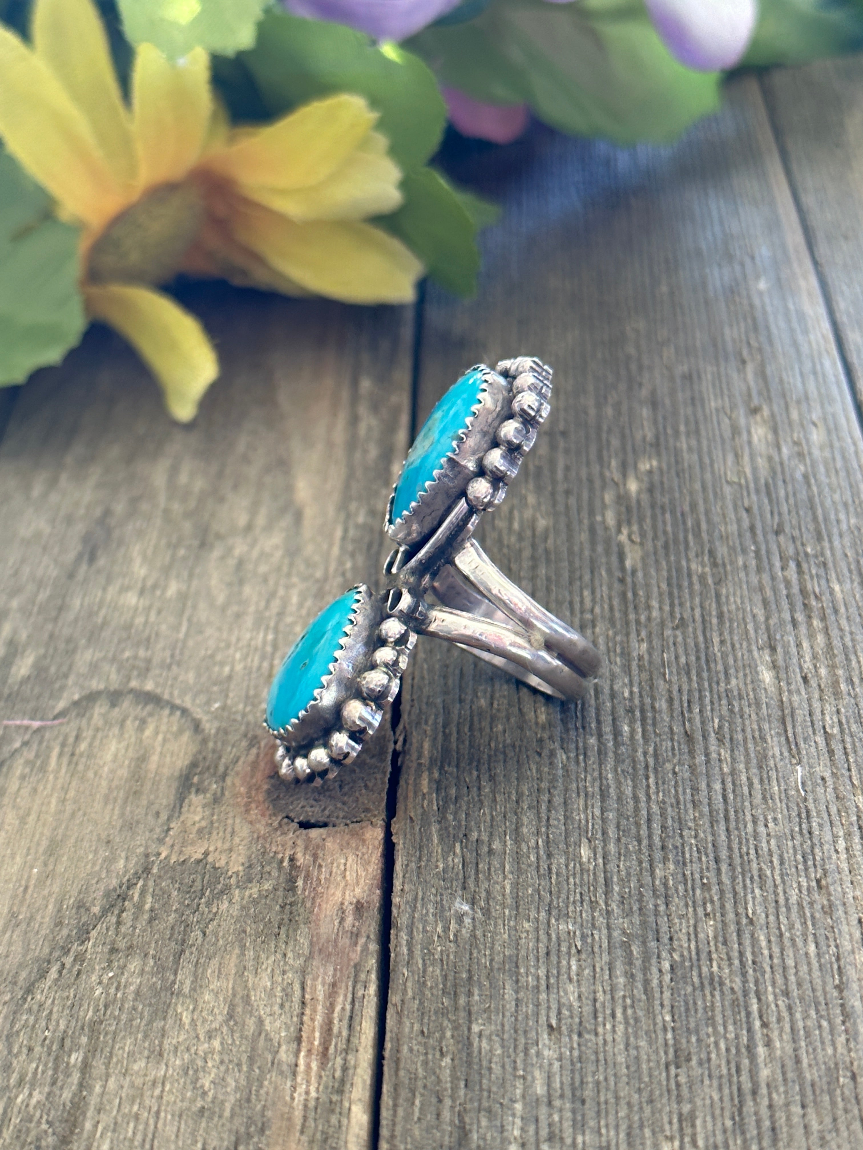 Rena Shelly Kingman Turquoise & Sterling Silver Ring Size 6.5. It measures 1 3/4 inches long and just over 3/4 of an inch wide. Signed by artist and stamped sterling silver.