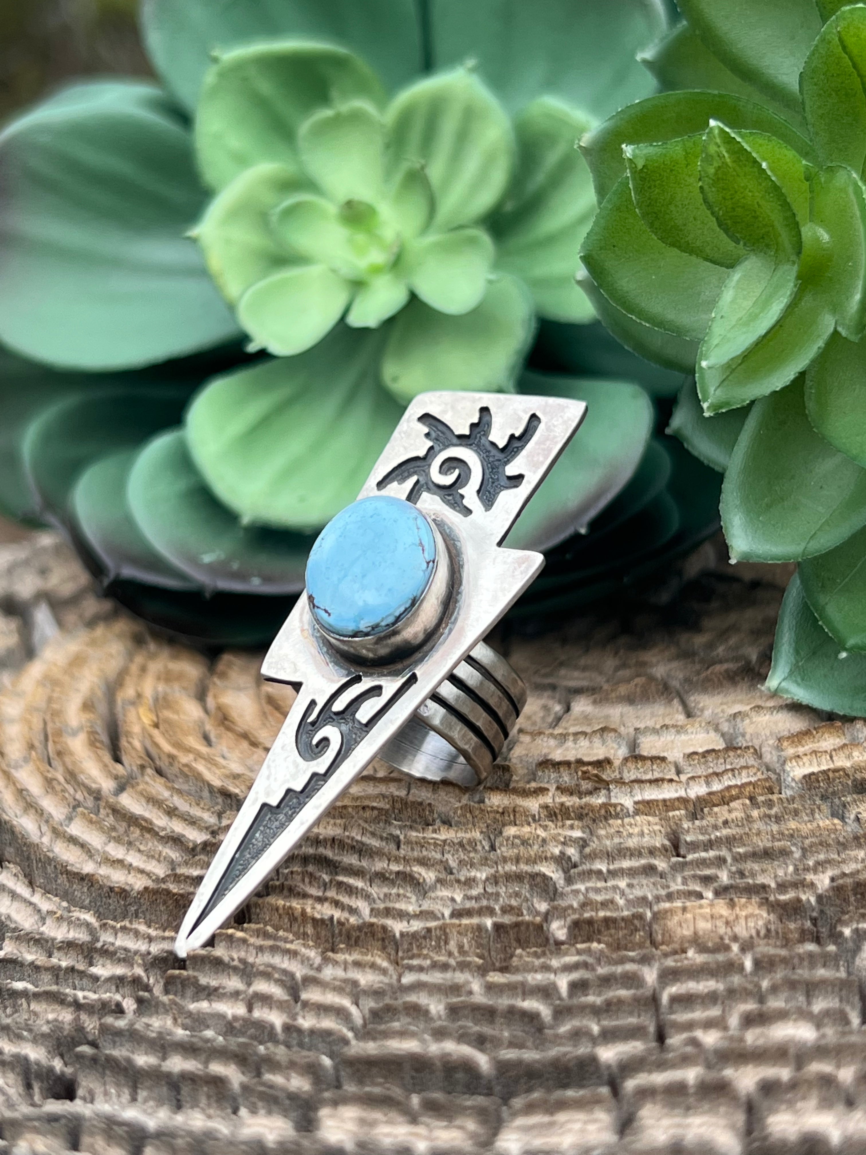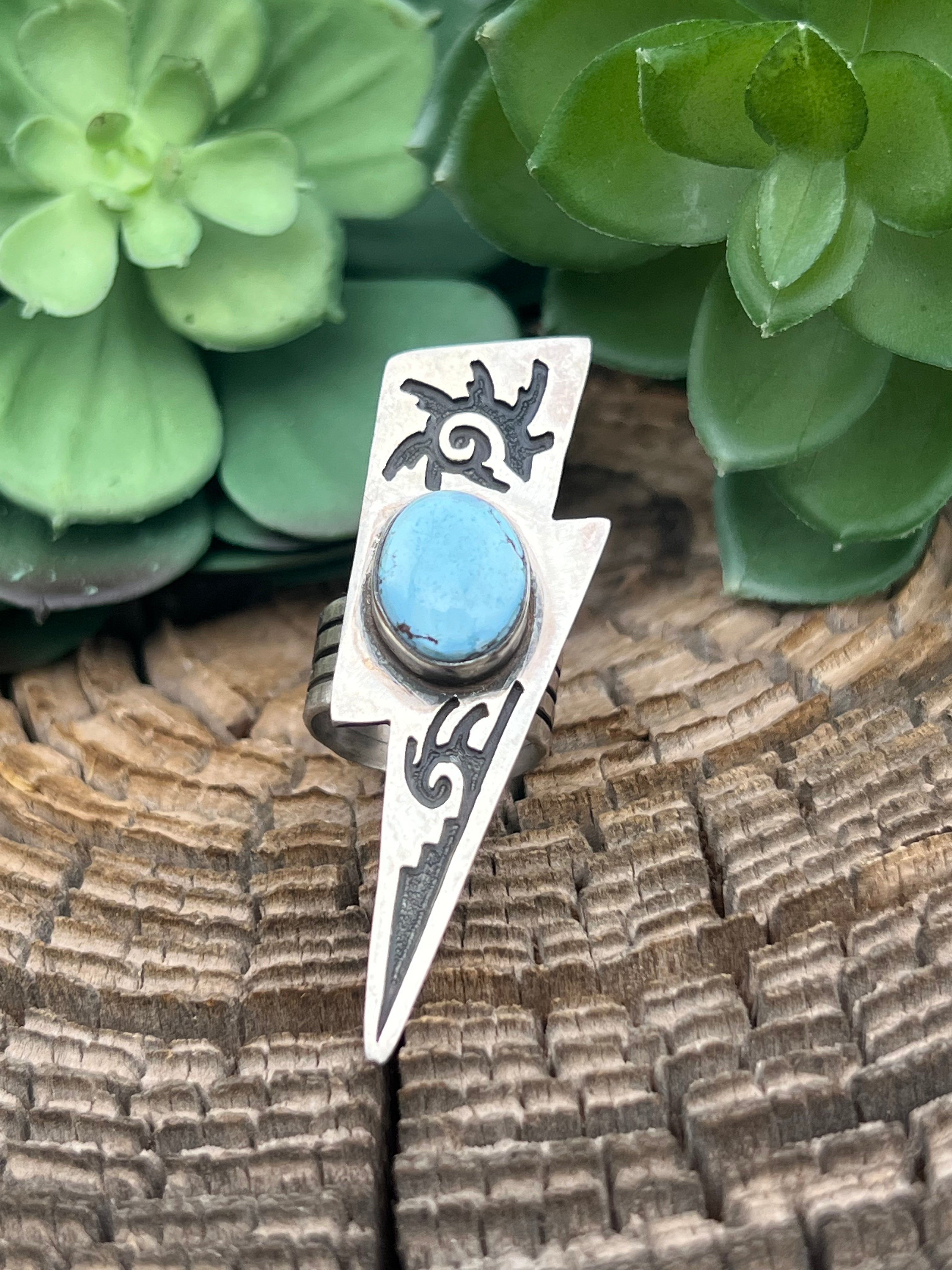 Navajo Golden Hill Turquoise & Sterling Silver Overlay Lightning Bolt Ring Size 7.5