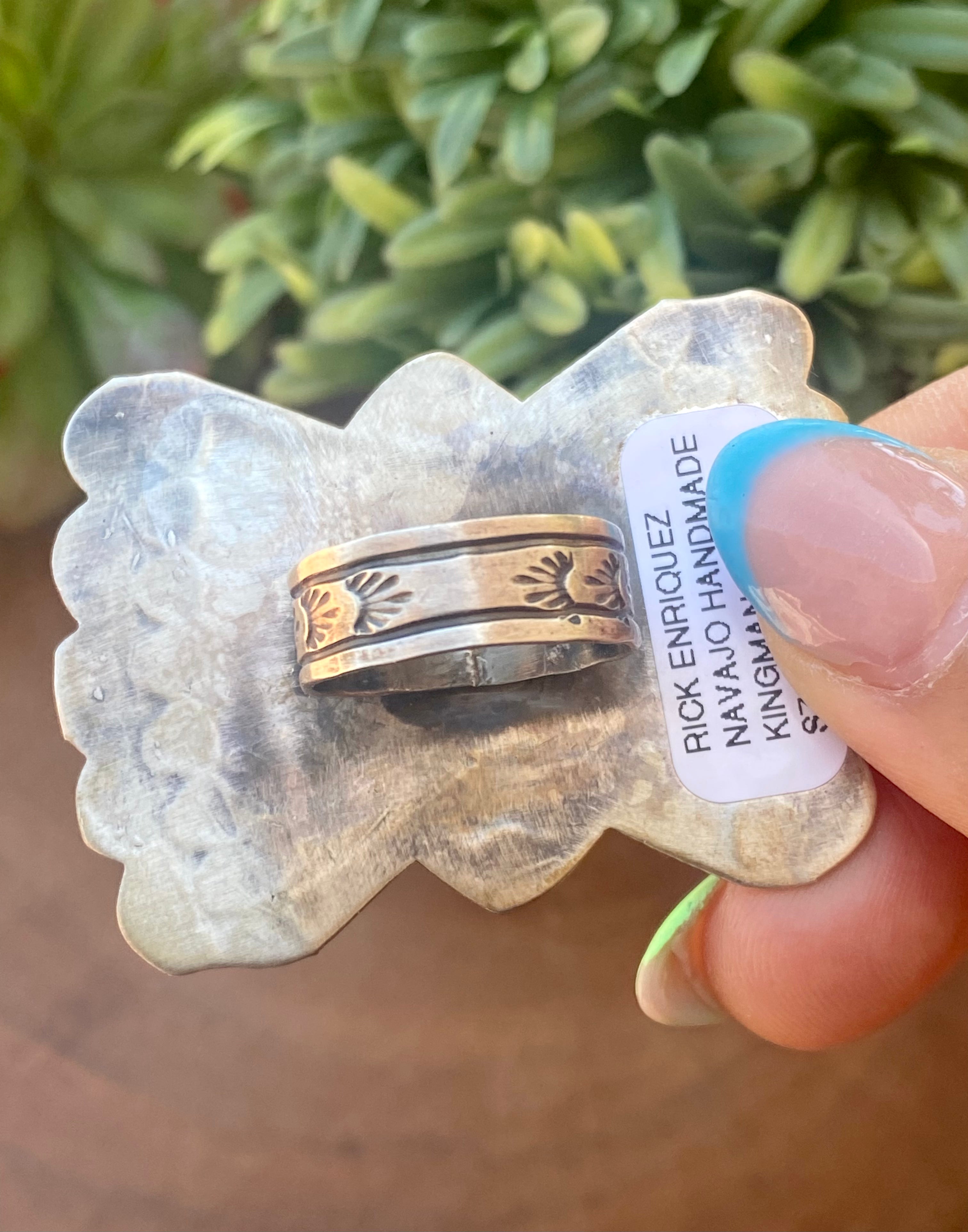 Rick Enriquez Kingman Turquoise & Sterling Silver Ring Size 7.5. It measures just over 1 1/2 inches long and 2 1/8 inches wide. Signed by the artist and stamped sterling silver.