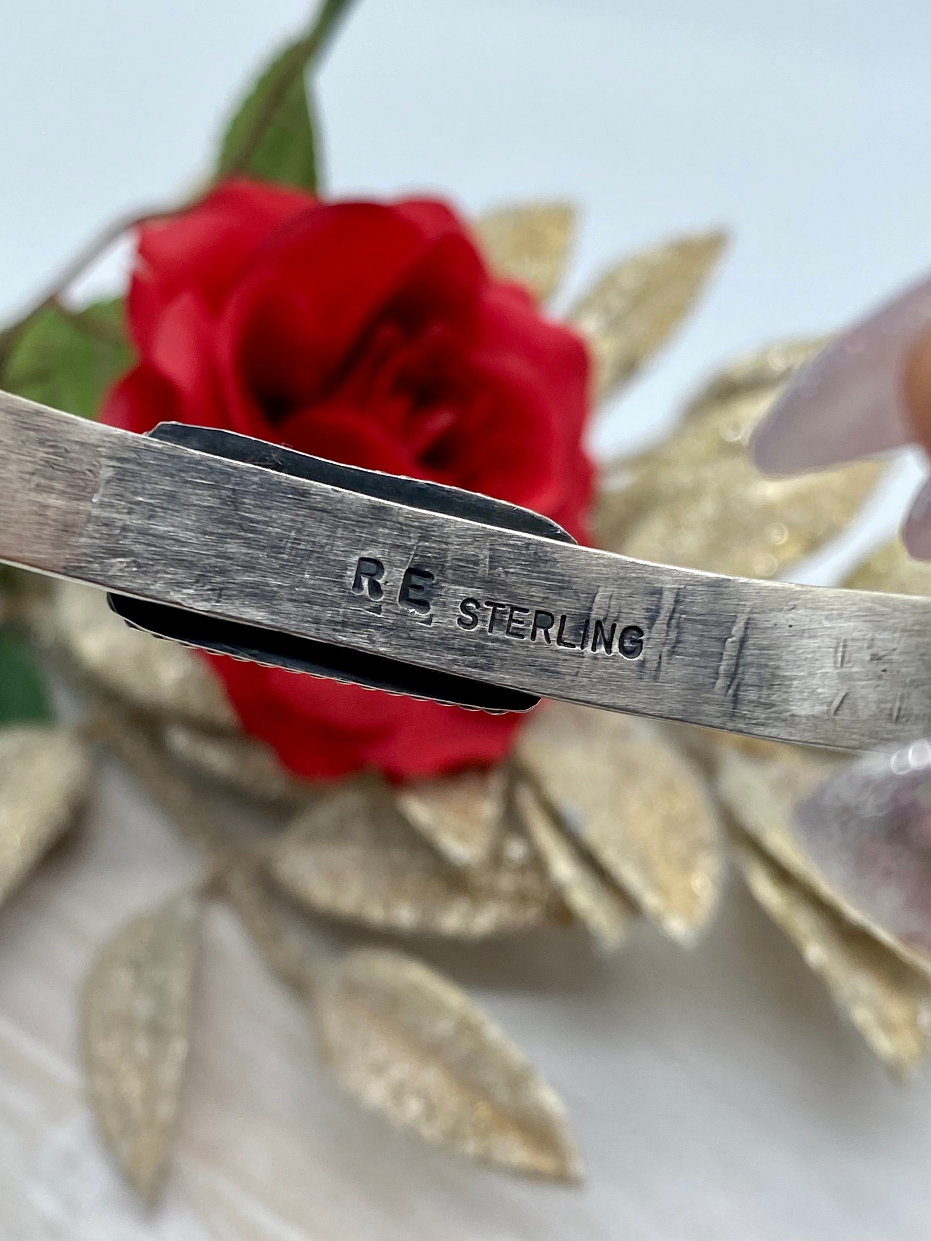 Rick Enriquez Pink Mohave Turquoise & Sterling Silver Cuff Bracelet. It measures 1/2 of an inch wide with an inside circumference of 5 1/2 inches and a gap of 1 1/2 inches. Signed by the artist and stamped sterling silver.