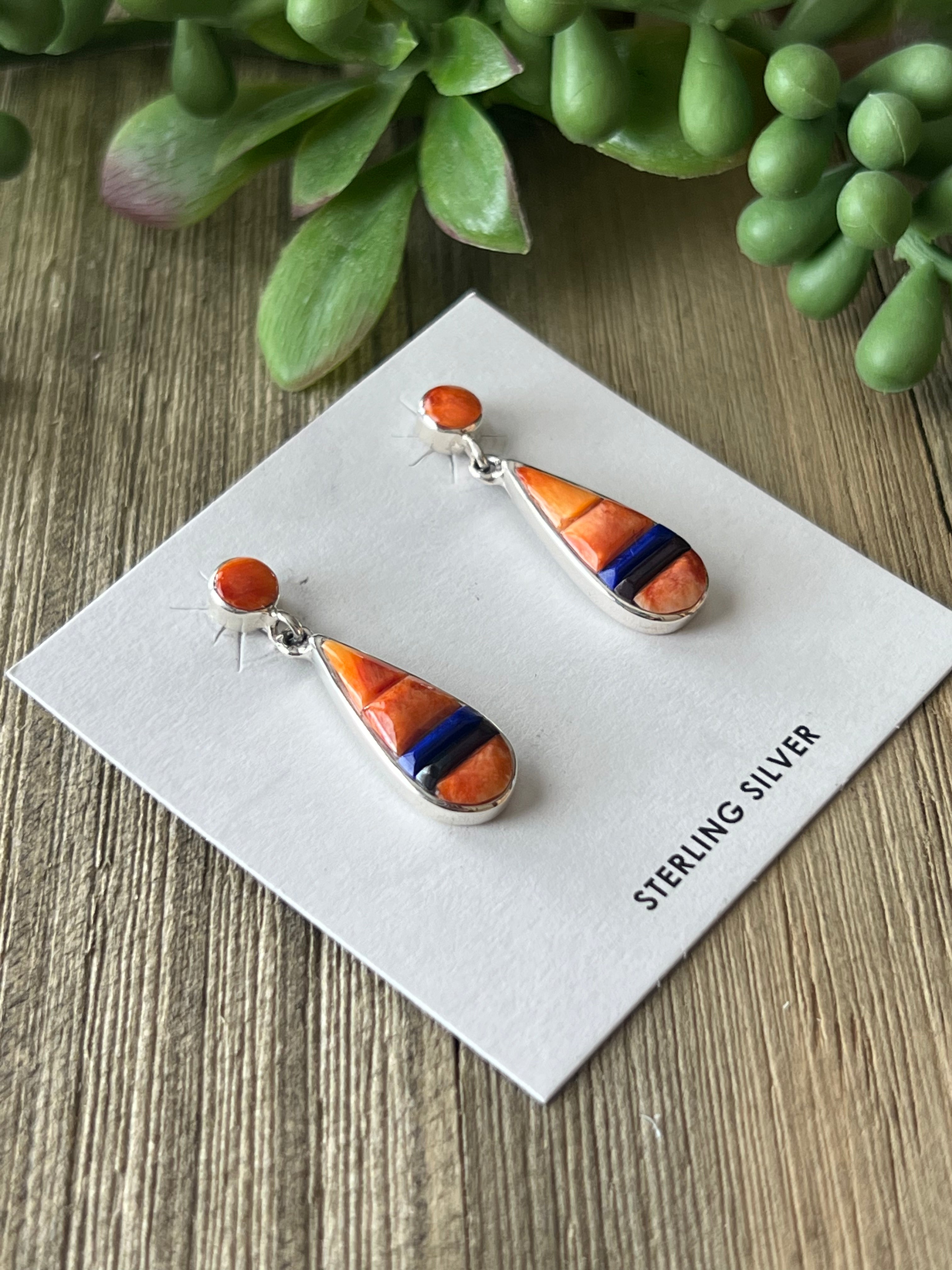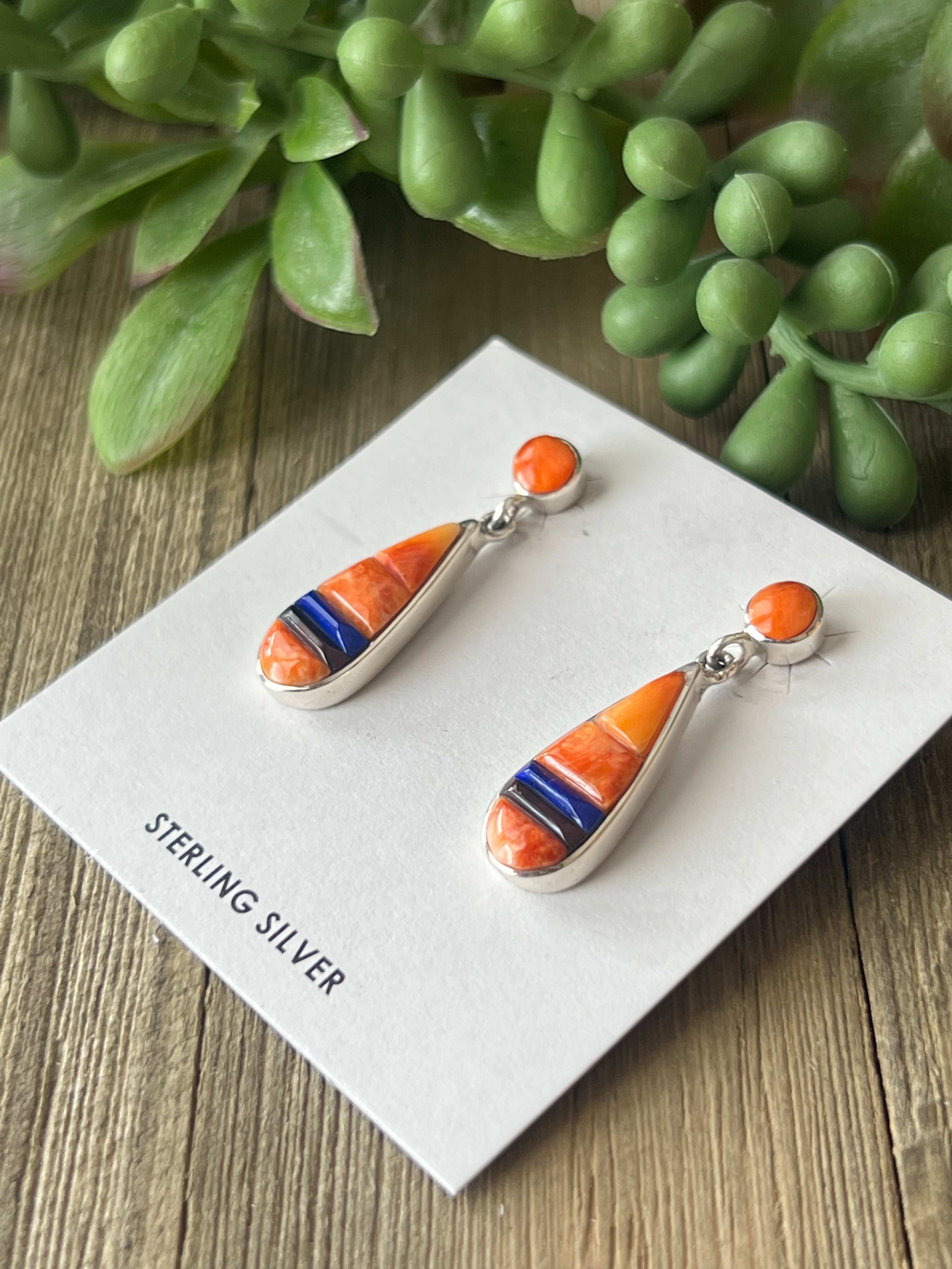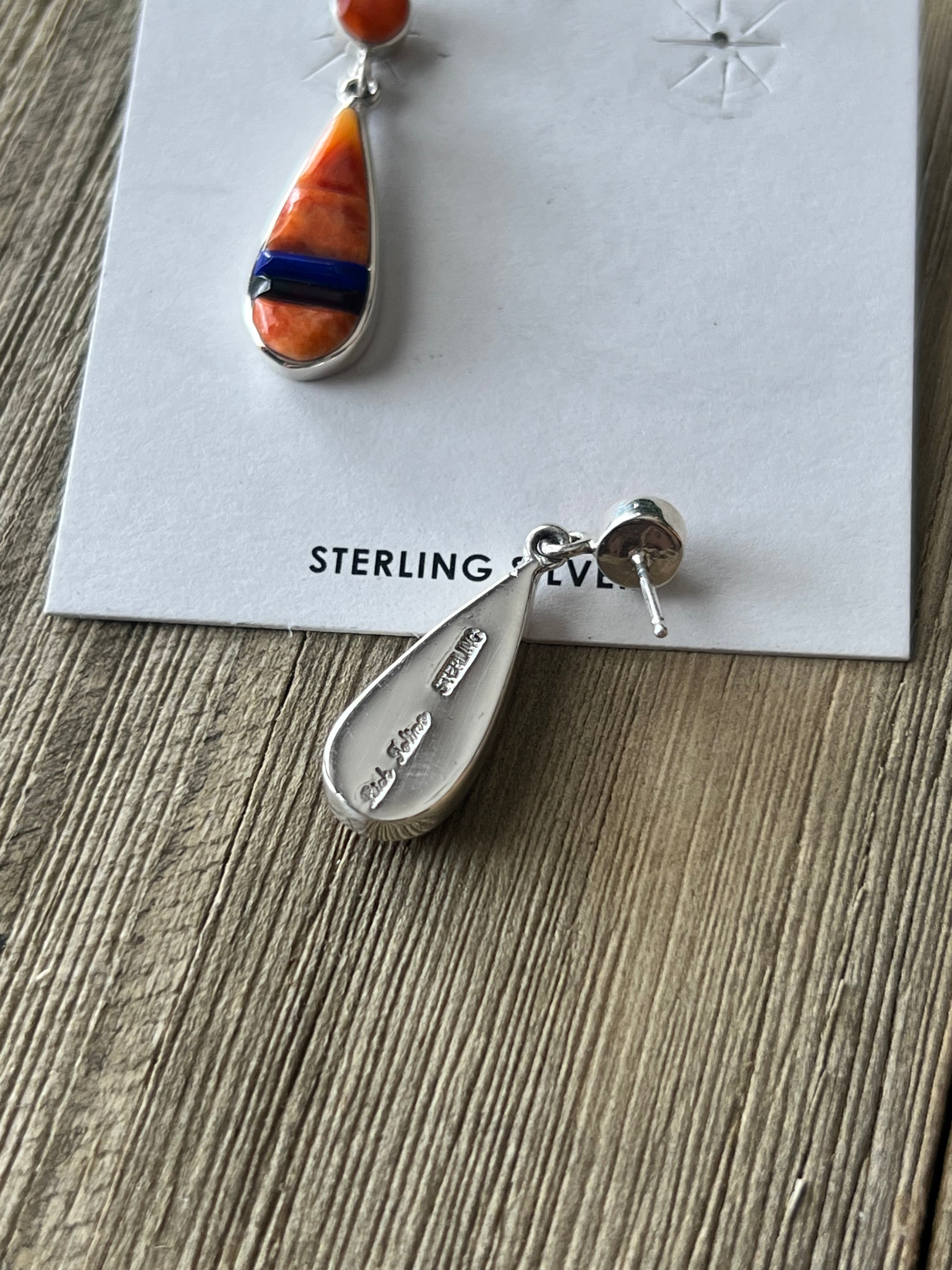 Rick Toline Multi Stone & Sterling Silver Post Dangle Inlay Earrings. It measures 1 3/8 inches long and just over 3/8 of an inch wide. Signed by artist and stamped sterling silver.