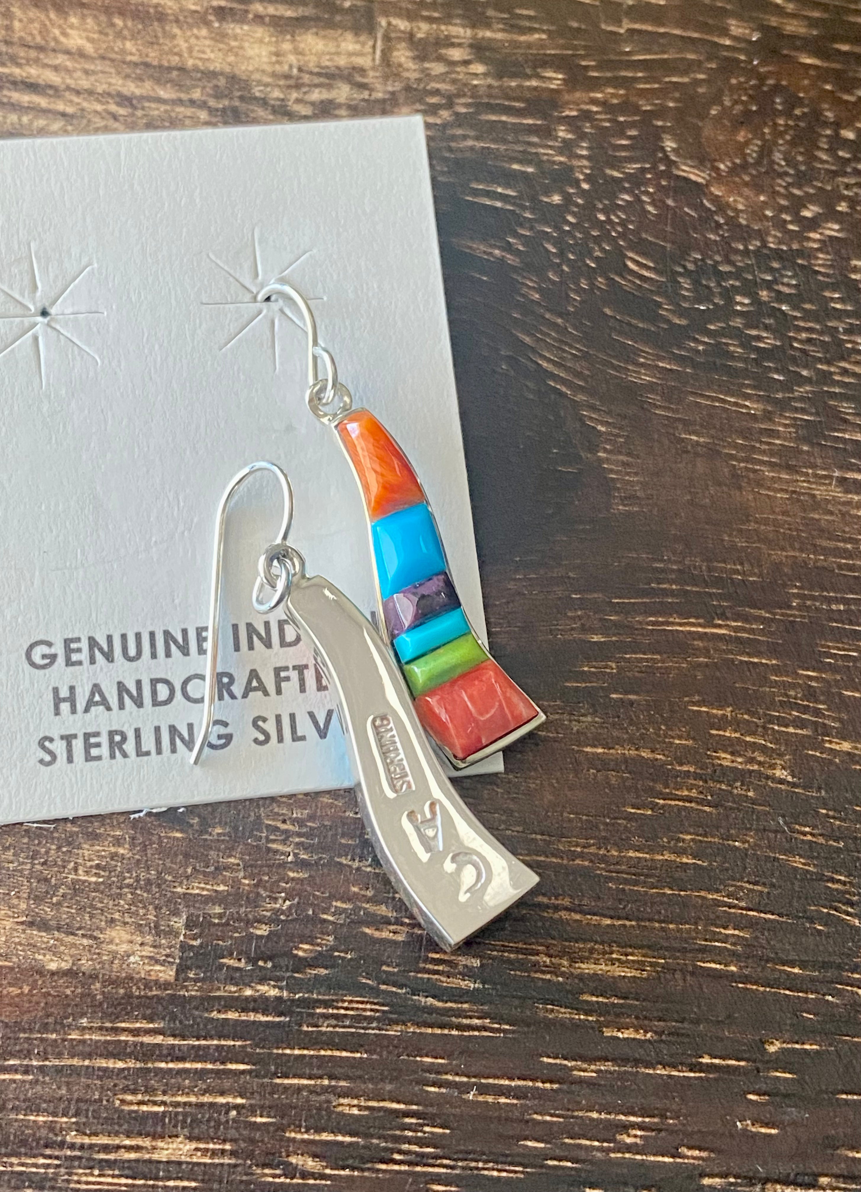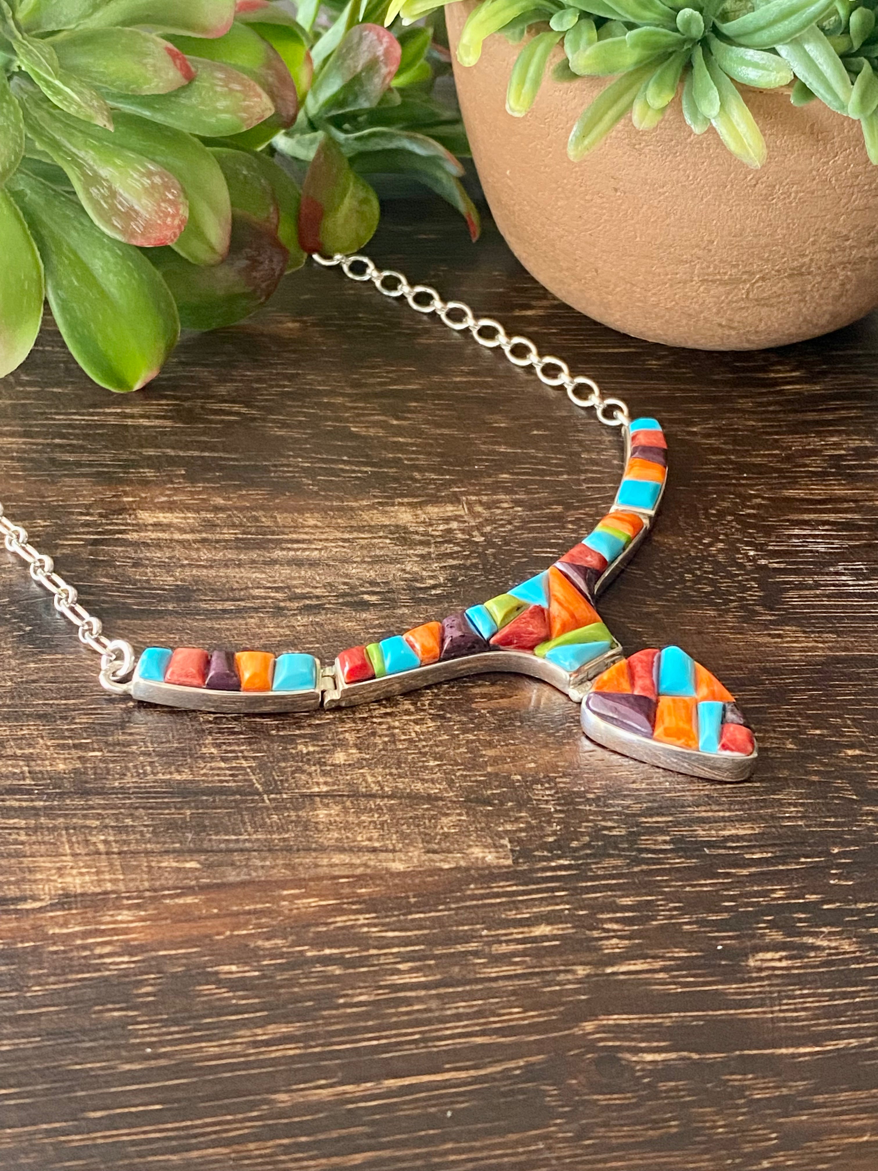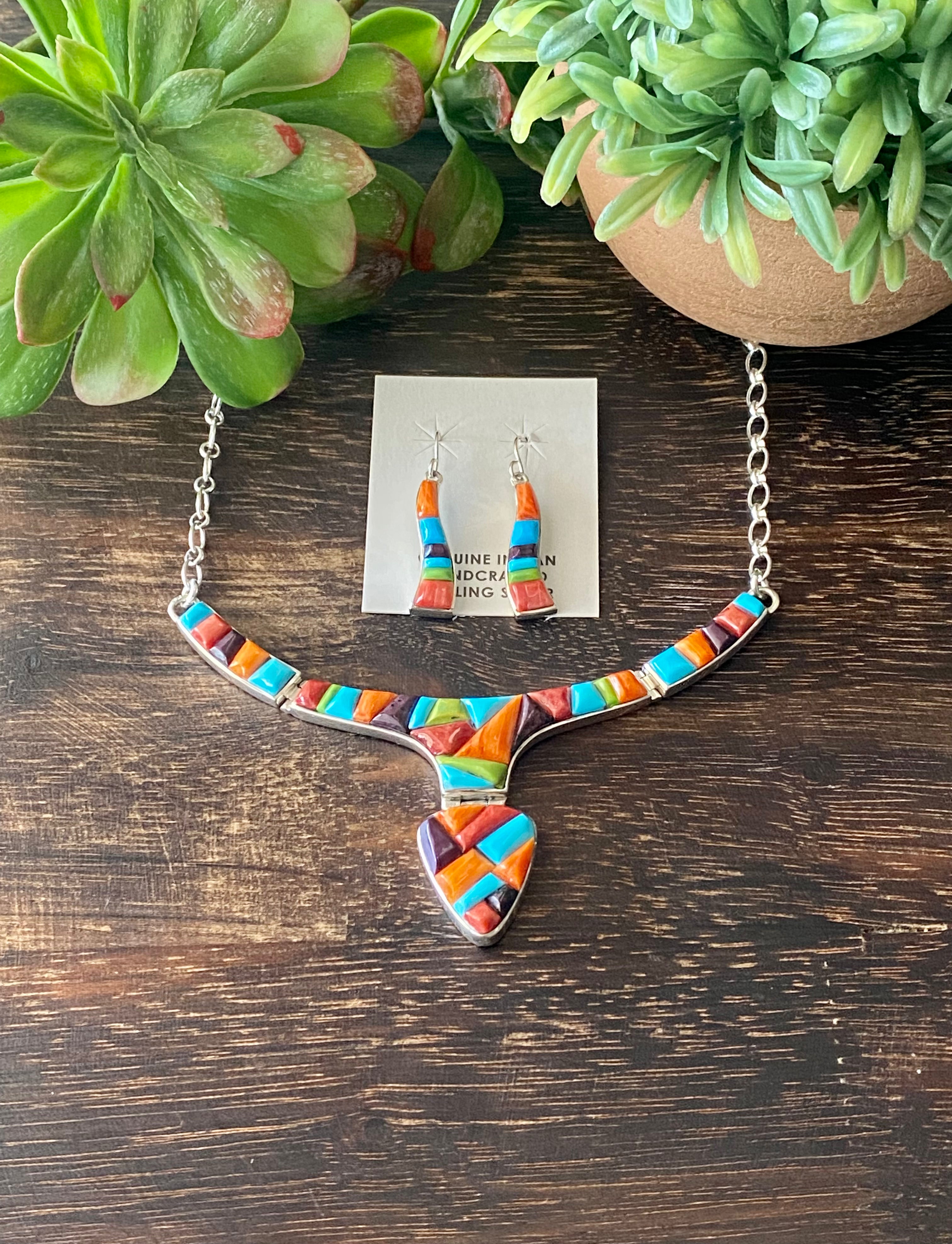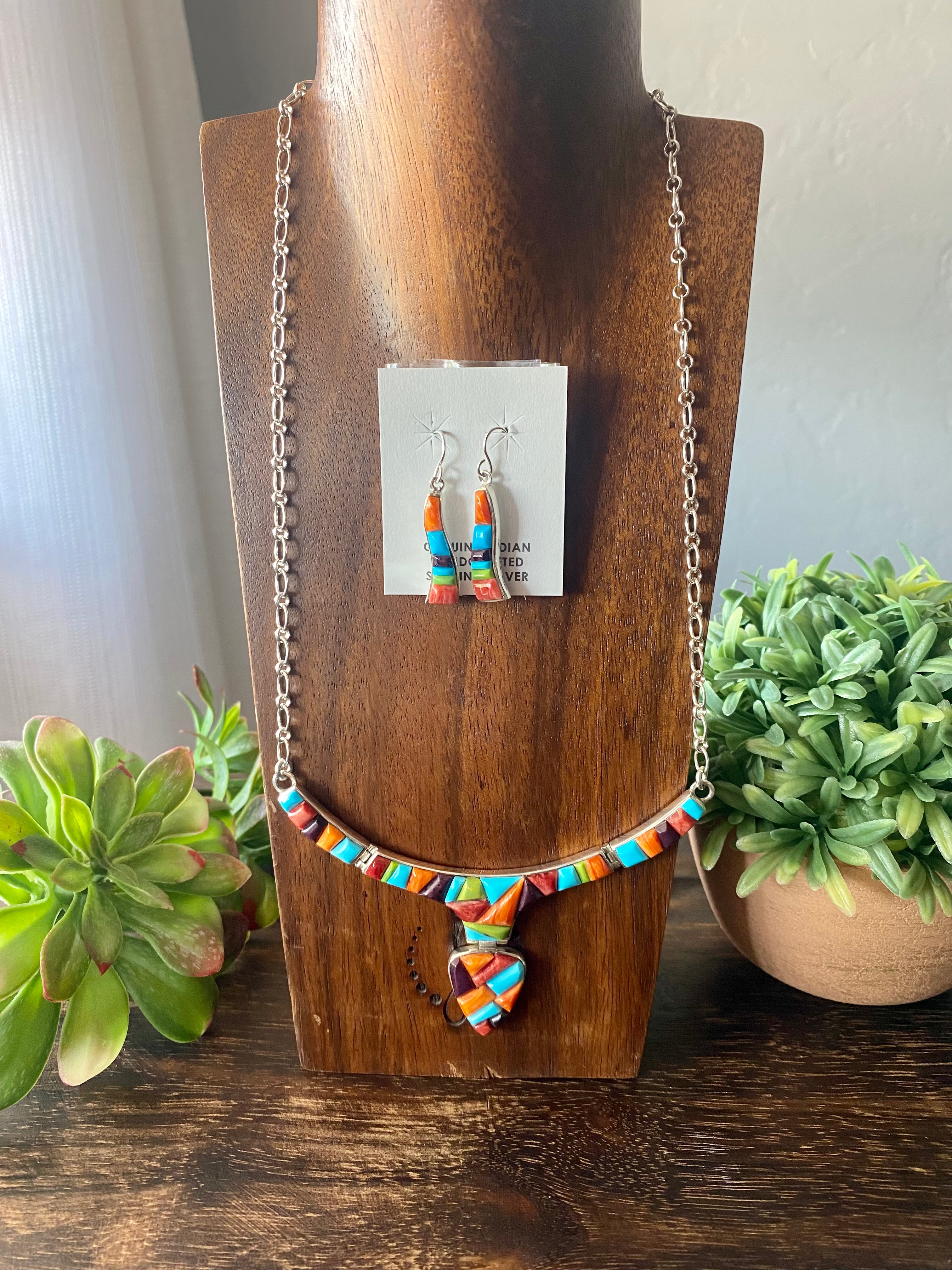 Rick Tolino Multi Stone & Sterling Silver Cobblestone Necklace Set. The necklace measures just over 21 inches long with hang while the chain by itself measures 17 inches long. The earrings are 1 1/2 inches long and just over 1/4 of an inch wide. Signed by the artist and stamped sterling silver.