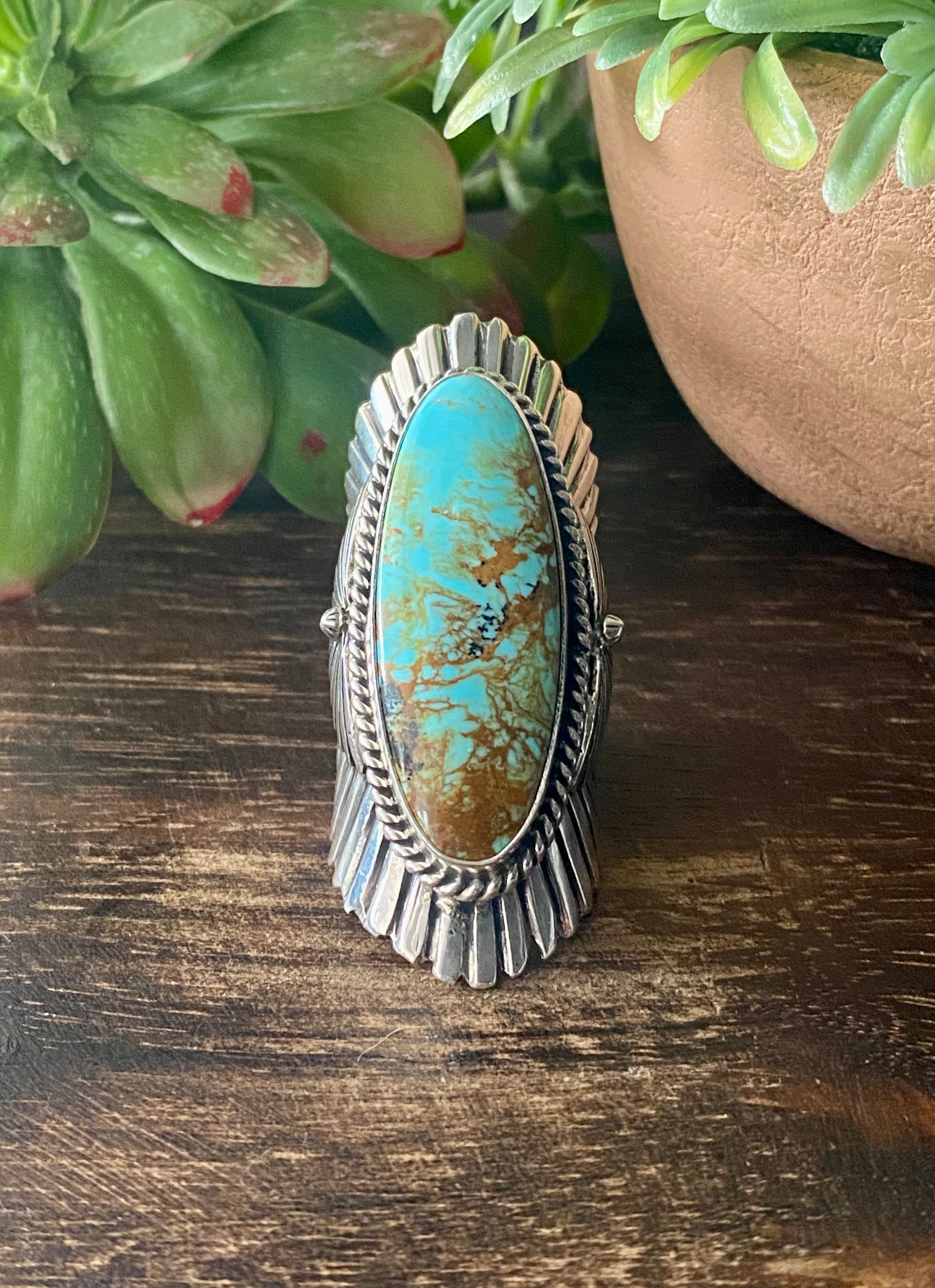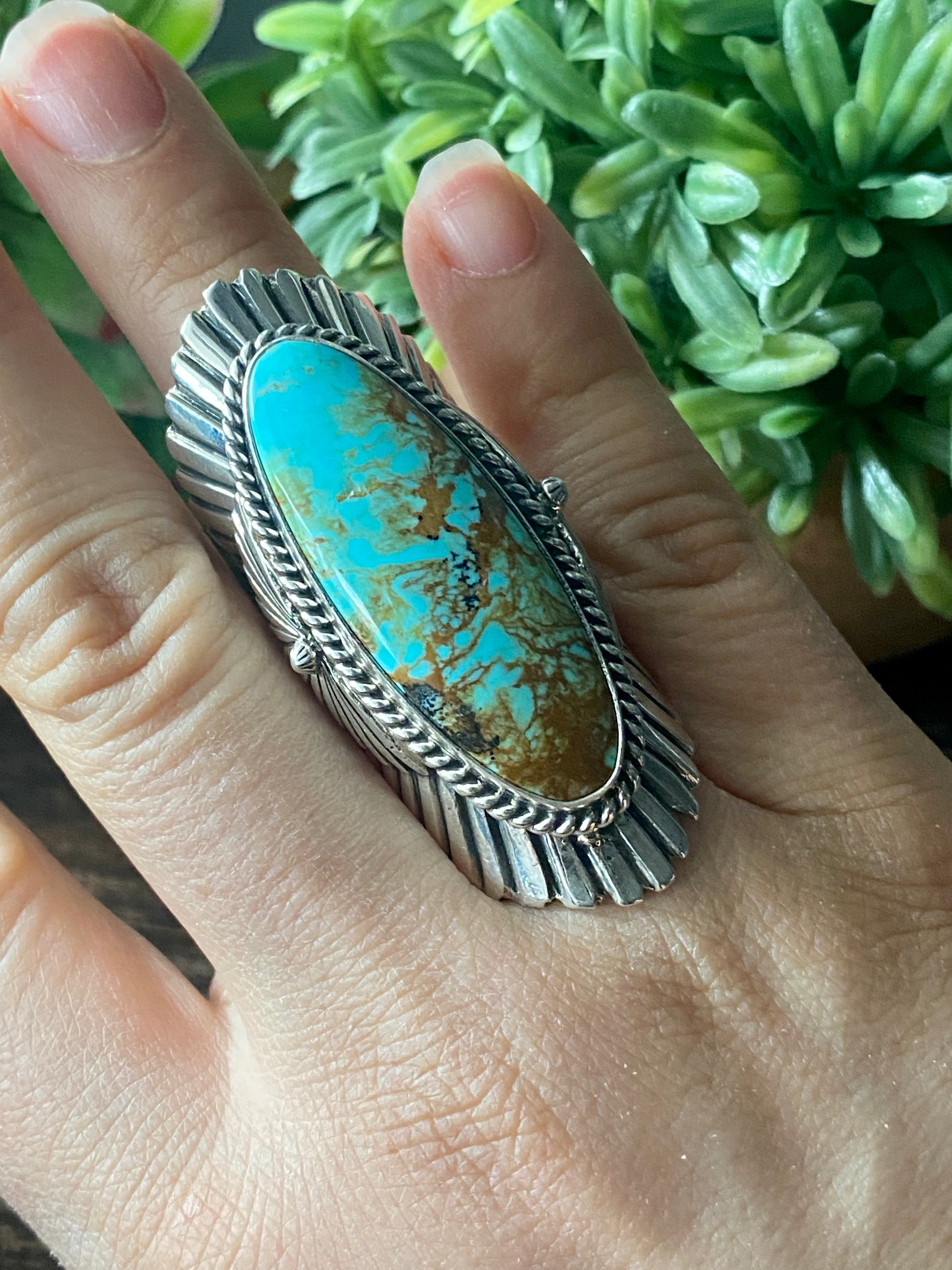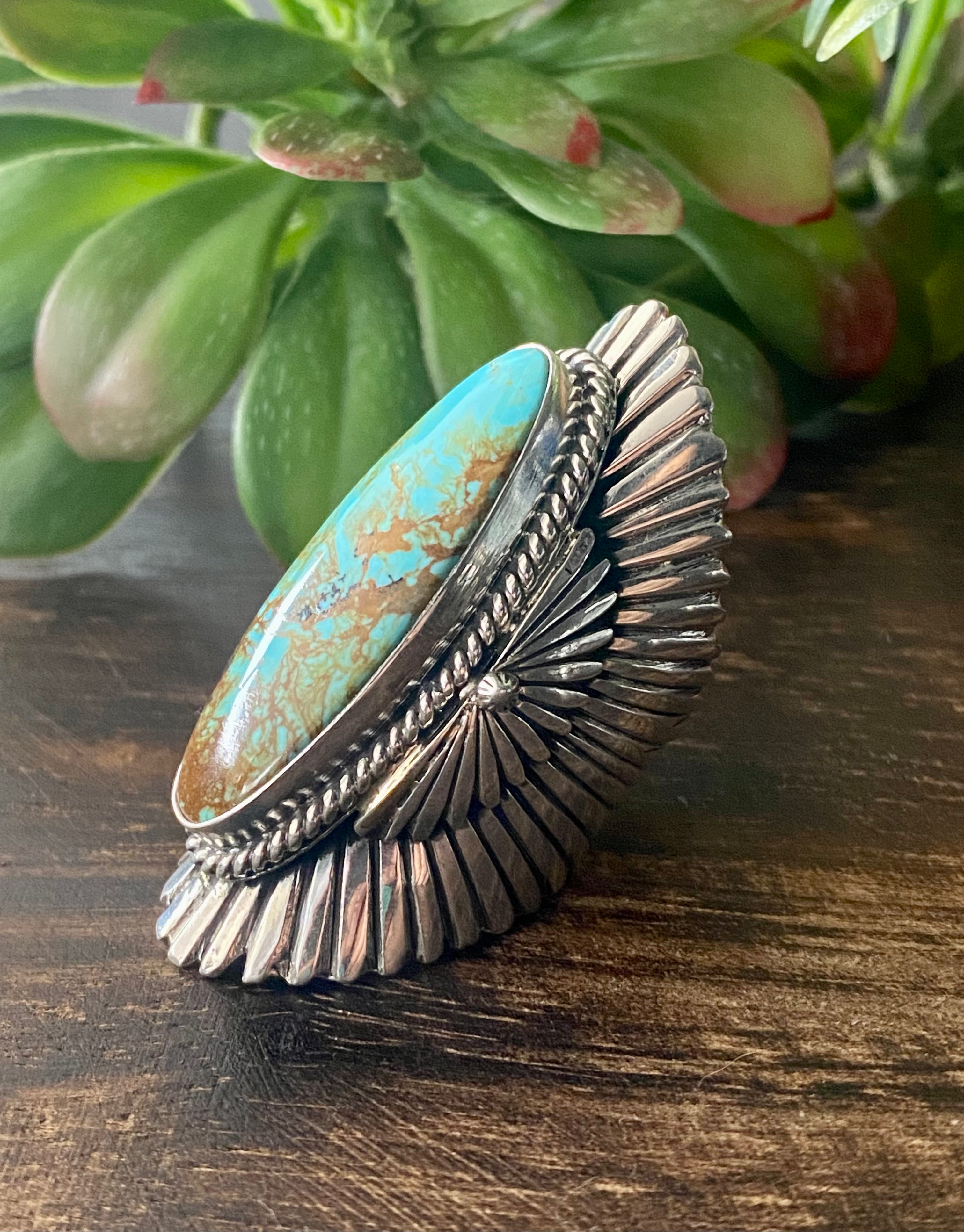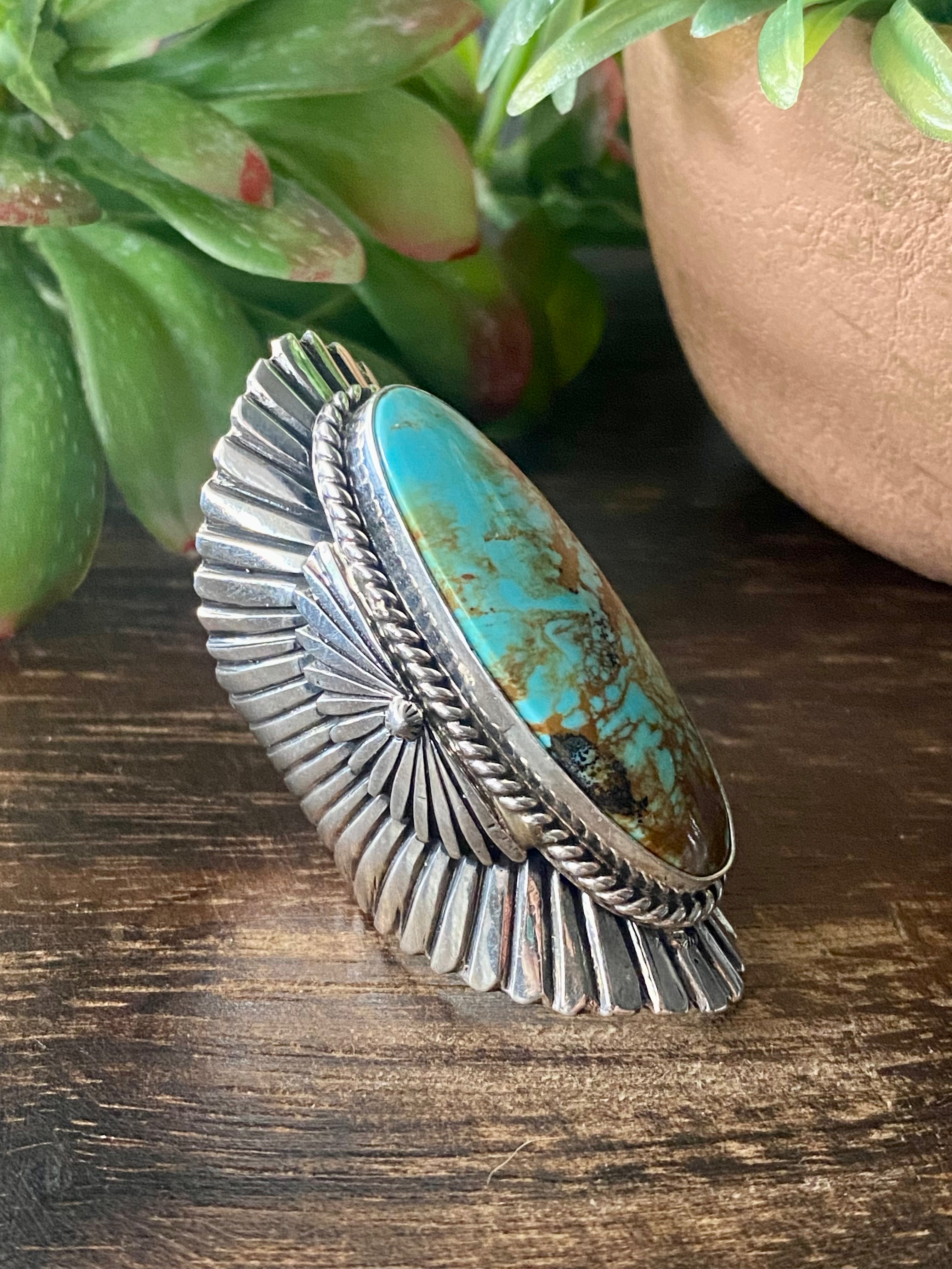 Robert Shakey Kingman Turquoise & Sterling Silver Ring Size 10.25. It measures 2 1/4 inches long and 7/8 of an inch wide. Signed by the artist and stamped sterling silver.