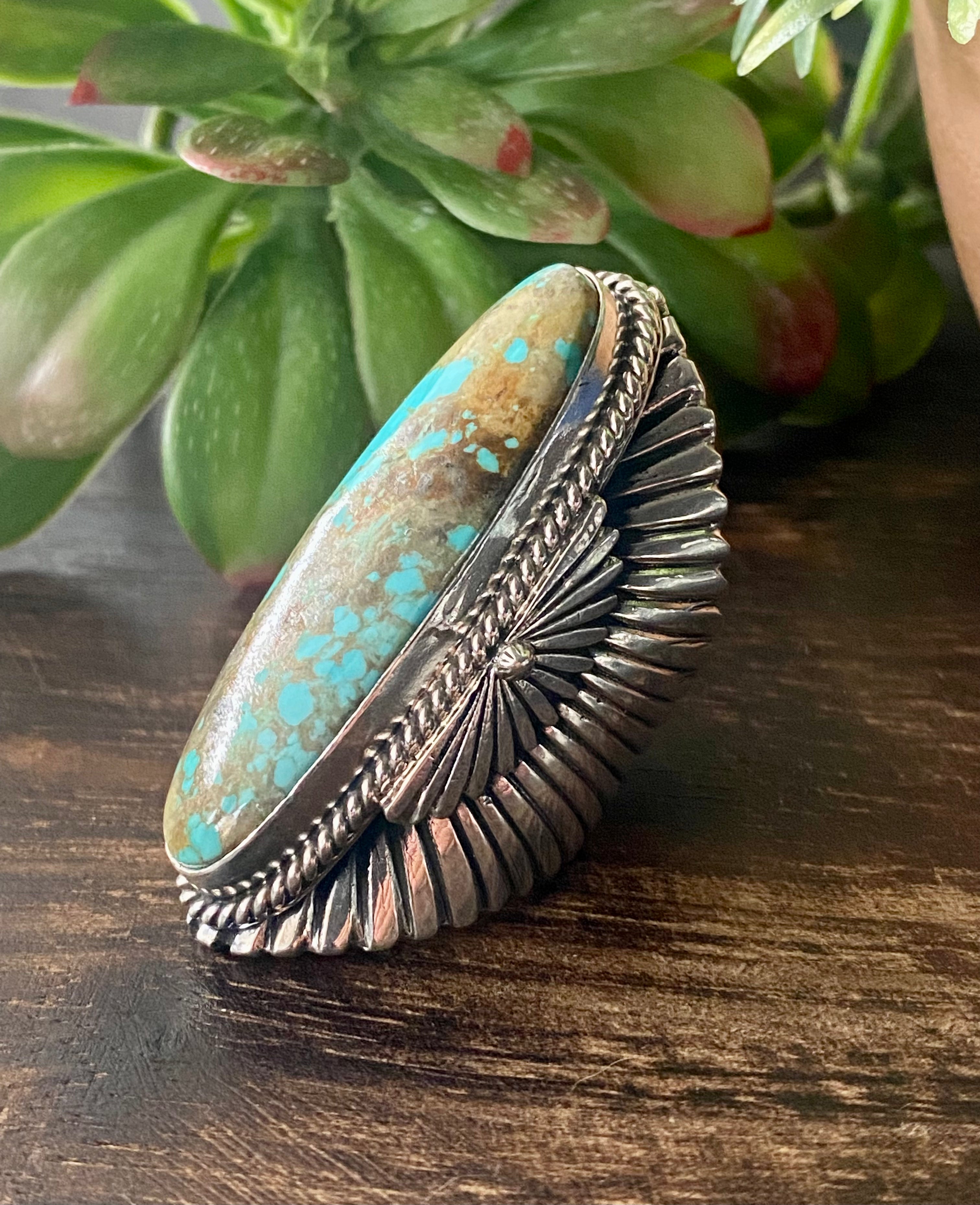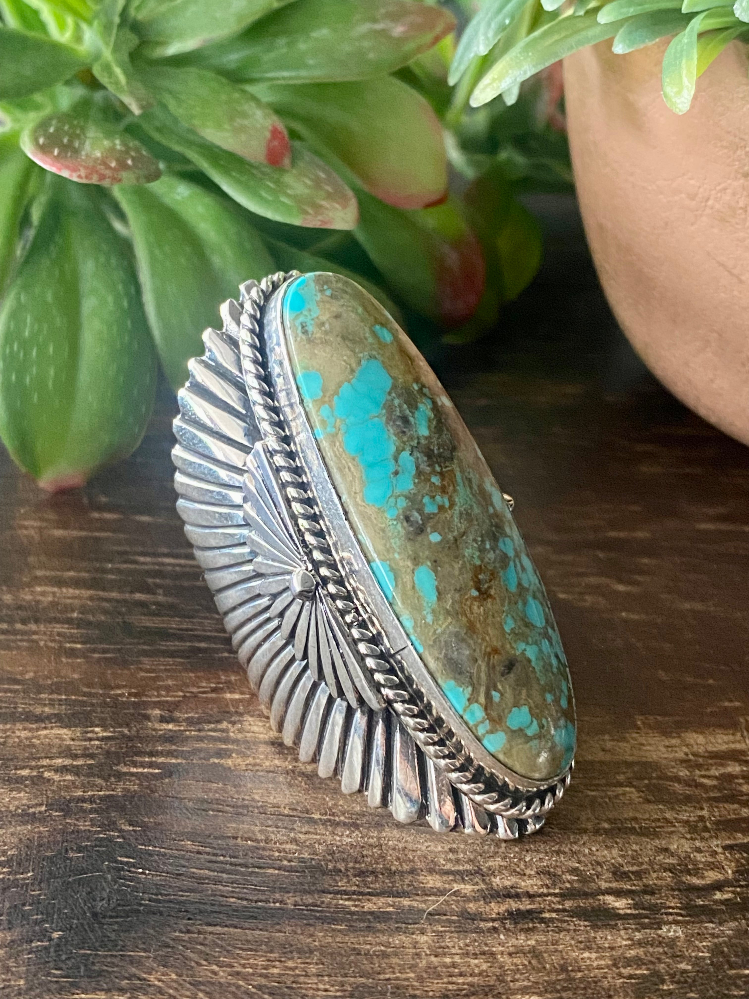 Robert Shakey Kingman Turquoise & Sterling Silver Ring Size 11. It measures 2 1/4 inches long and 7/8 of an inch wide. Signed by the artist and stamped sterling silver.