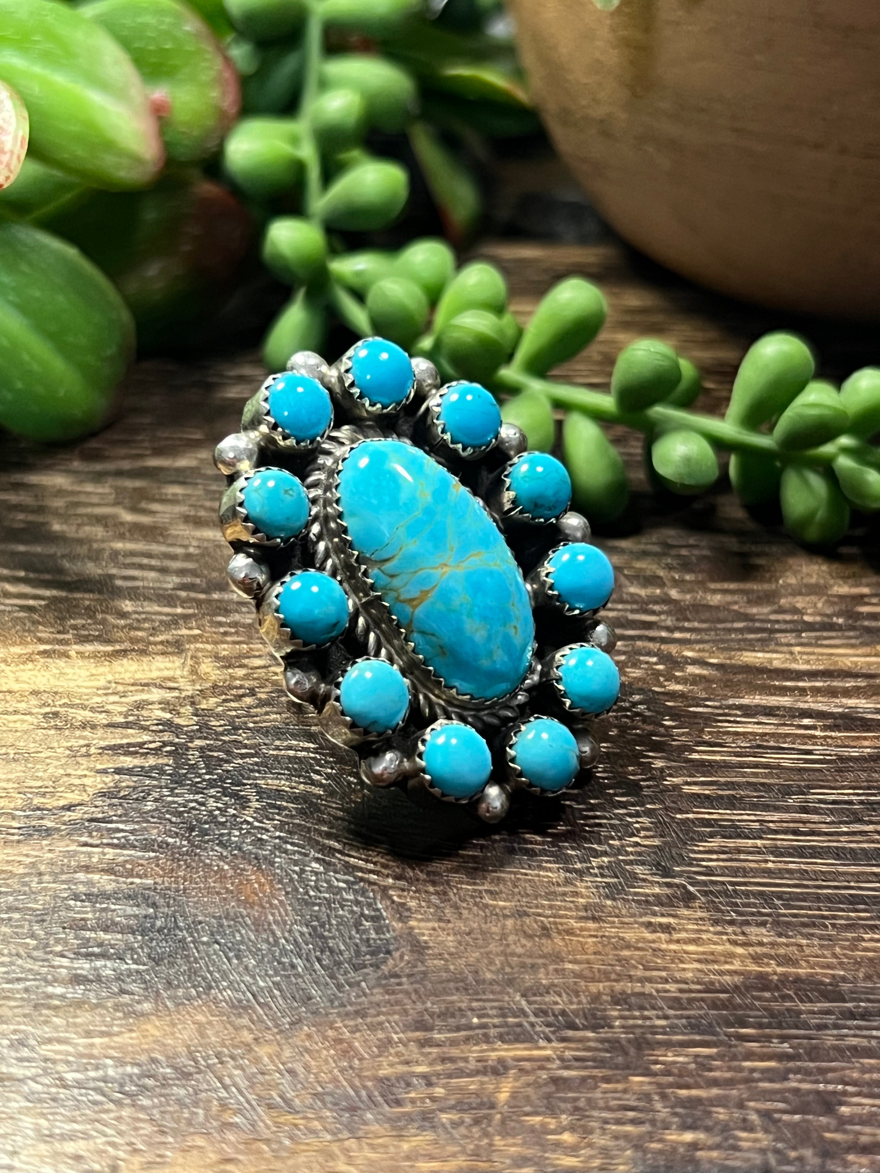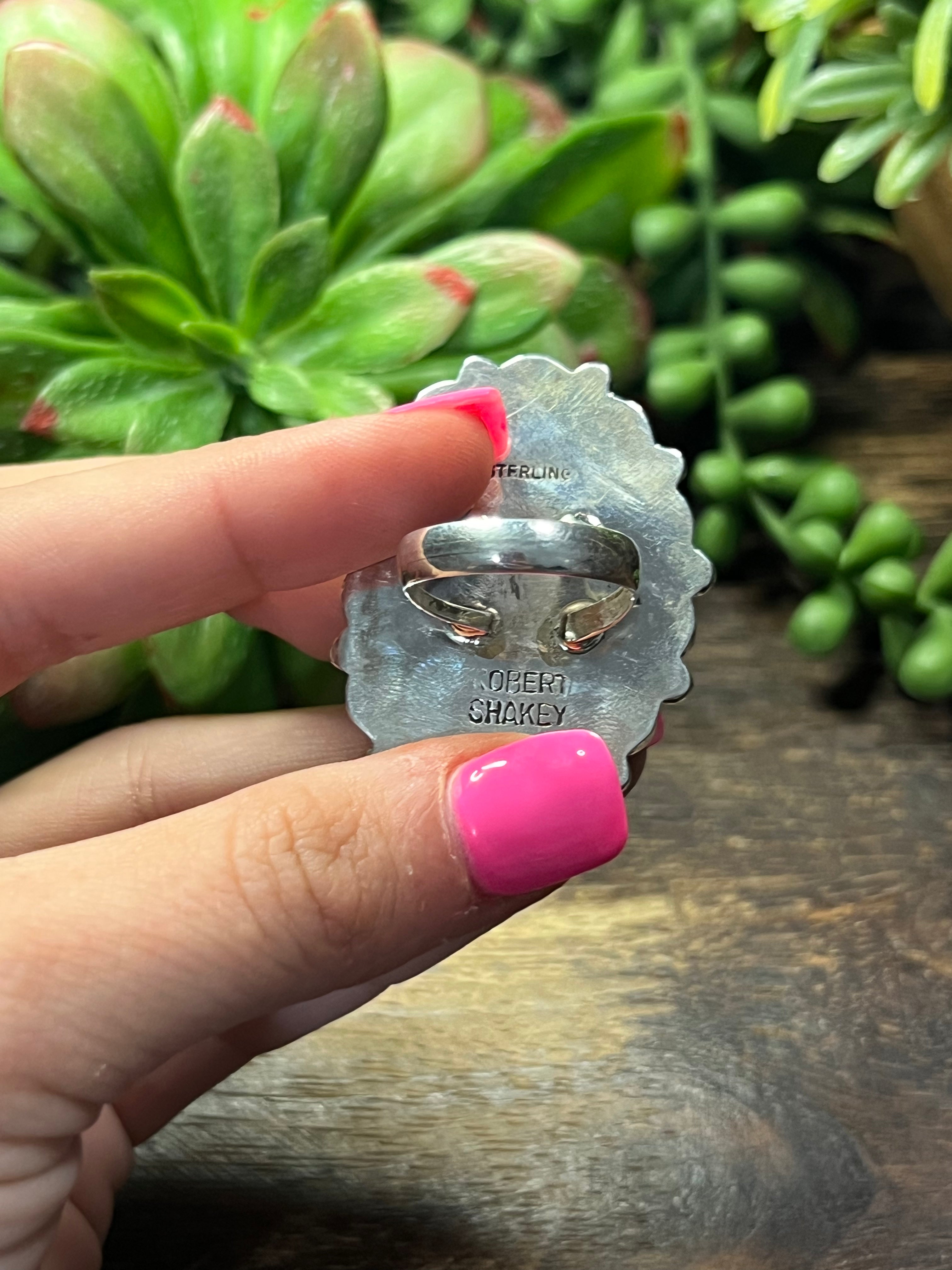 Robert Shakey Kingman Turquoise & Sterling Silver Ring Size 7.5. It measures 1 5/8 inches long and 1 1/4 inches wide. Signed by artist and stamped sterling silver.