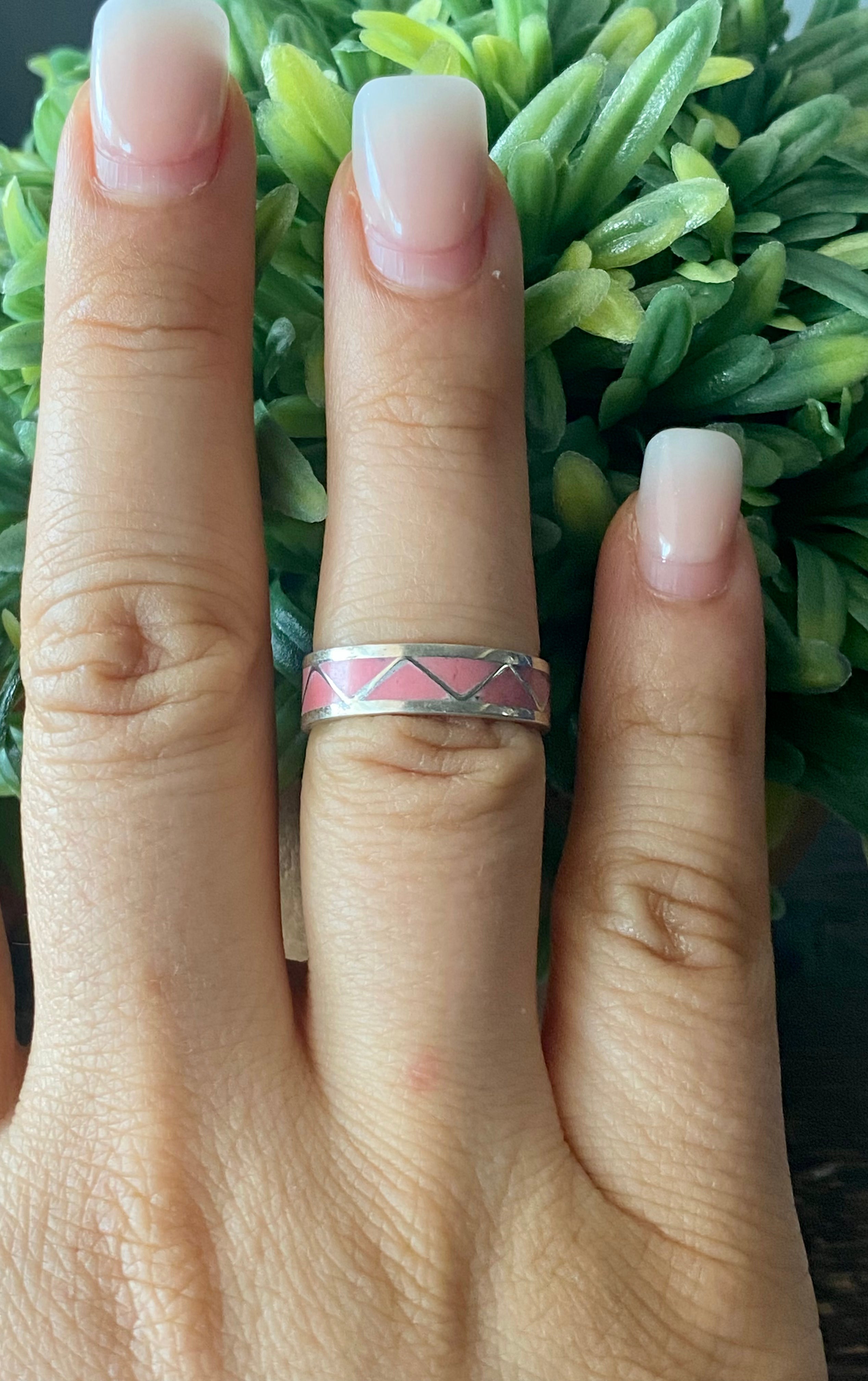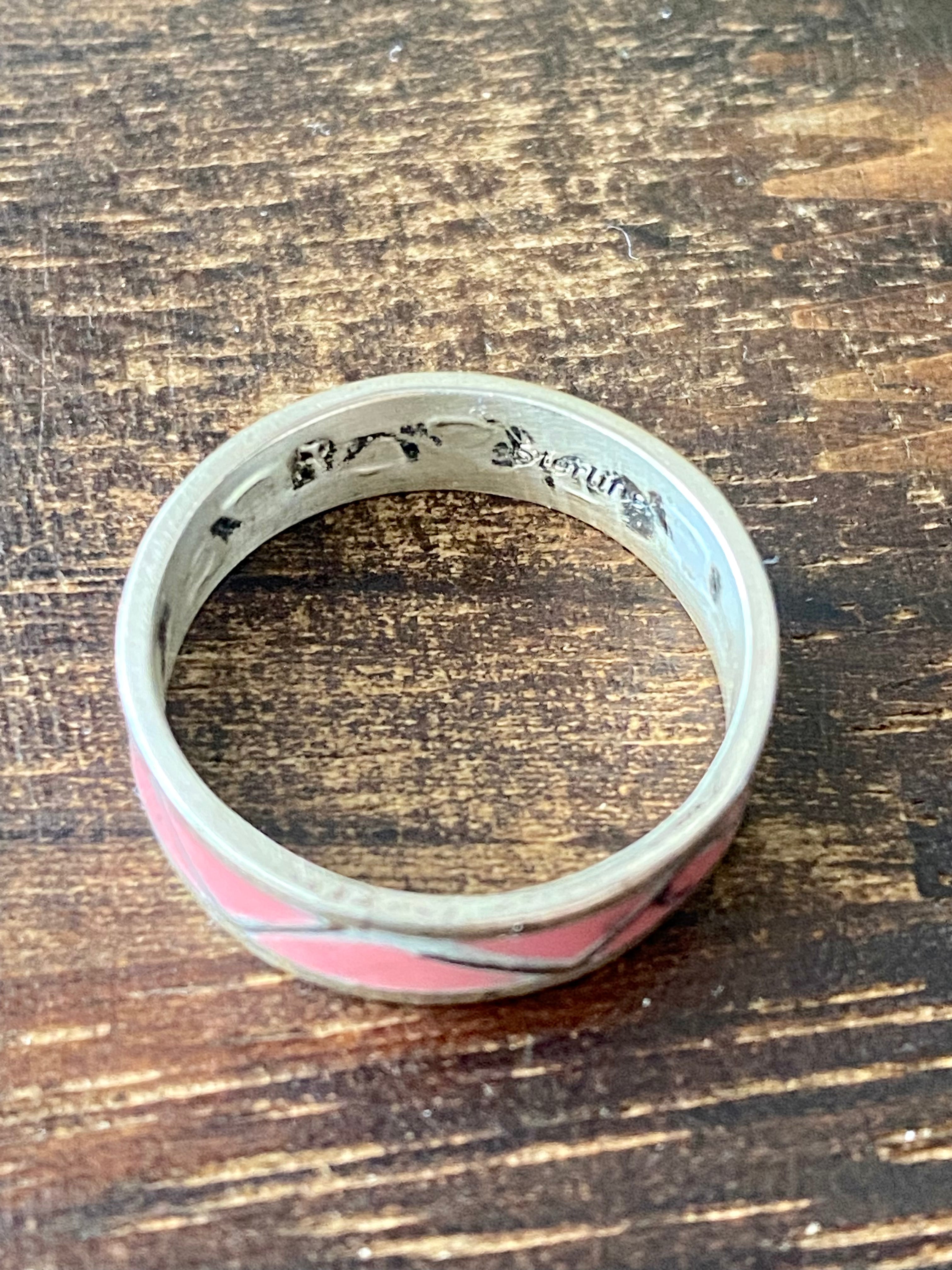 Roger Morgan Pink Coral & Sterling Silver Inlay Ring Size 10.25. It measures 1/4 of an inch long and 3/4 of an inch wide. Signed by the artist and stamped sterling silver.