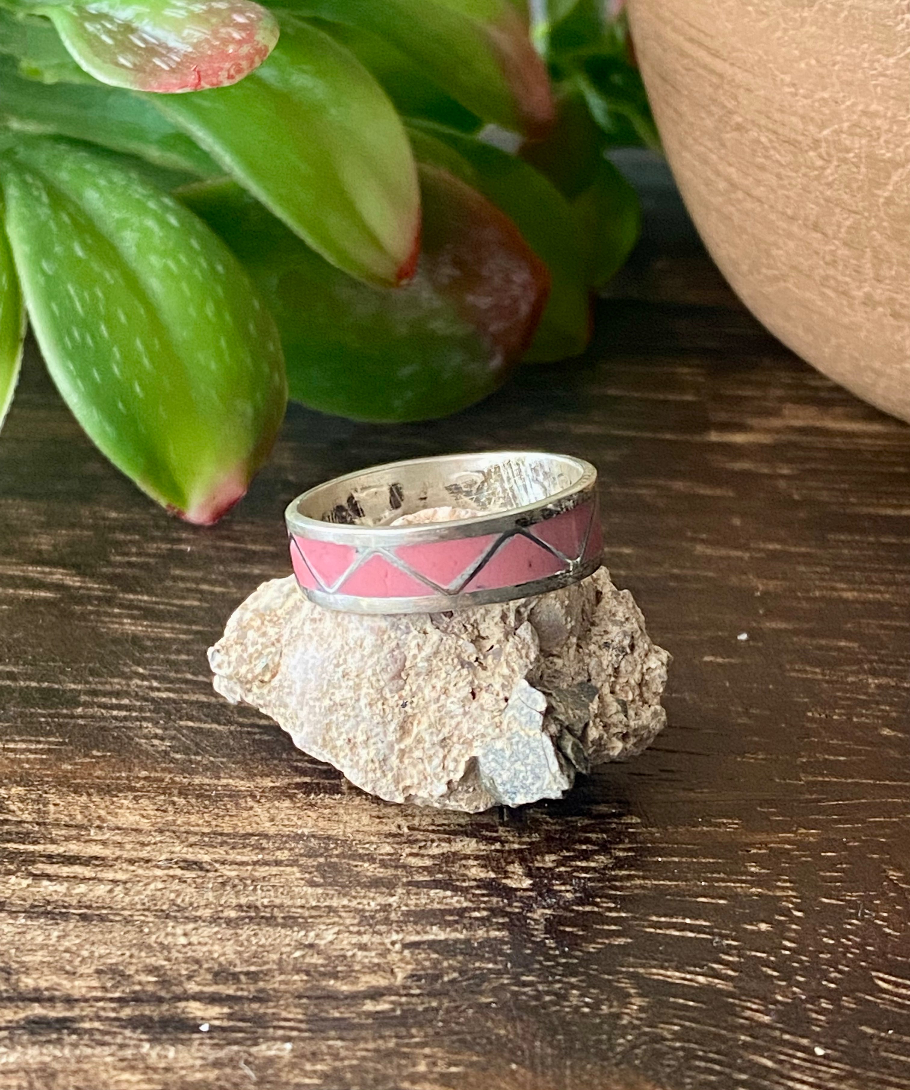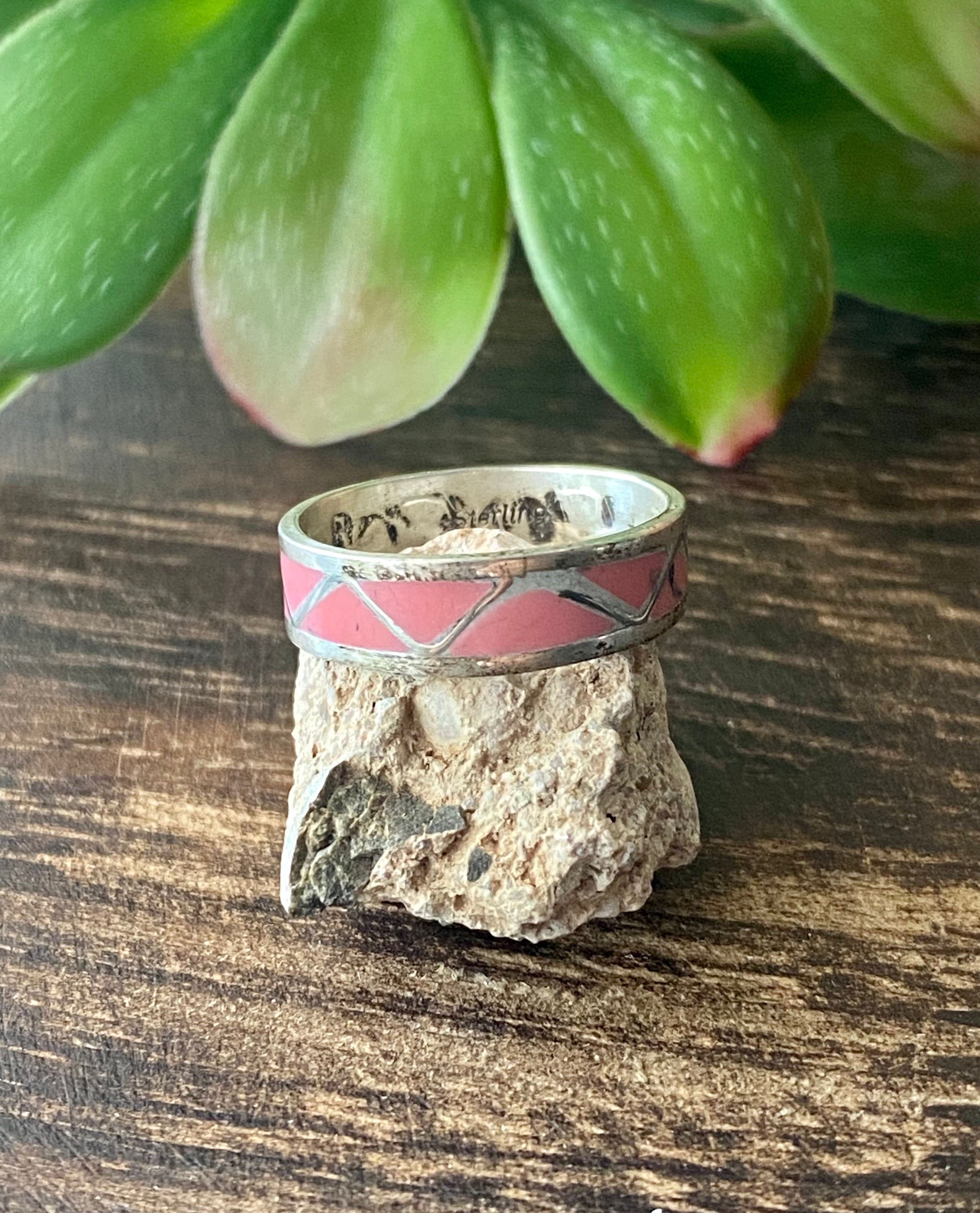 Roger Morgan Pink Coral & Sterling Silver Inlay Ring Size 11.25. It measures 1/4 of an inch long and 3/4 of an inch wide. Signed by the artist and stamped sterling silver.