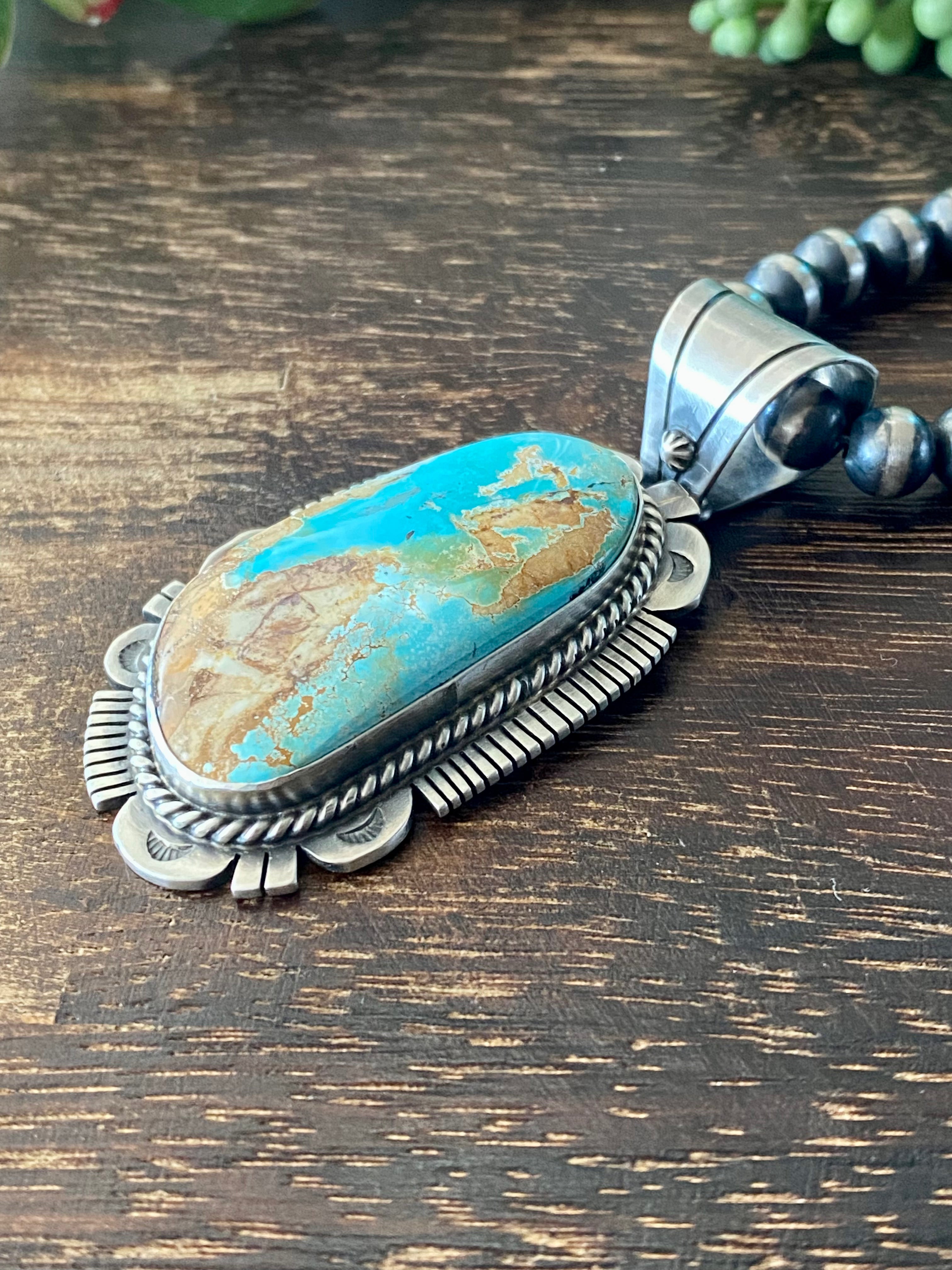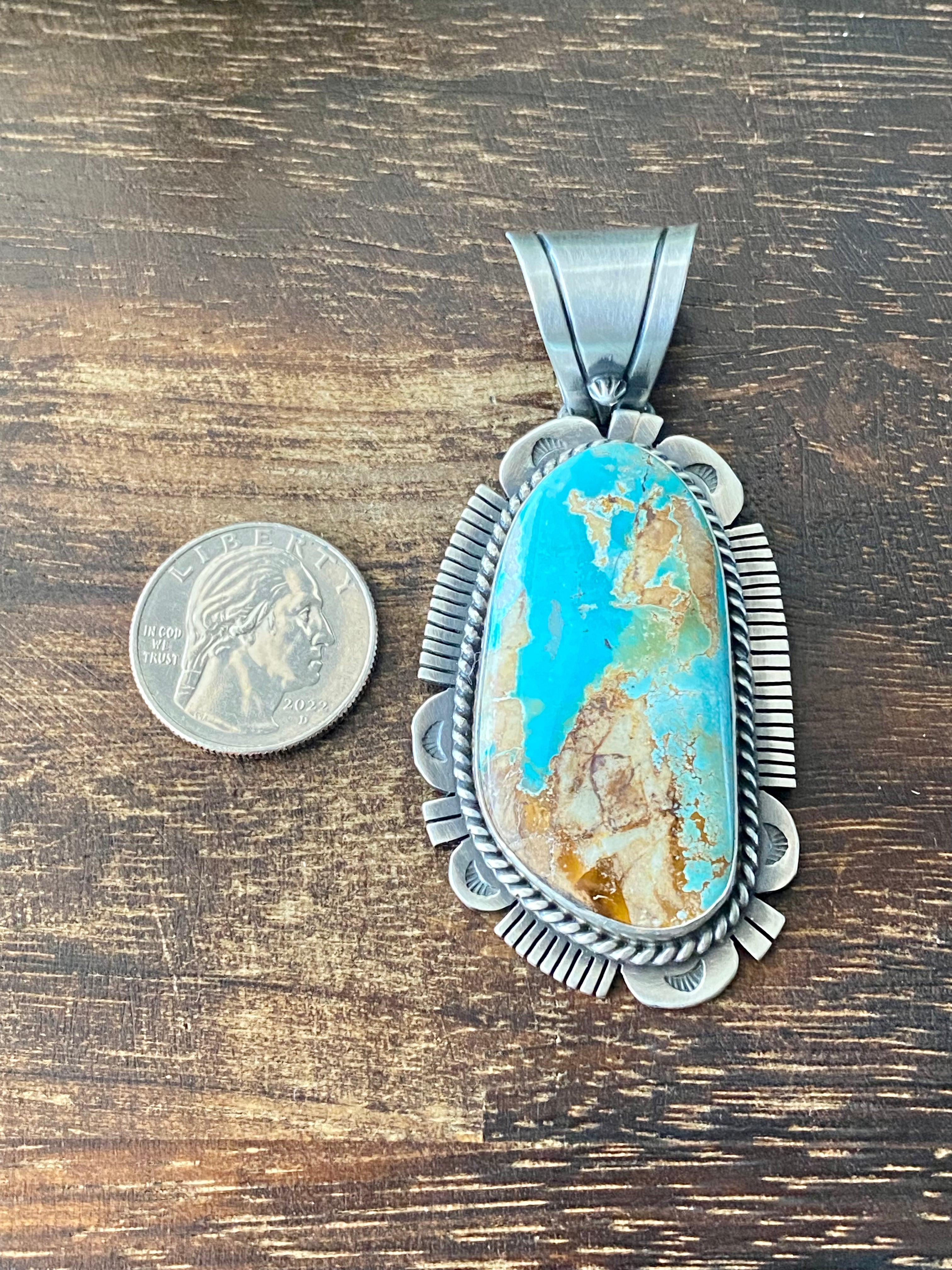 Russell Sam High Grade Royston Turquoise & Sterling Silver Pendant. It measures 3 inches long and 1 3/8 inches wide. Pendant Only!! Signed by the artist and stamped sterling silver.
