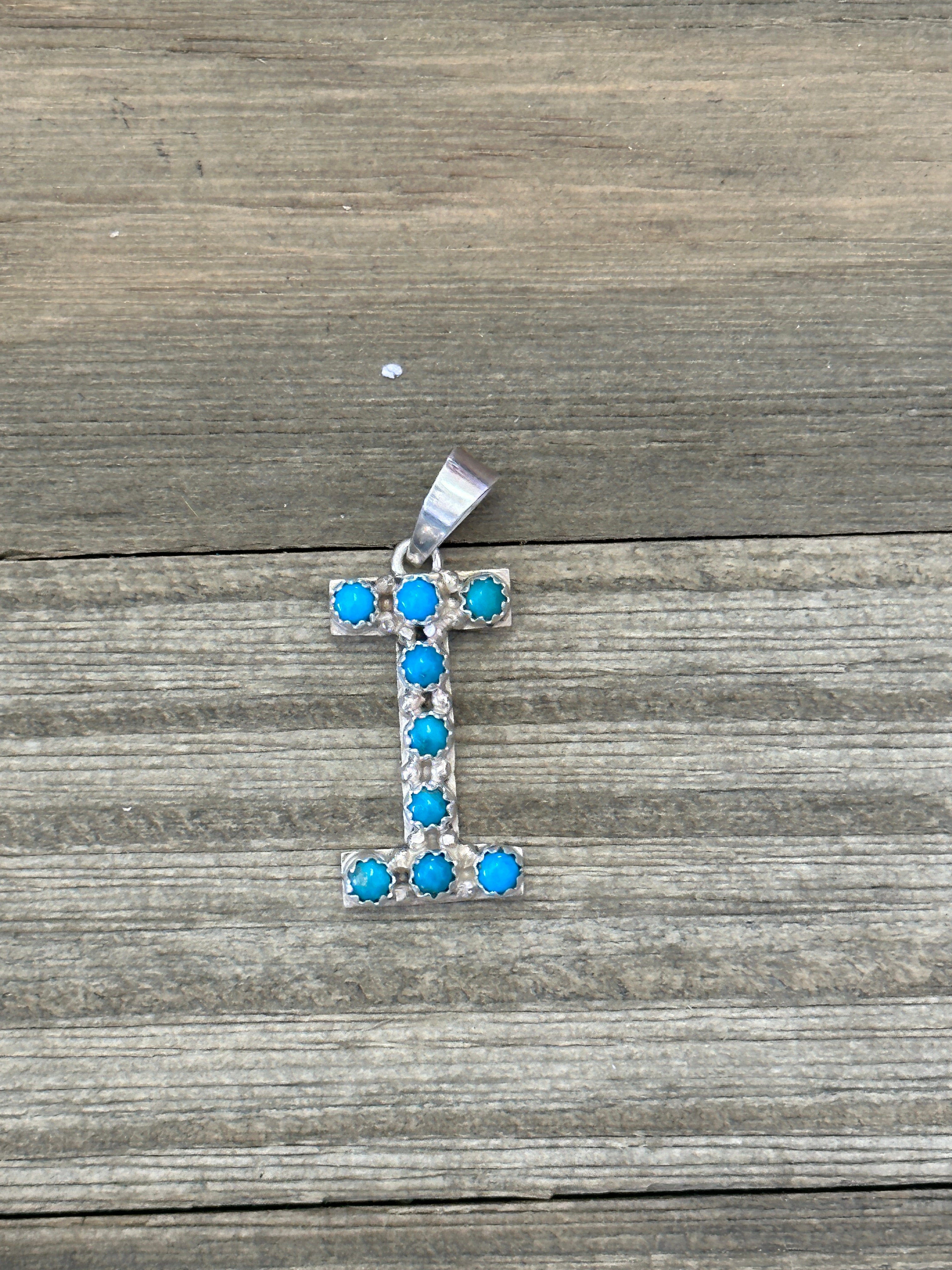 Scott Skeets Kingman Turquoise & Sterling Silver Letter Pendant. It measures just under 1 1/2 inches long and 5/8 of an inch wide. Pendant Only!! Signed by the artist and stamped sterling silver.