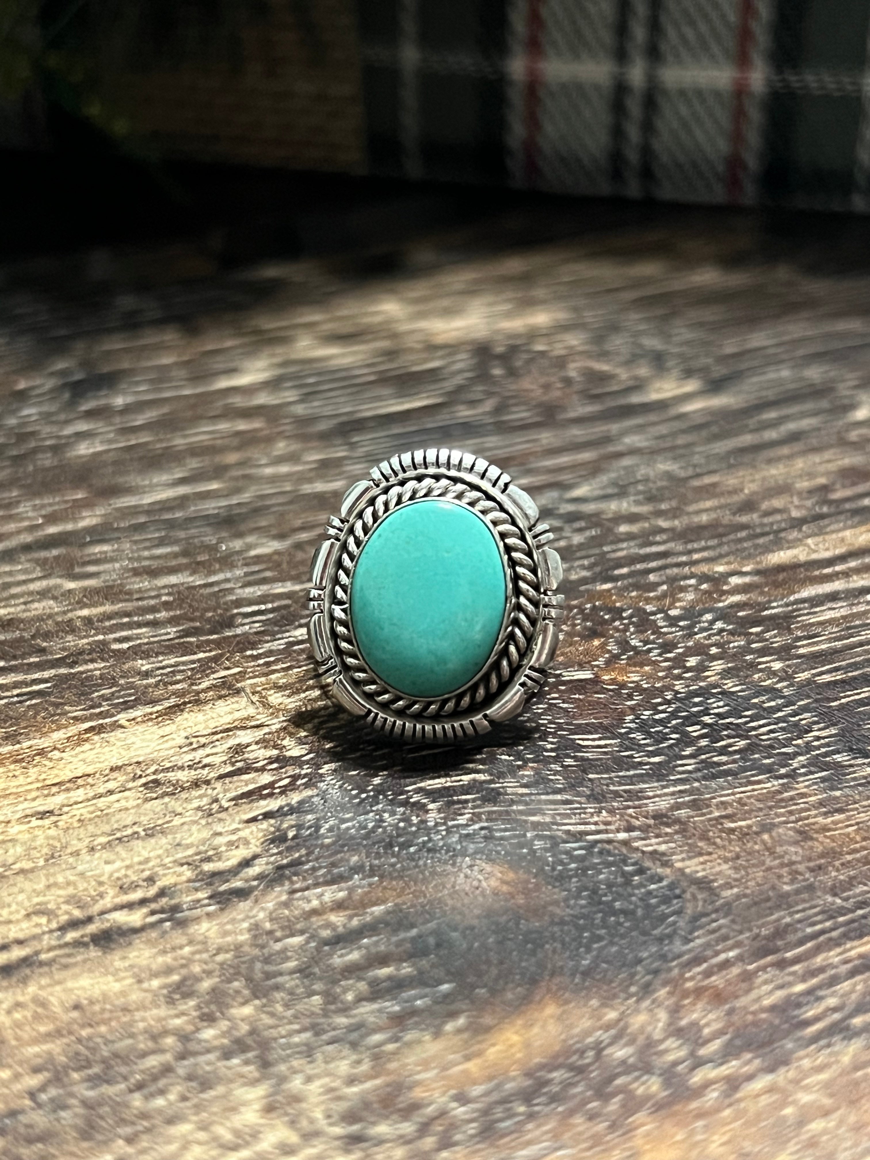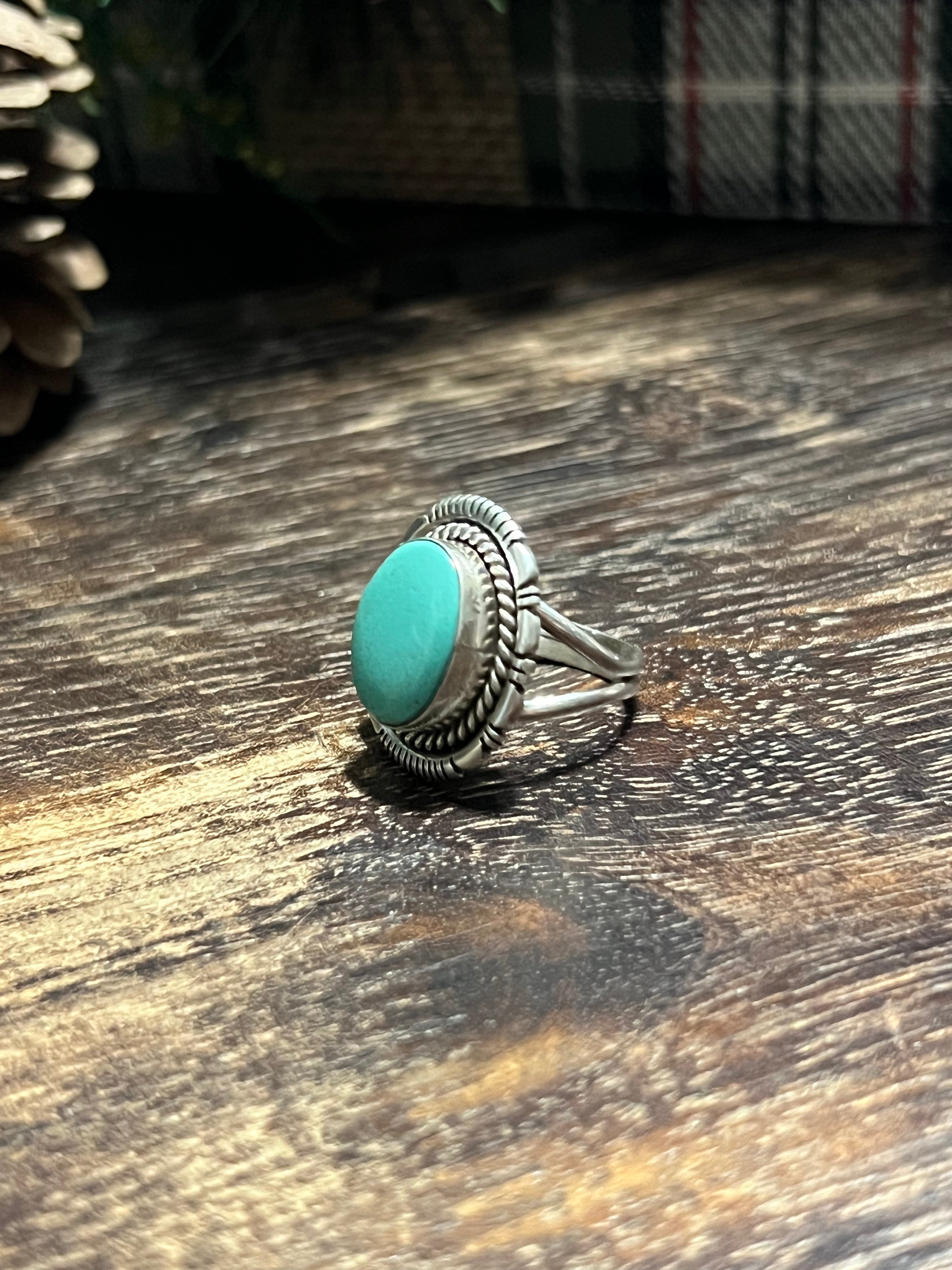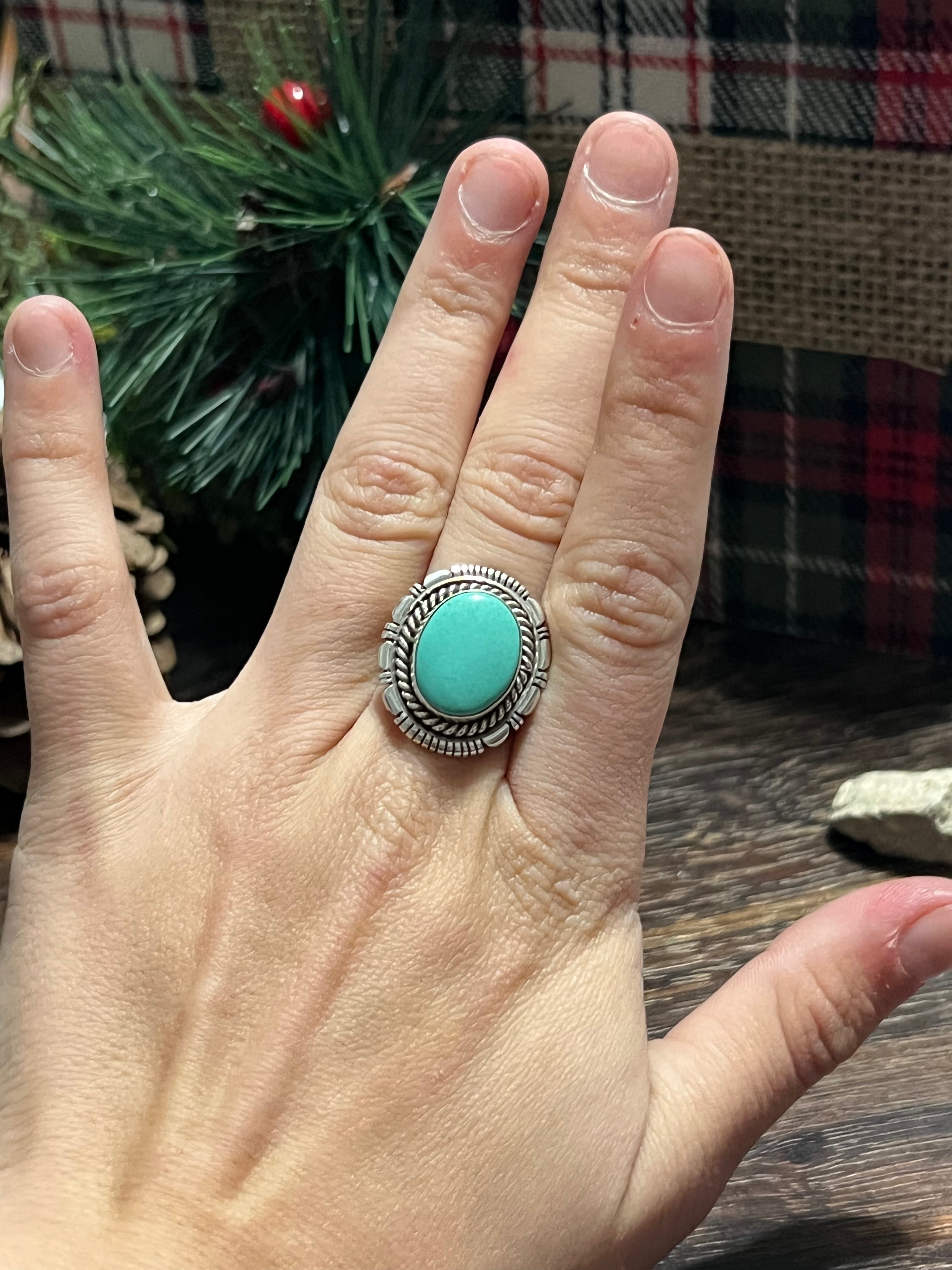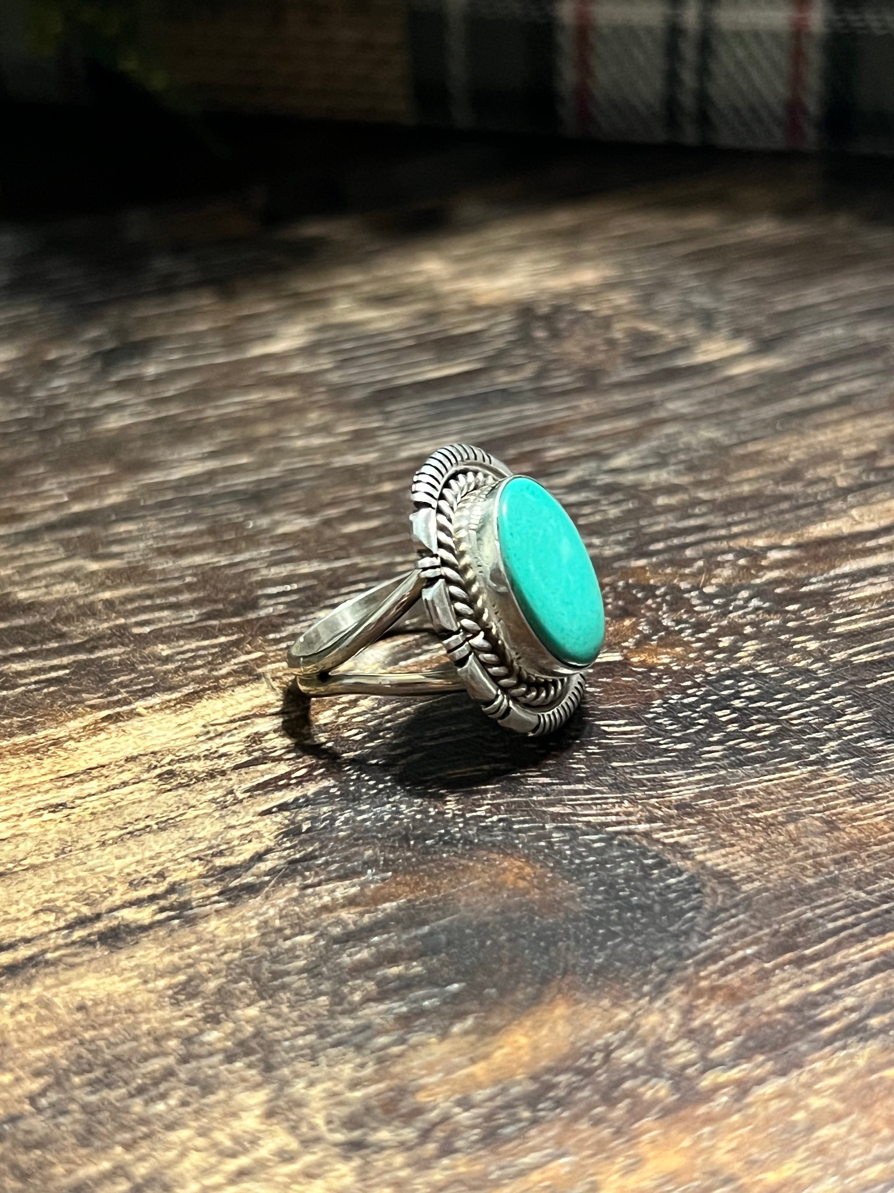 Scott Skeets Kingman Turquoise & Sterling Silver Ring Size 7. It measures 7/8 of an inch long and 3/4 of an inch wide. Signed by artist and stamped sterling silver.