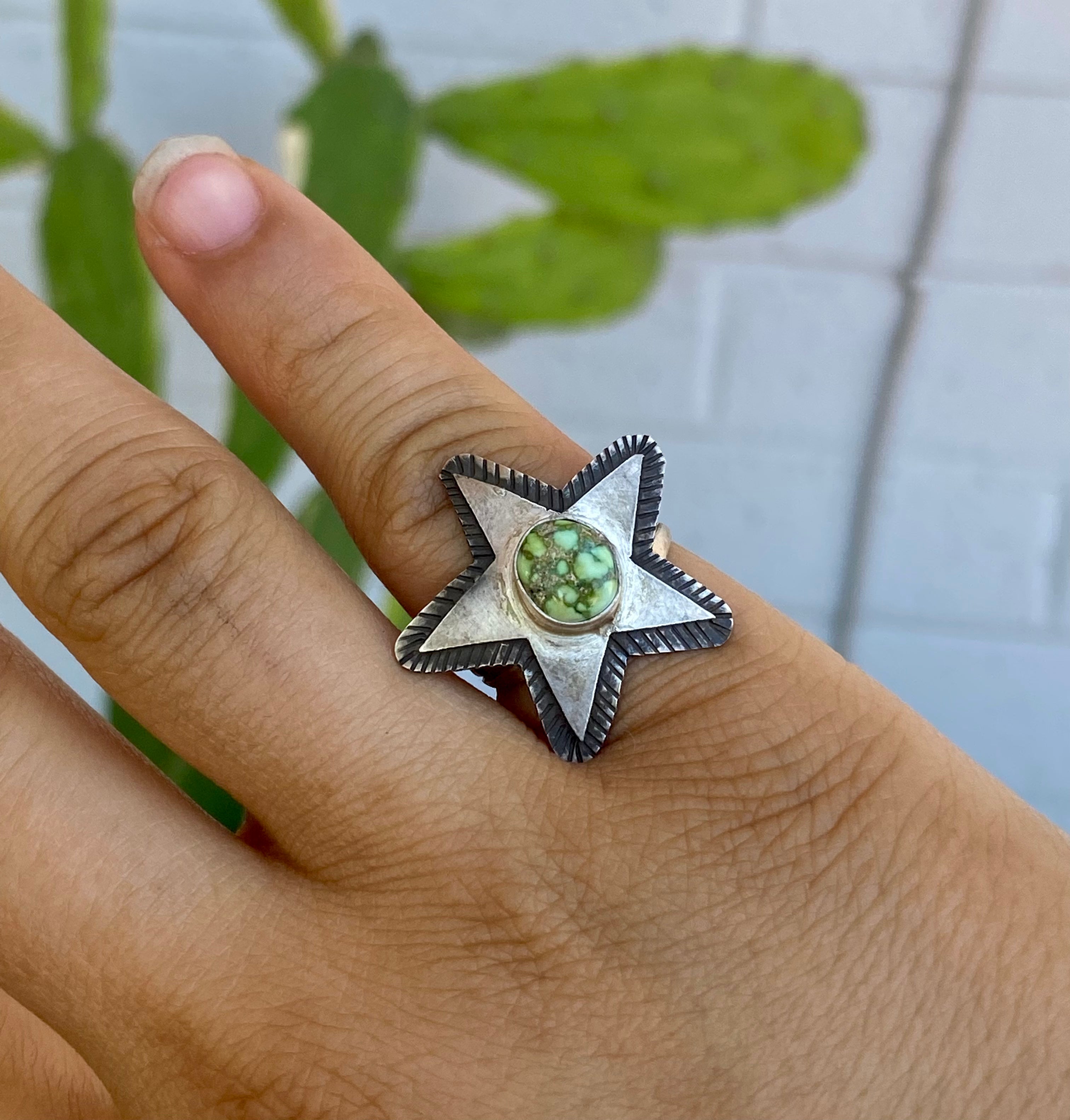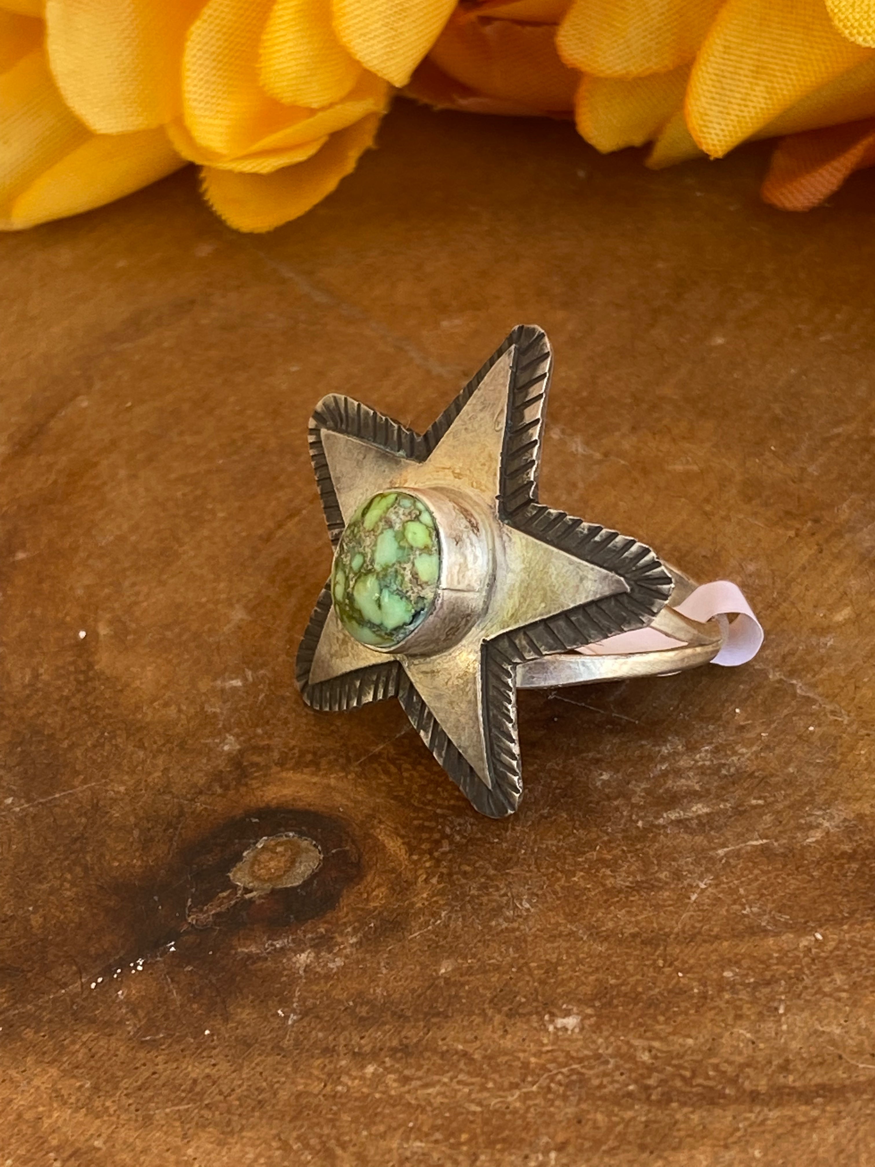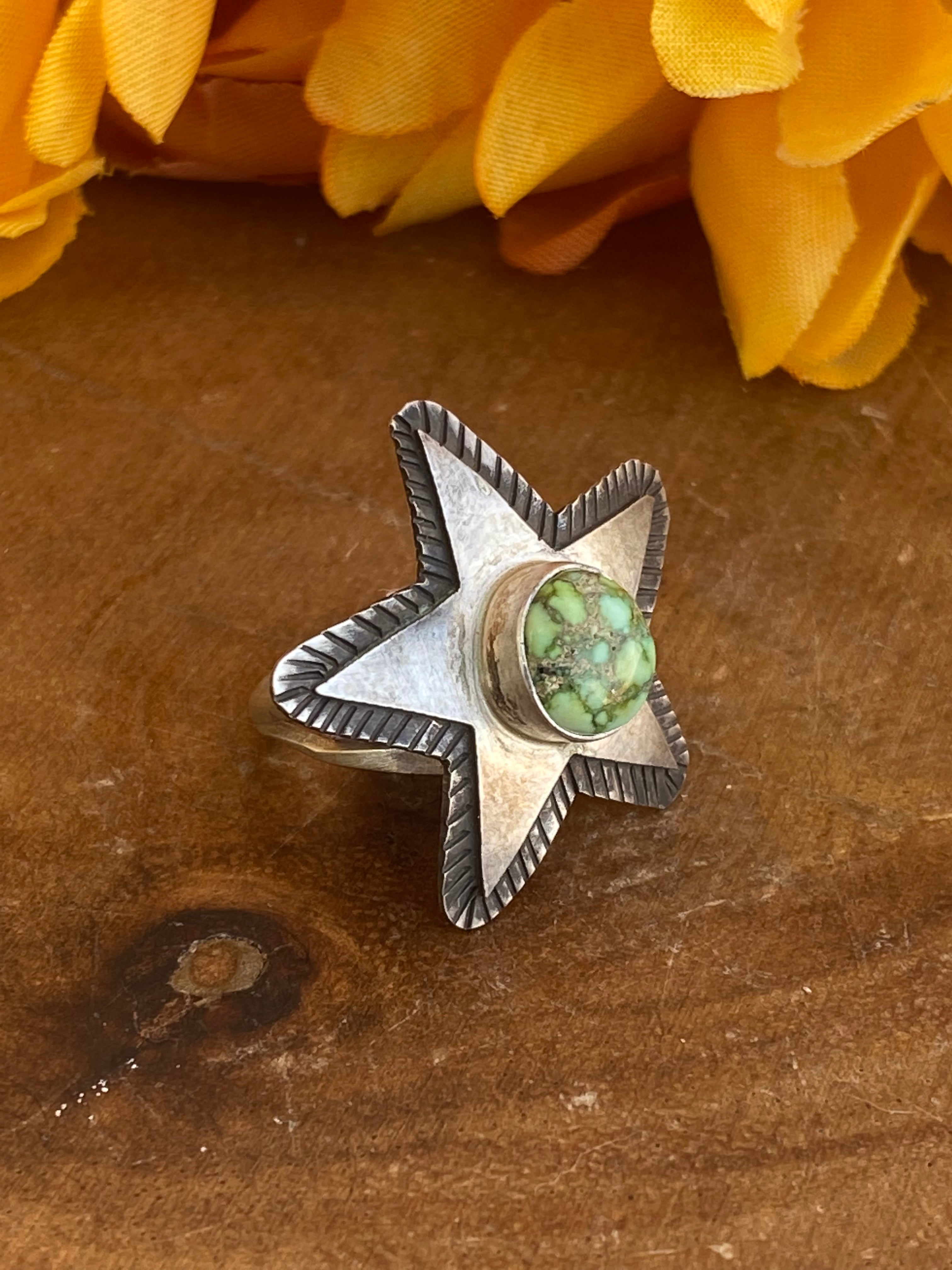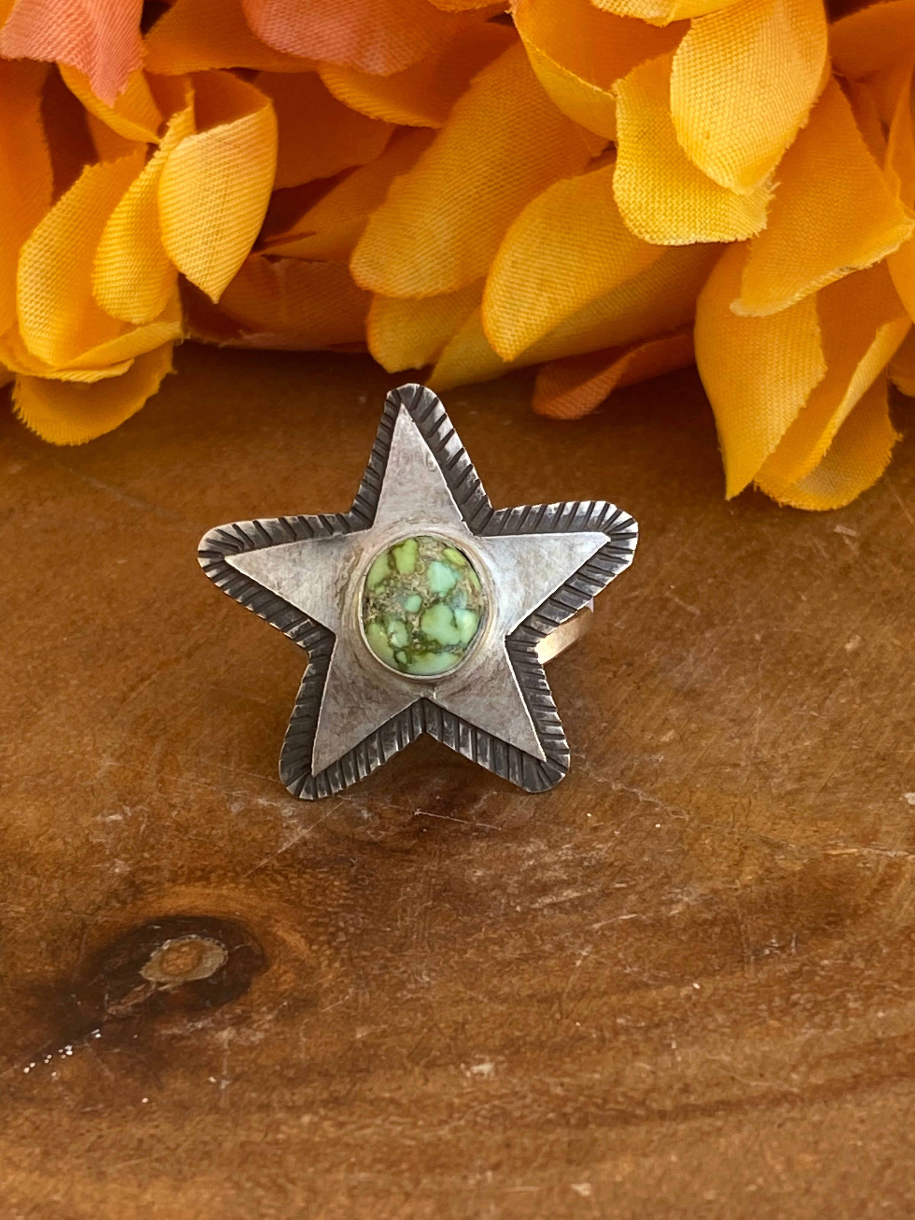 Scott Skeets Sonoran Gold Turquoise & Sterling Silver Star Ring Size 6. It measures 1 inch long and 1 inch wide. Signed by the artist and stamped sterling silver.