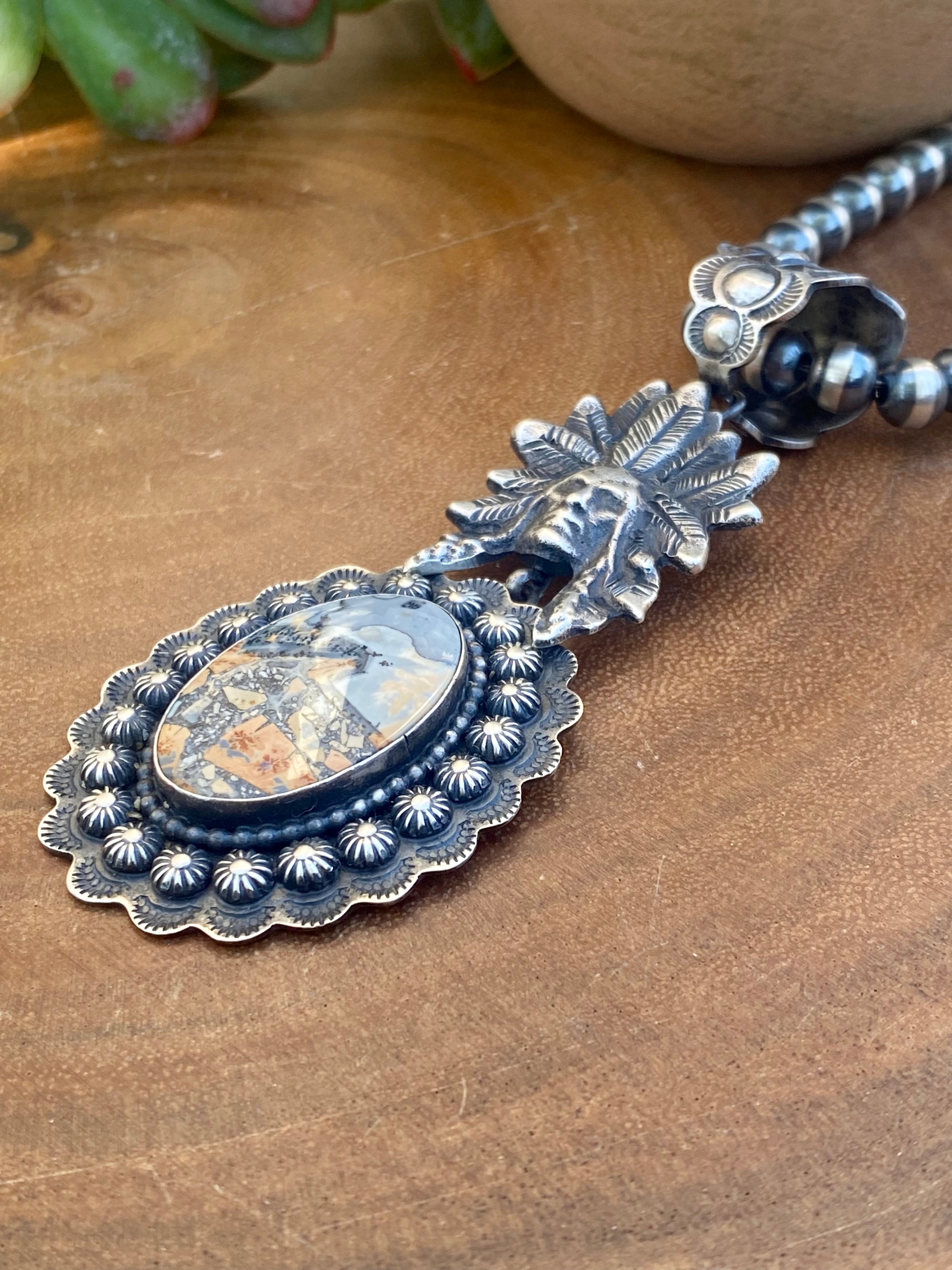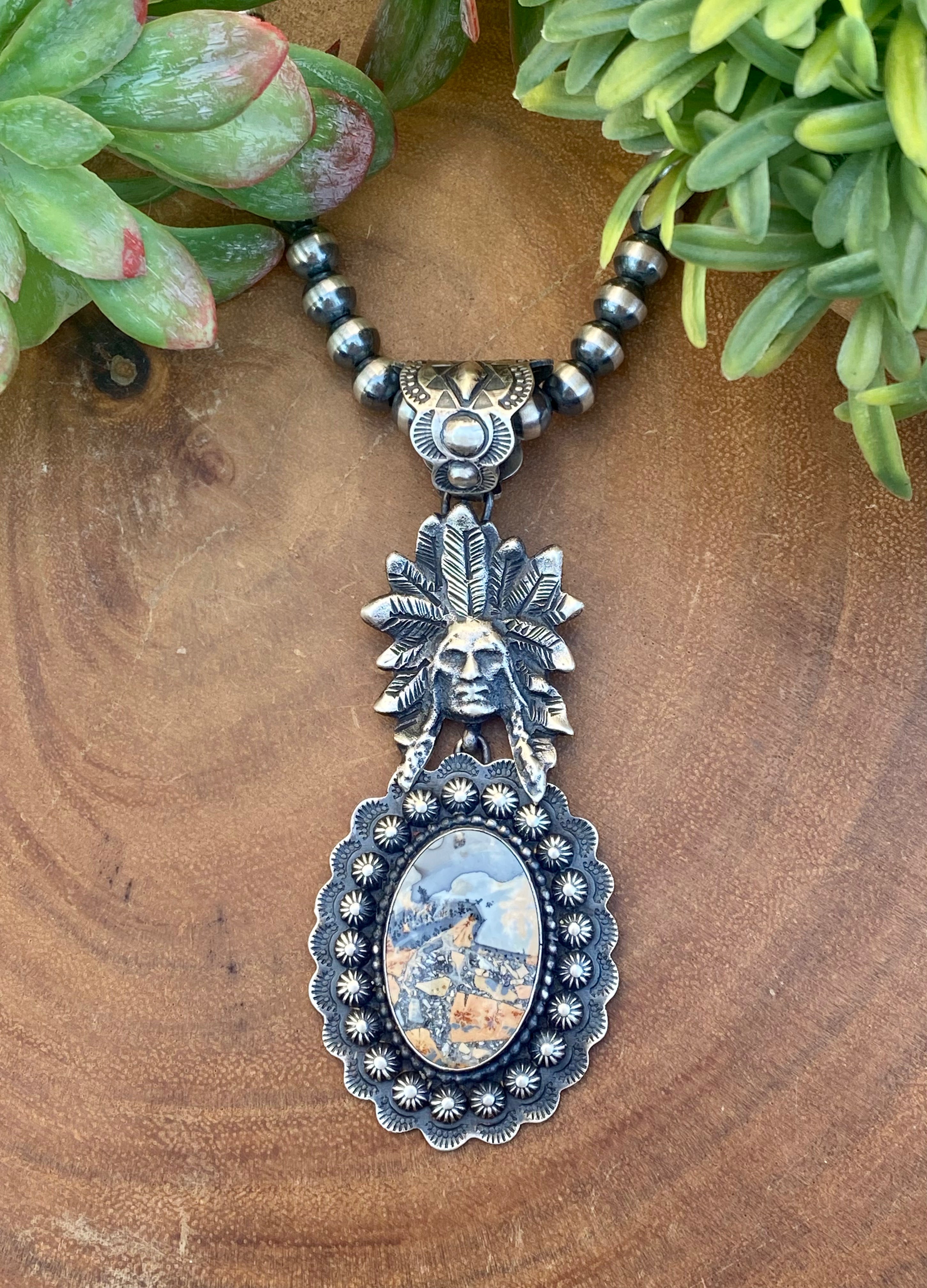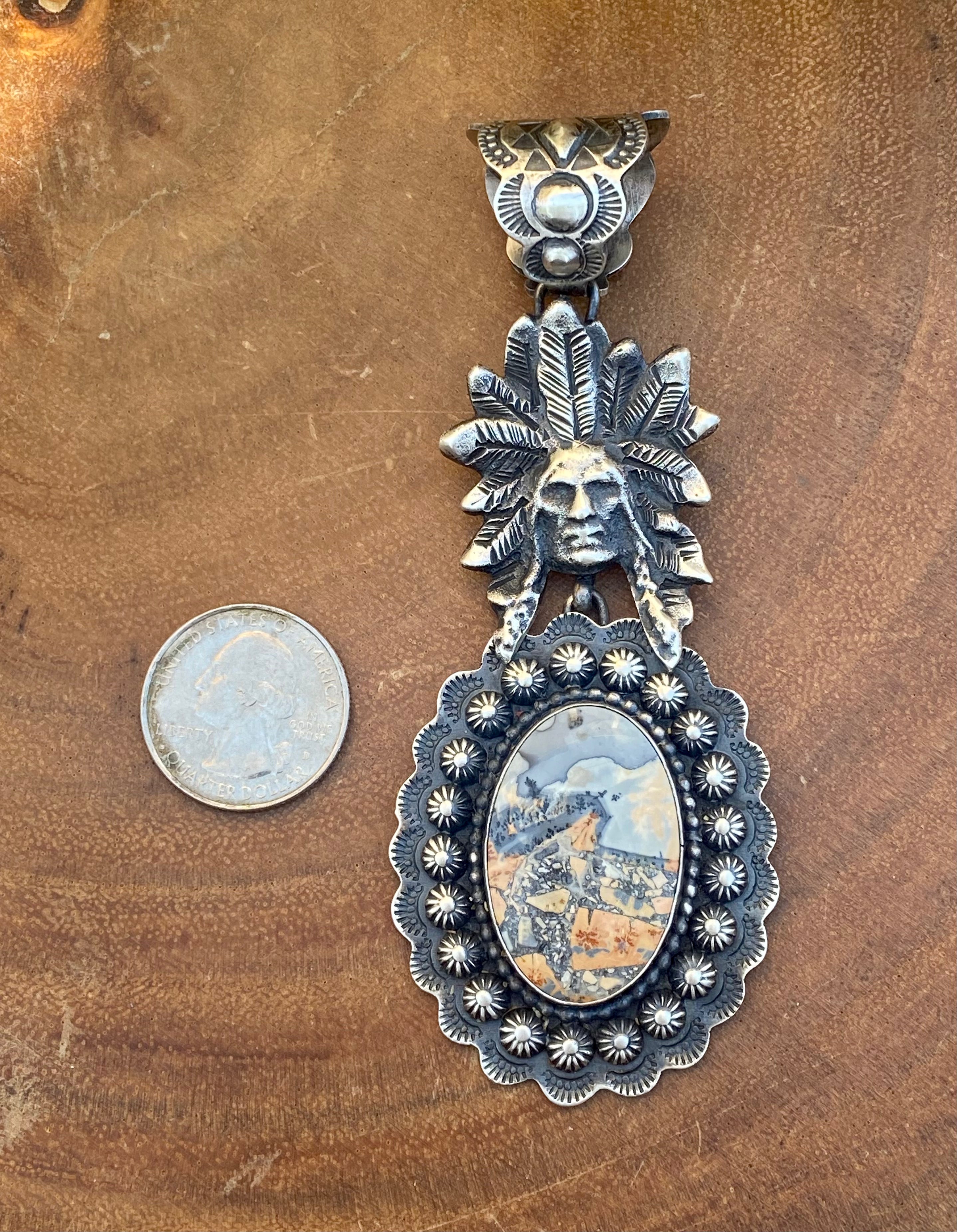 Shawn Cayatineto Jasper & Sterling Silver Chief Pendant. It measures 4 3/8 inches long and 1 3/4 inches wide. Pendant Only!! Singed by the artist and stamped sterling silver.