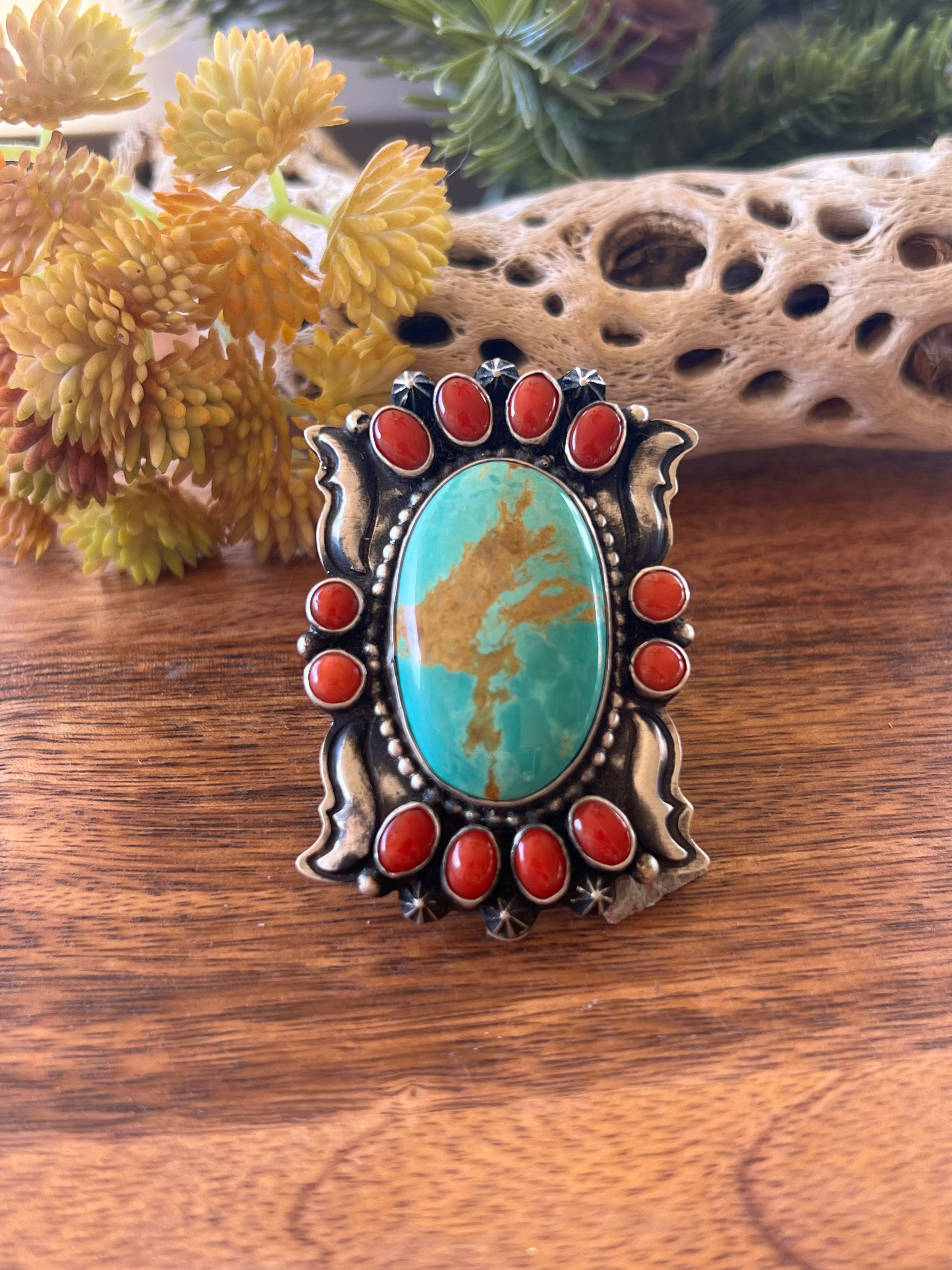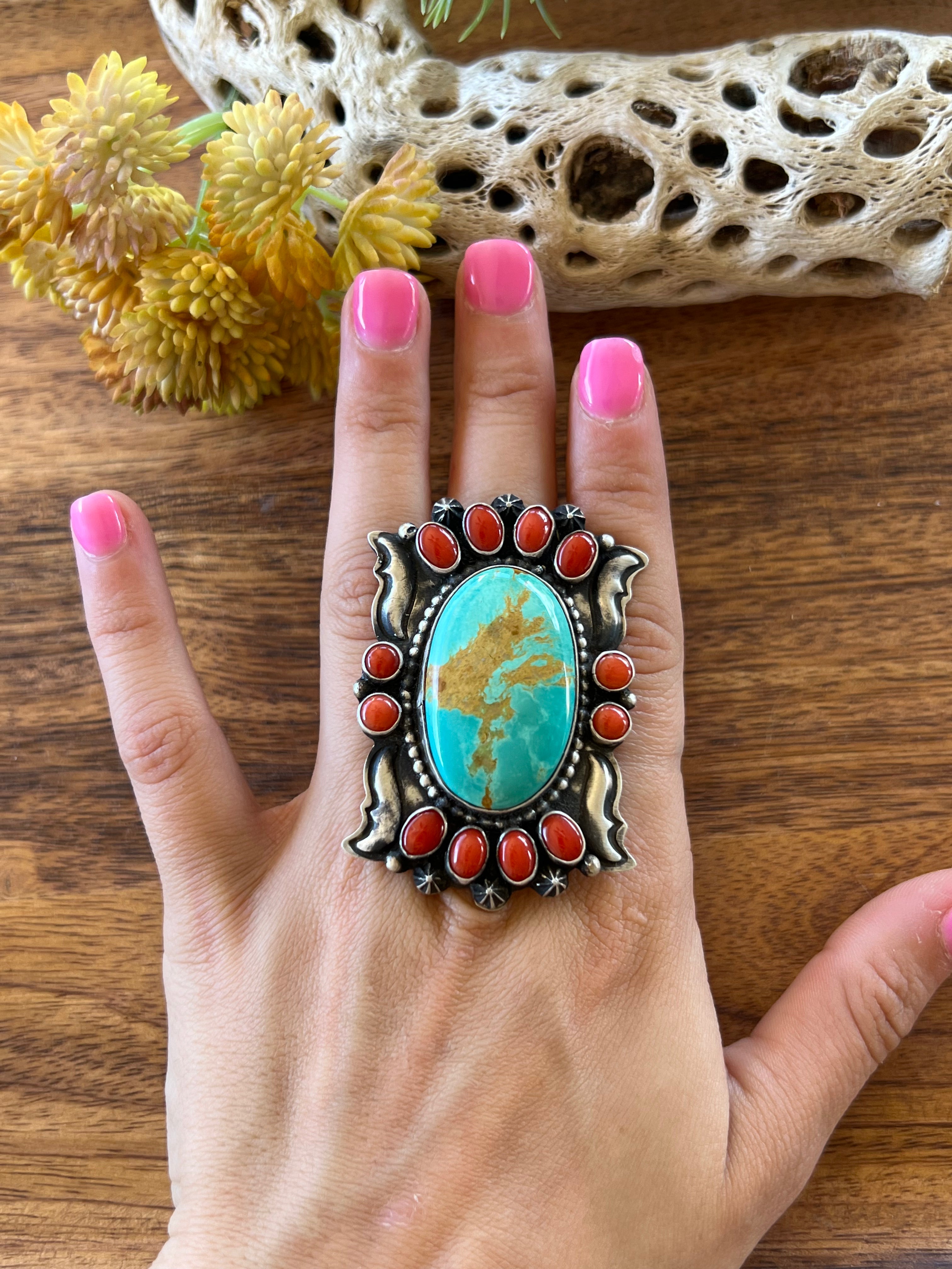 Shawn Cayatineto King Manassa Turquoise & Mediterranean Coral & Sterling Silver Ring Size 6.75. It measures 2 1/4 inches long and just under 1 3/4 inches wide. Signed by the artist and stamped sterling silver.