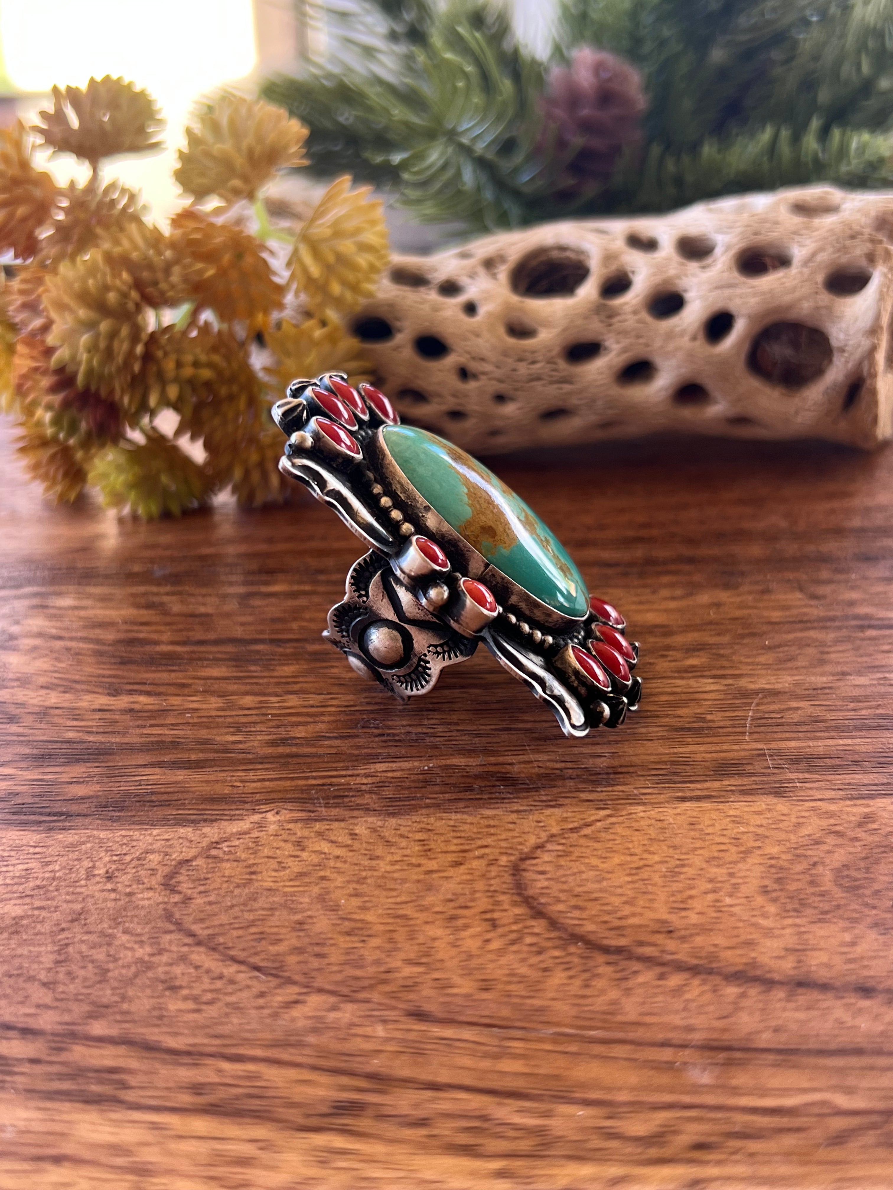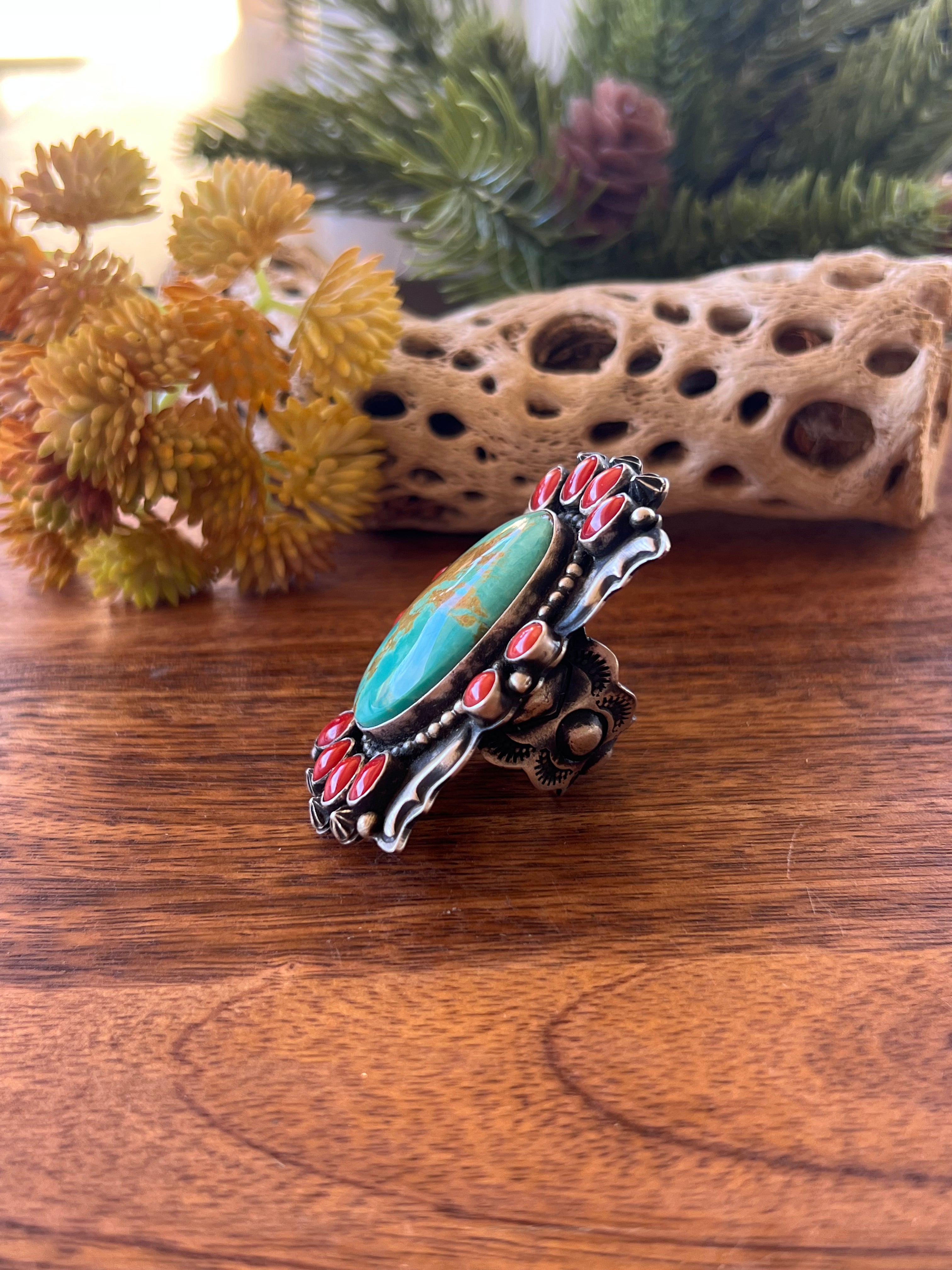 Shawn Cayatineto King Manassa Turquoise & Mediterranean Coral & Sterling Silver Ring Size 6.75
