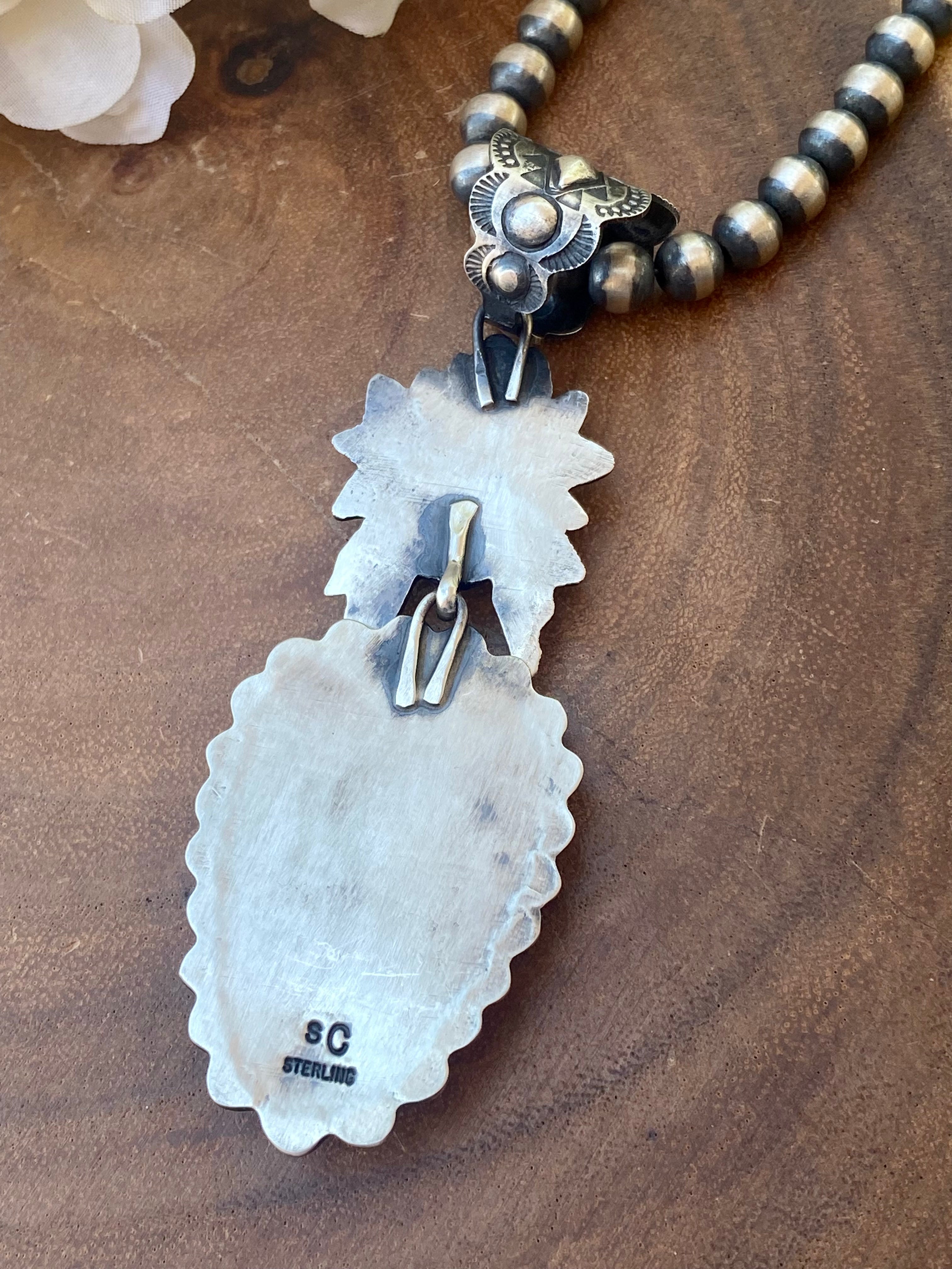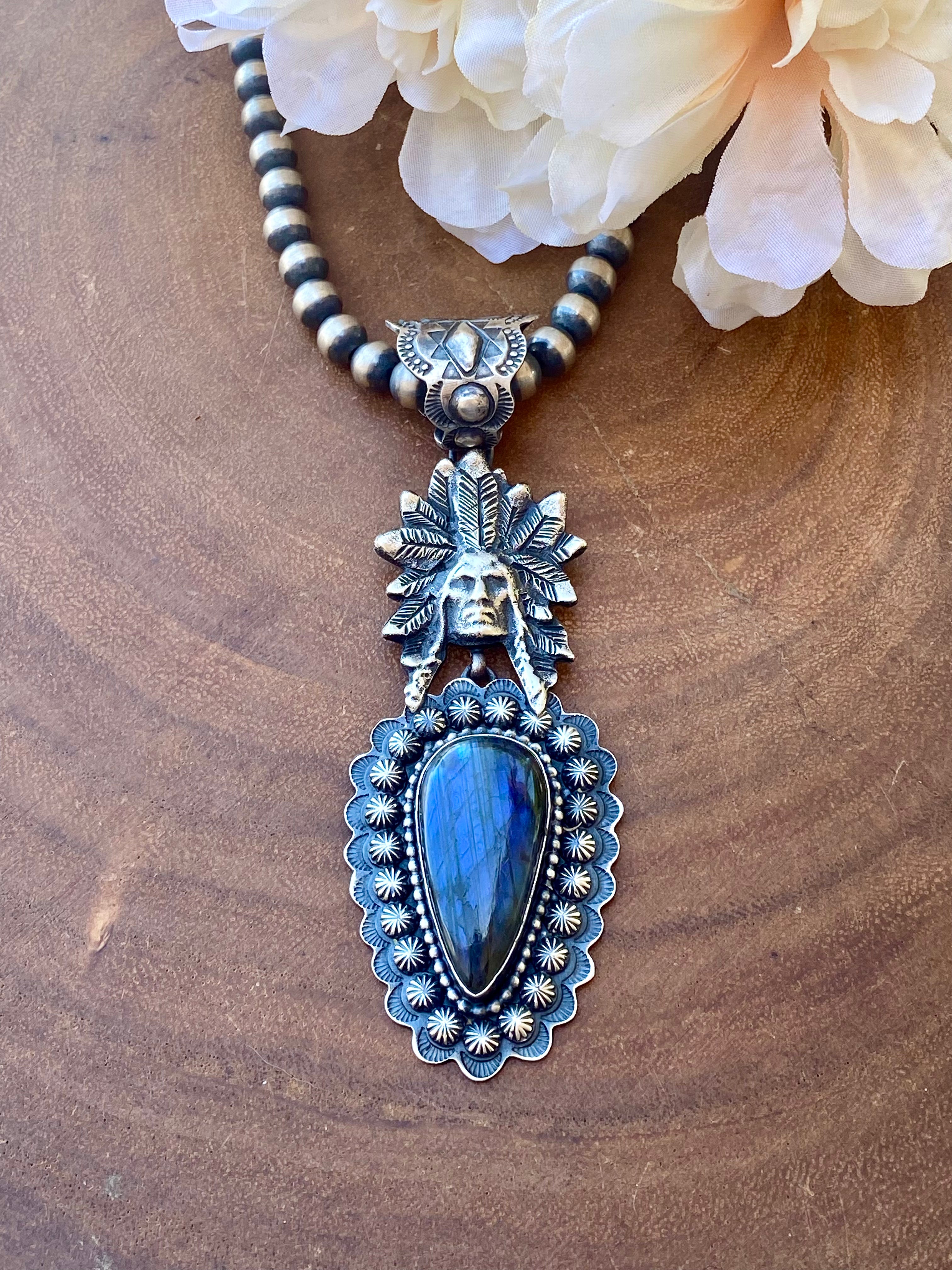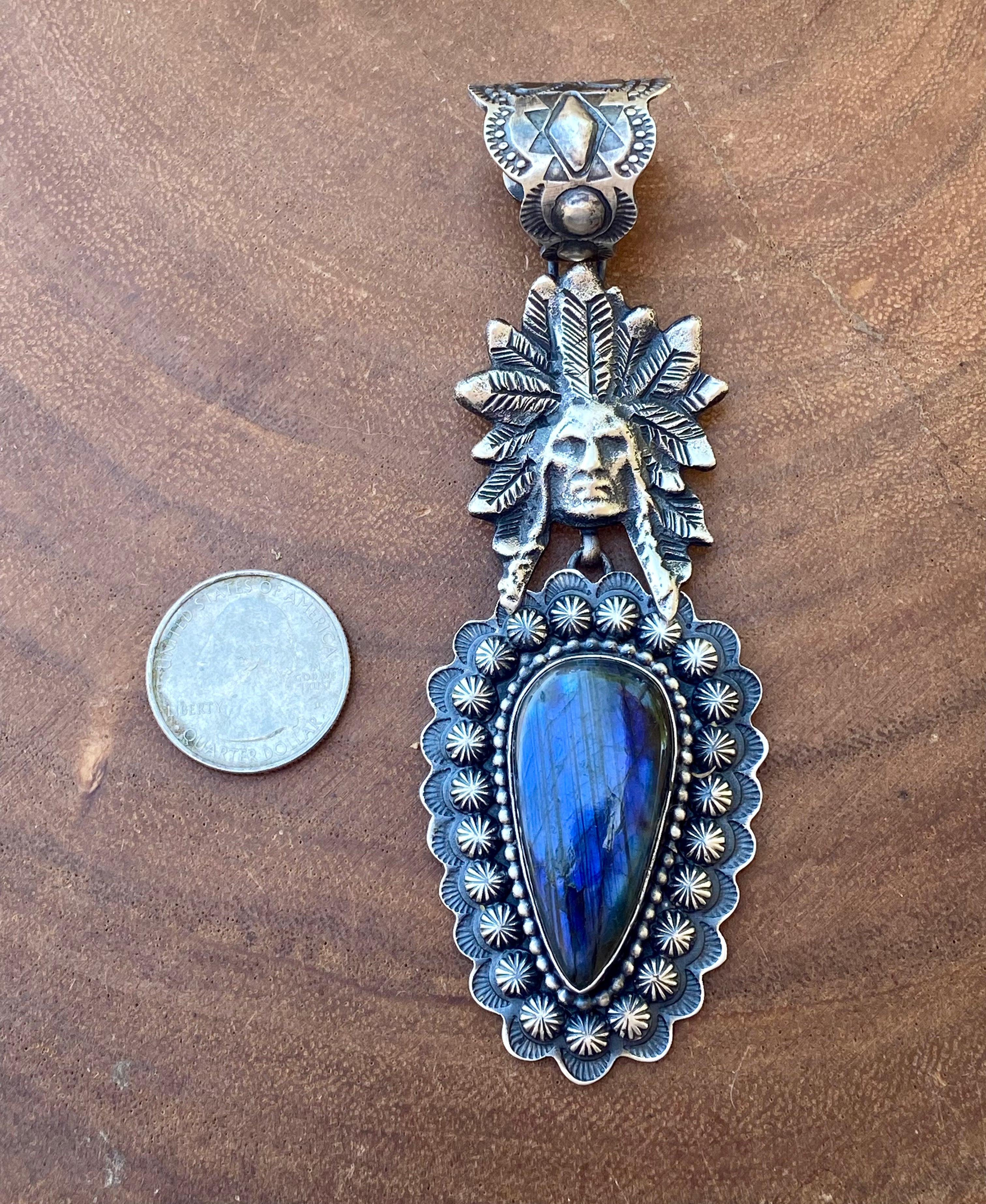 Shawn Cayatineto Labradorite & Sterling Silver Chief Pendant. It measures 4 1/2 inches long and just over 1 1/2 inches wide. Pendant Only!! Singed by the artist and stamped sterling silver.