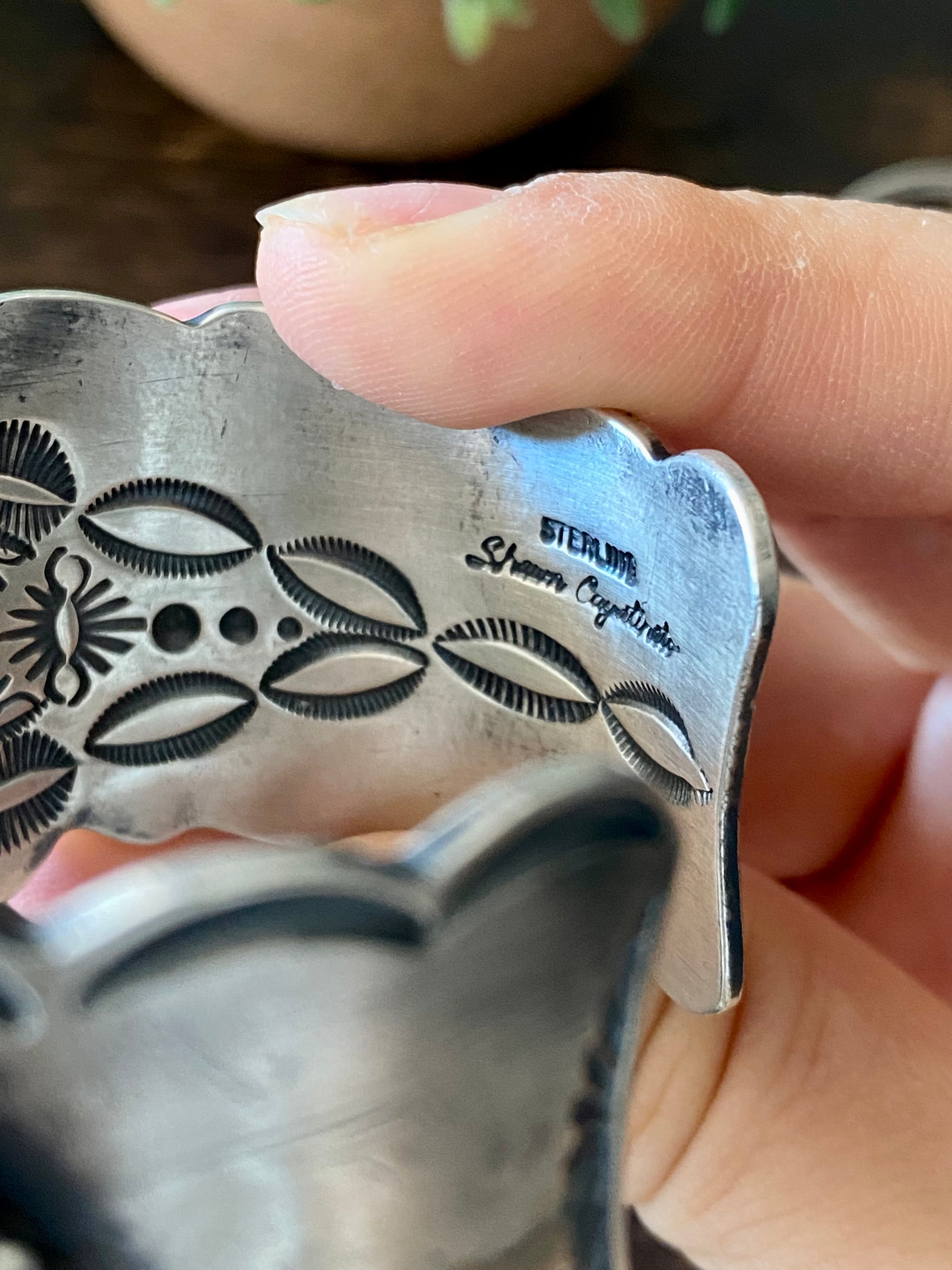 Shawn Cayatineto Royston Turquoise & Sterling Silver Cuff Bracelet. It measures 1 3/4 inches wide with an inside circumference of 5 3/8 inches and a gap of 1 inch. Signed by the artist and stamped sterling silver.