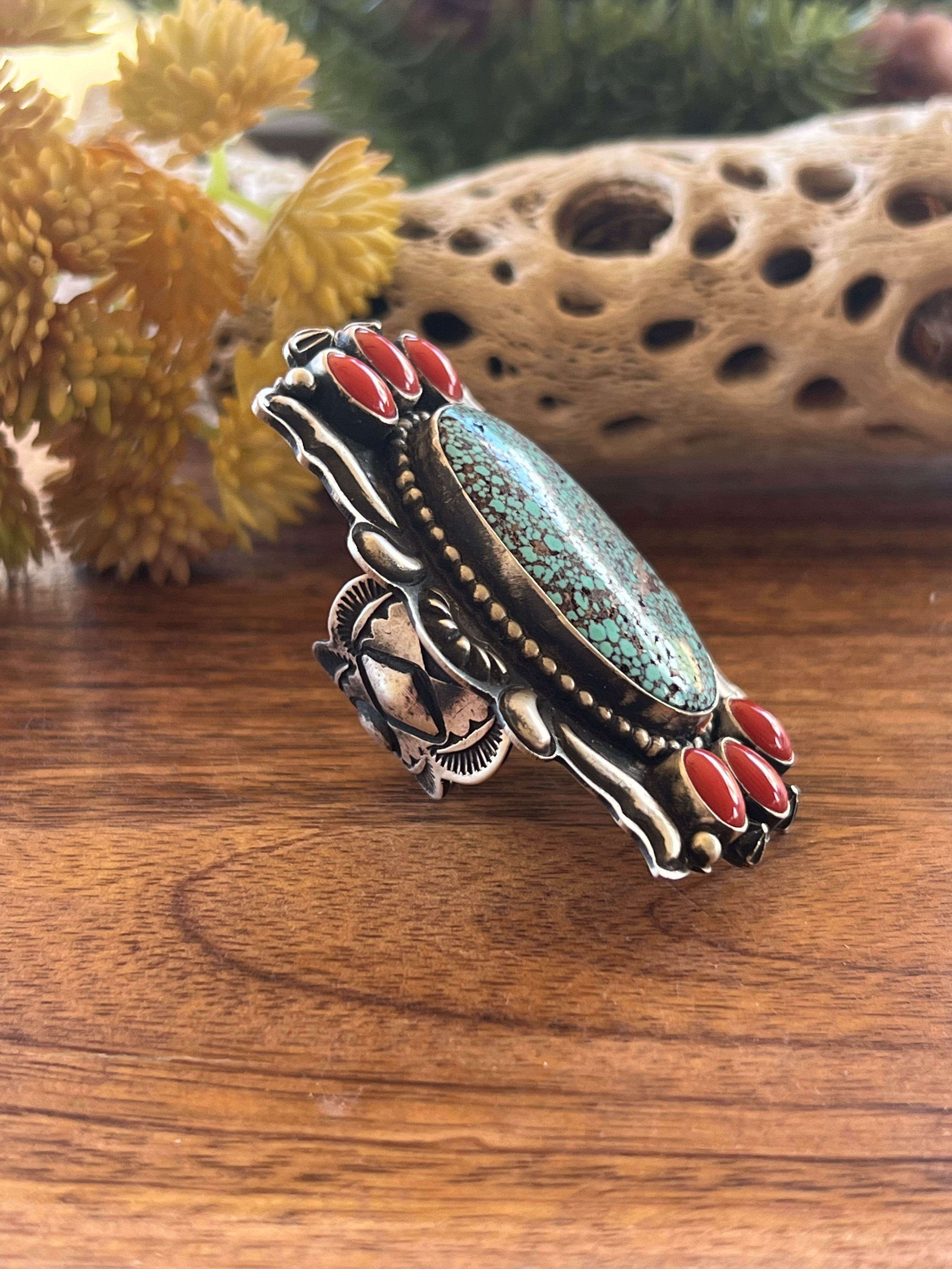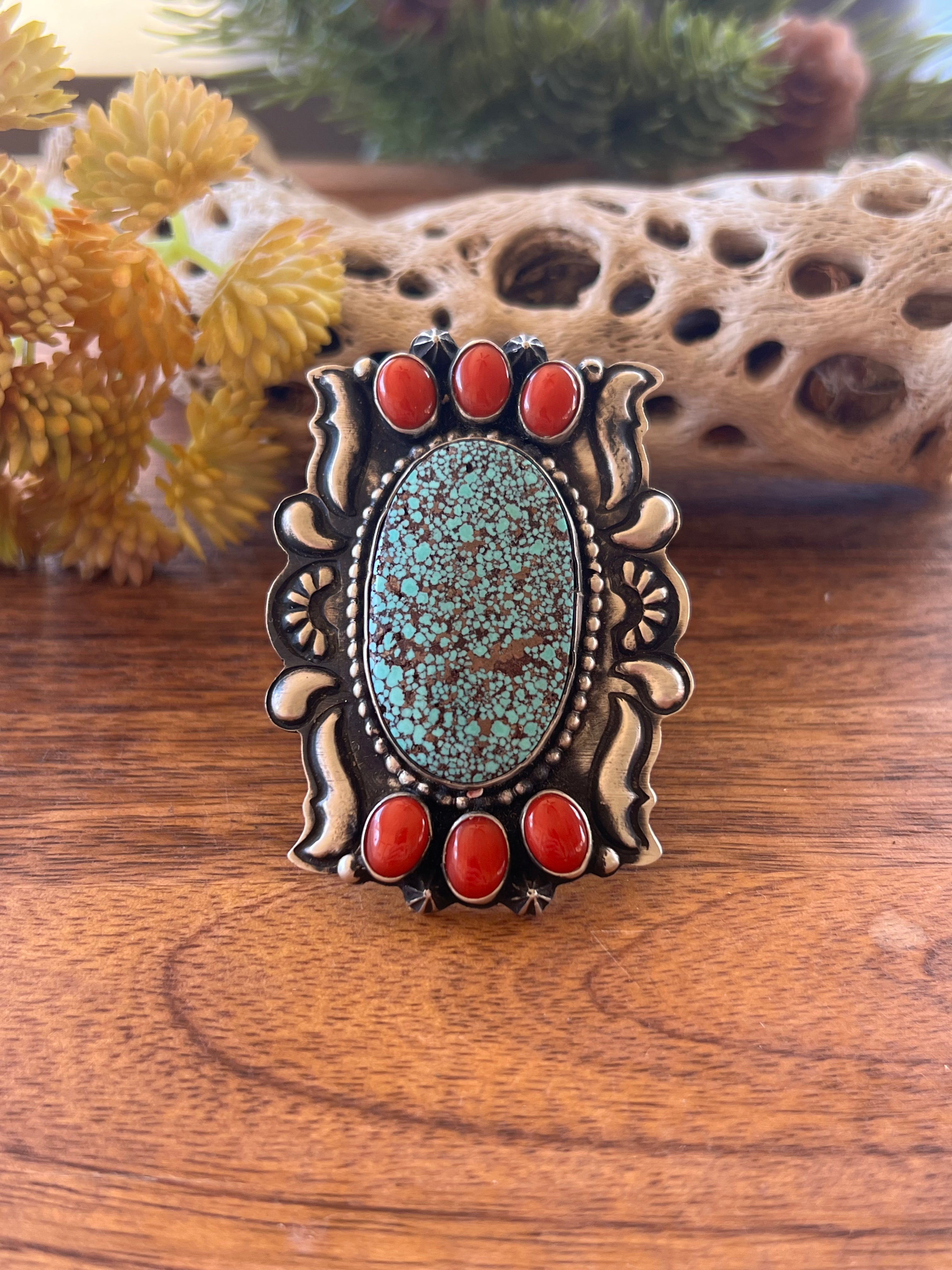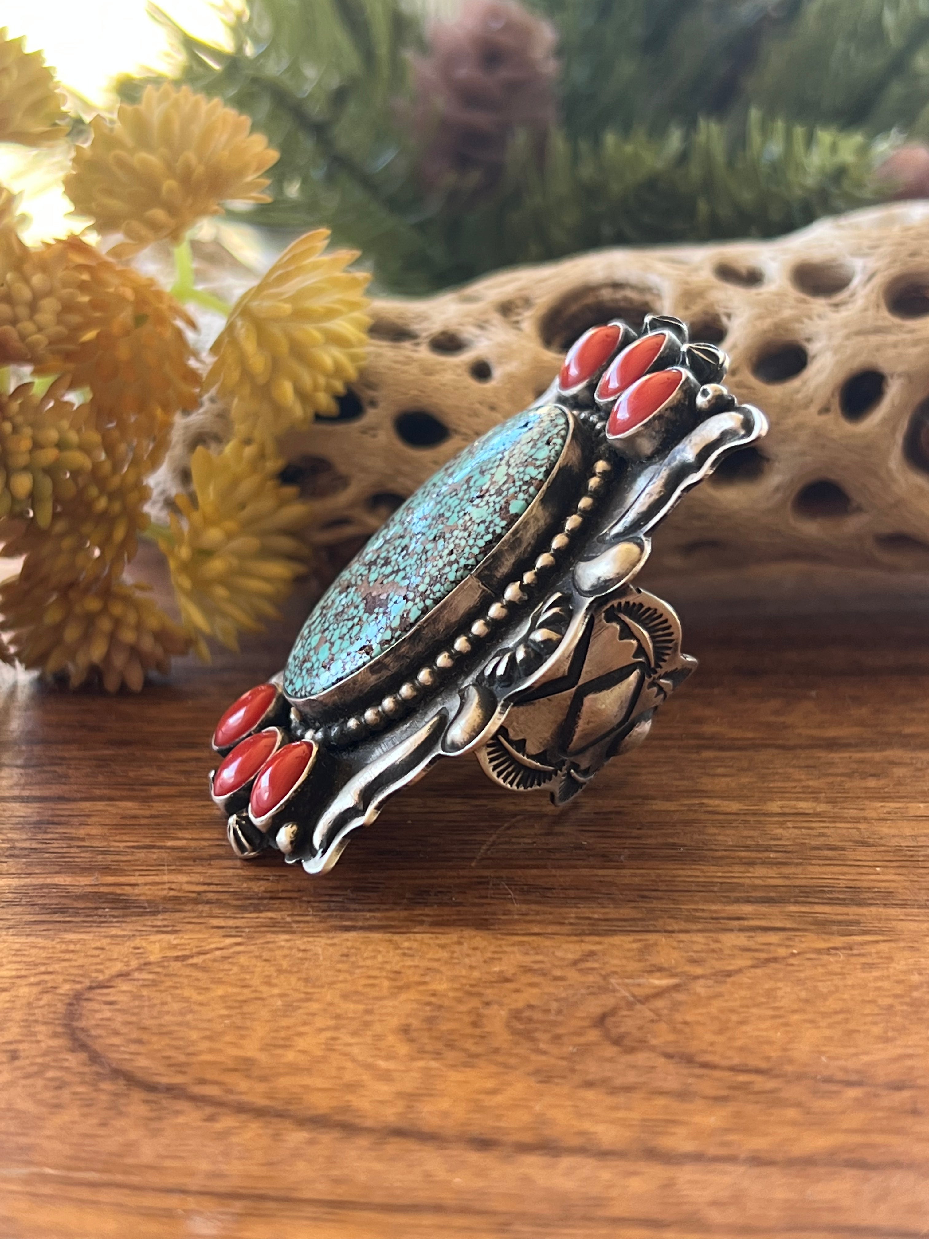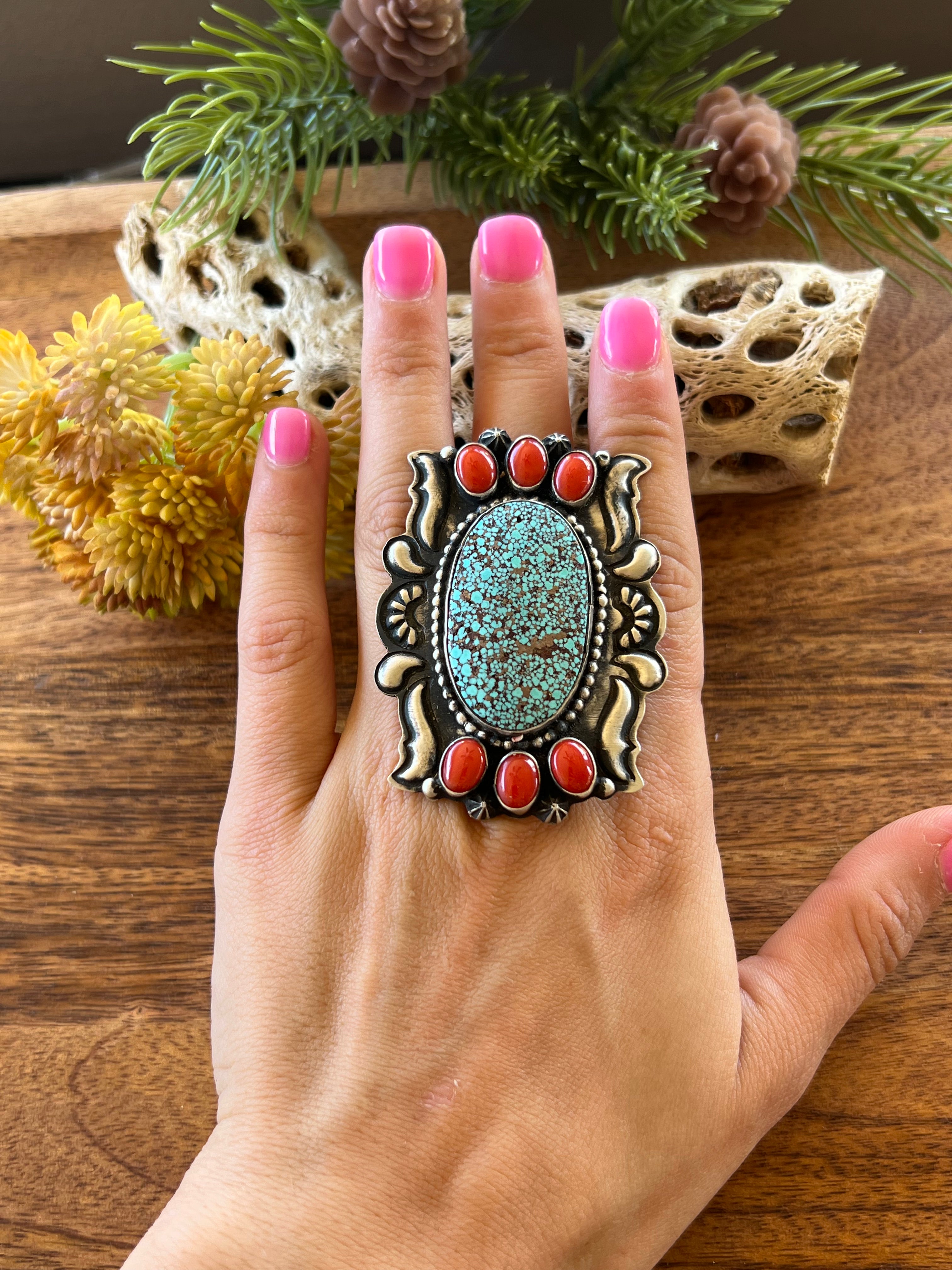 Shawn Cayatineto Turquoise Mountain & Mediterranean Coral & Sterling Silver Ring Size 7.5