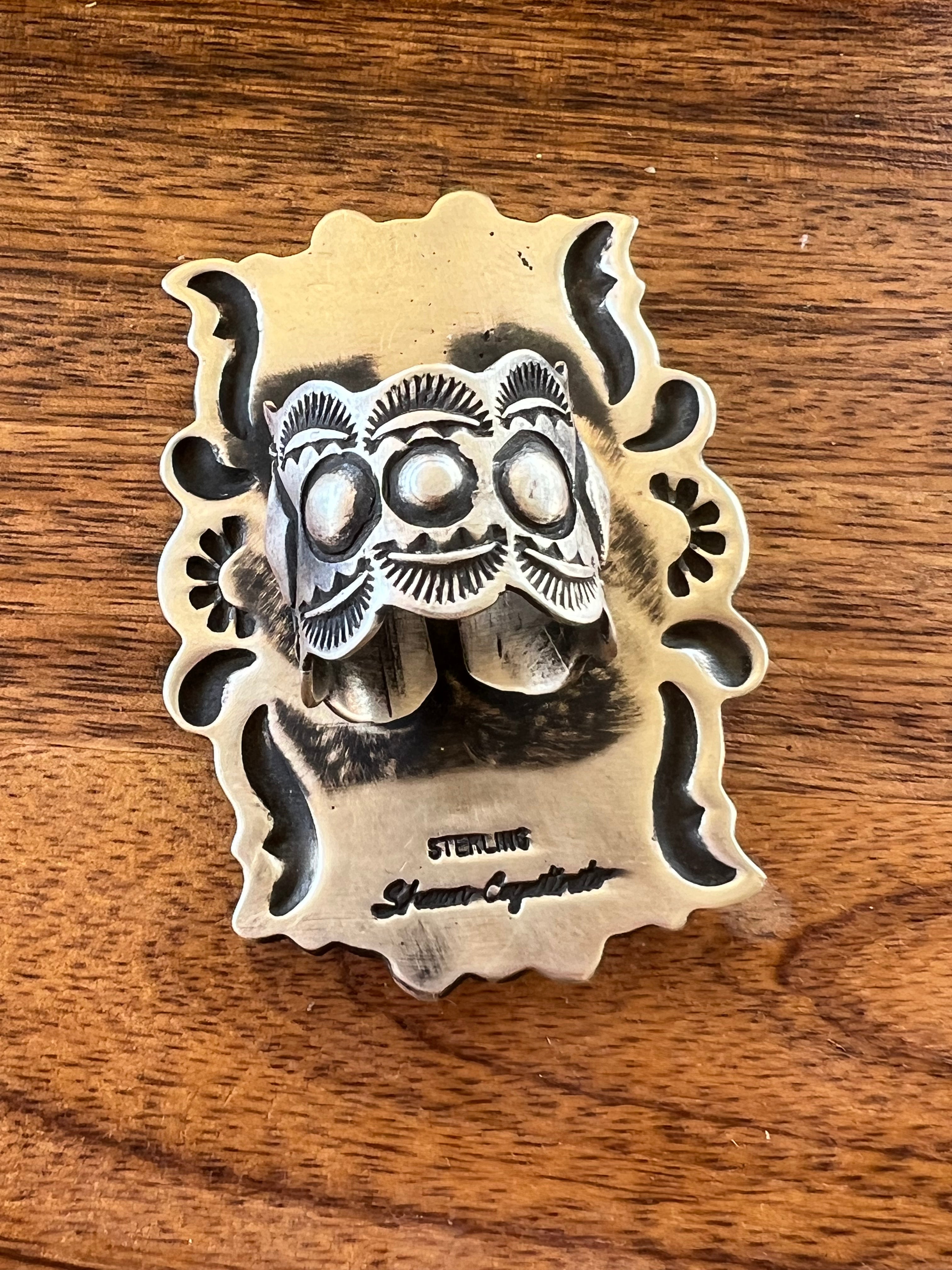 Shawn Cayatineto Turquoise Mountain & Mediterranean Coral & Sterling Silver Ring Size 7.5. It measures 2 3/8 inches long and just under 1 3/4 inches wide. Signed by the artist and stamped sterling silver.