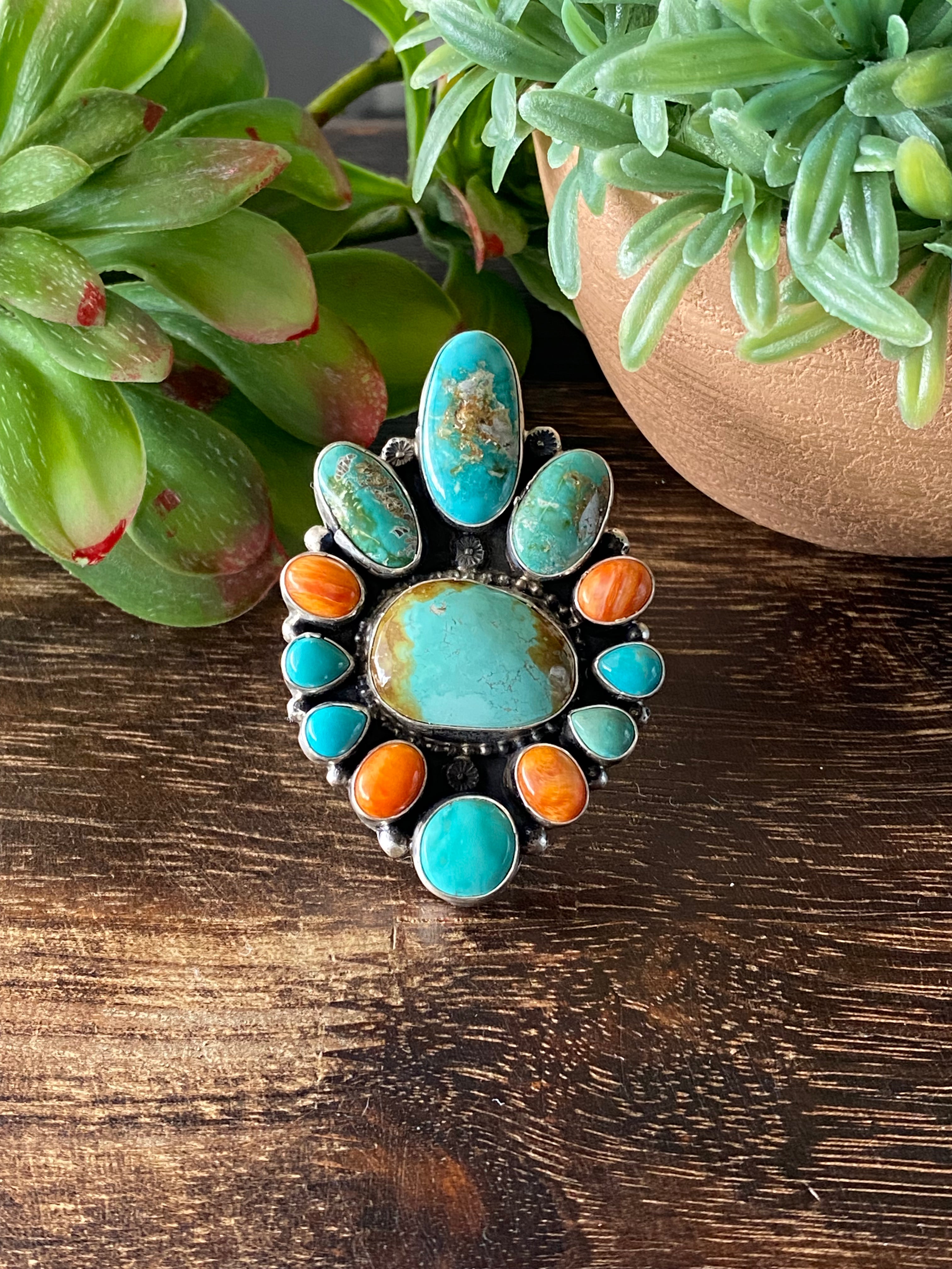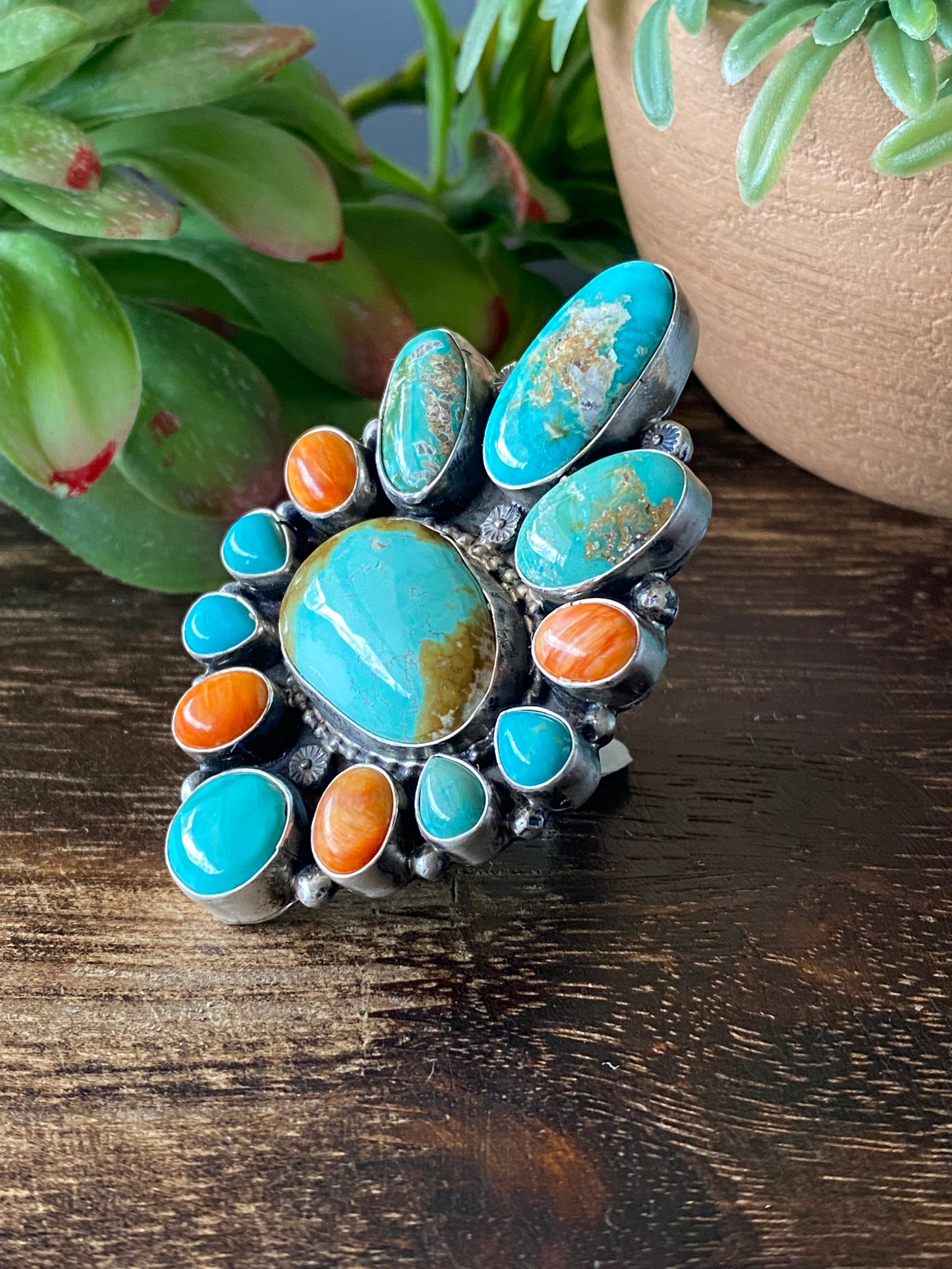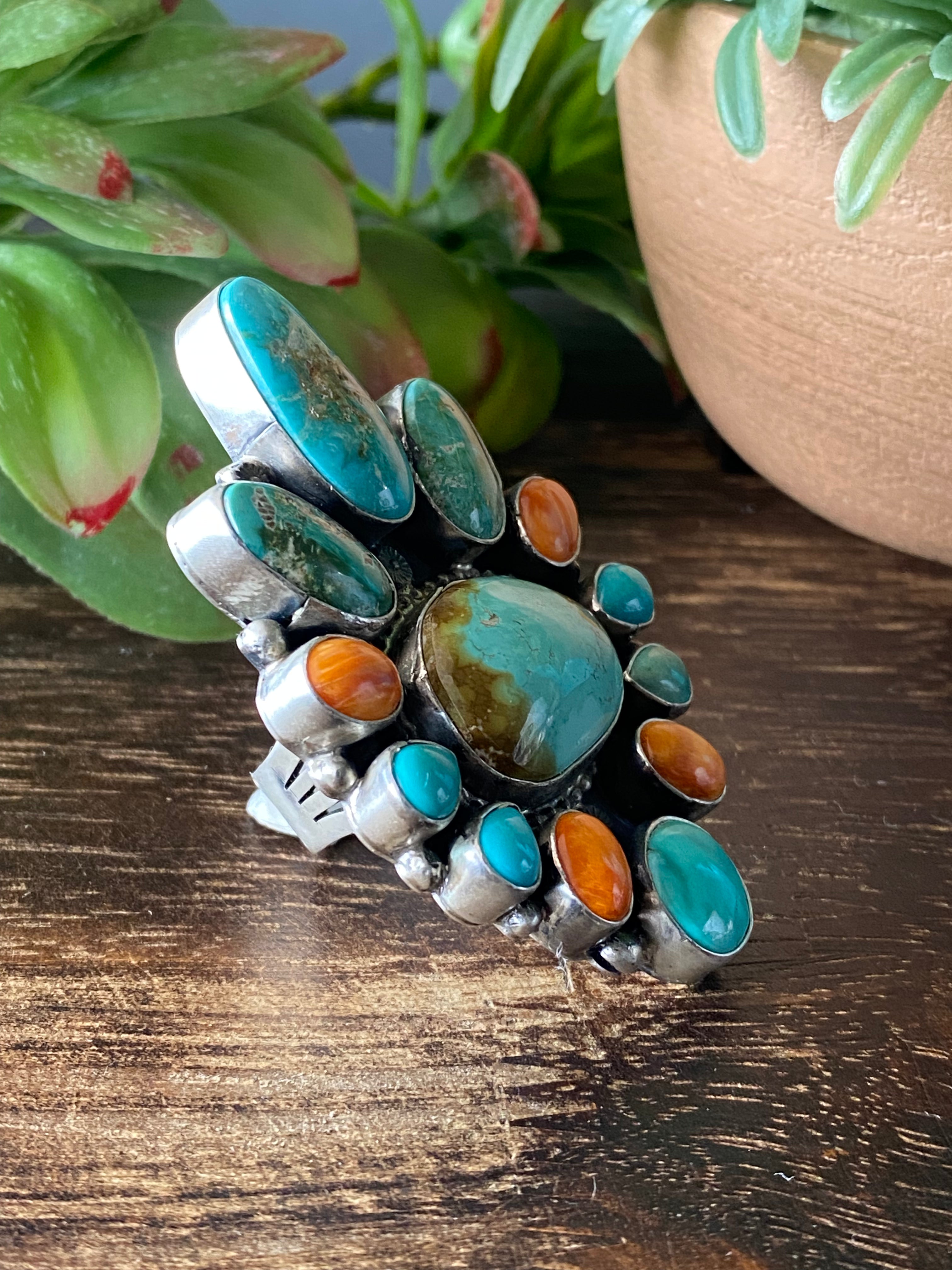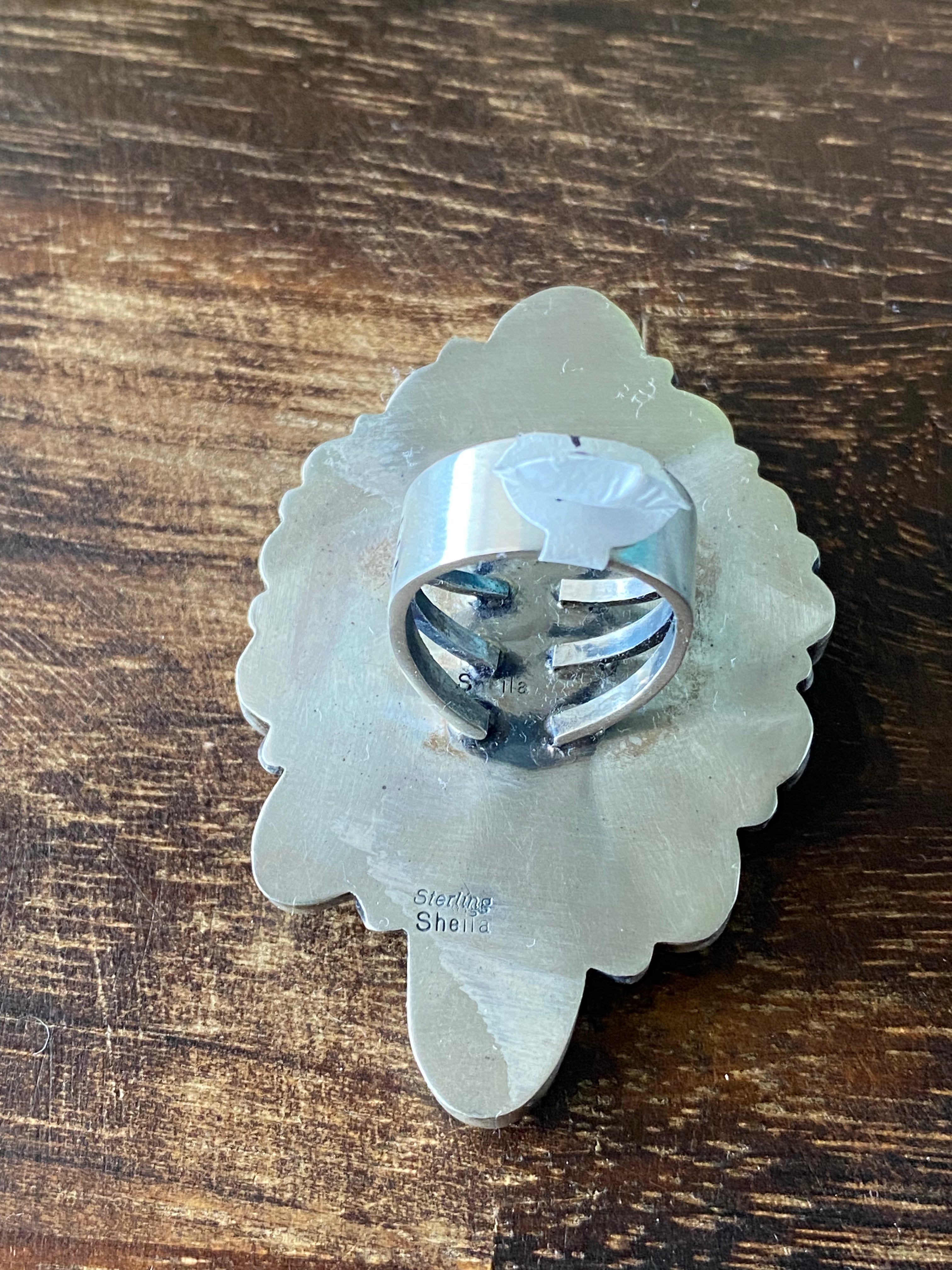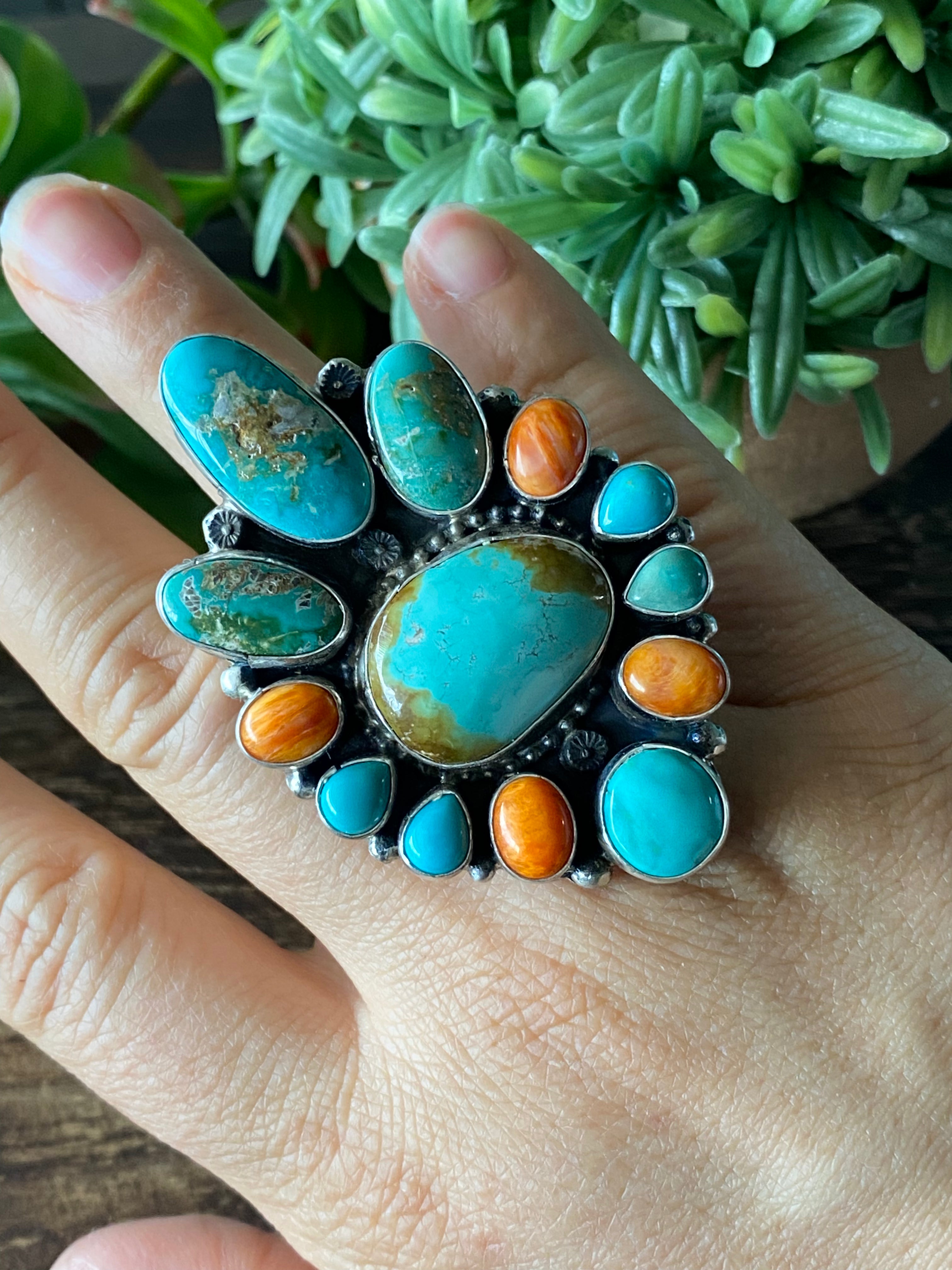 Sheila Becenti Multi Stone & Sterling Silver Cluster Ring Size 7. It measures 2 1/2 inches long and 1 5/8 inches wide. Signed by the artist and stamped sterling silver.