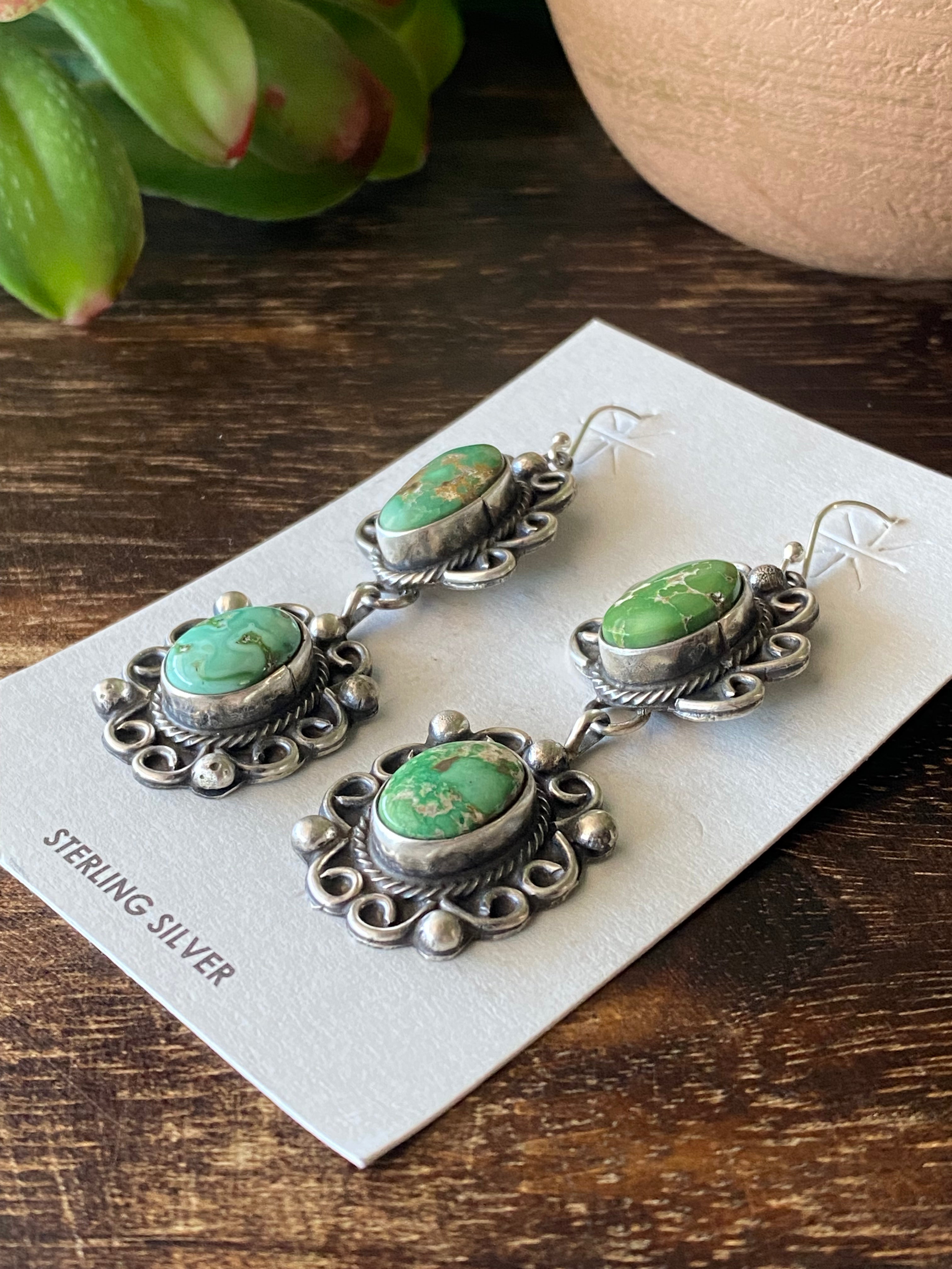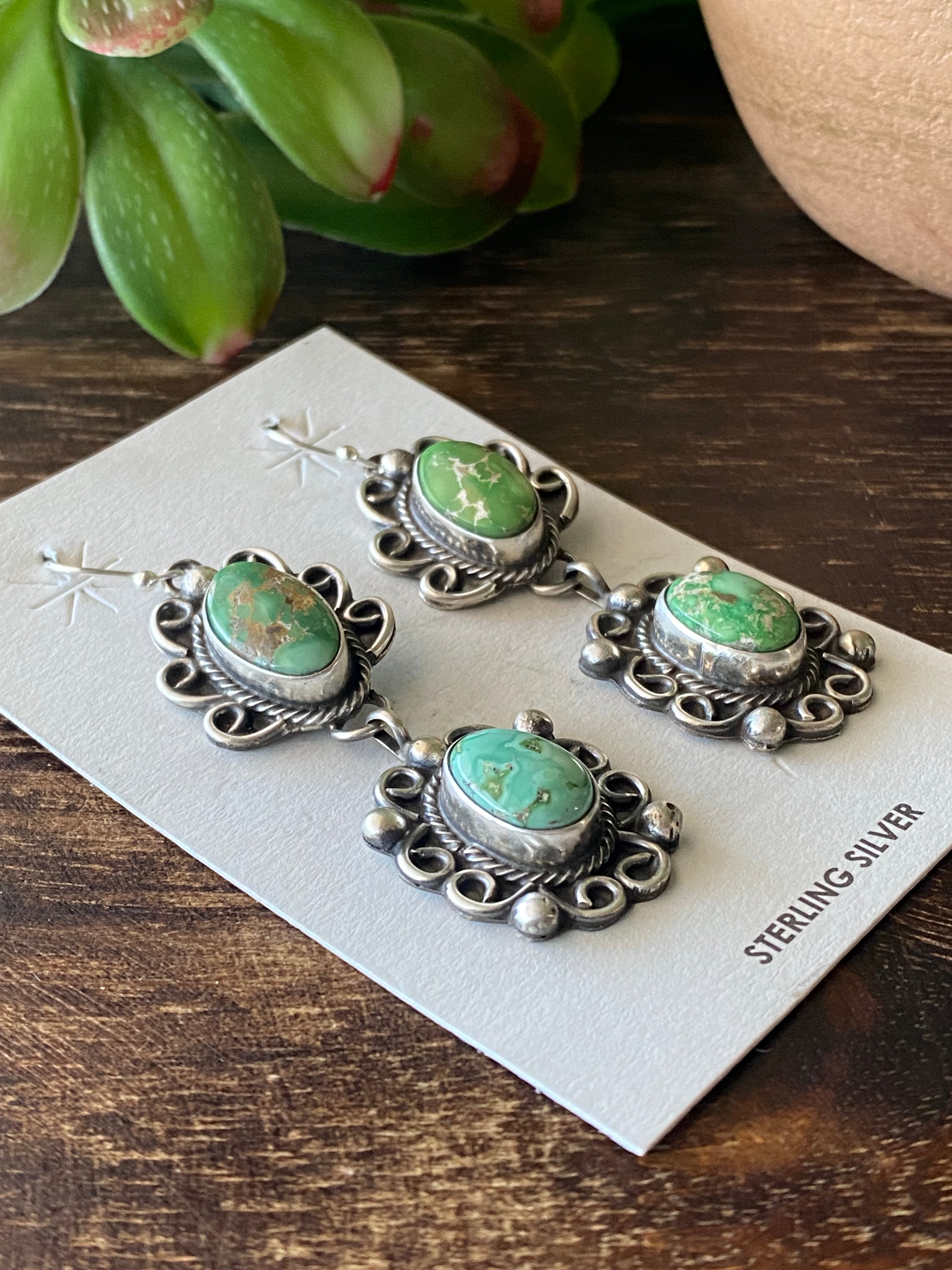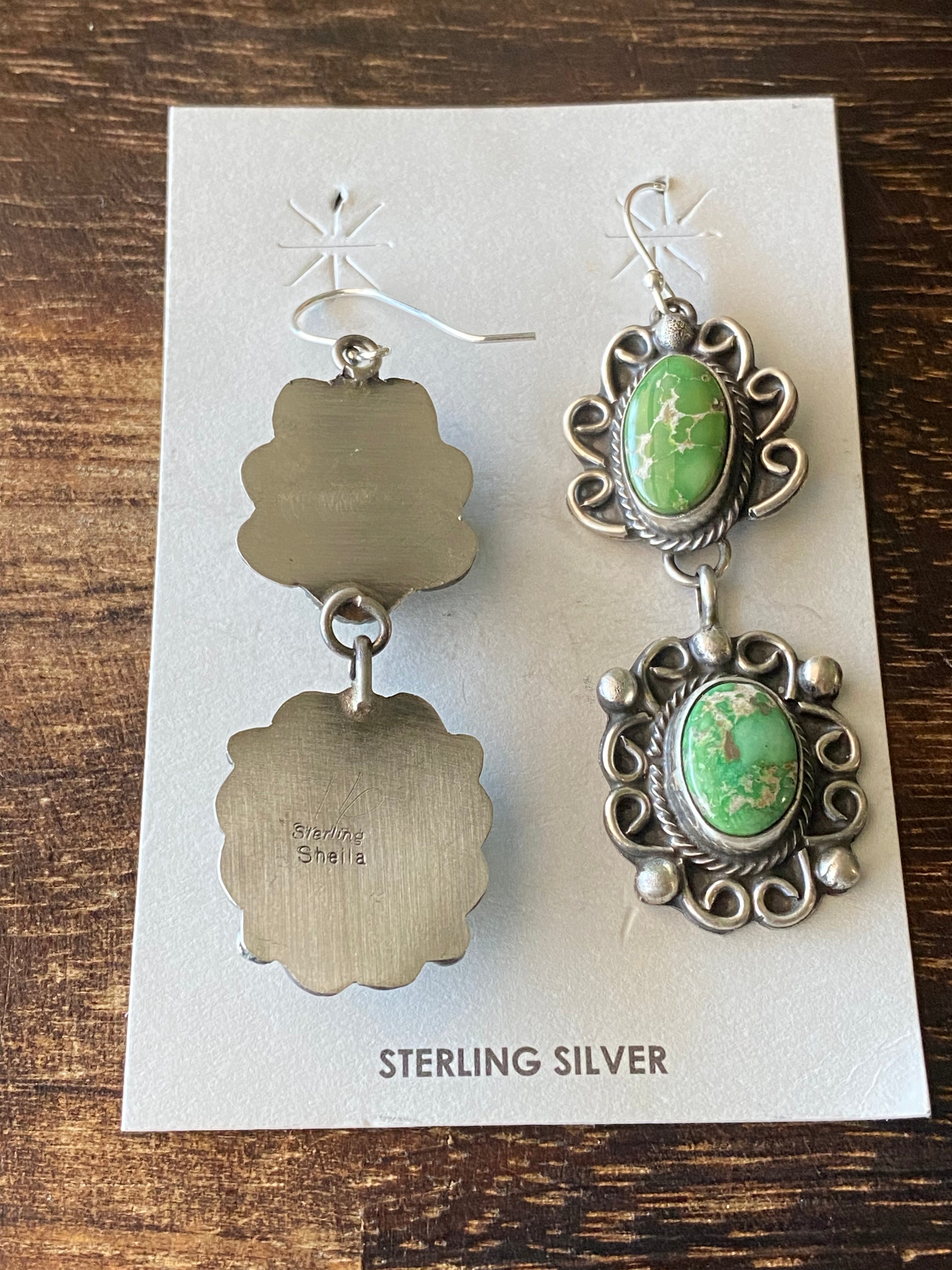 Sheila Becenti Sonoran Gold Turquoise & Sterling Silver Dangle Earrings. They measure 2 5/8 inches long and 7/8 of an inch wide. Signed by the artist and stamped sterling silver.