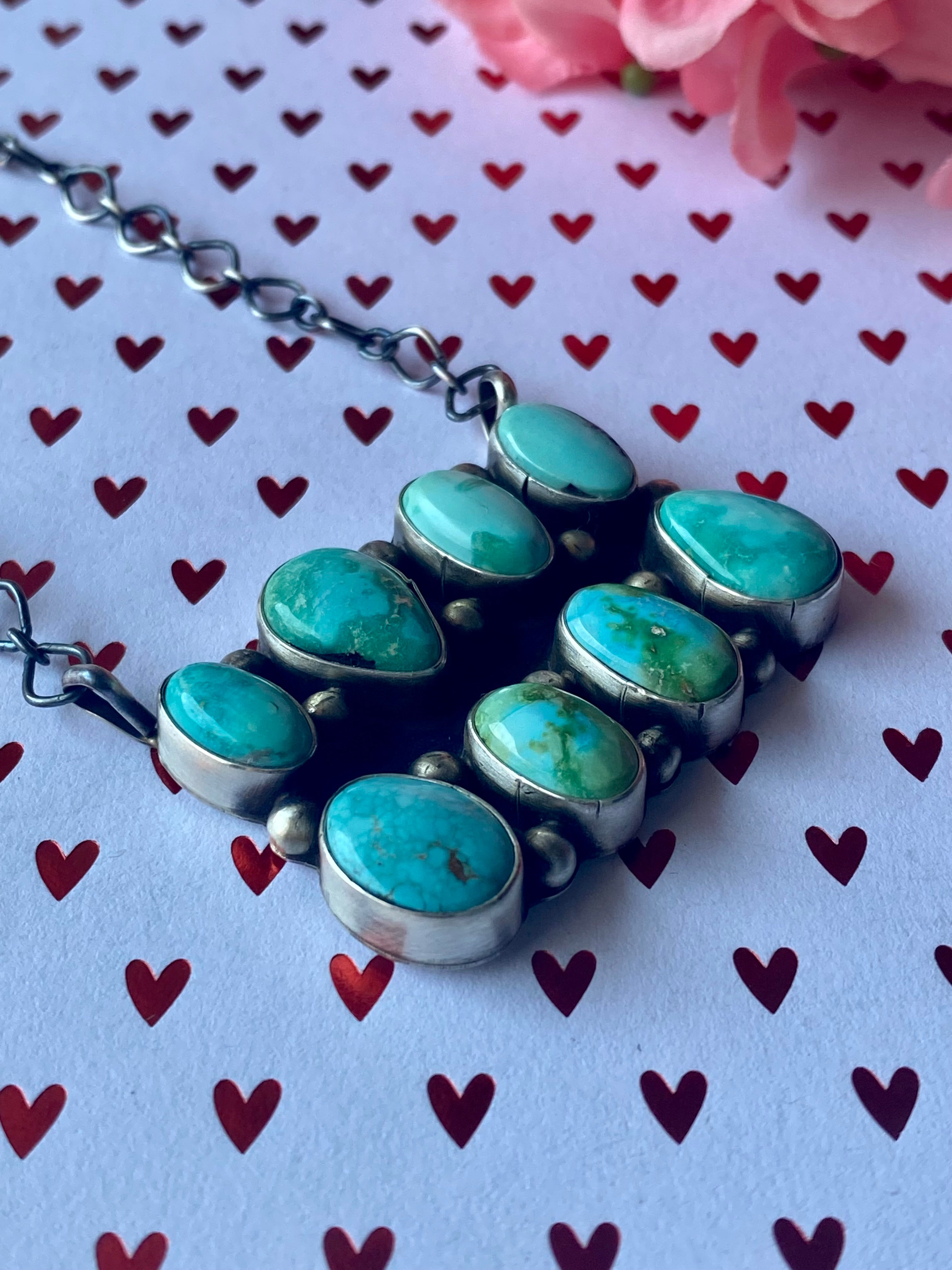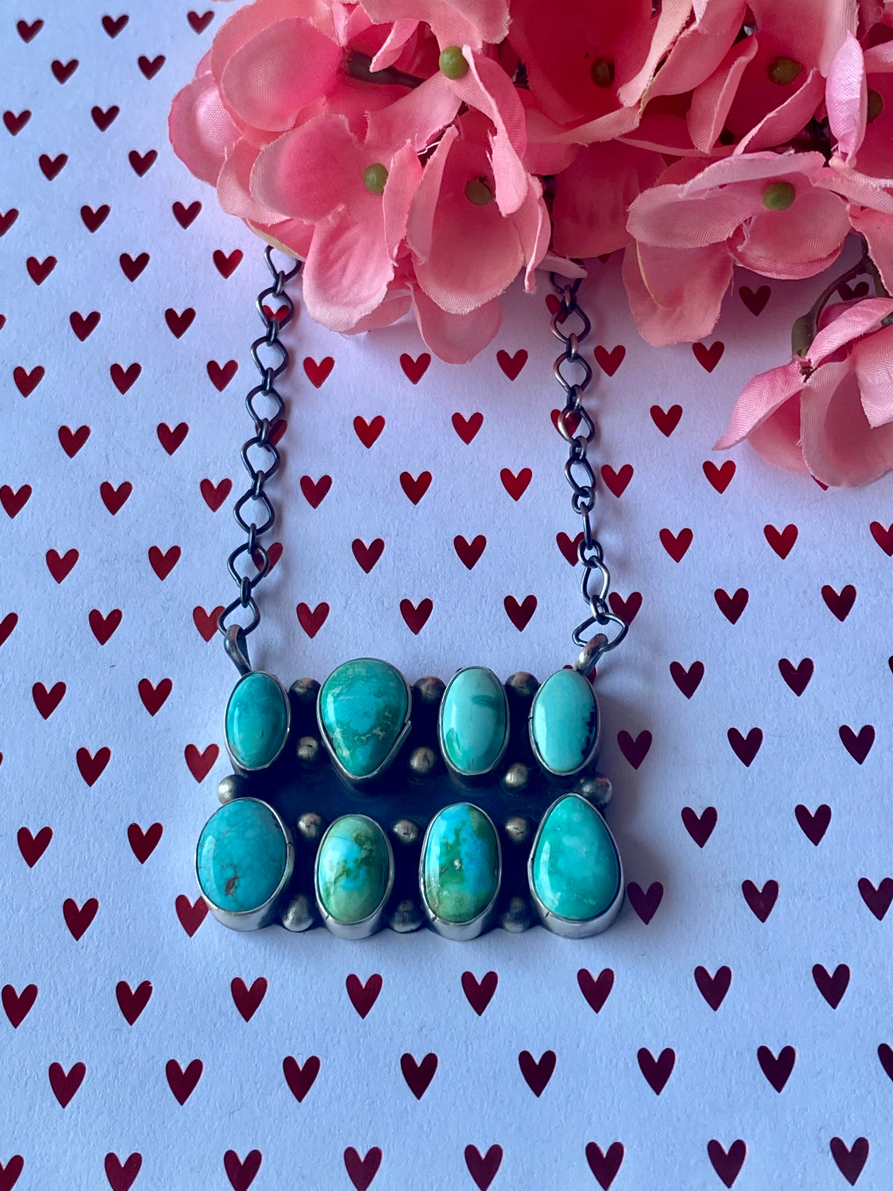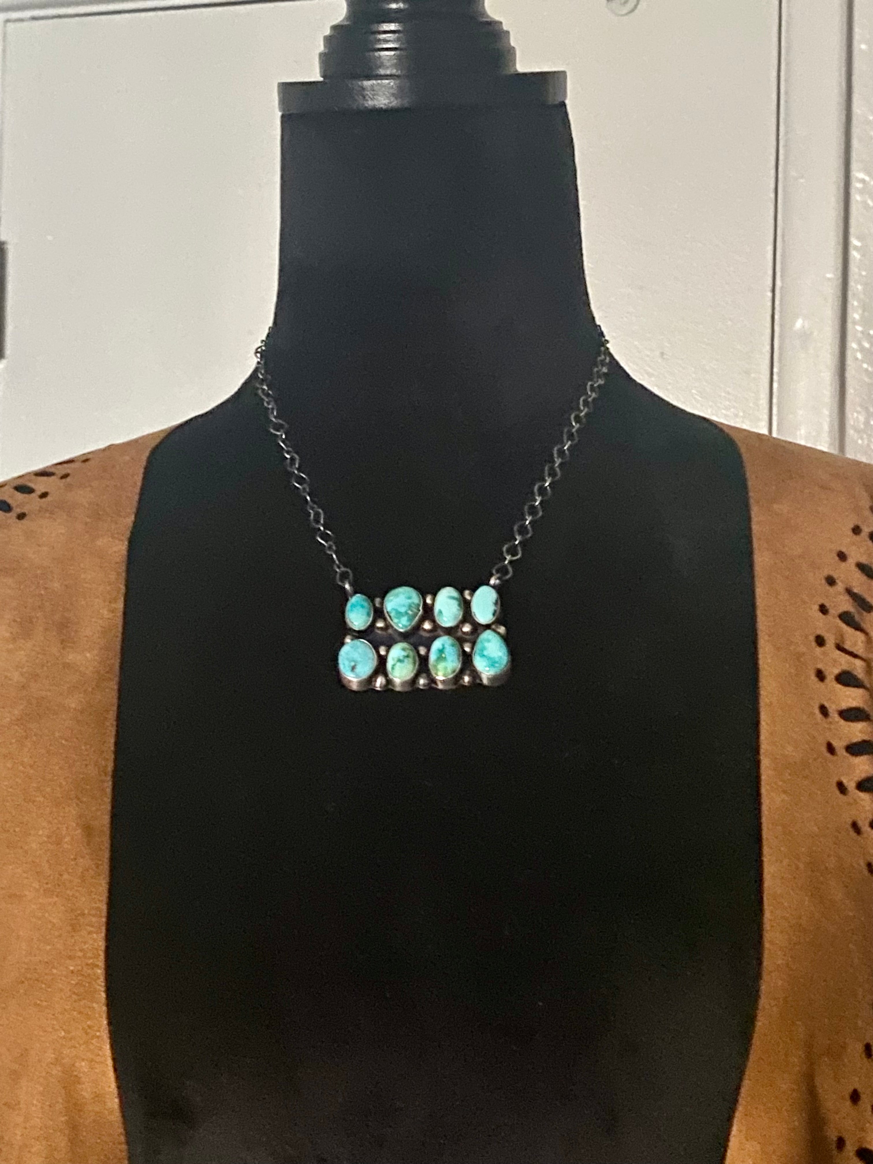 Sheila Becenti Sonoran Mountain Turquoise & Sterling Silver Bar Necklace. It measures 19 inches long with hang while the chain itself measures 16 inches long. Signed by the artist and stamped sterling silver.