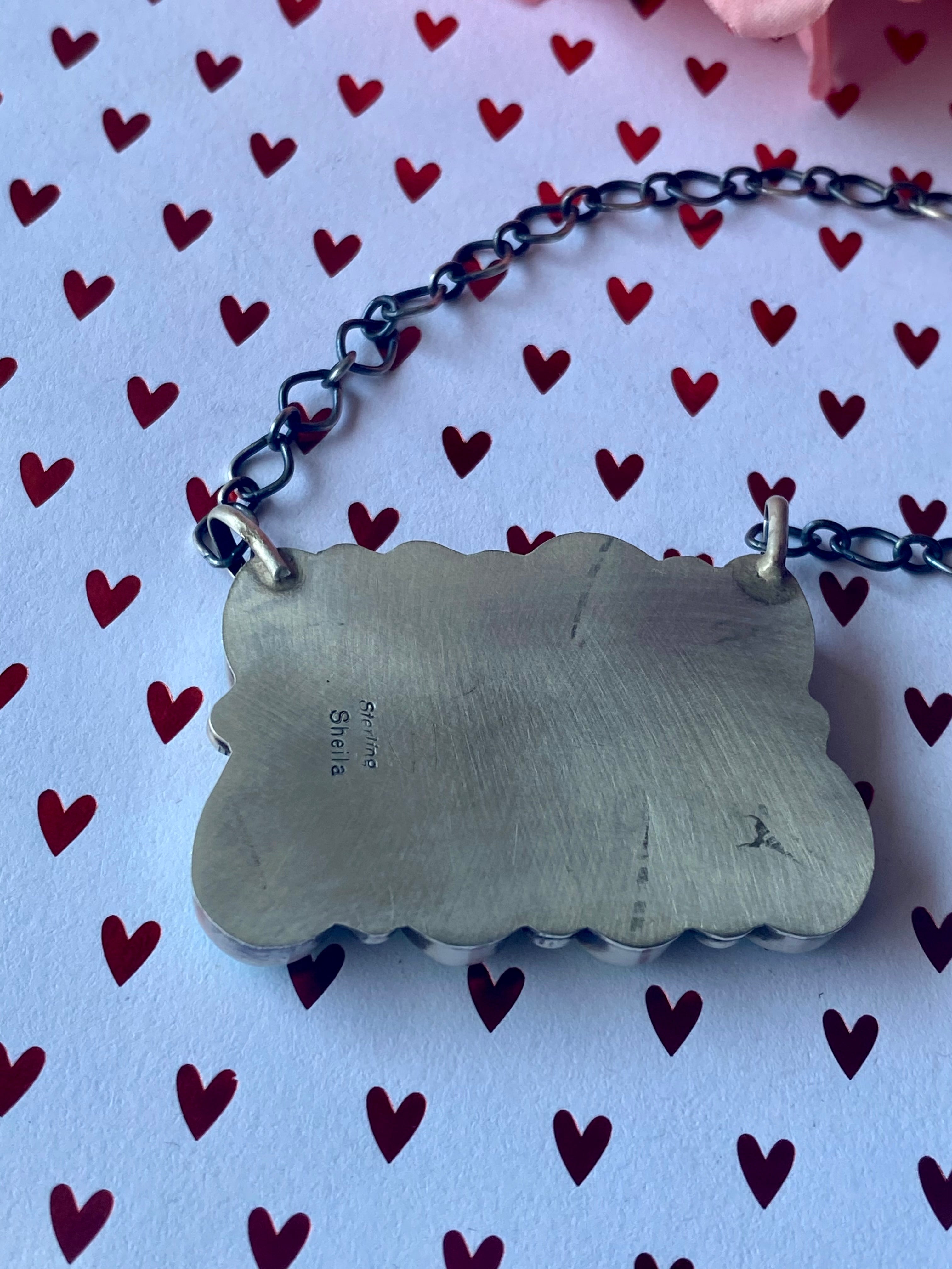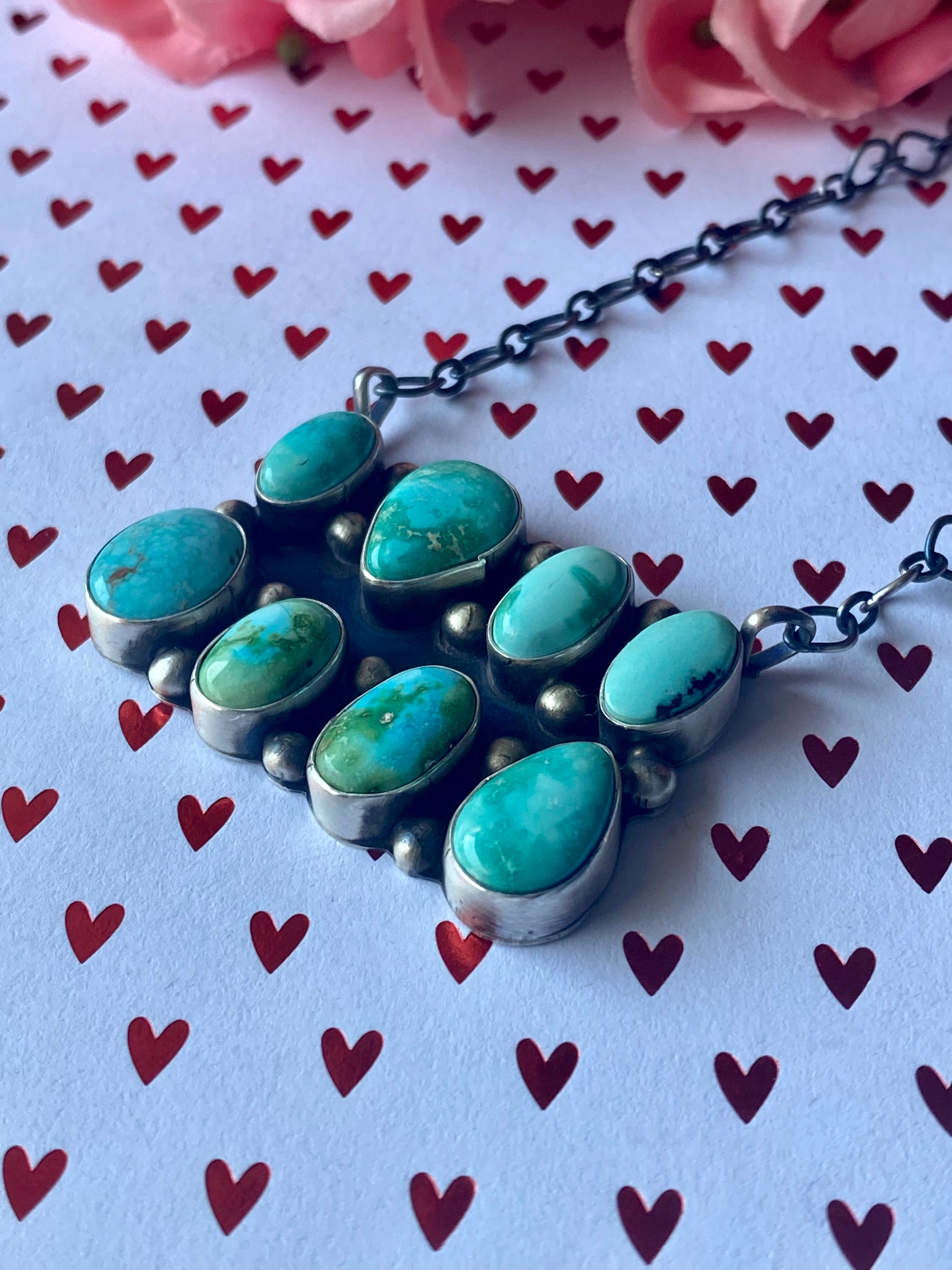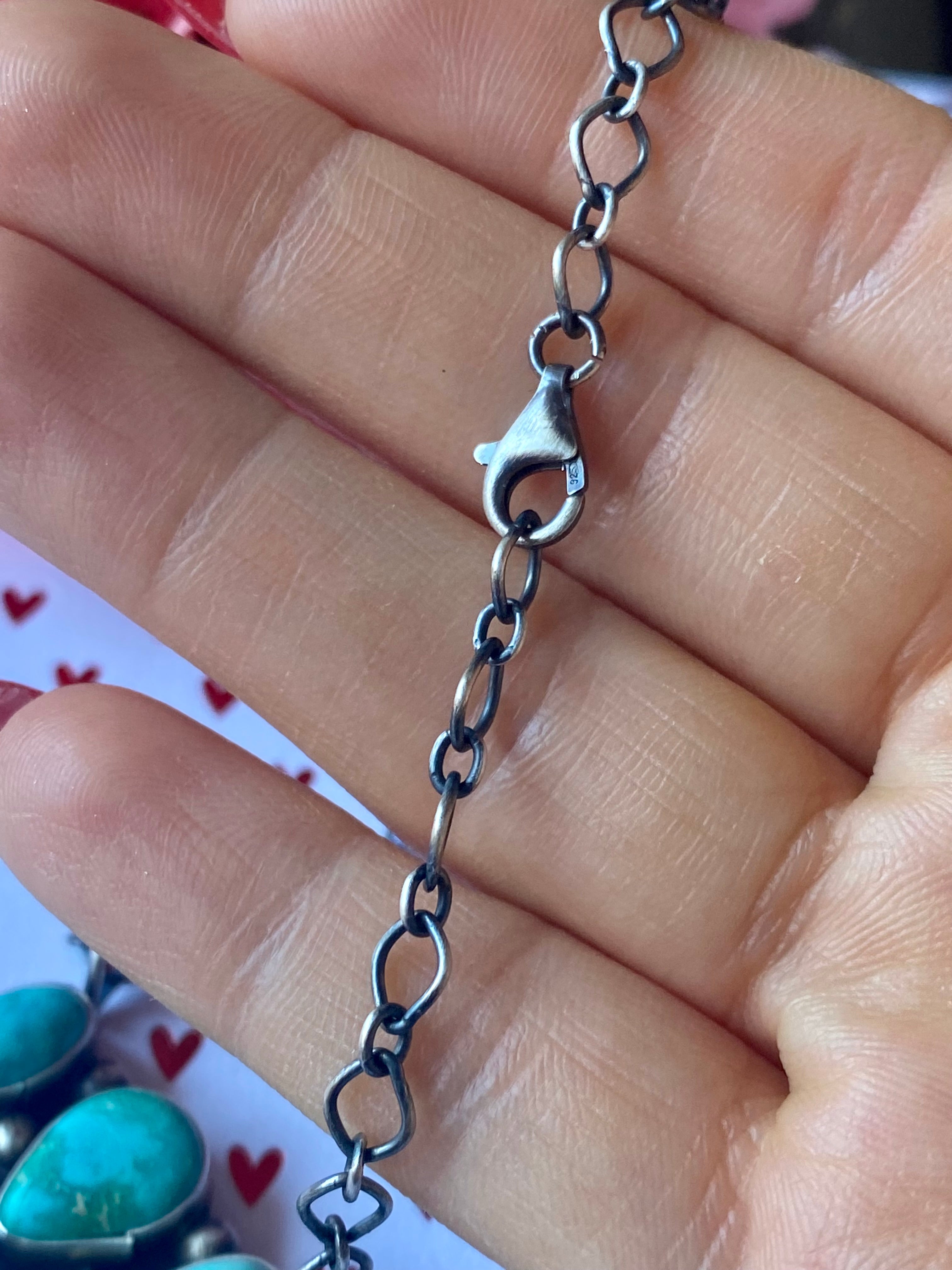 Sheila Becenti Sonoran Mountain Turquoise & Sterling Silver Bar Necklace. It measures 19 inches long with hang while the chain itself measures 16 inches long. Signed by the artist and stamped sterling silver.