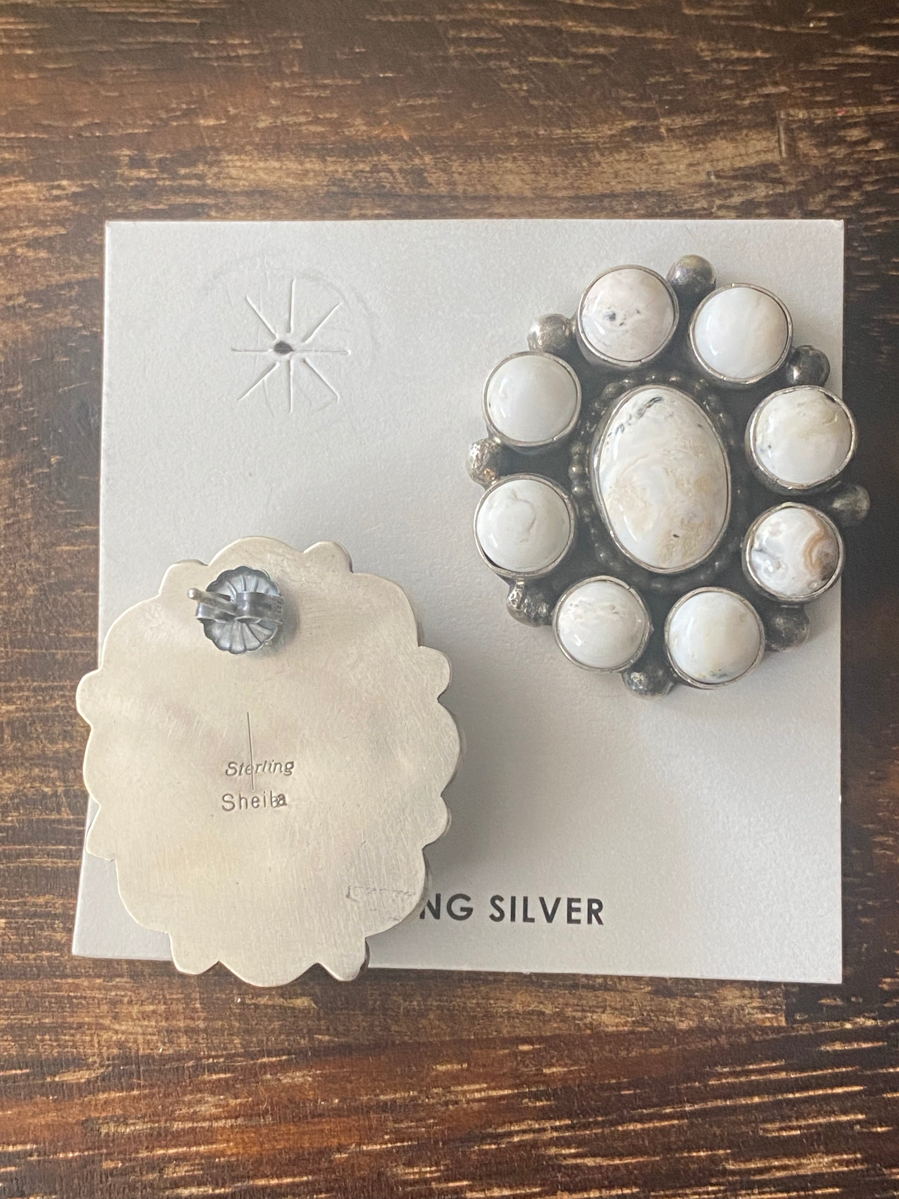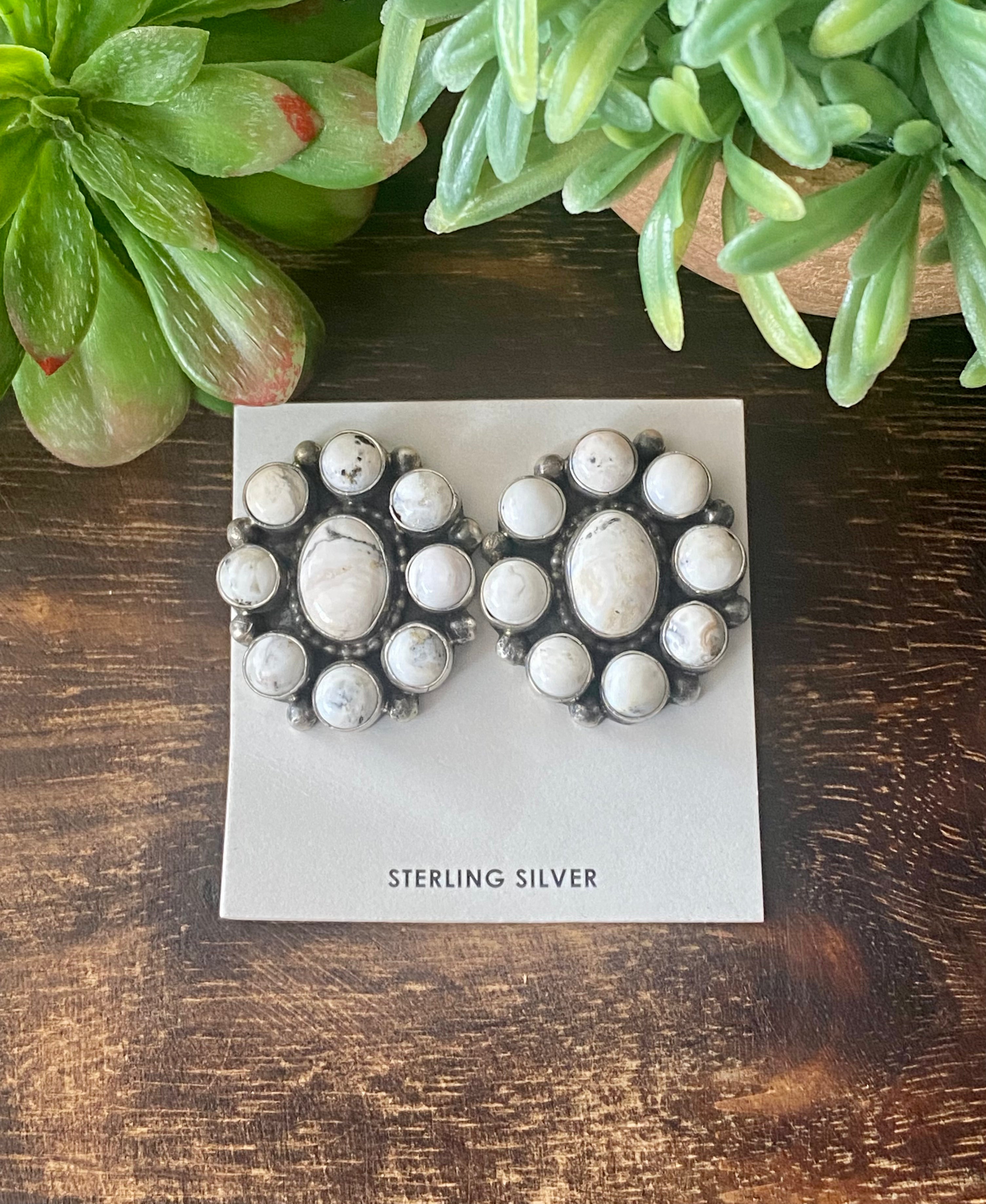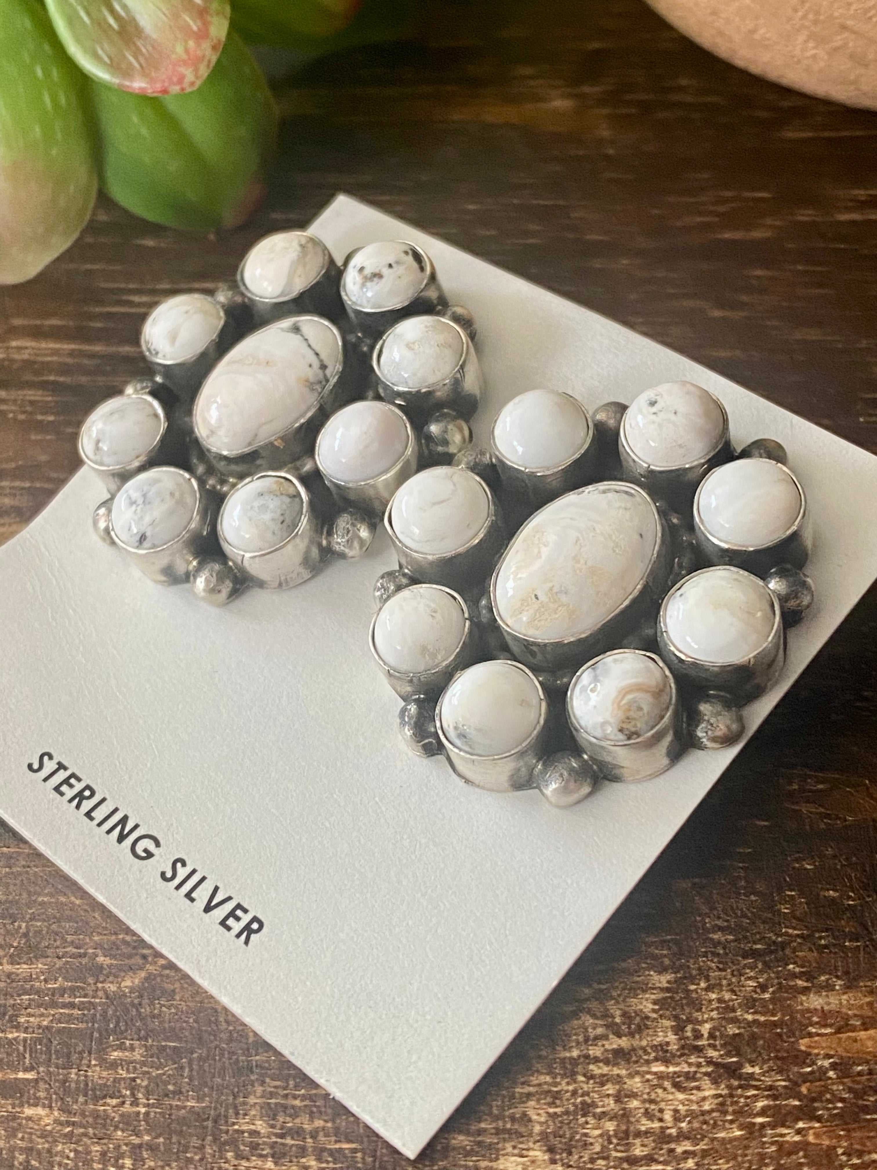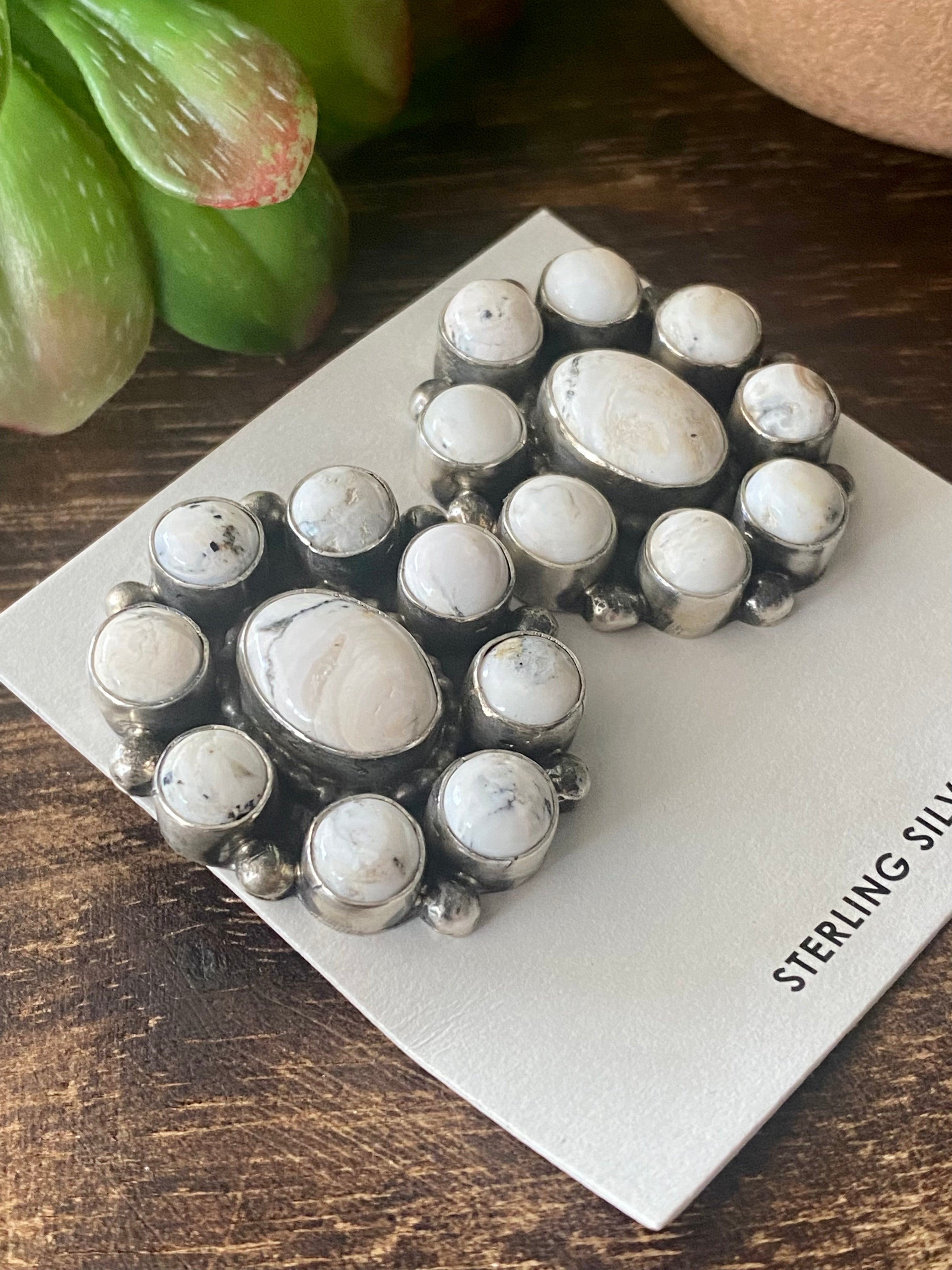 Sheila Becenti White Buffalo & Sterling Silver Post Cluster Earrings. They measure 1 3/8 inches long and 1 1/4 inches wide. Signed by the artist and stamped sterling silver.