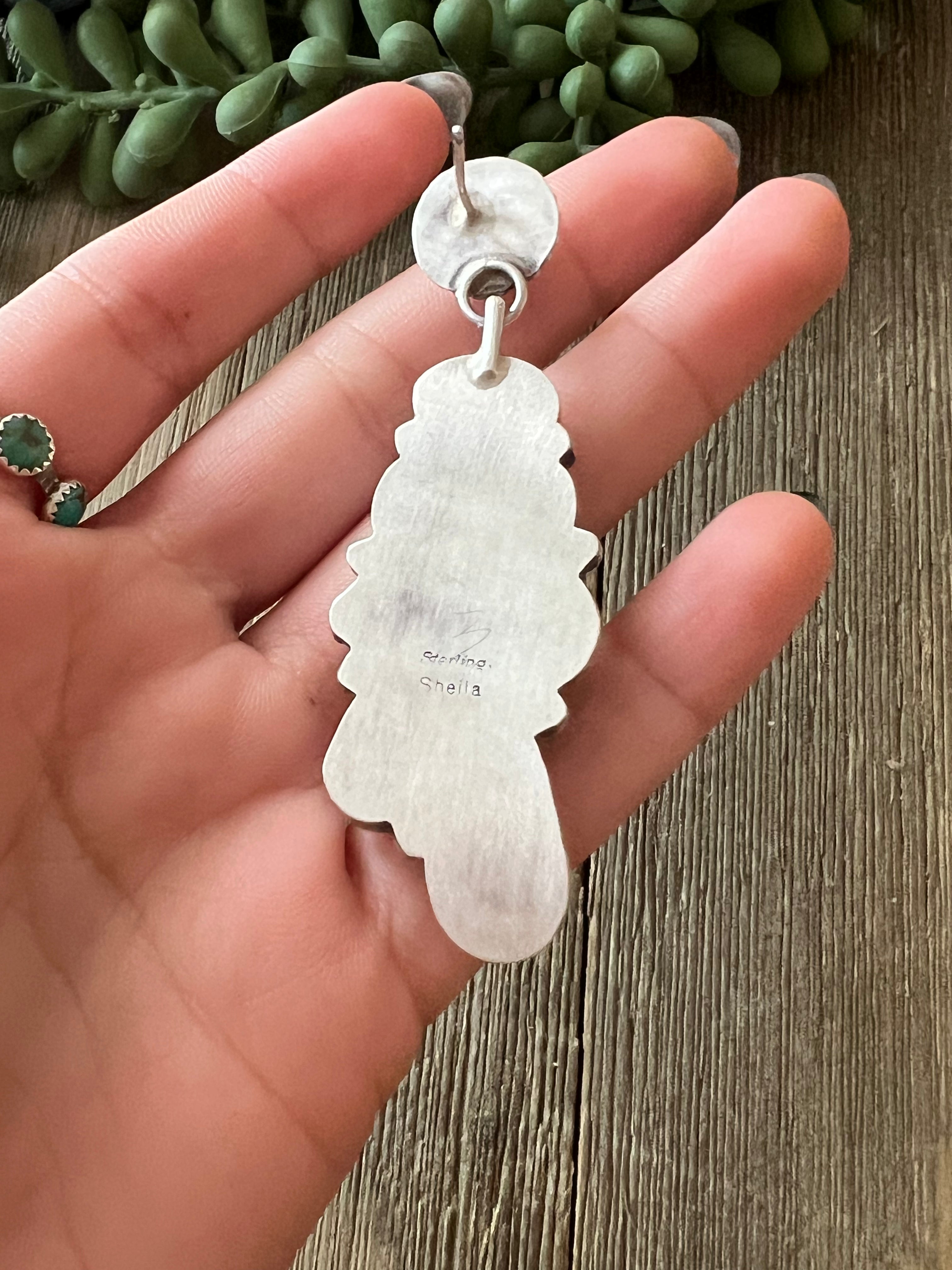 Shelia Becenti White Buffalo & Sterling Silver Post Dangle Earrings. It measures 2 3/4 inches long and just over 7/8 of an inch wide. Signed by artist and stamped sterling silver.