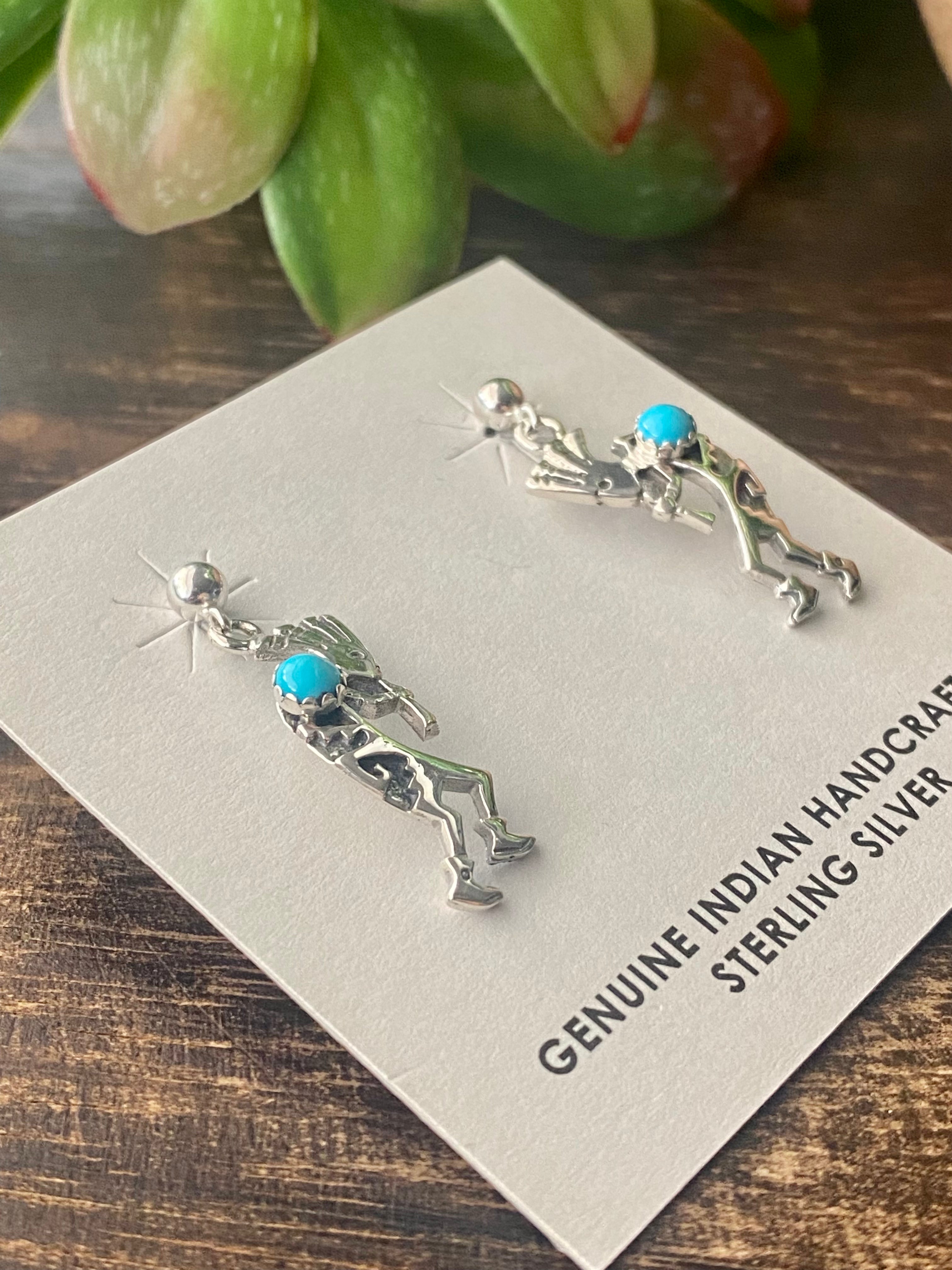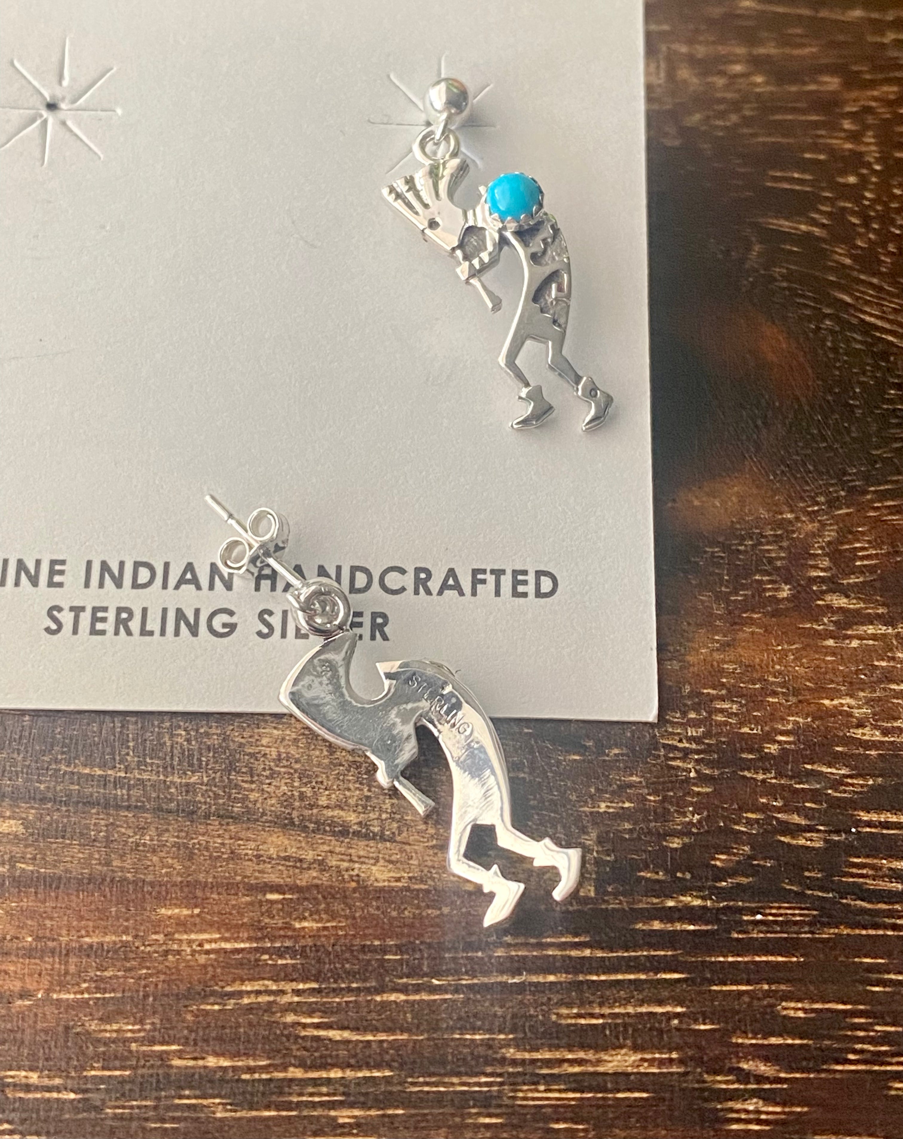 Shirley Henry Turquoise & Sterling Silver Kokopelli Post Dangle Earrings. They measure 1 1/8 inches long and 3/8 of an inch wide. Stamped sterling silver.