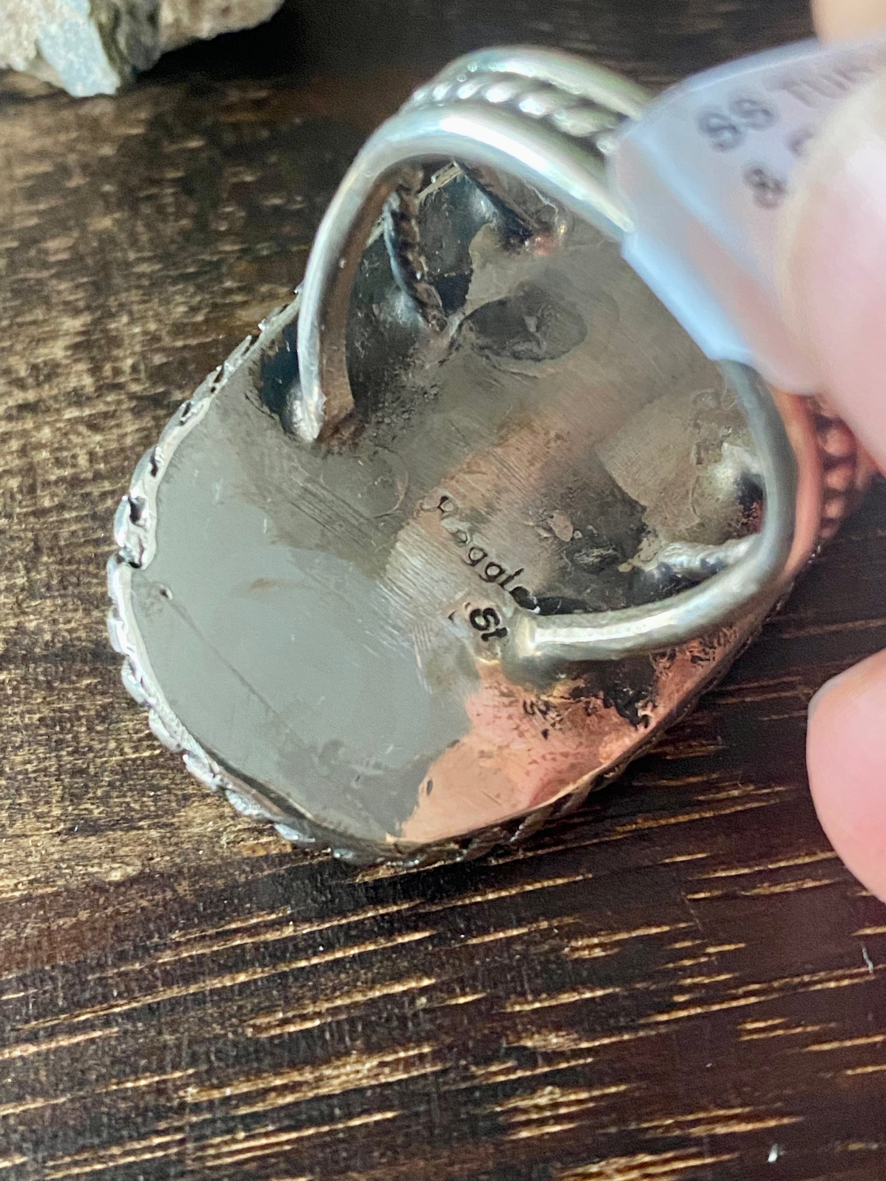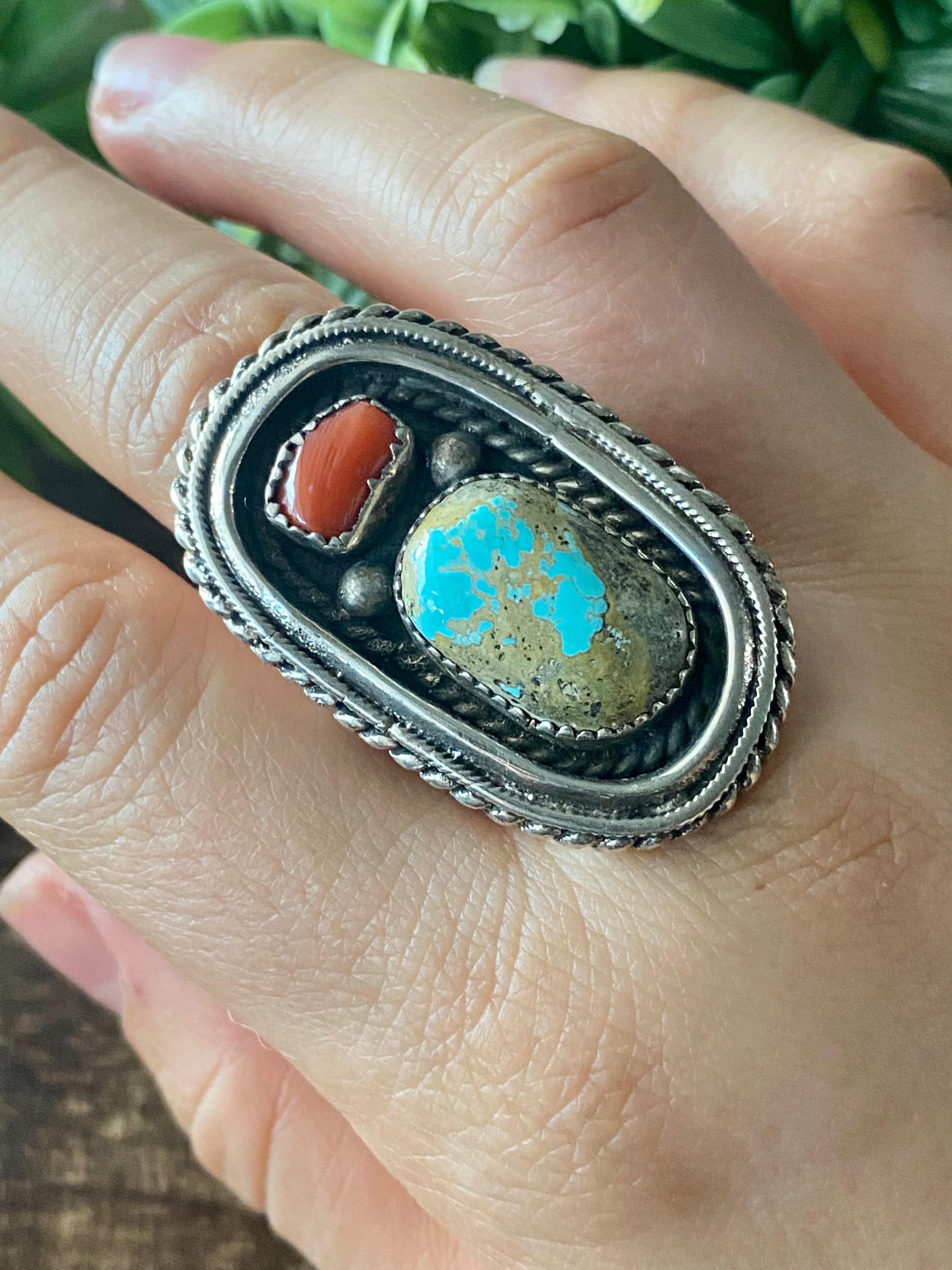 Shirley Largo Turquoise & Coral Sterling Silver Ring Size 10.5. It measures 1 5/8 inches long and just over 1 inch wide. Signed by the artist and stamped sterling silver.