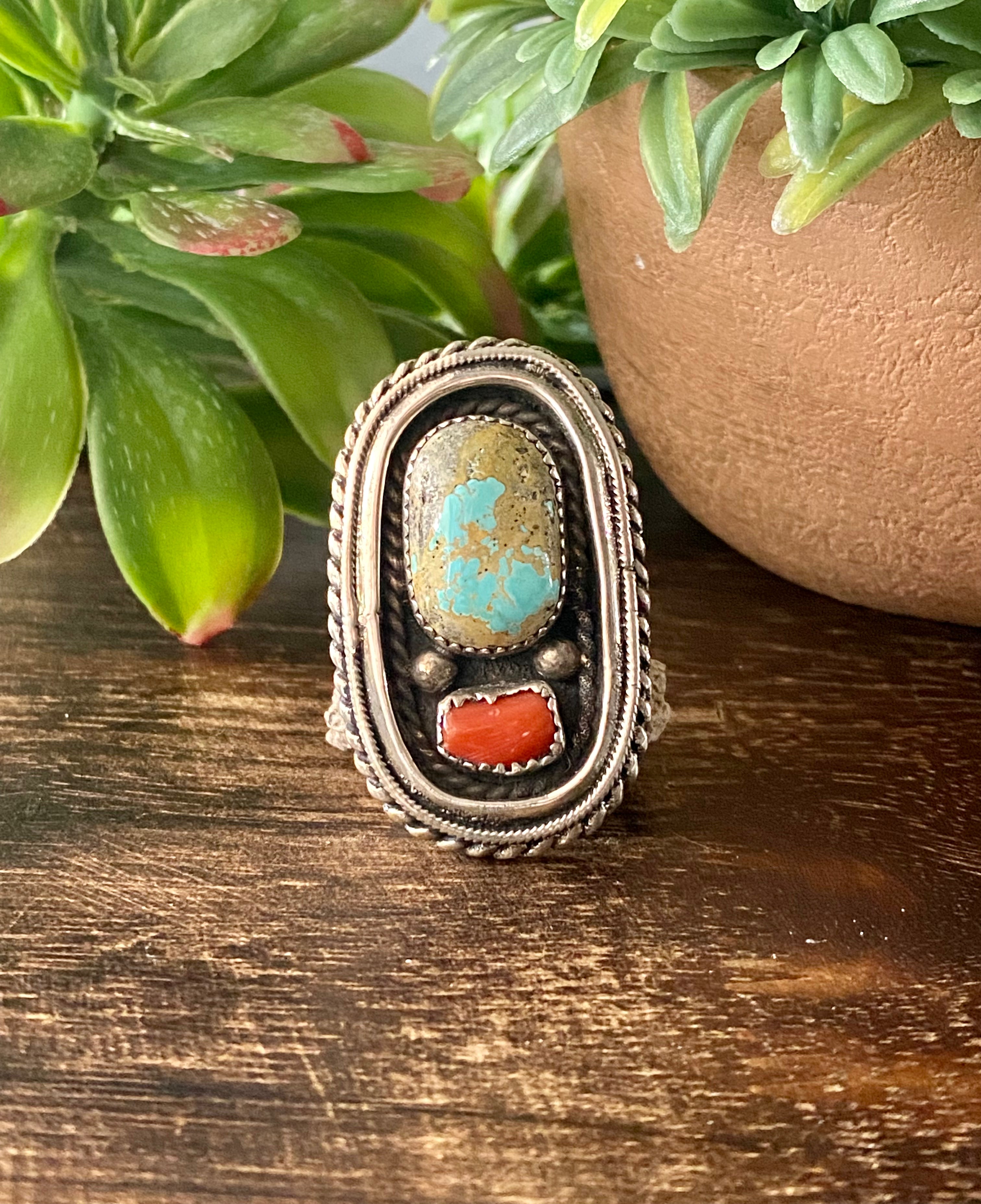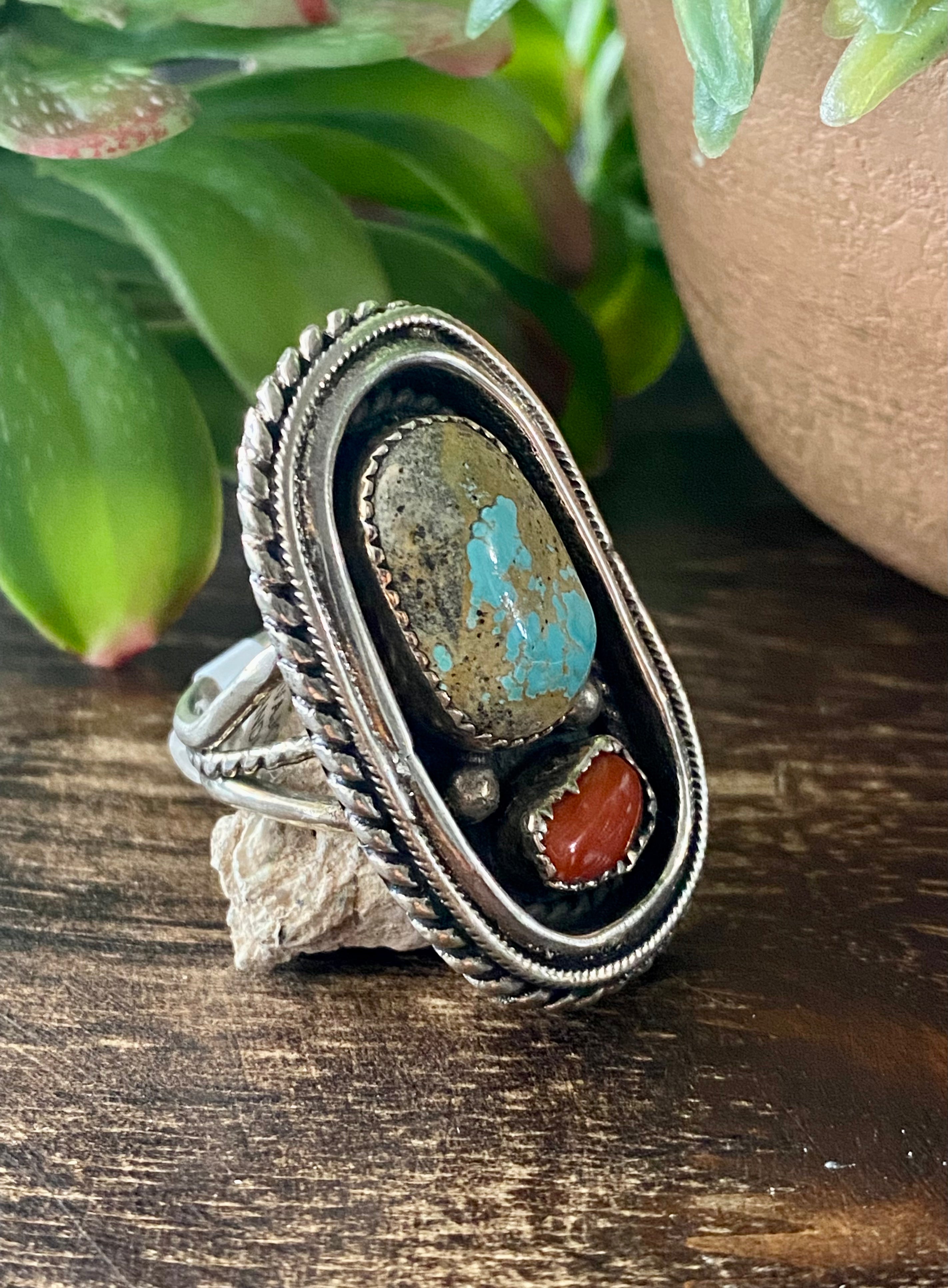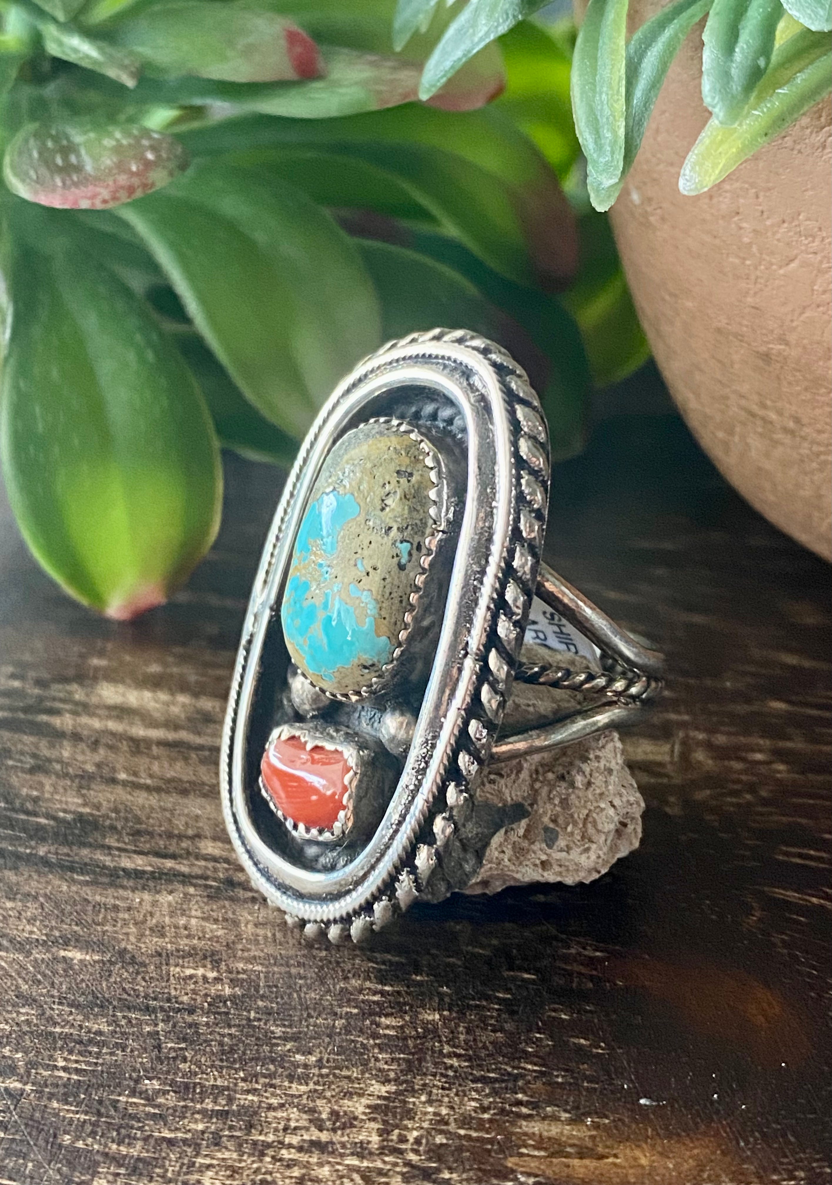 Shirley Largo Turquoise & Coral Sterling Silver Ring Size 10.5