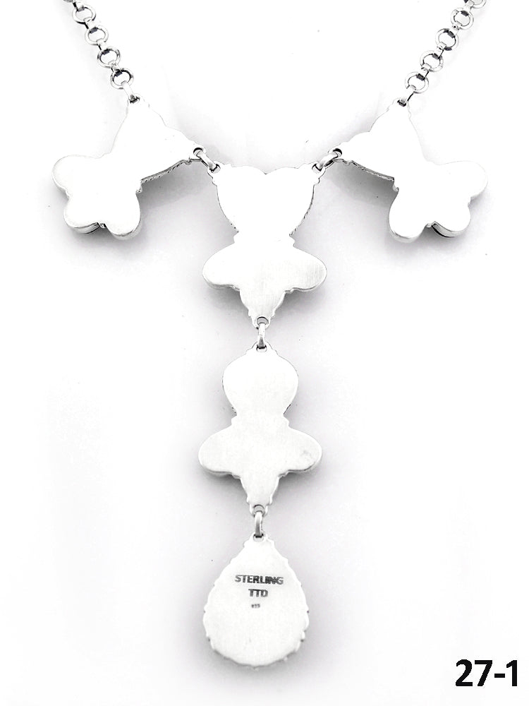 This stunning necklace features a vibrant collection of natural stones set in sterling silver, showcasing exceptional Southwest craftsmanship. It measures 16 inches long with a Drop of 4 3/8 inches while the chain by itself measures 13 inches long. Width of the pendants is 1 to 1 3/8 inches long.