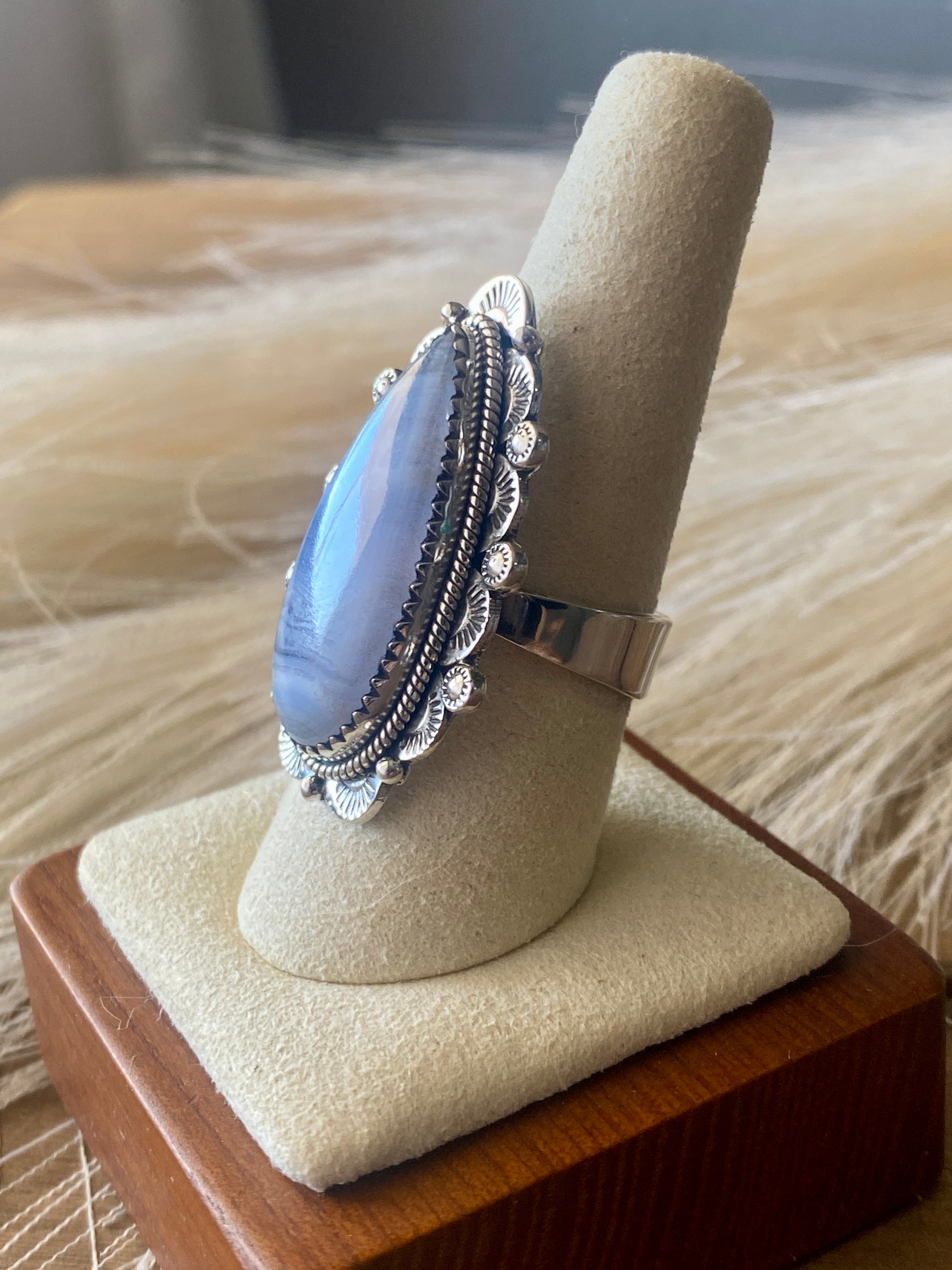 Beautiful Adjustable ring. Southwest Handmade Blue Lace Agate & Sterling Silver Adjustable Ring. It measures 1 1/2 inches long and just under 1 inch wide. Signed by the artist and stamped sterling silver.