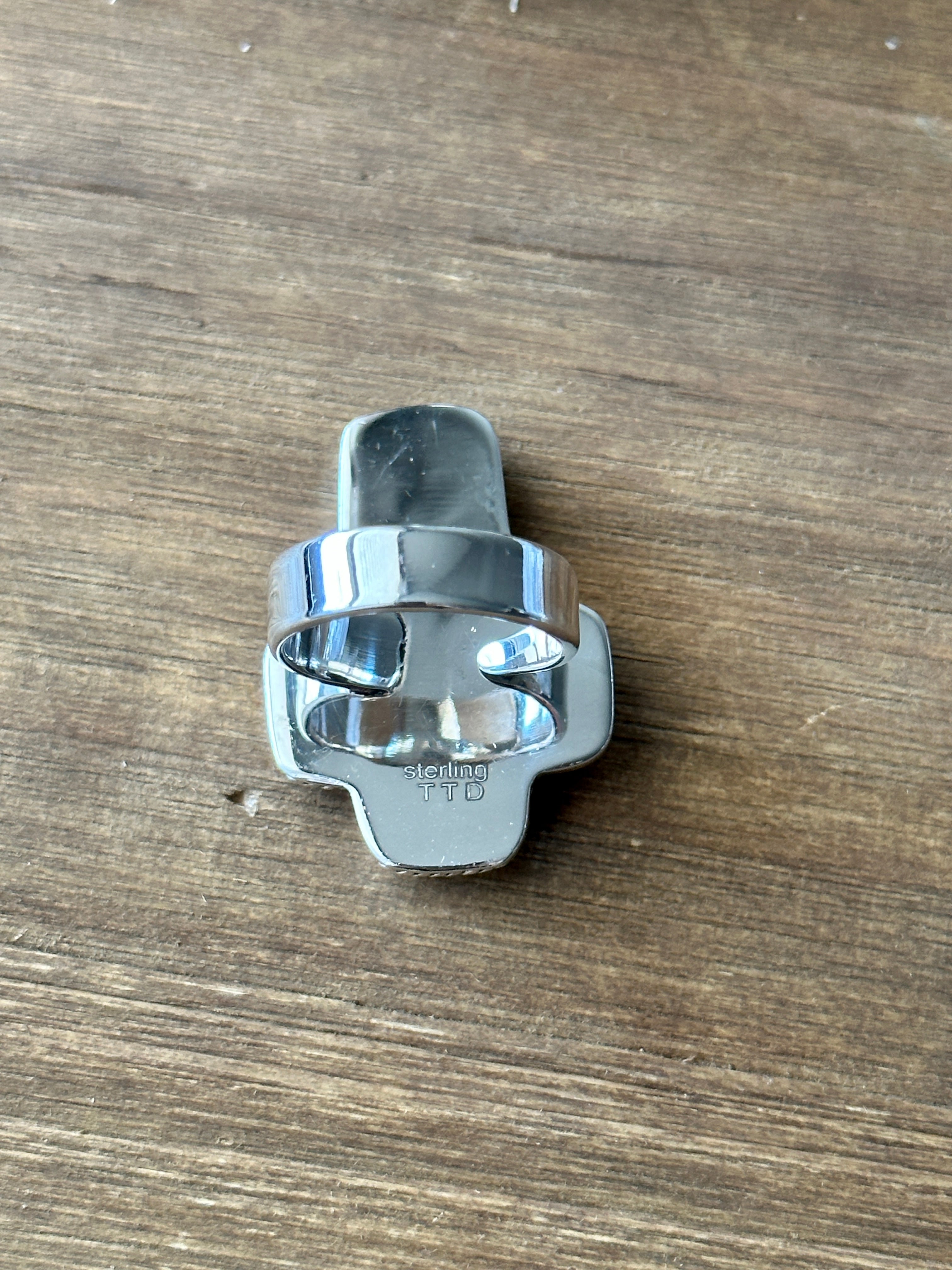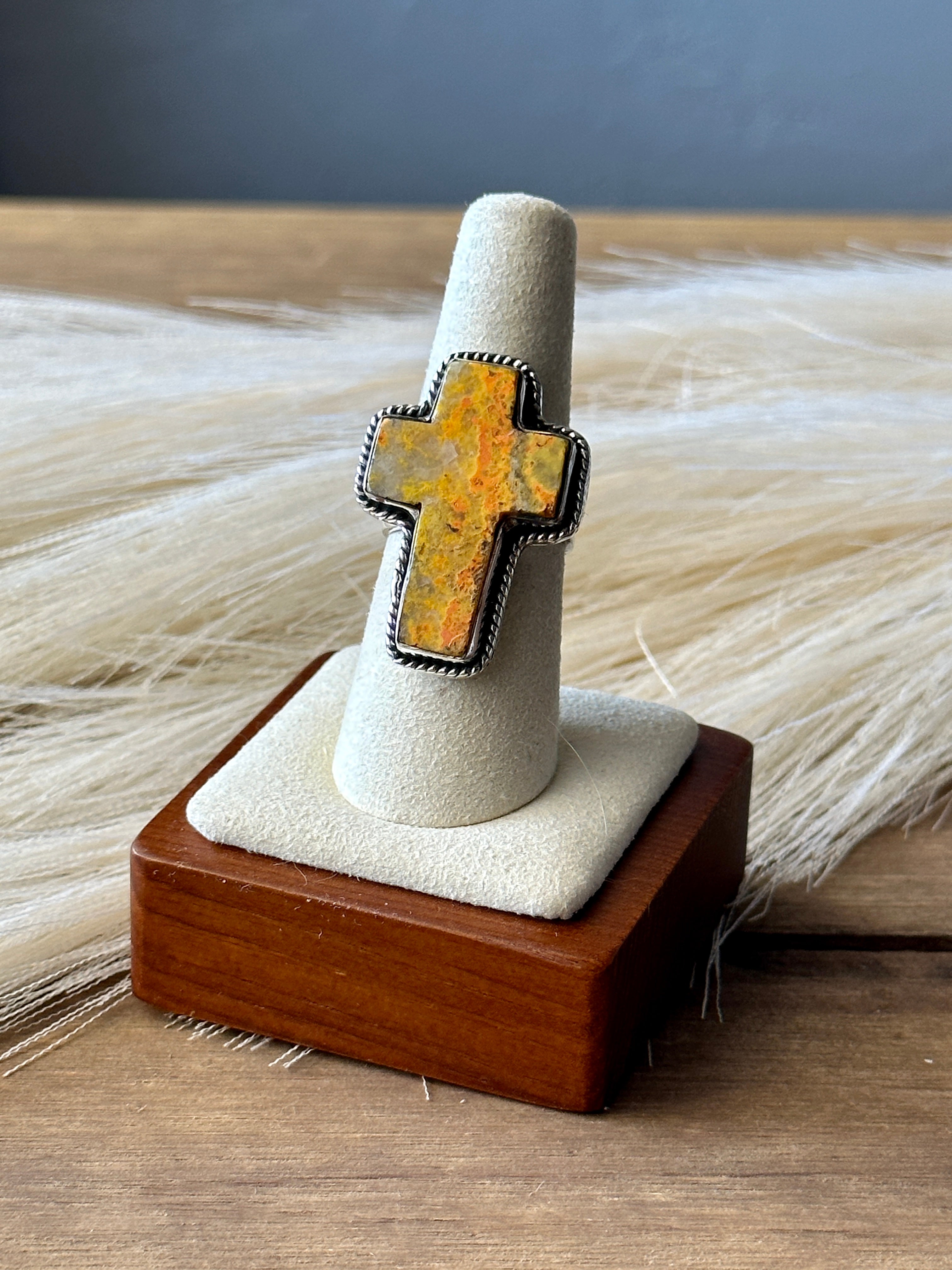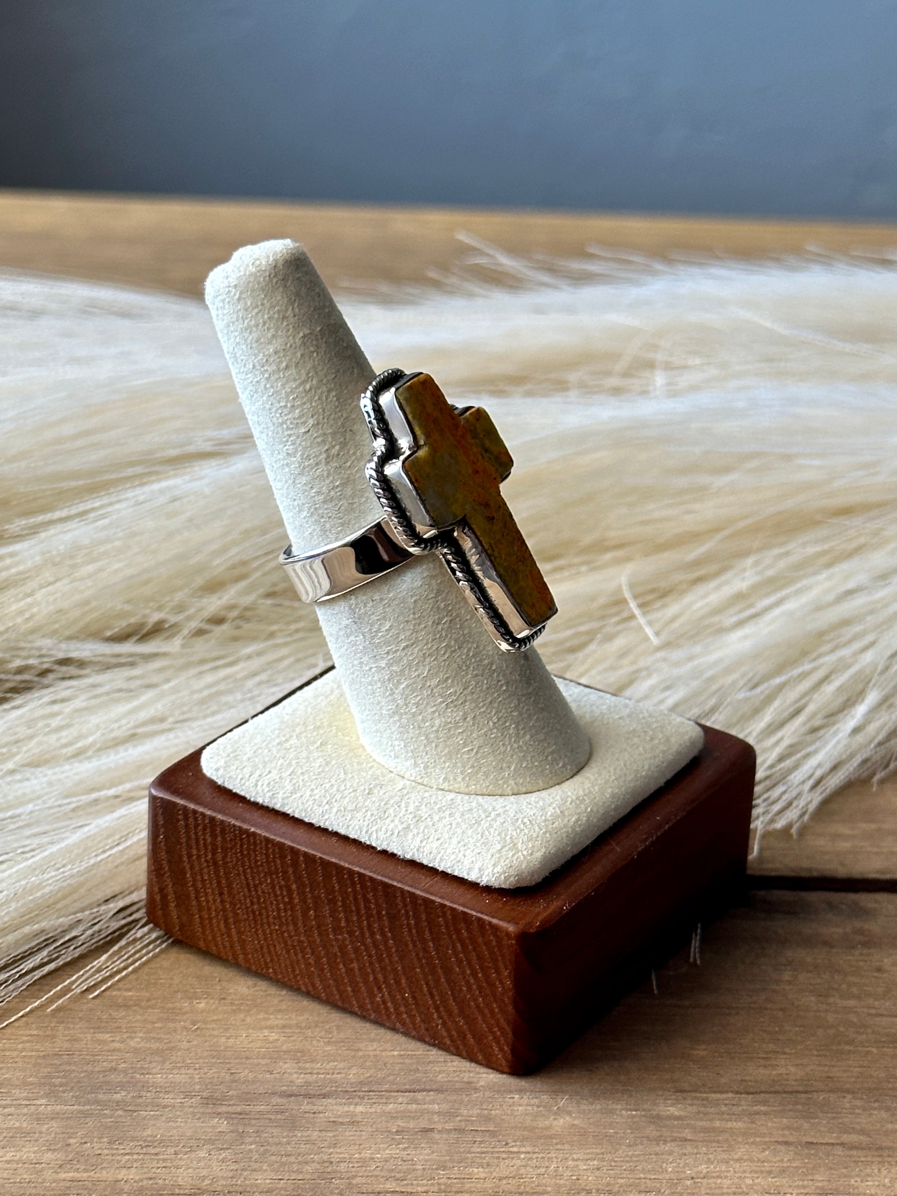 Beautiful cross rings. Southwest Handmade Bb Agate & Sterling Silver Adjustable Cross Ring. It measures 1 1/8 inches long and just over 3/4 of an inch wide. Signed by the artist and stamped sterling silver.