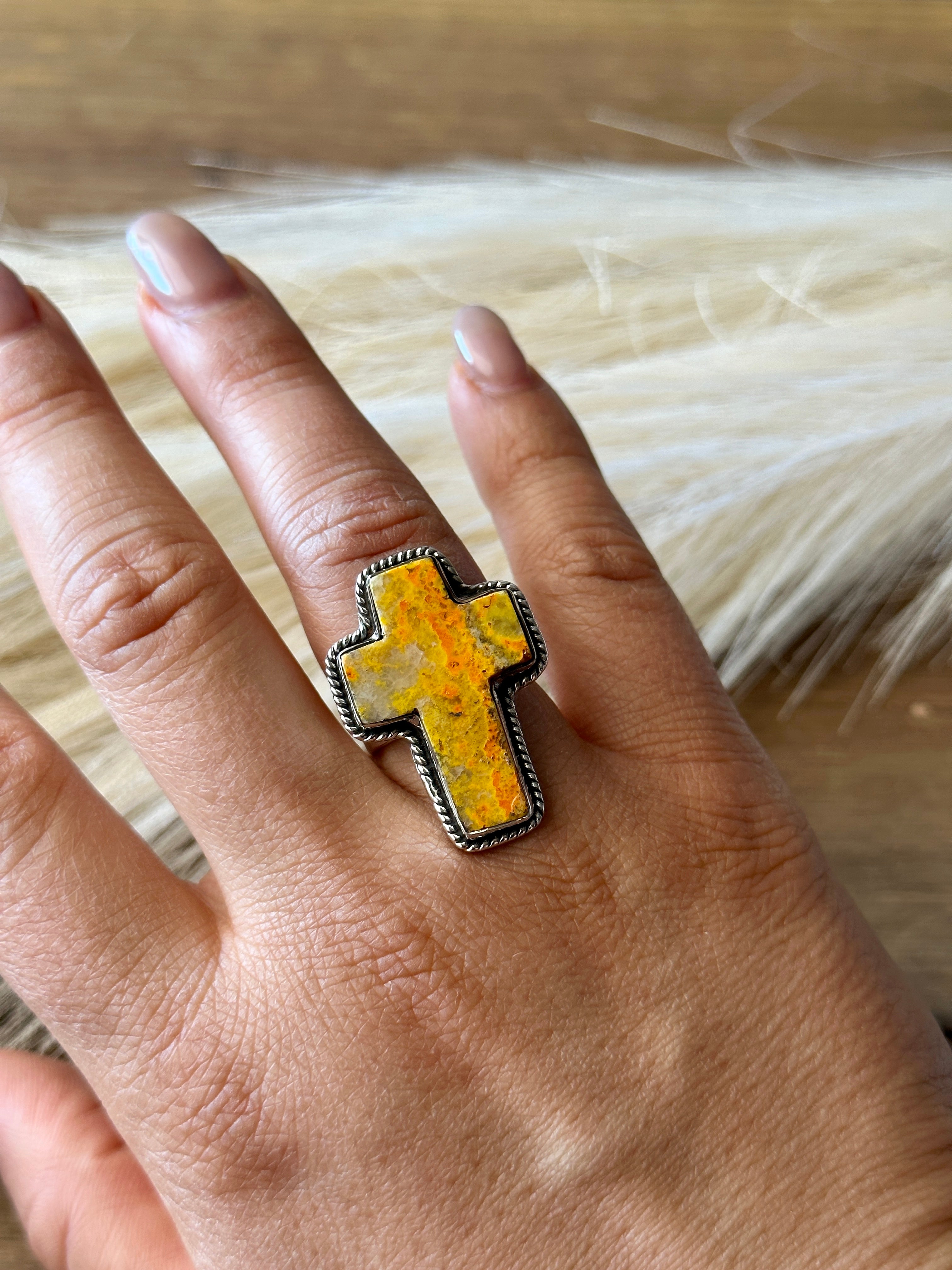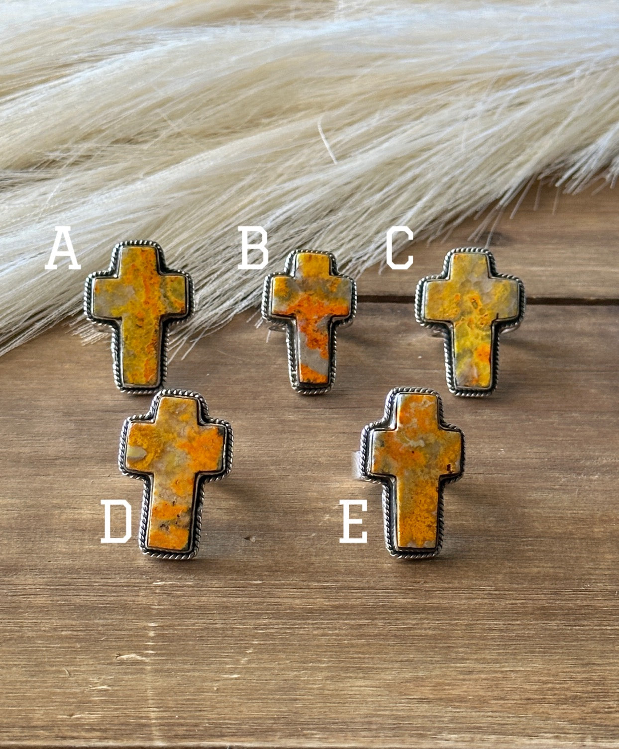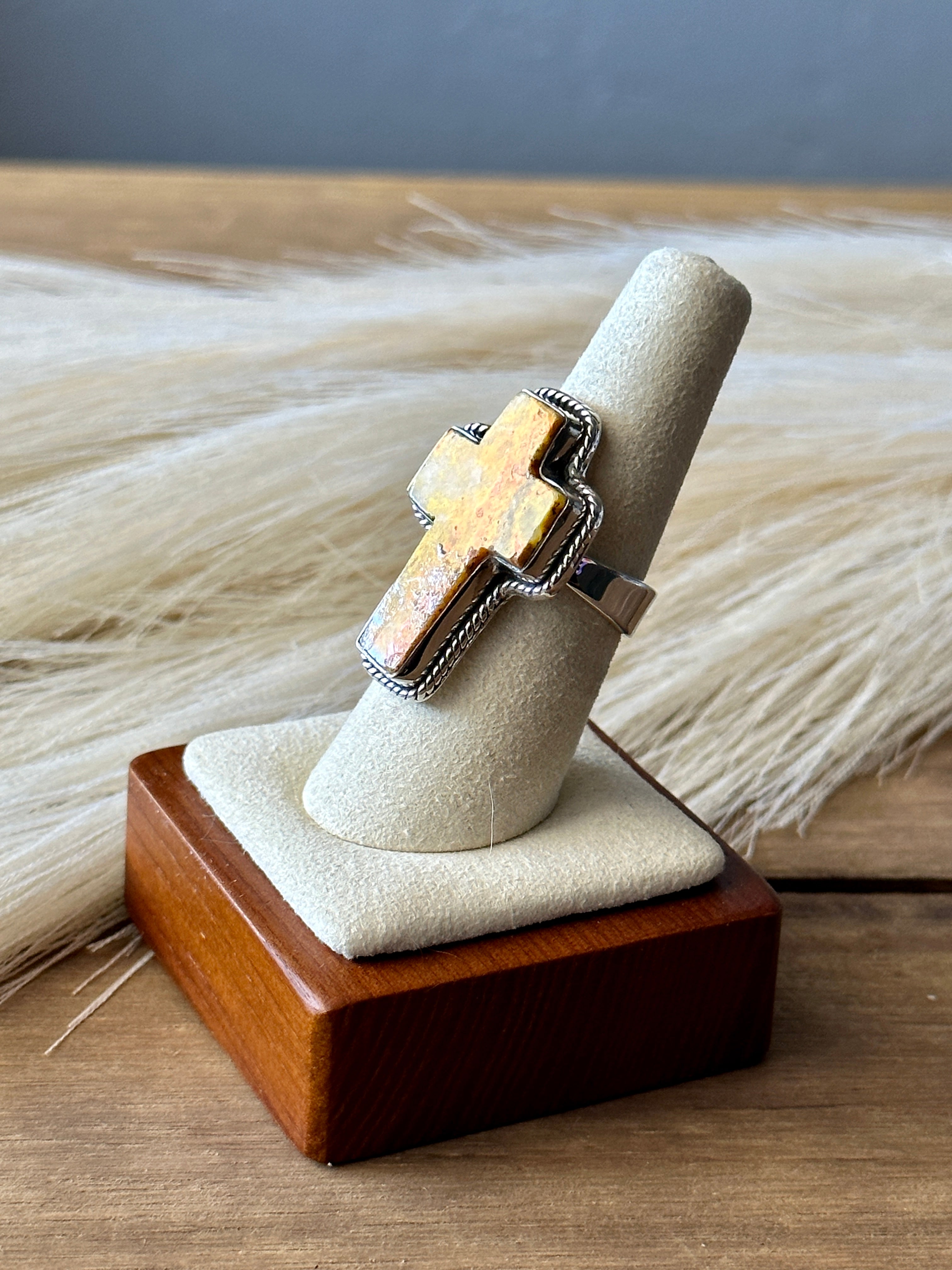 Beautiful cross rings. Southwest Handmade Bb Agate & Sterling Silver Adjustable Cross Ring. It measures 1 1/8 inches long and just over 3/4 of an inch wide. Signed by the artist and stamped sterling silver.
