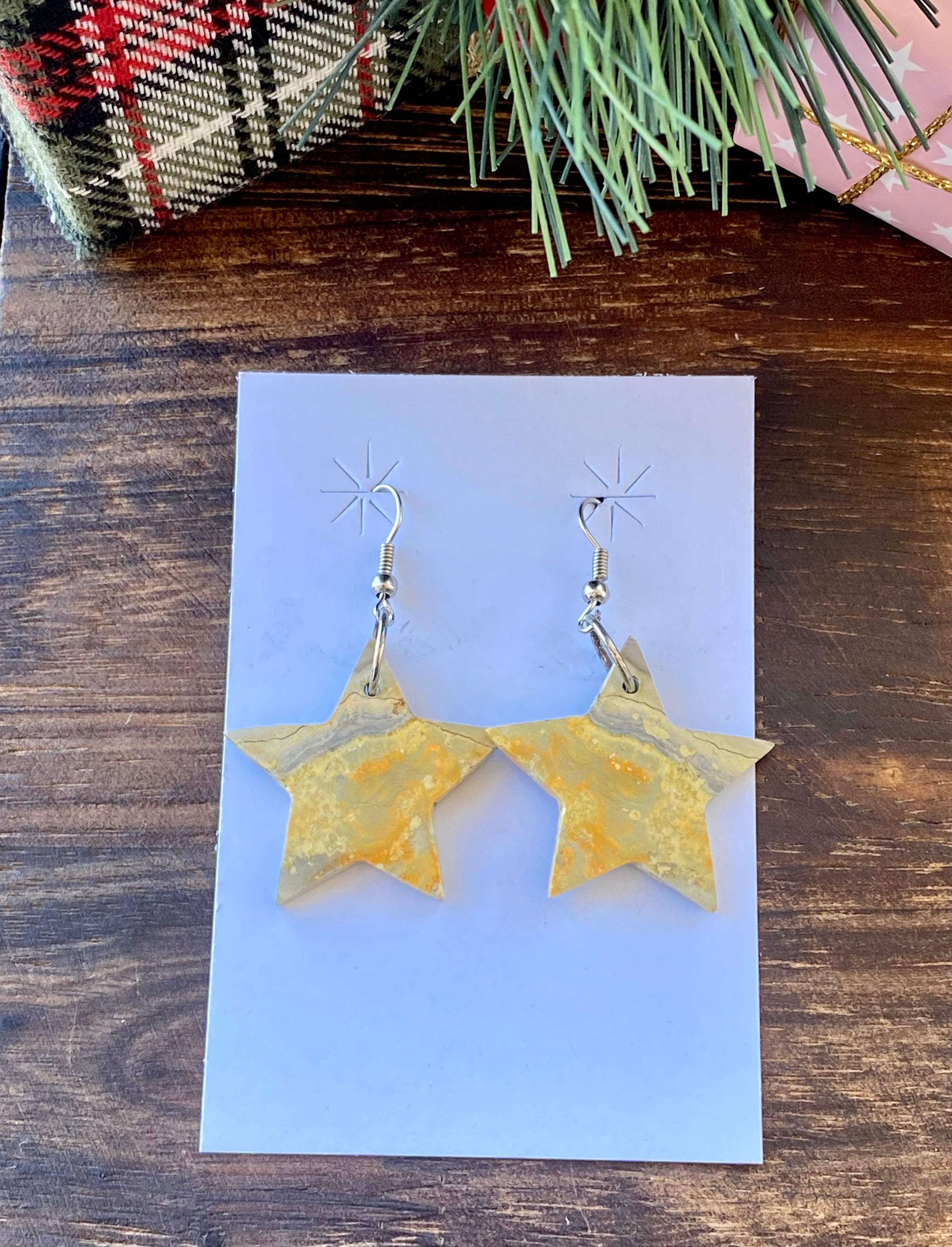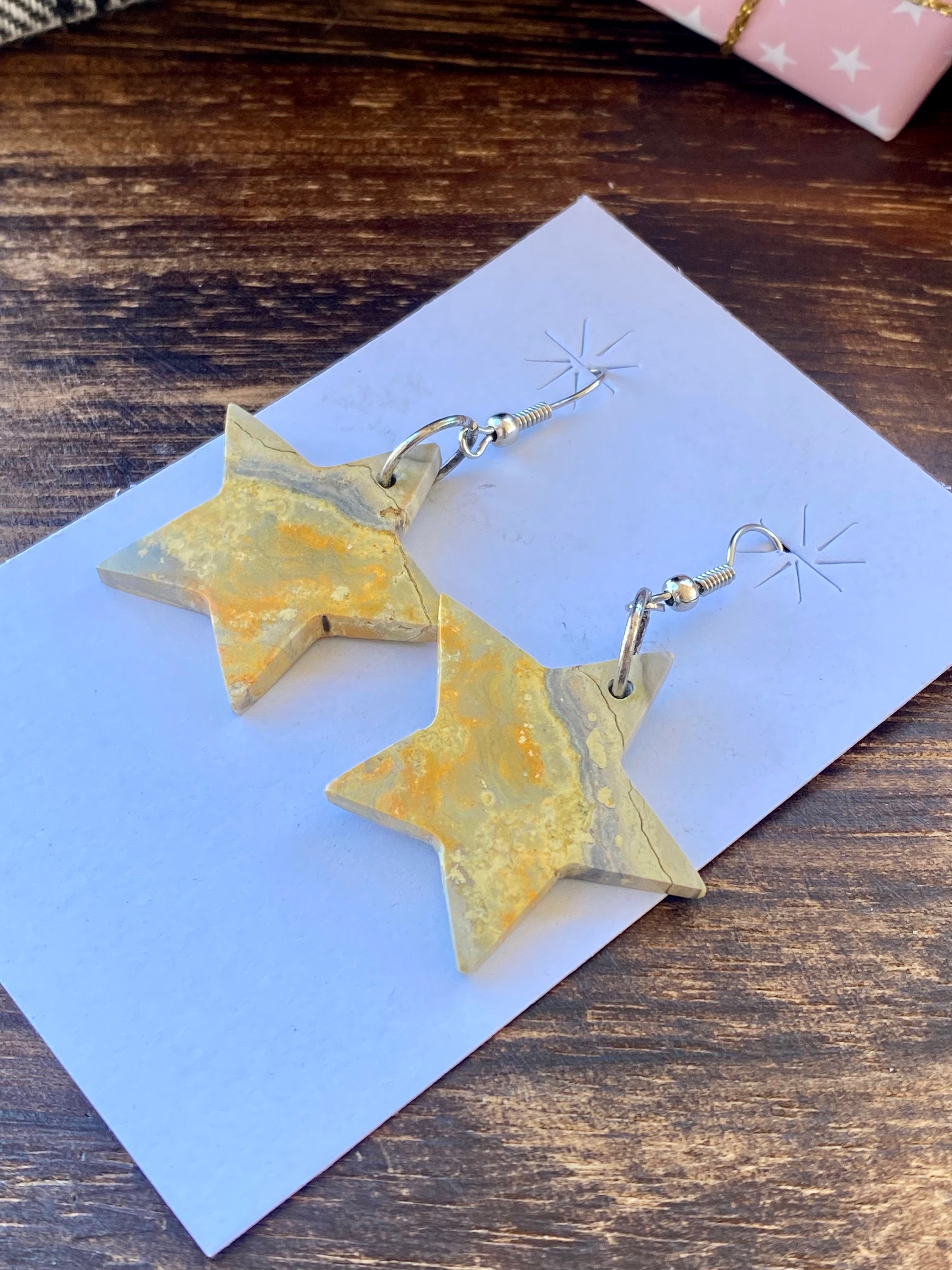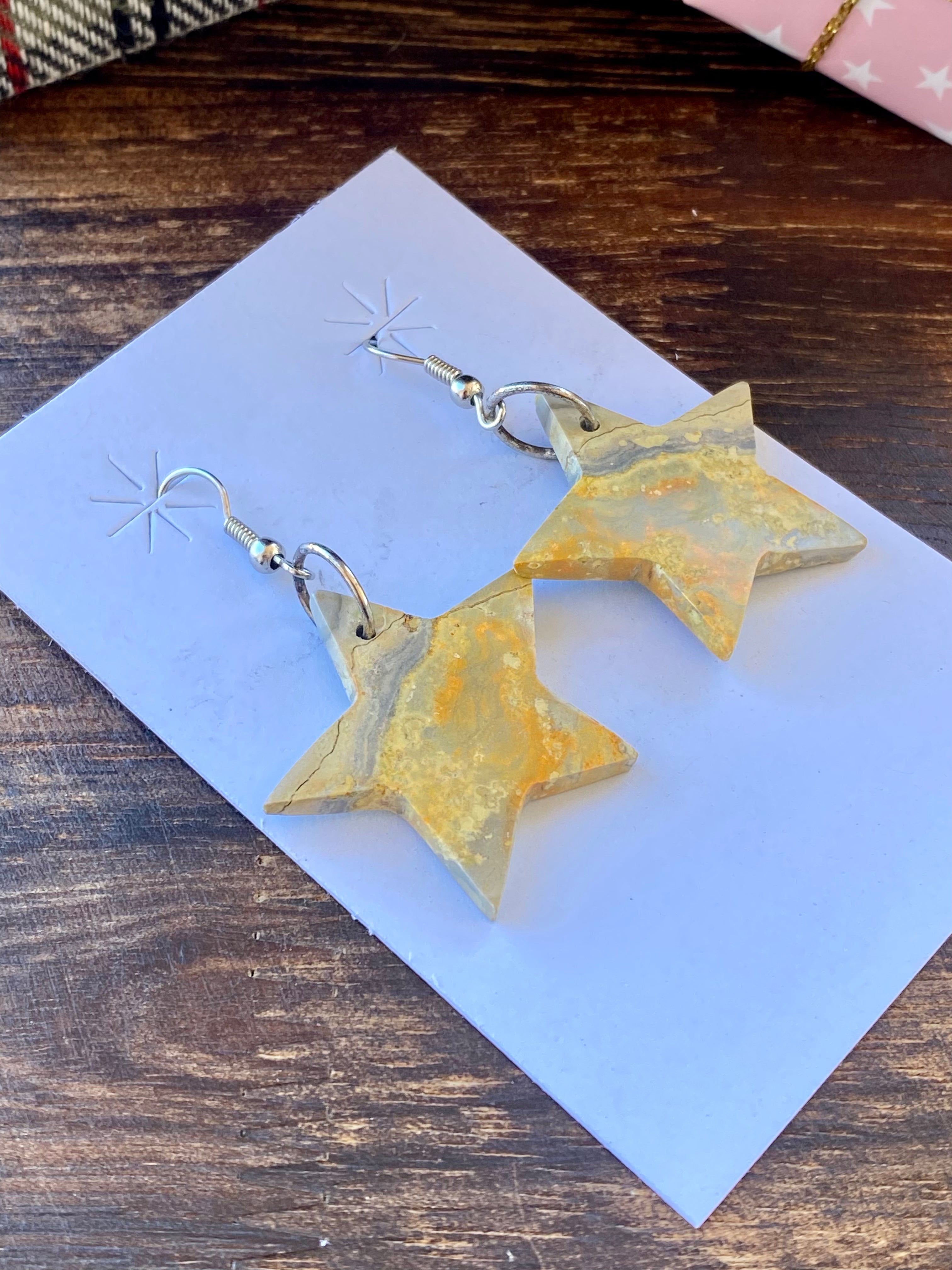 Southwest Handmade Bb Agate & Sterling Silver Star Dangle Earrings. They measure 1 7/8 inches long and 1 1/8 inches wide.
