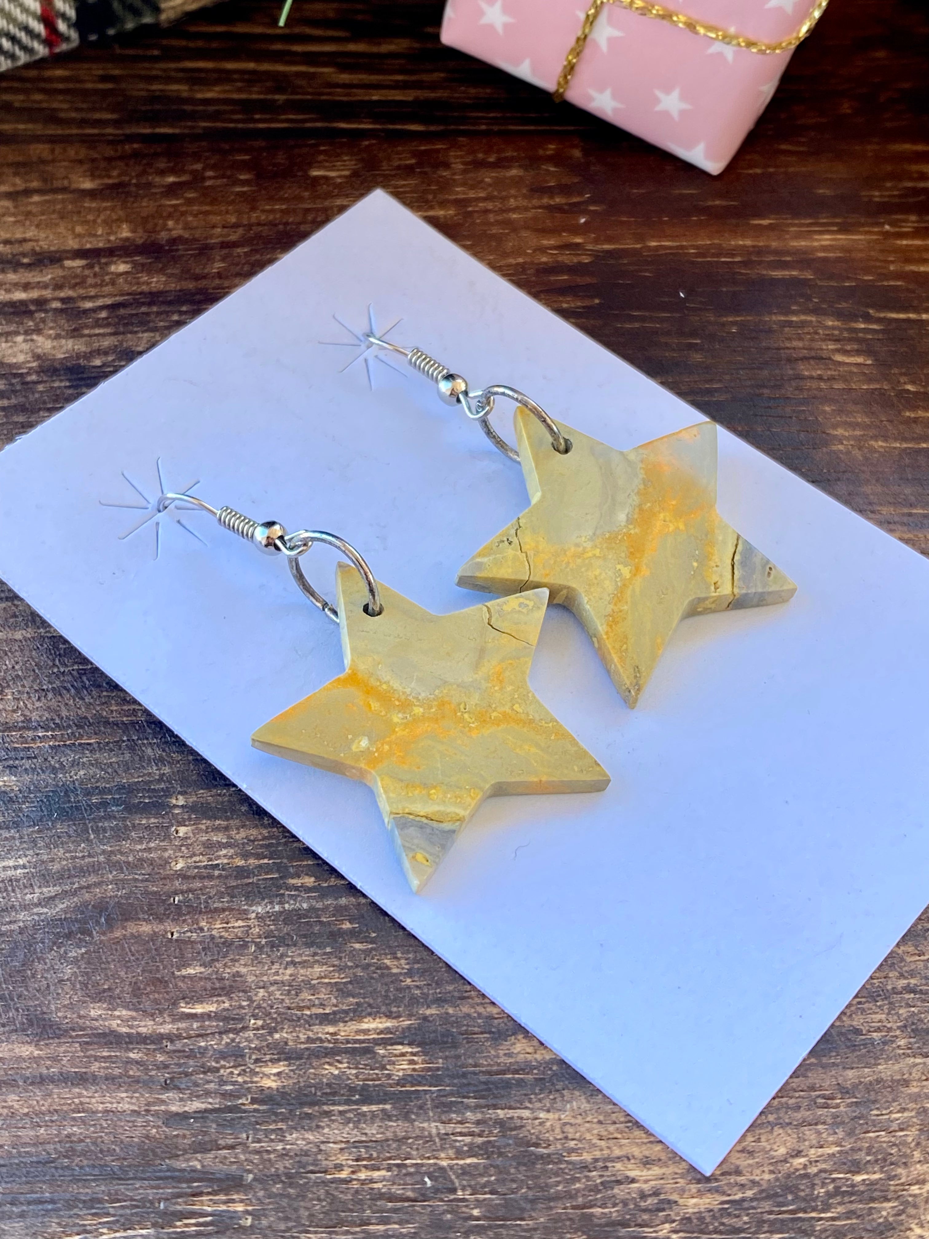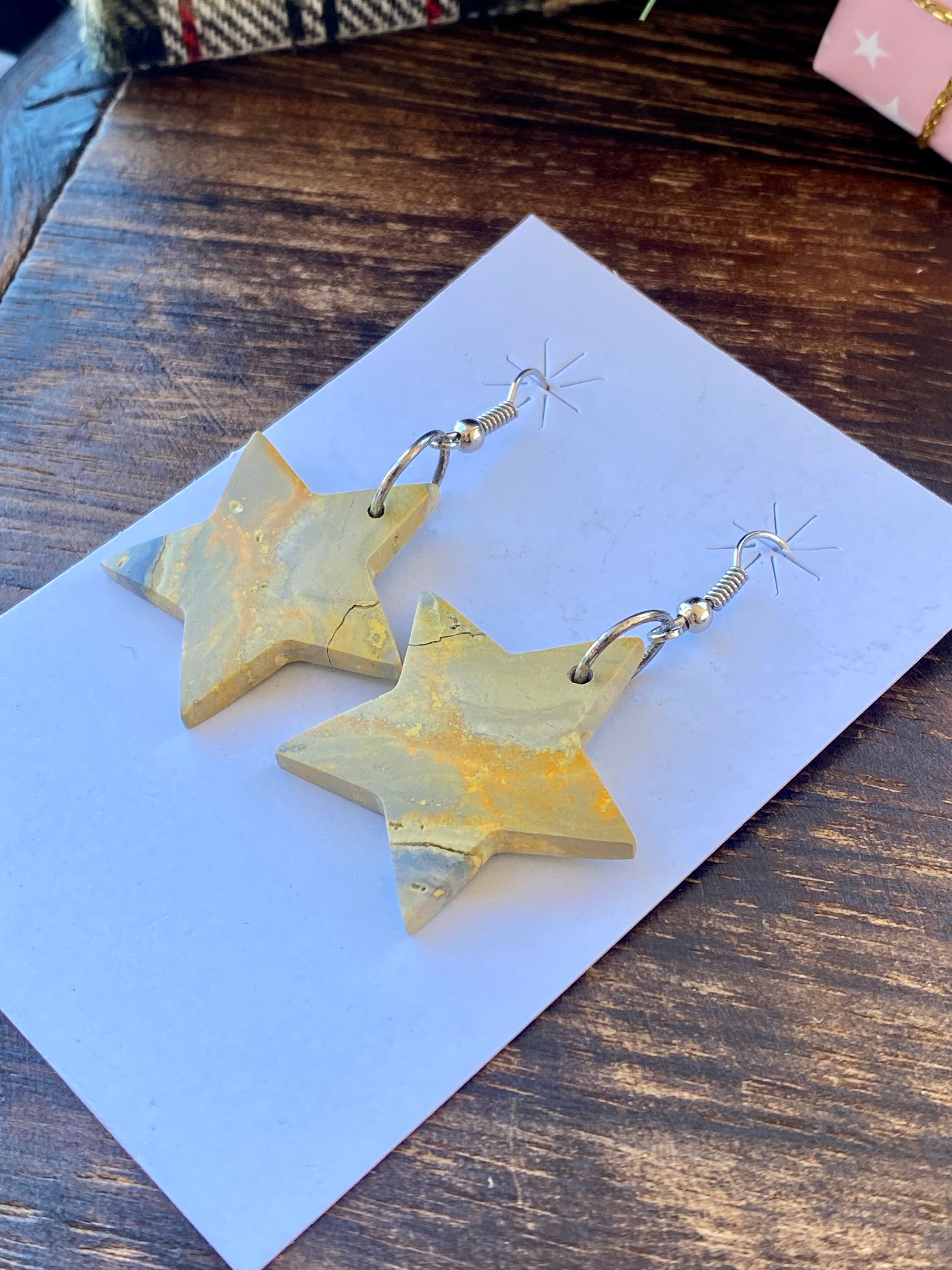 Southwest Handmade Bb Agate & Sterling Silver Star Dangle Earrings. They measure 1 7/8 inches long and 1 1/8 inches wide.