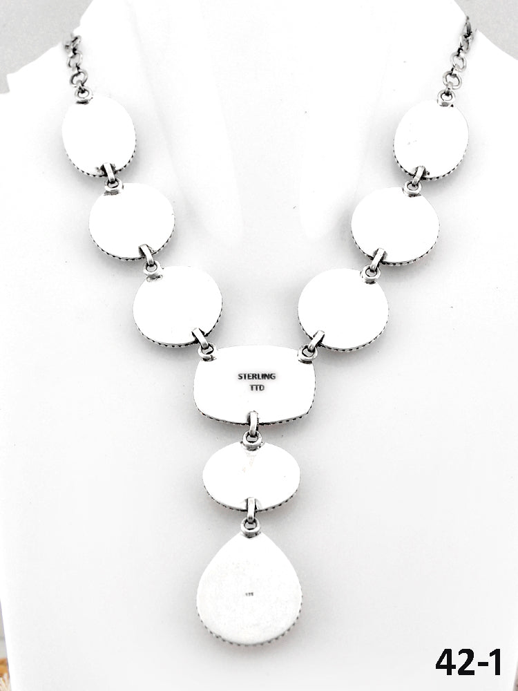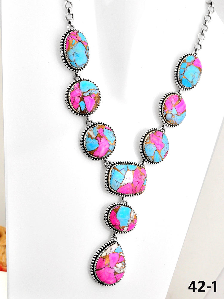 This stunning necklace features Cotton Candy set in sterling silver, showcasing exceptional Southwest craftsmanship. It measures 24 inches long with hang and 12 inches long without hang with drop 3 inches.