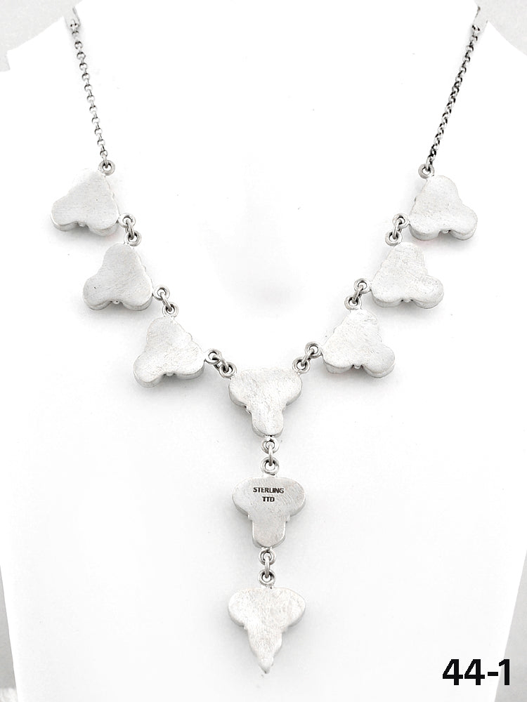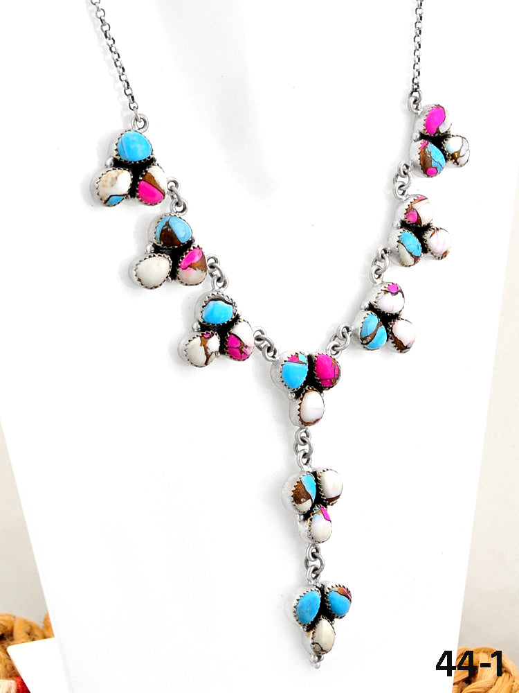 This stunning necklace features Cotton Candy set in sterling silver, showcasing exceptional Southwest craftsmanship. It measures 24 inches long with hang and 18 inches long without hang with drop 3 inches.