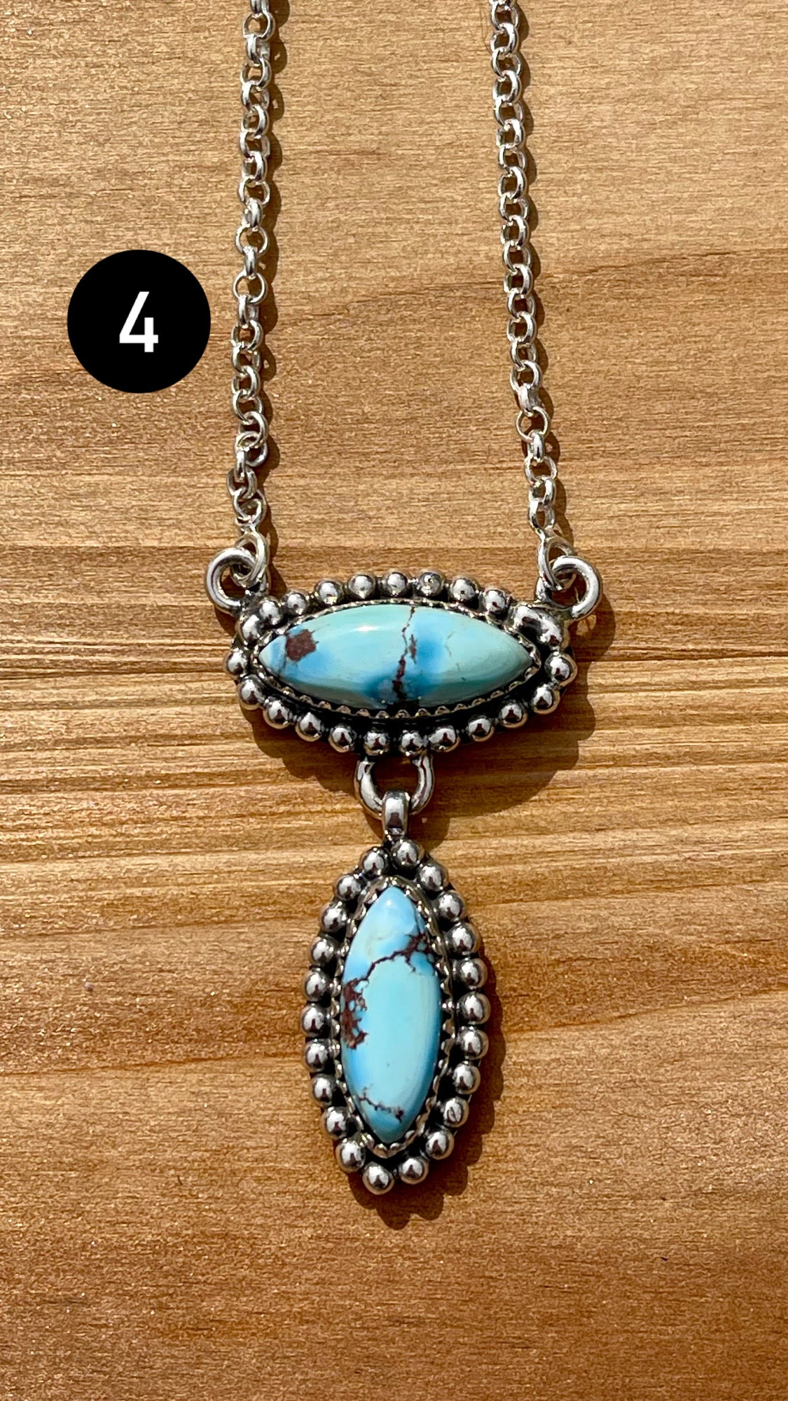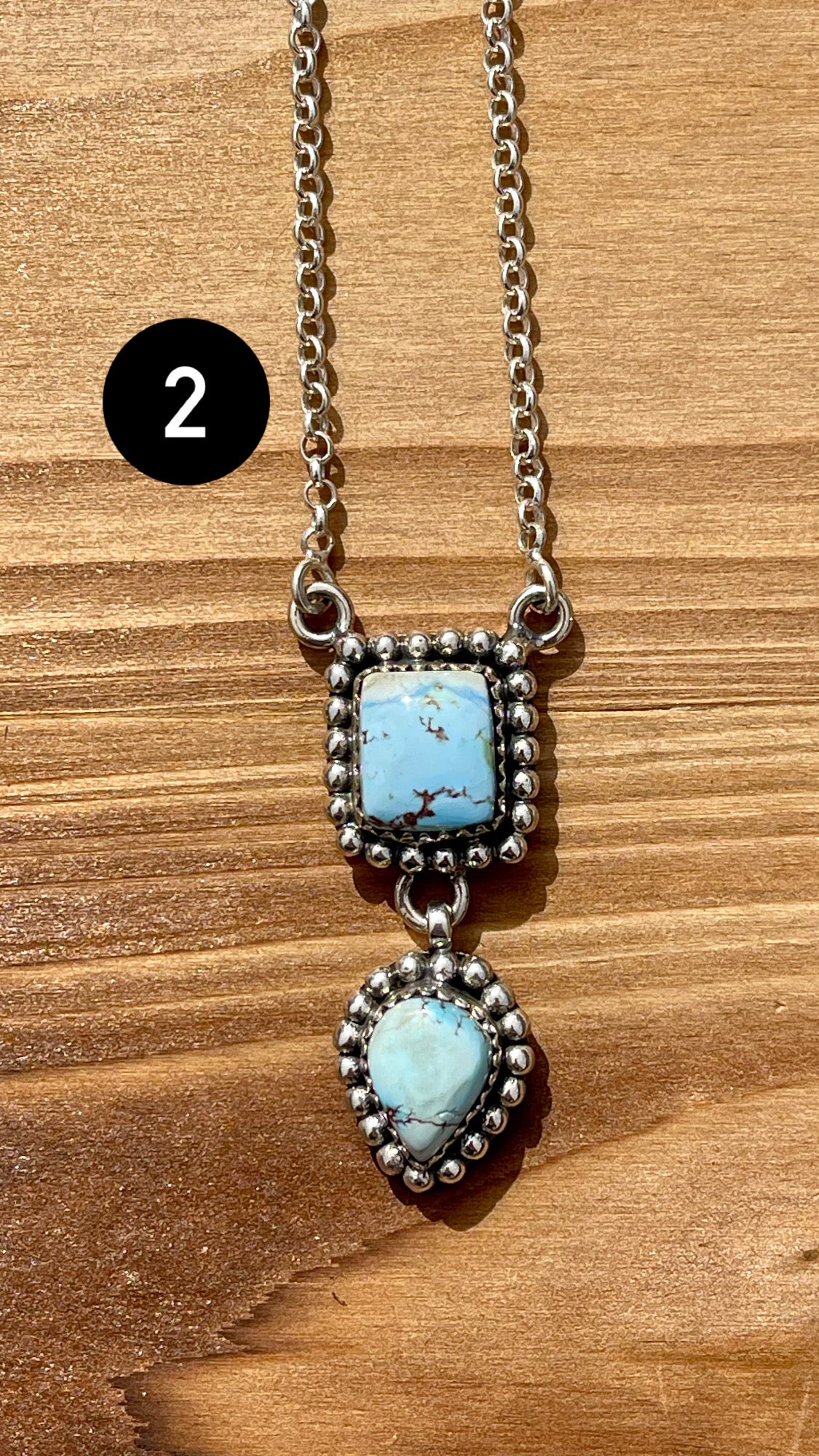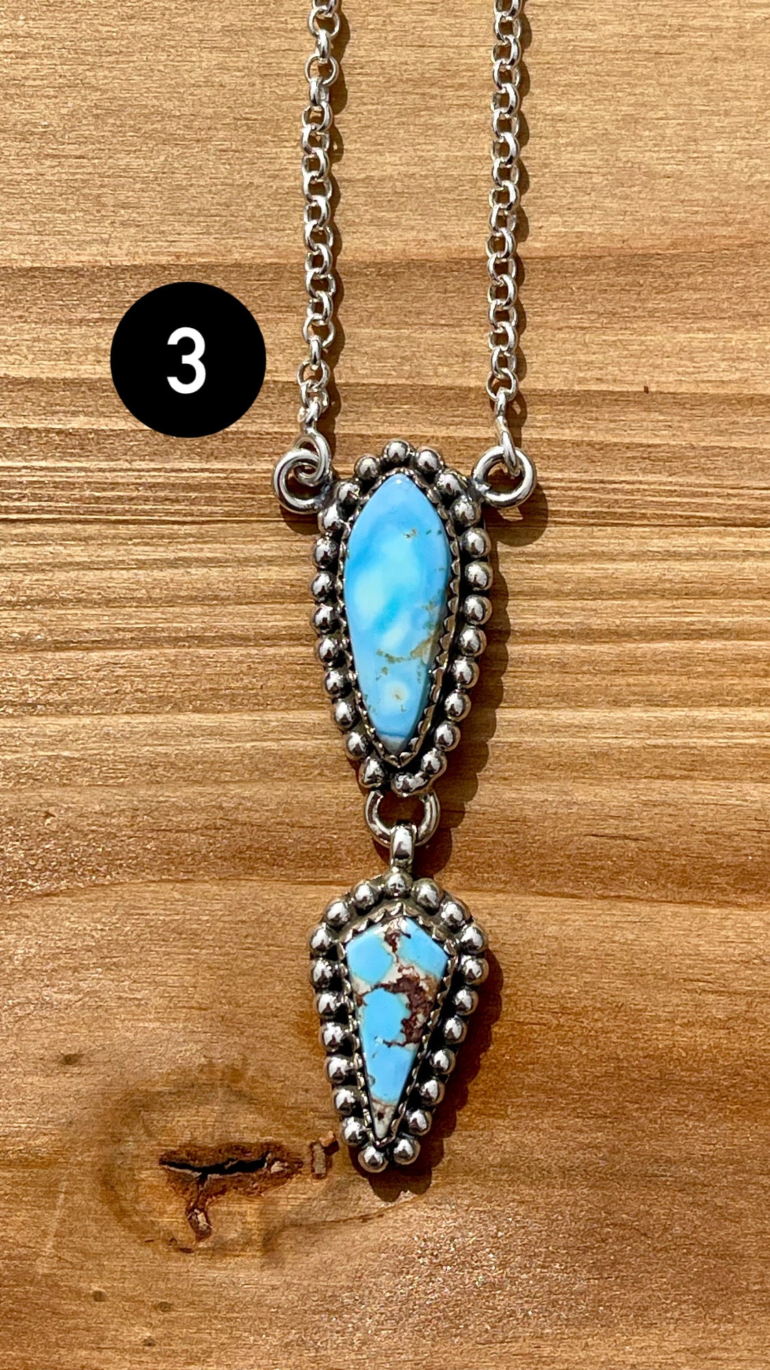 Beautiful necklace. Southwest Handmade Golden Hills Turquoise & Sterling Silver Drop Necklace. They measure from 20 3/4 - 21 1/2” inches long with hang while the chain by itself measures 19 inches long but can be adjusted down. Signed by the artist and stamped sterling silver.