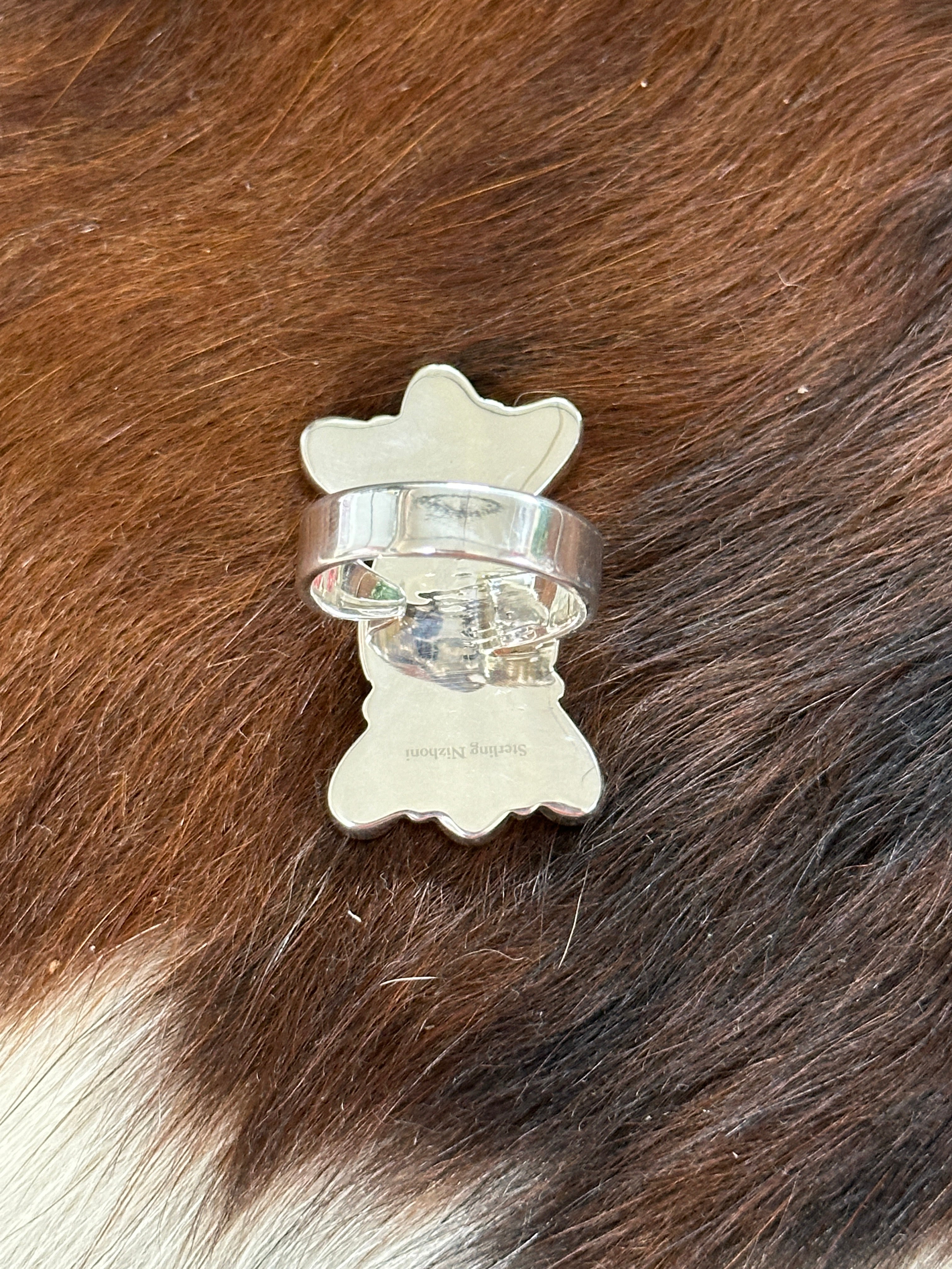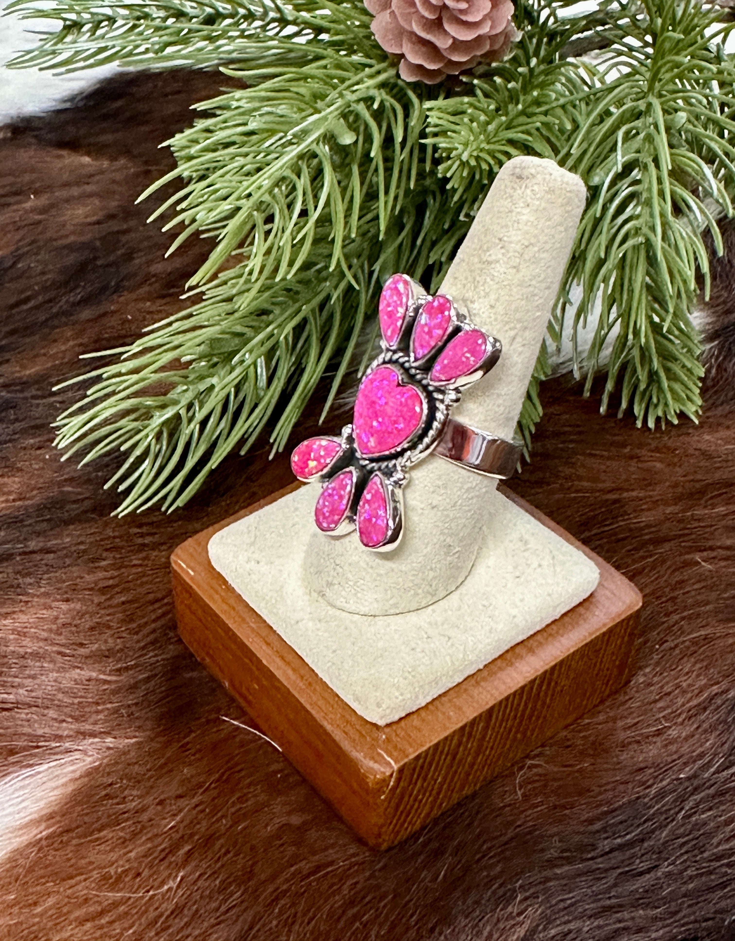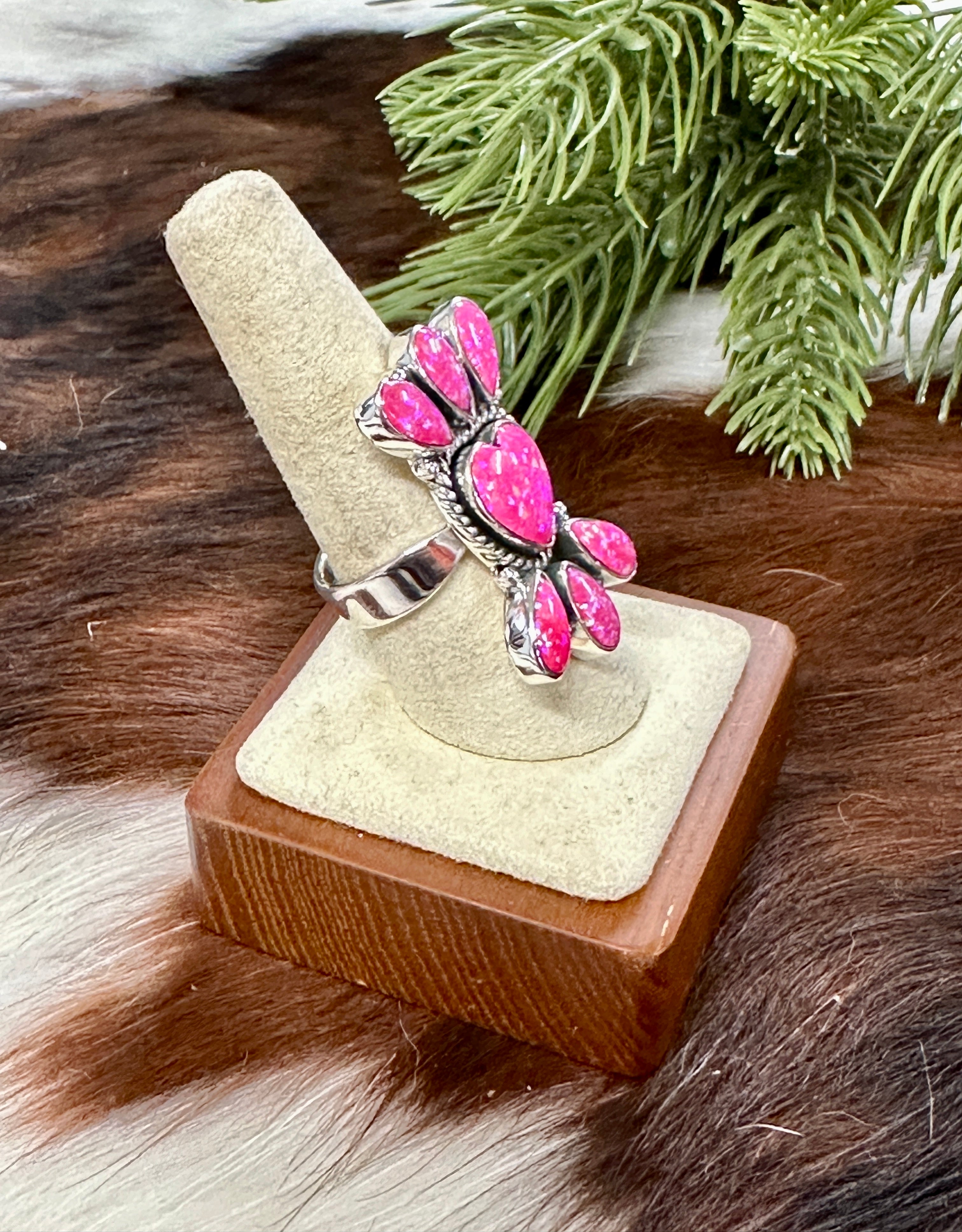 Beautiful cluster rings. Southwest Handmade Hot Pink Opal & Sterling Silver Cluster Adjustable Rings. It measures 1 1/2 inches long and just over 7/8 of an inch wide. Signed by the artist and stamped sterling silver.