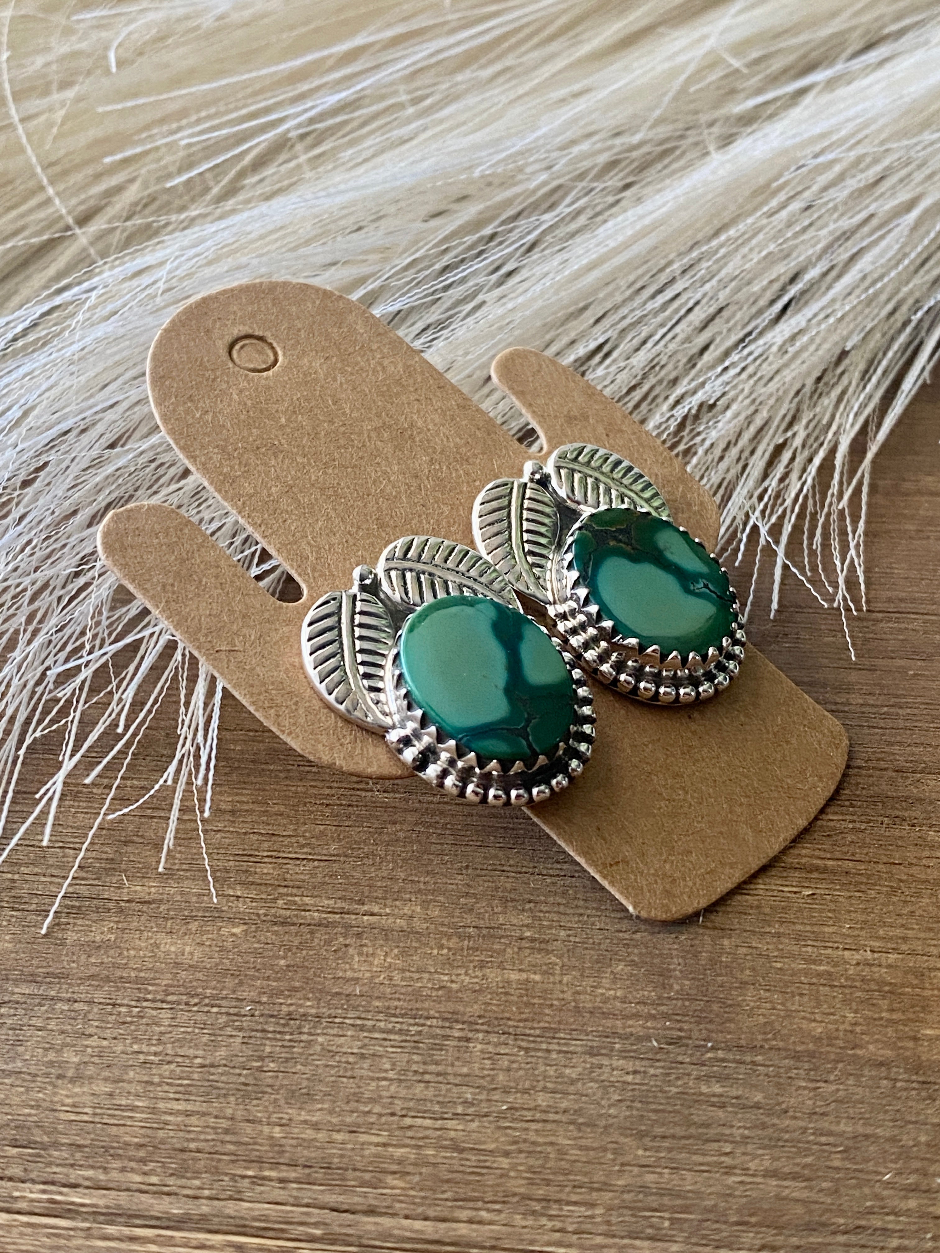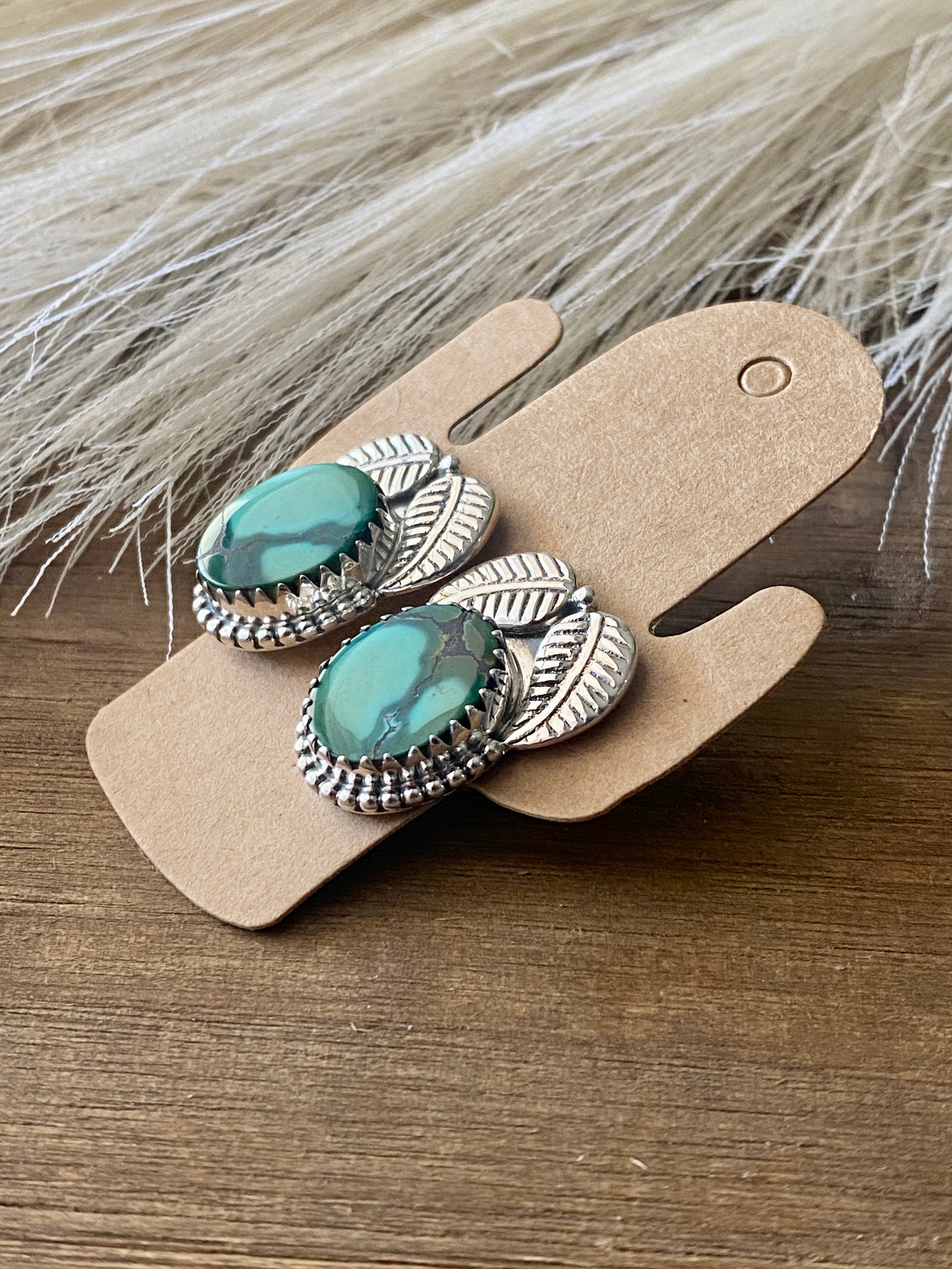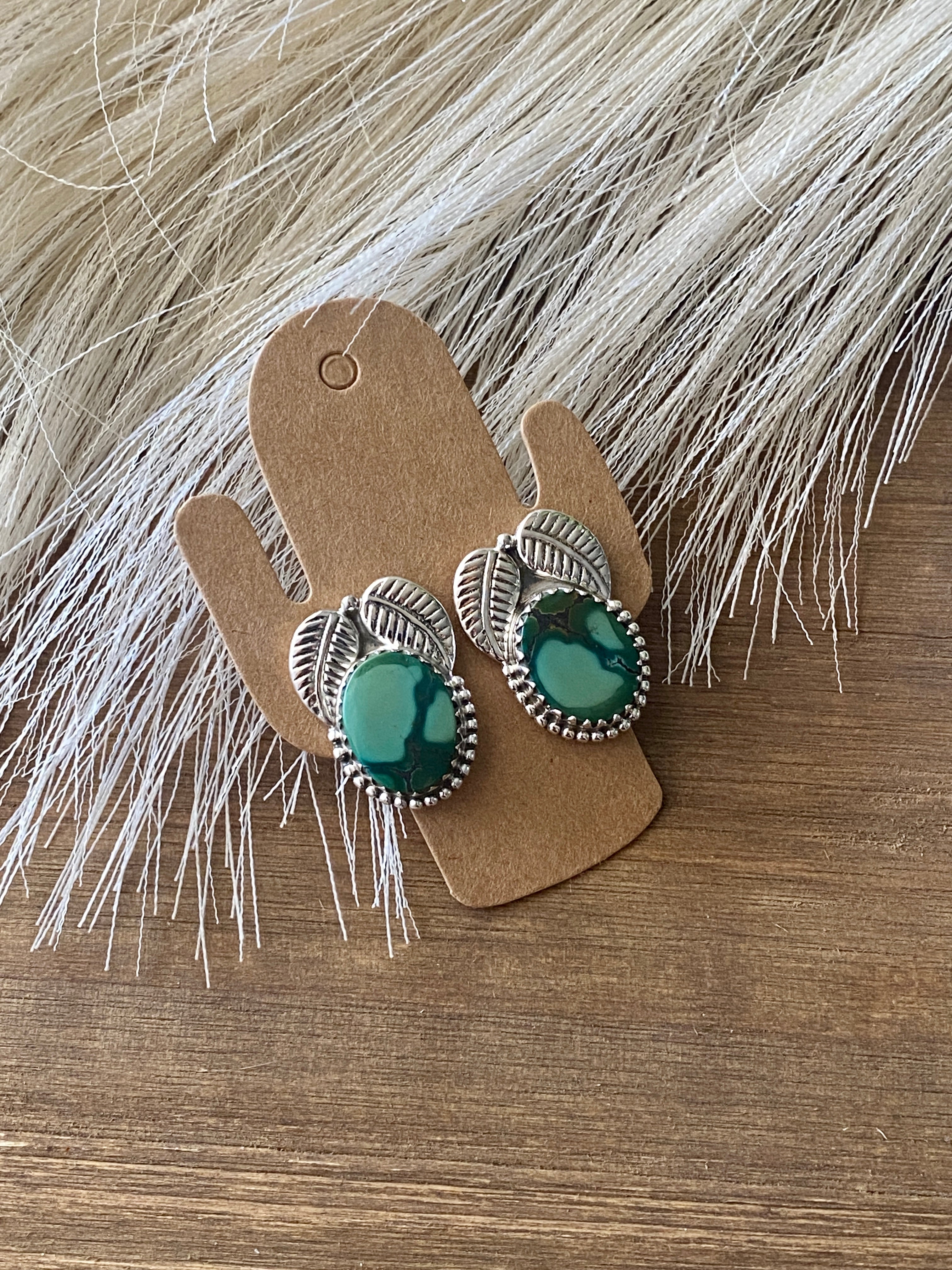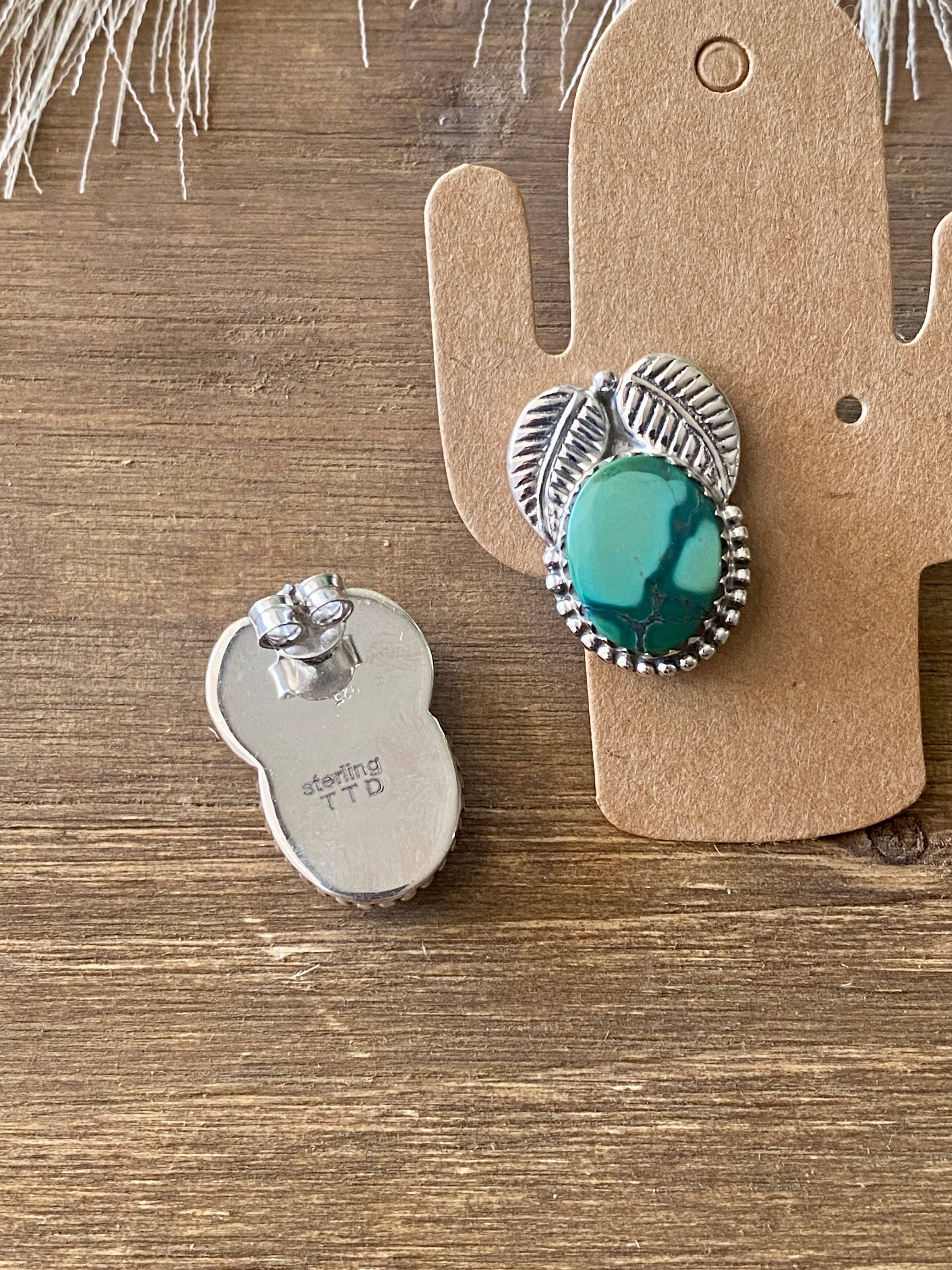 Beautiful post earrings, perfect for your everyday wear. Southwest Handmade Hubei Turquoise & Sterling Silver Post Earrings. It measures 7/8 of an inch long and 3/4 of an inch wide. Signed by the artist and stamped sterling silver.