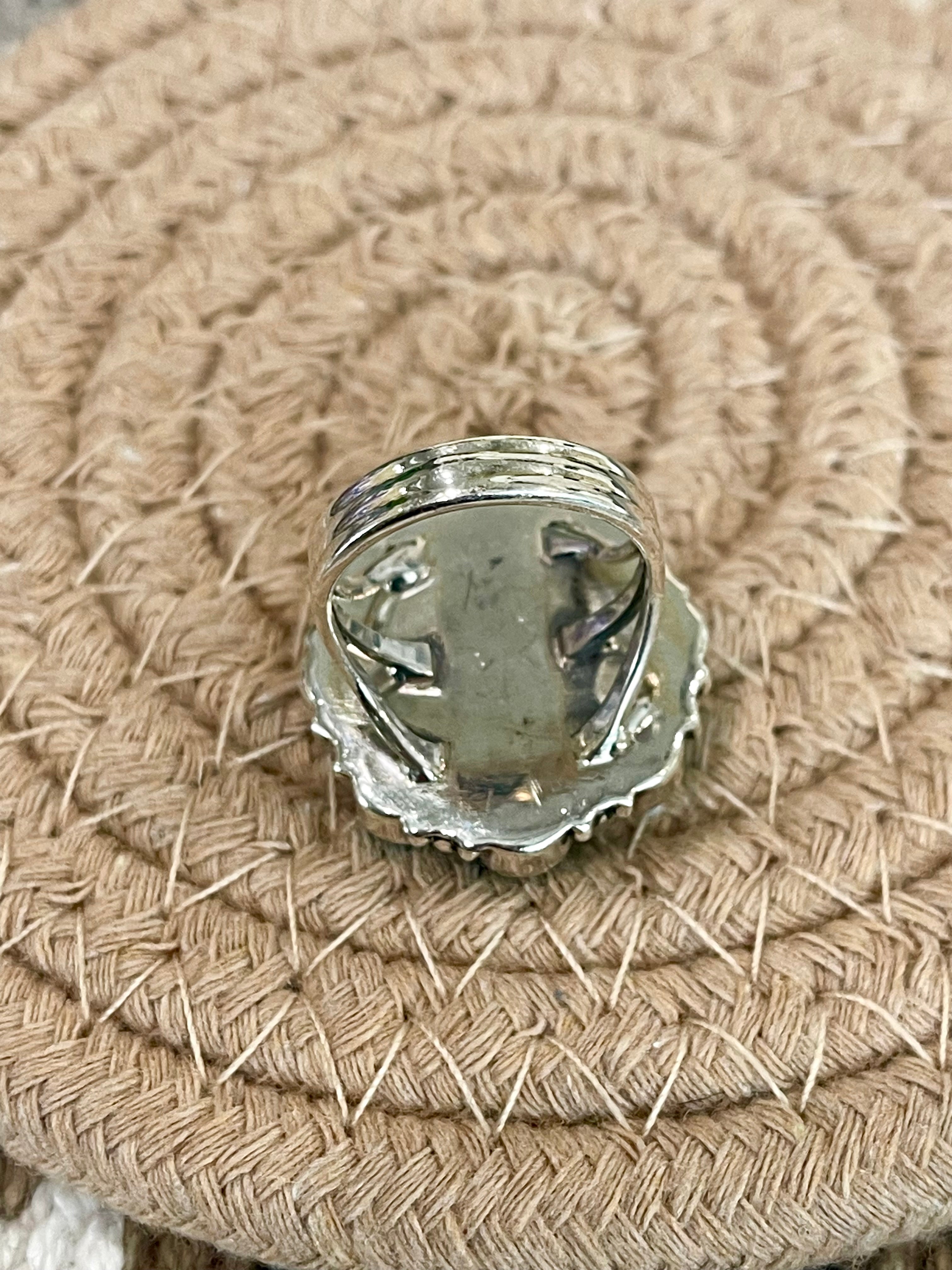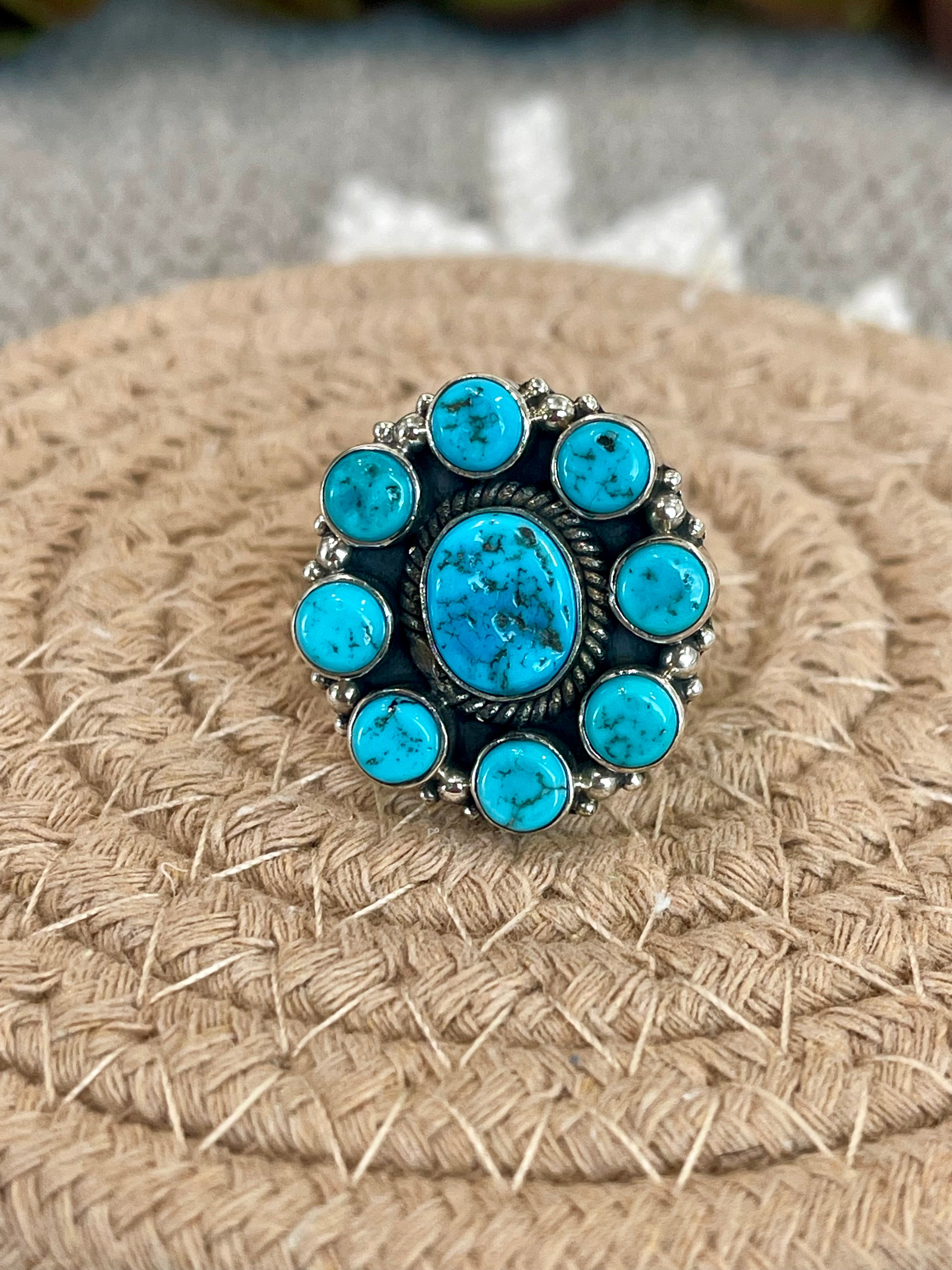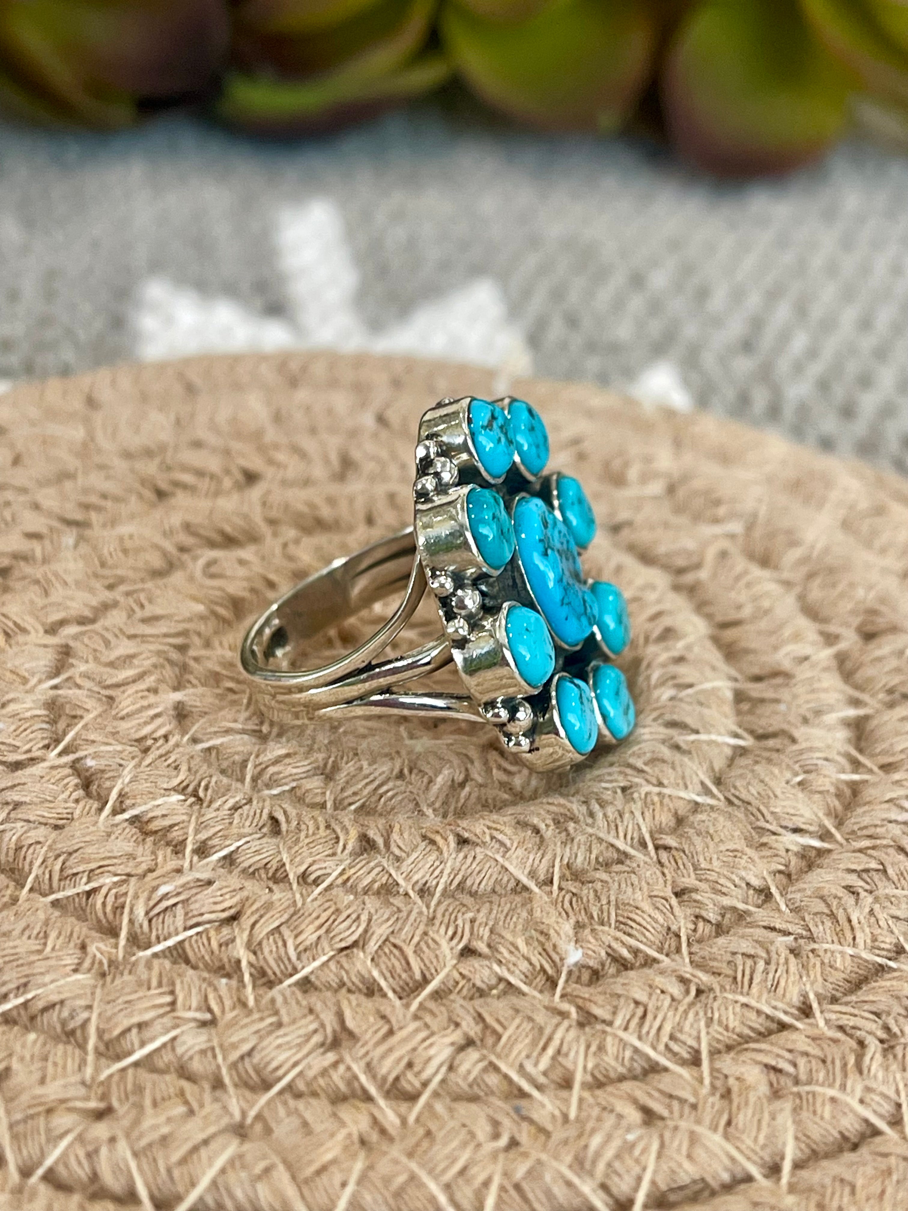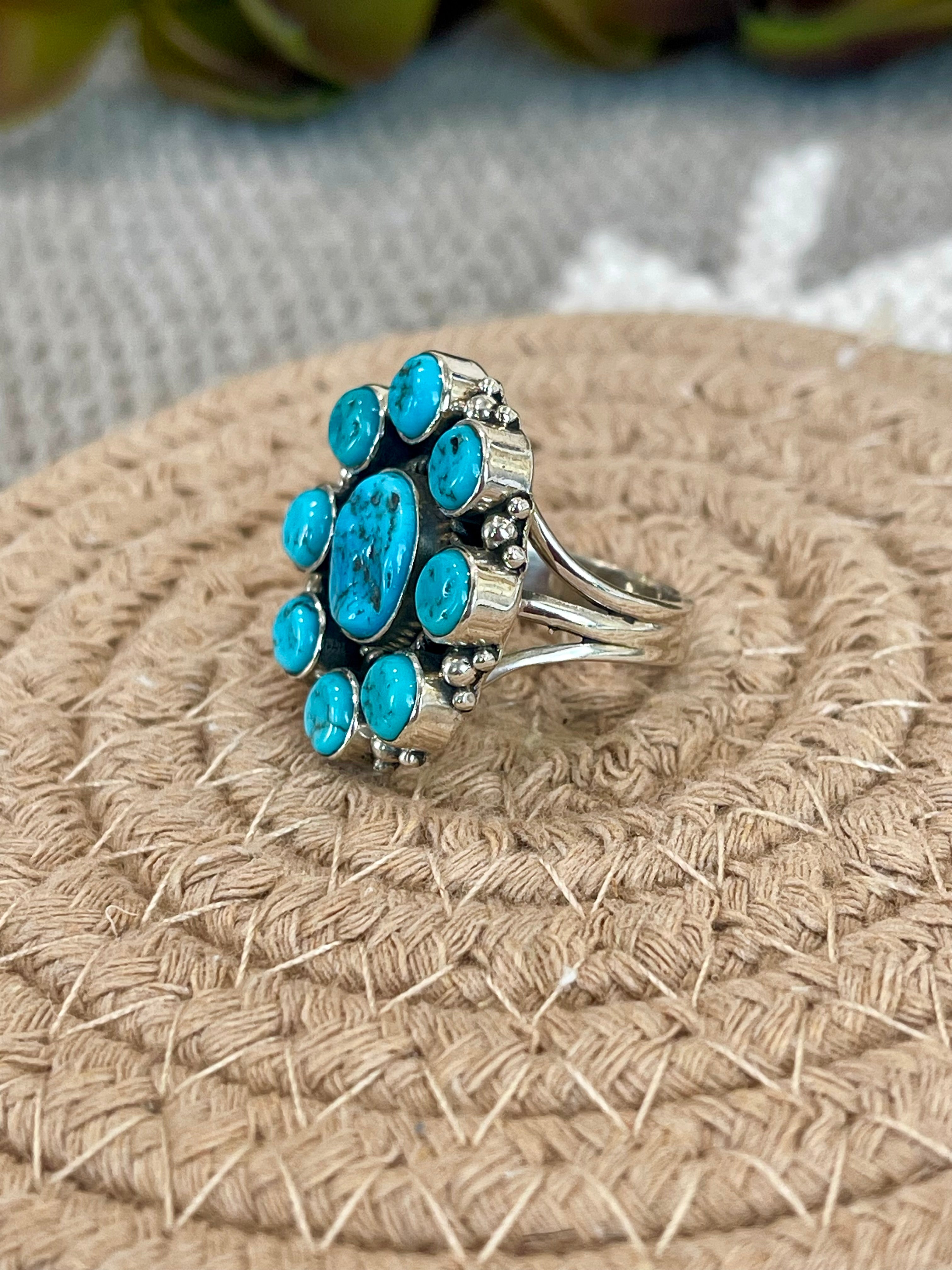 Beautiful cluster flower ring. Southwest Handmade Kingman Turquoise & Sterling Silver Size 6.5 Cluster Flower Ring. It measures 1” round. Size 6.5 . Signed by the artist and stamped sterling silver.