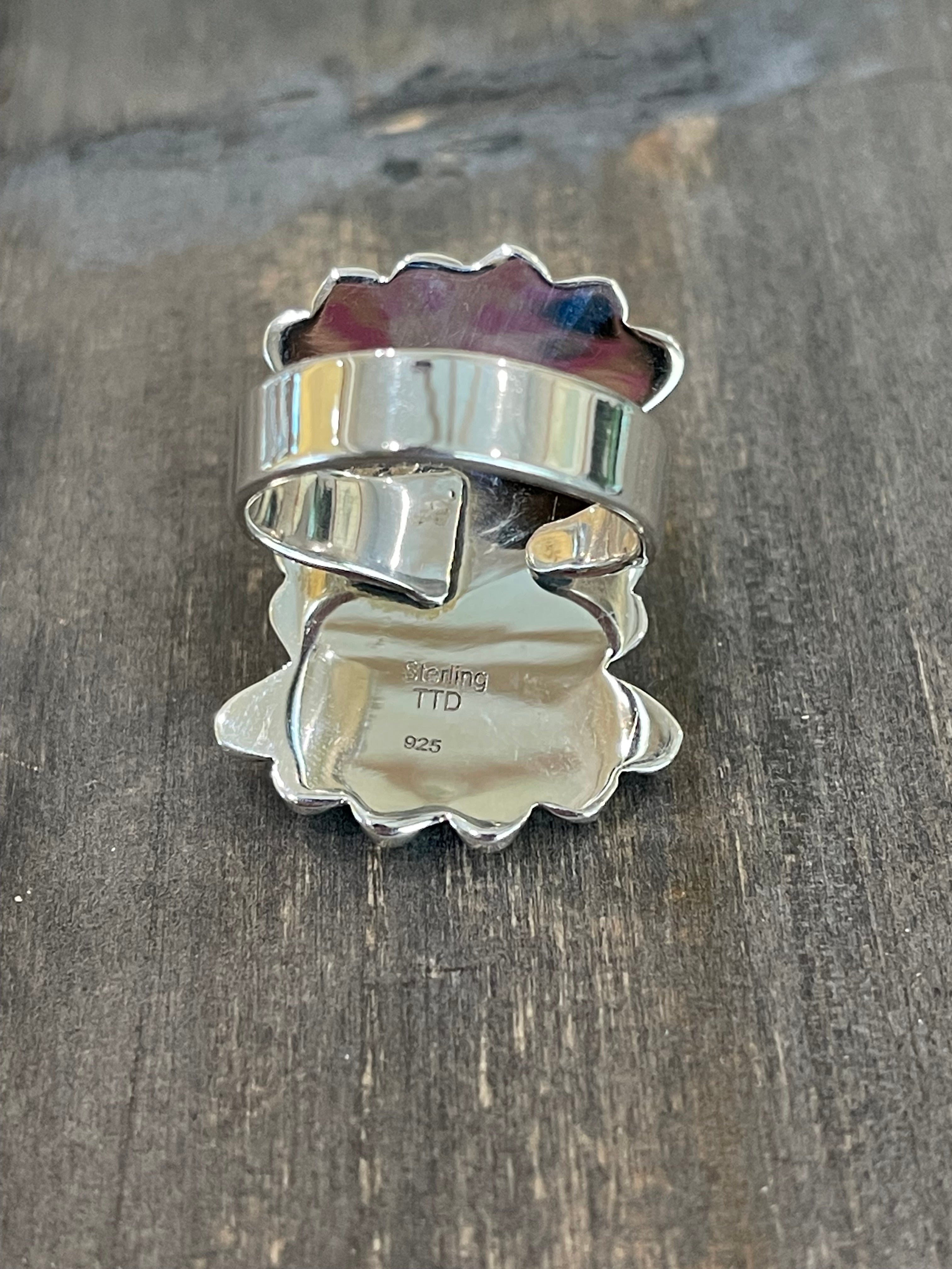 Beautiful ring. Southwest Handmade Peruvian Pink Opal & Sterling Silver Adjustable Ring. It measures 1 1/4 inches long and just under an inch wide. Signed by the artist and stamped sterling silver.
