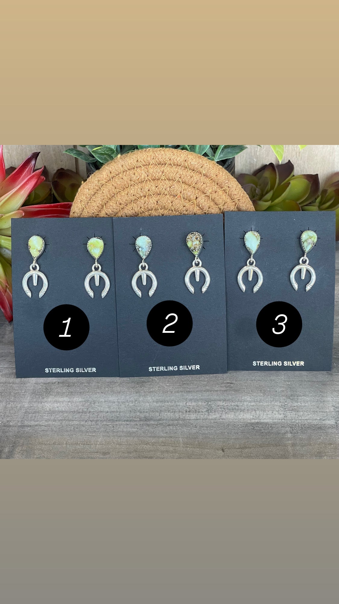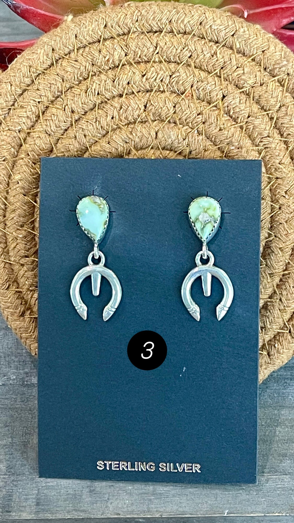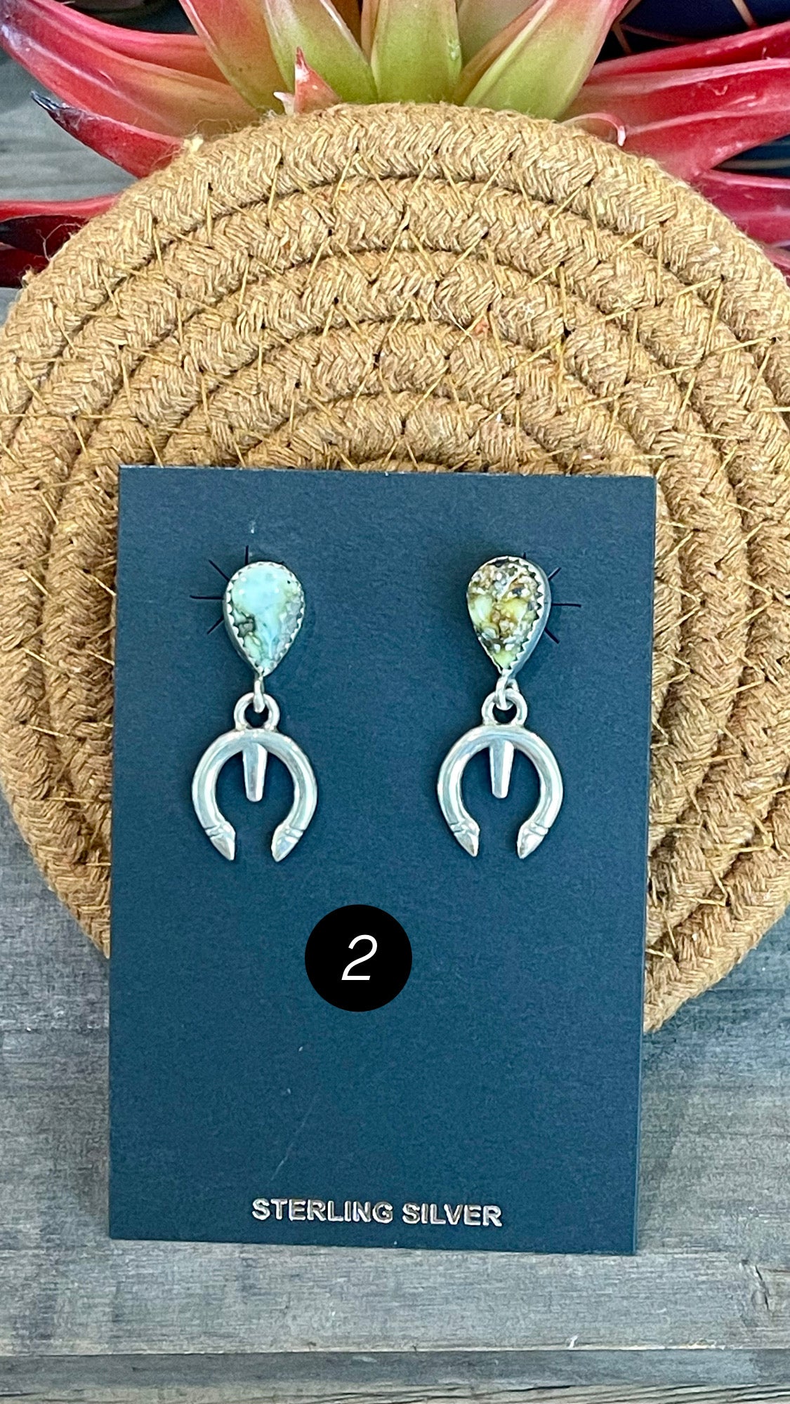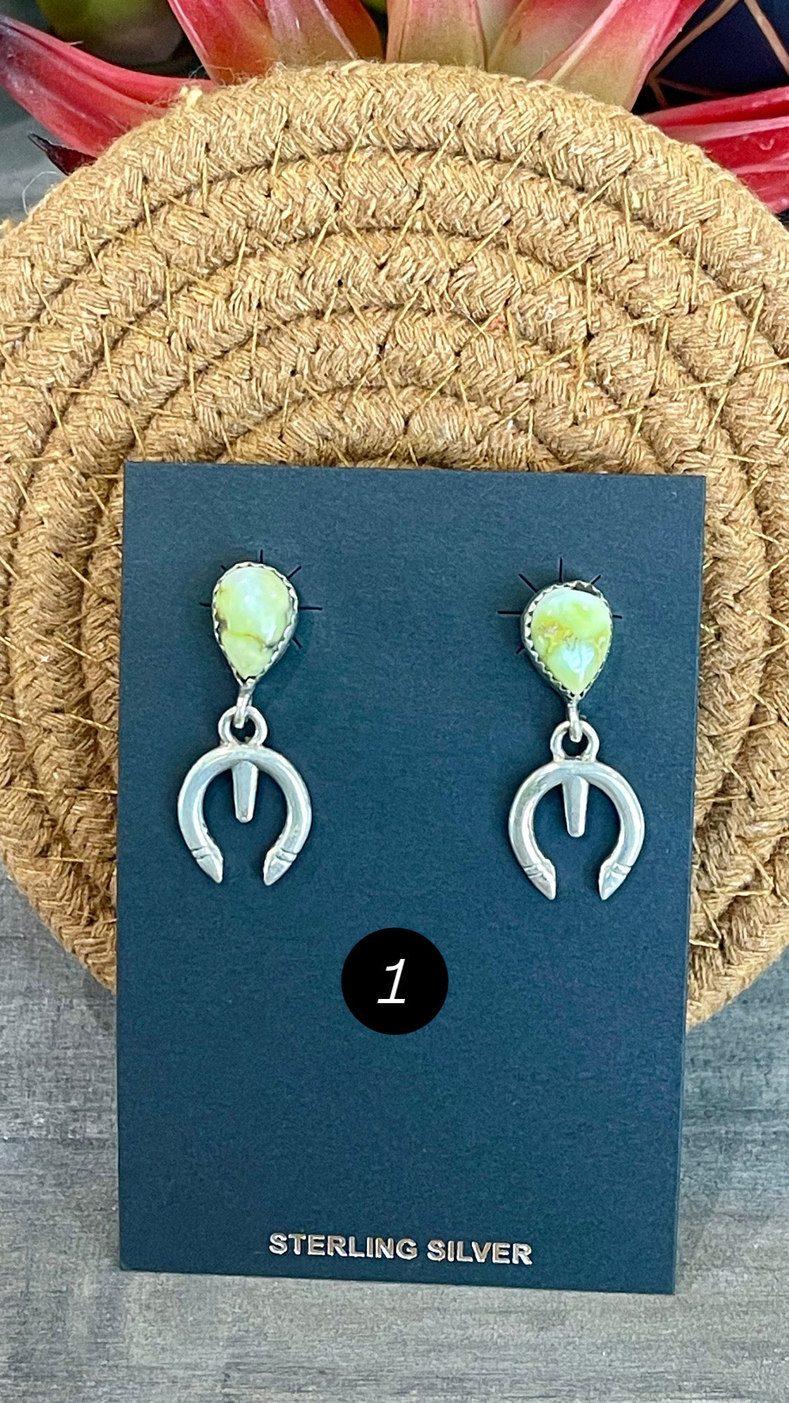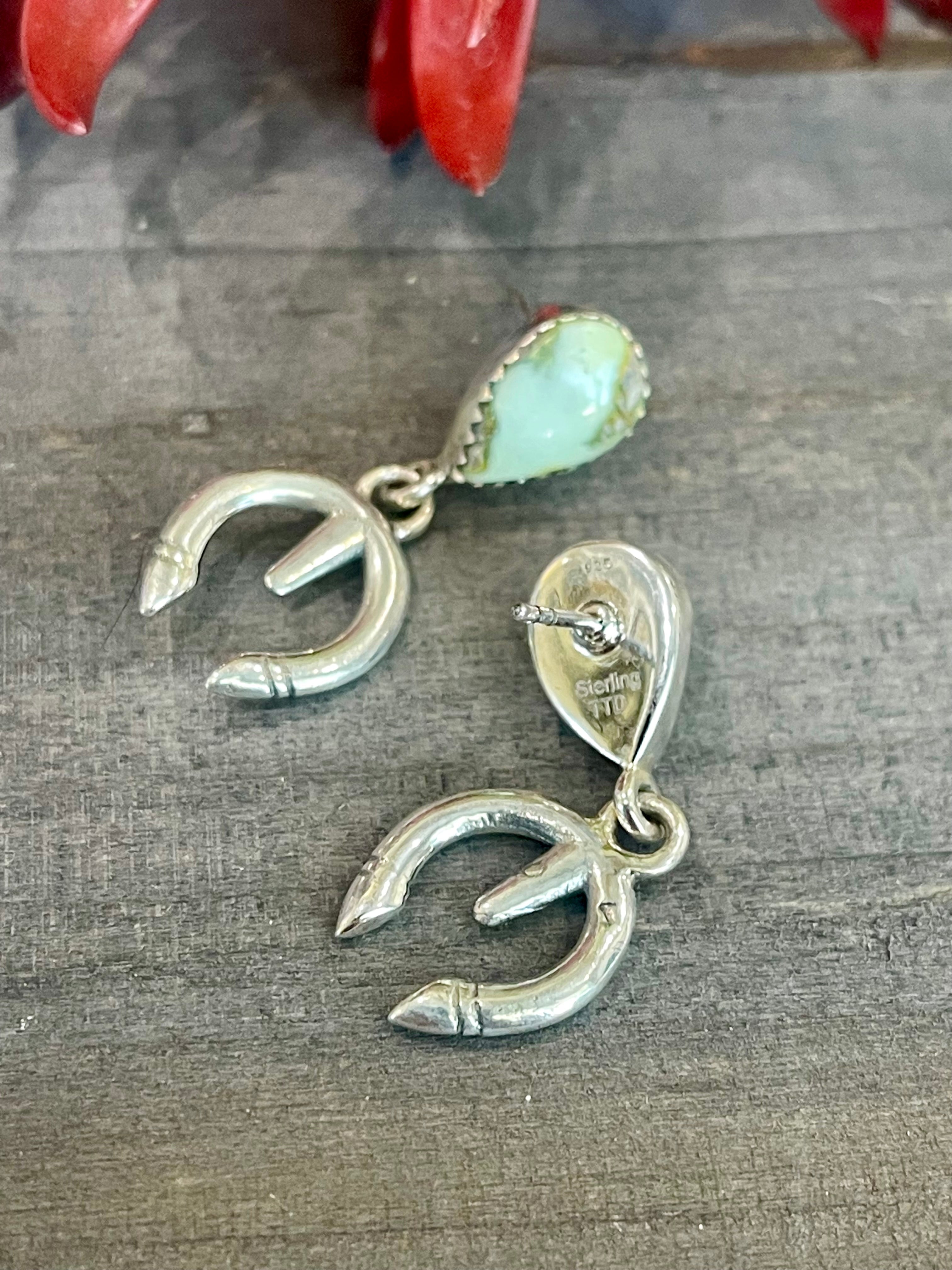Breathtaking earrings. Southwest Handmade Palomino Variscite & Sterling Silver Post Dangle Naja Earrings. They measures 1 3/8 inches long and just over 1/2 of an inch wide. Stamped sterling silver.