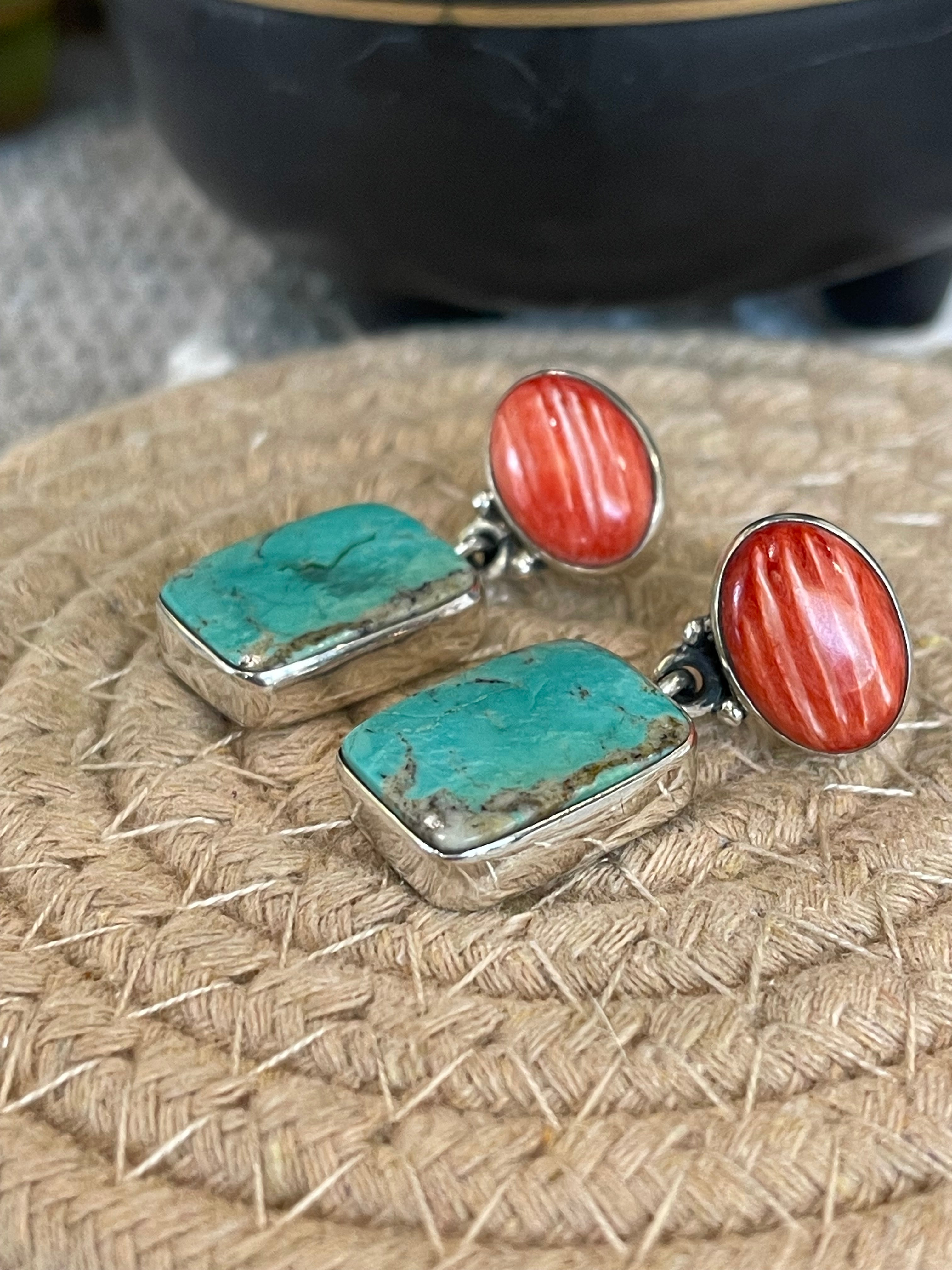 Breathtaking earrings. Southwest Handmade Multi Stone & Sterling Silver Post Dangle Earrings. It measures 1 3/8 inches long and 1/2 of an inch wide. Signed by the artist and stamped sterling silver.