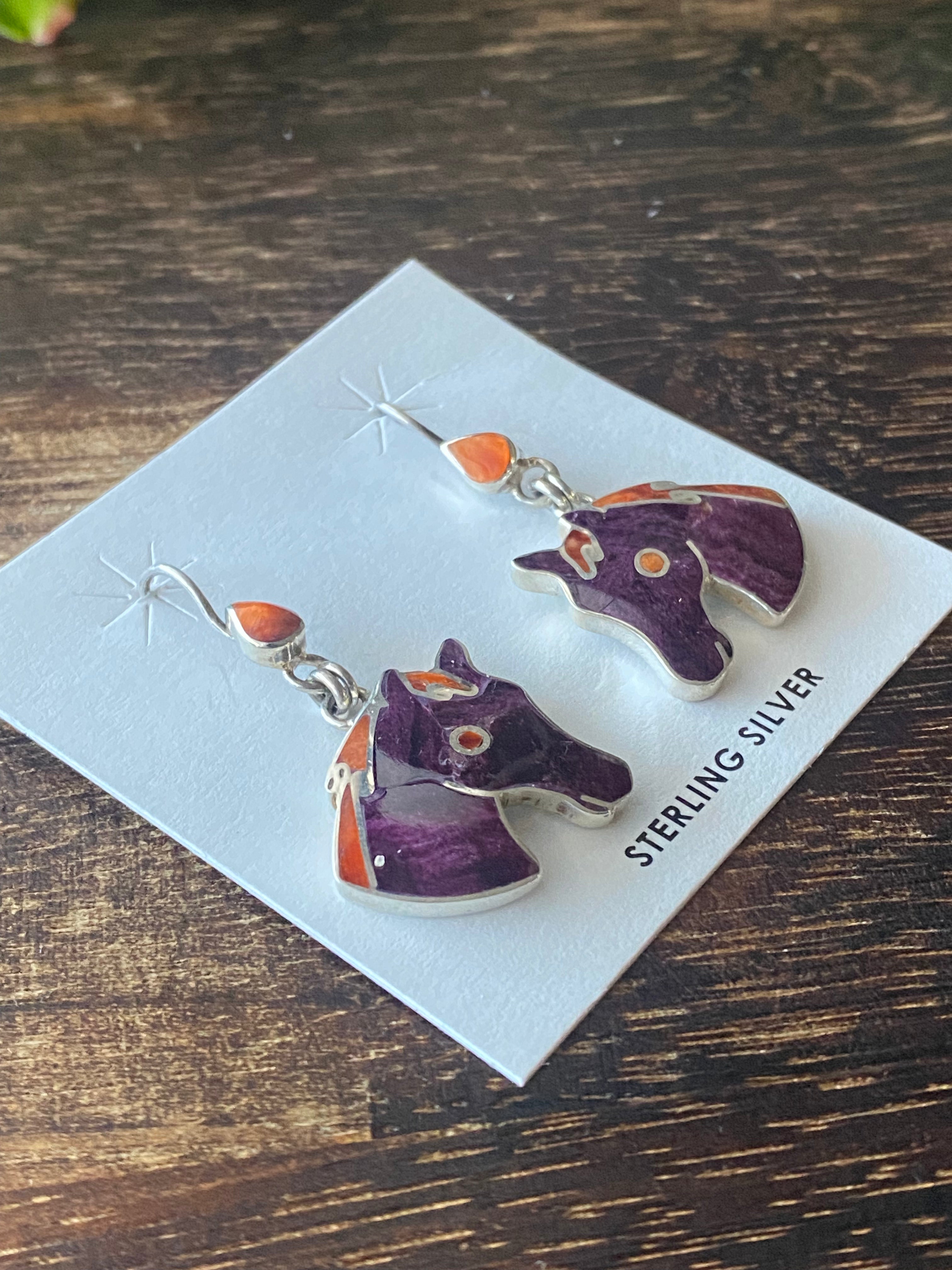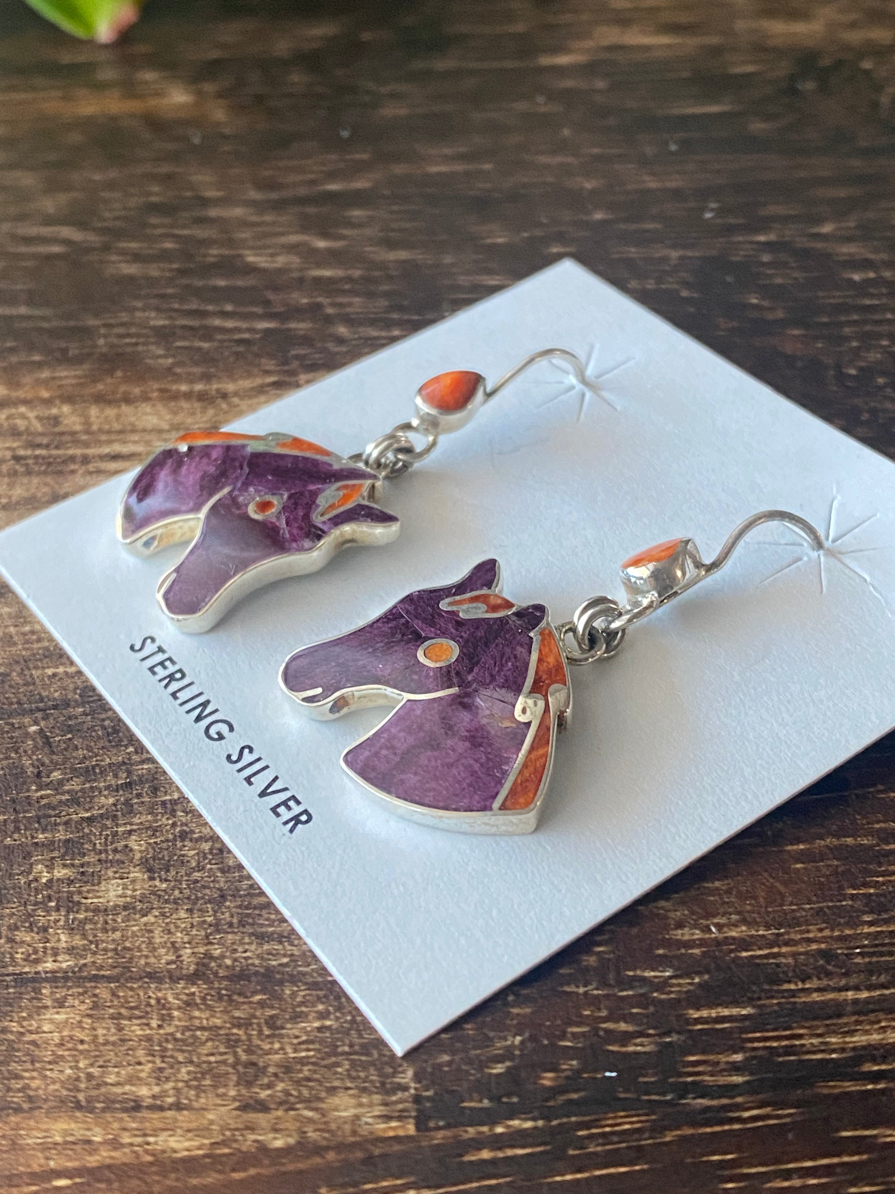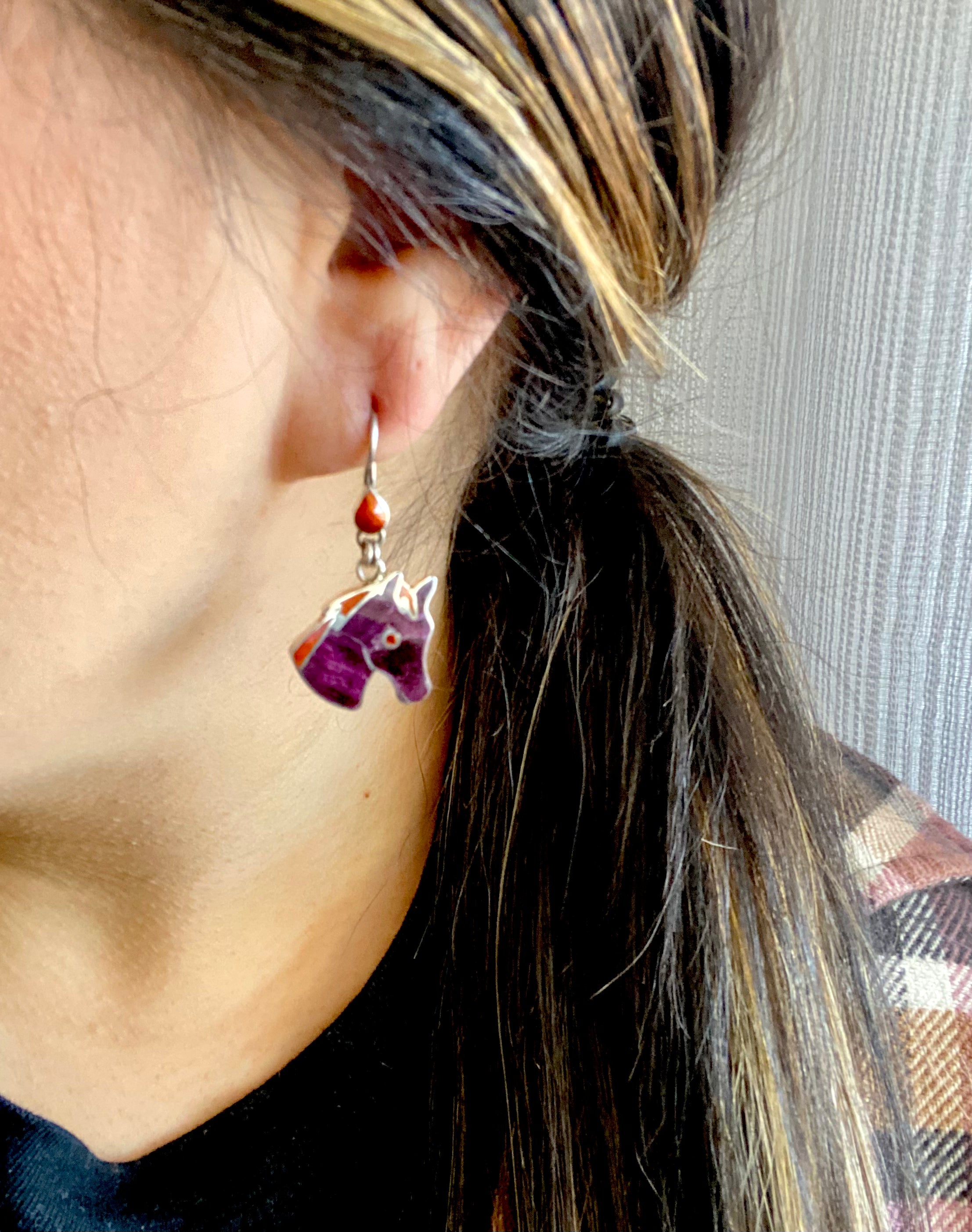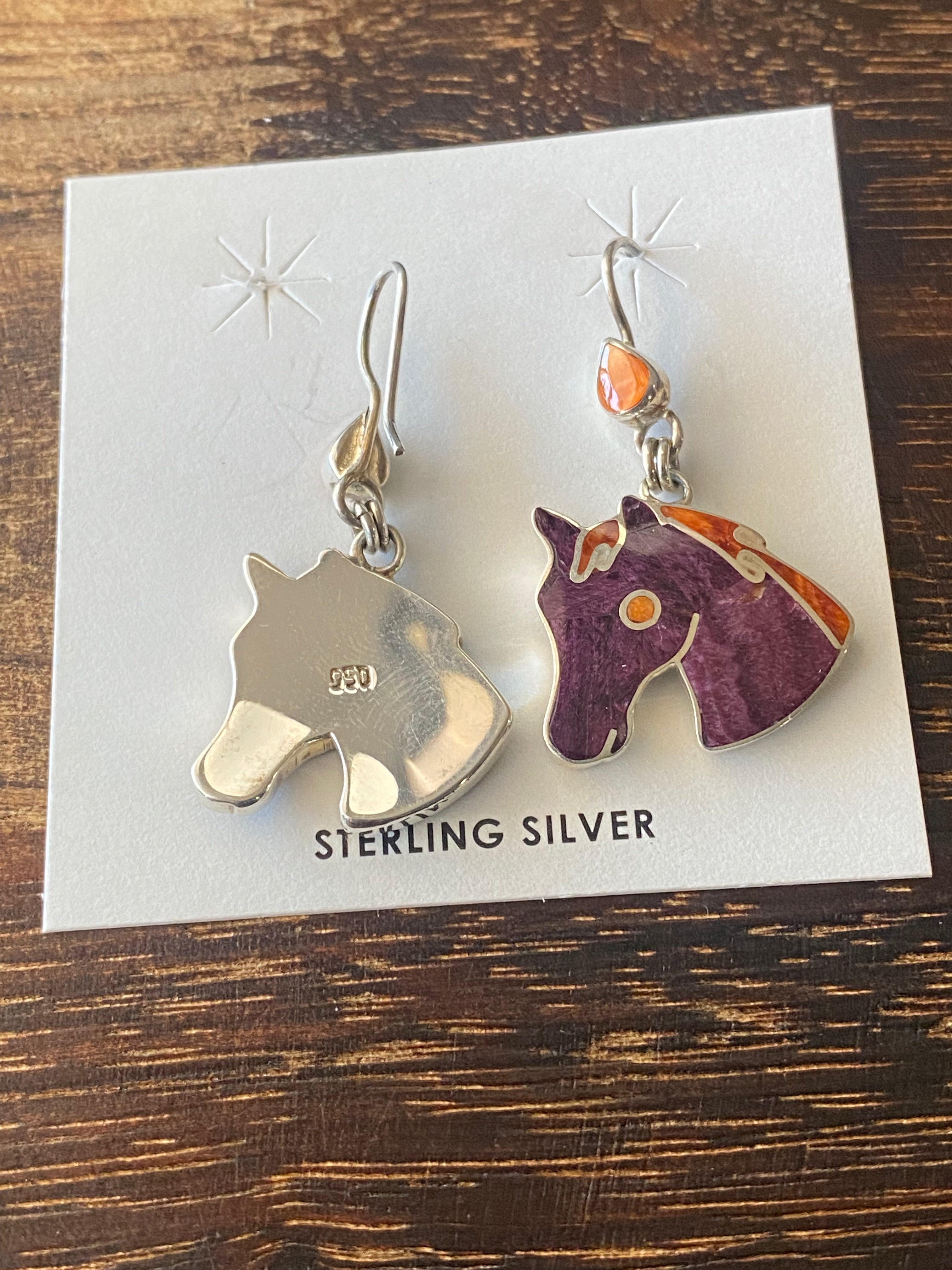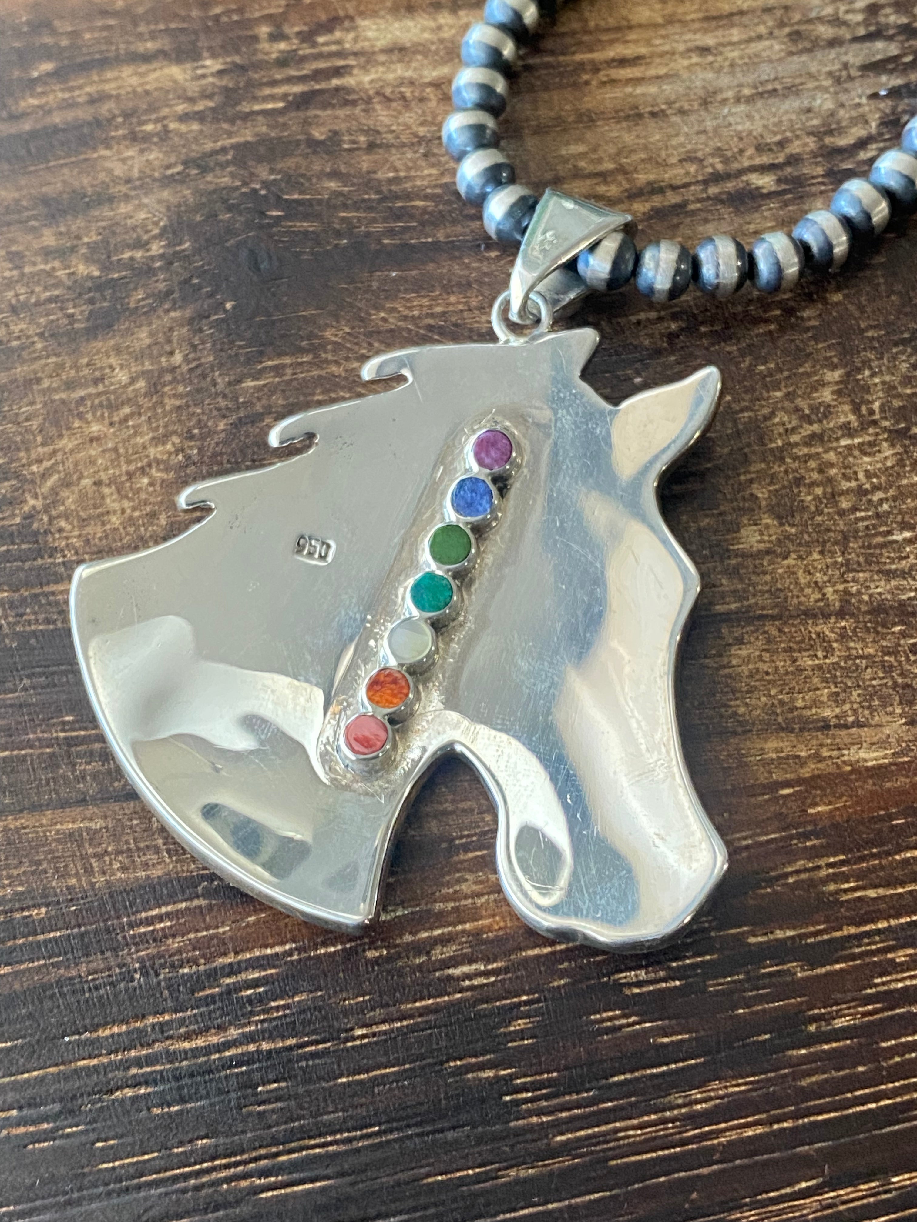 Southwest Handmade Multi Stone & Silver Inlay Pendant/Earring Set. The pendant measures 2 5/8 inches long and just under 2 1/4 inches wide while the earrings measure 1 5/8 inches long and 7/8 of an inch wide. Necklace not included. Stamped .950 silver.