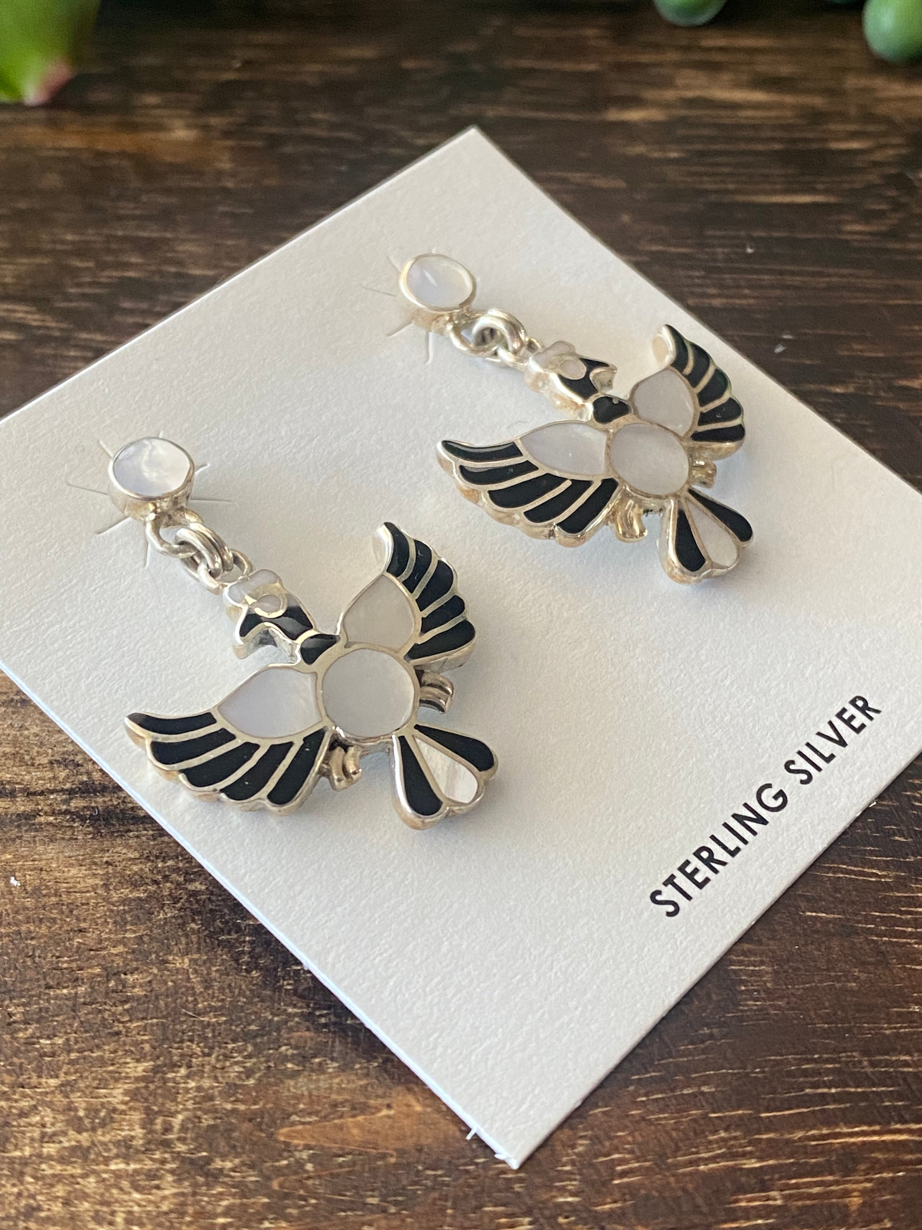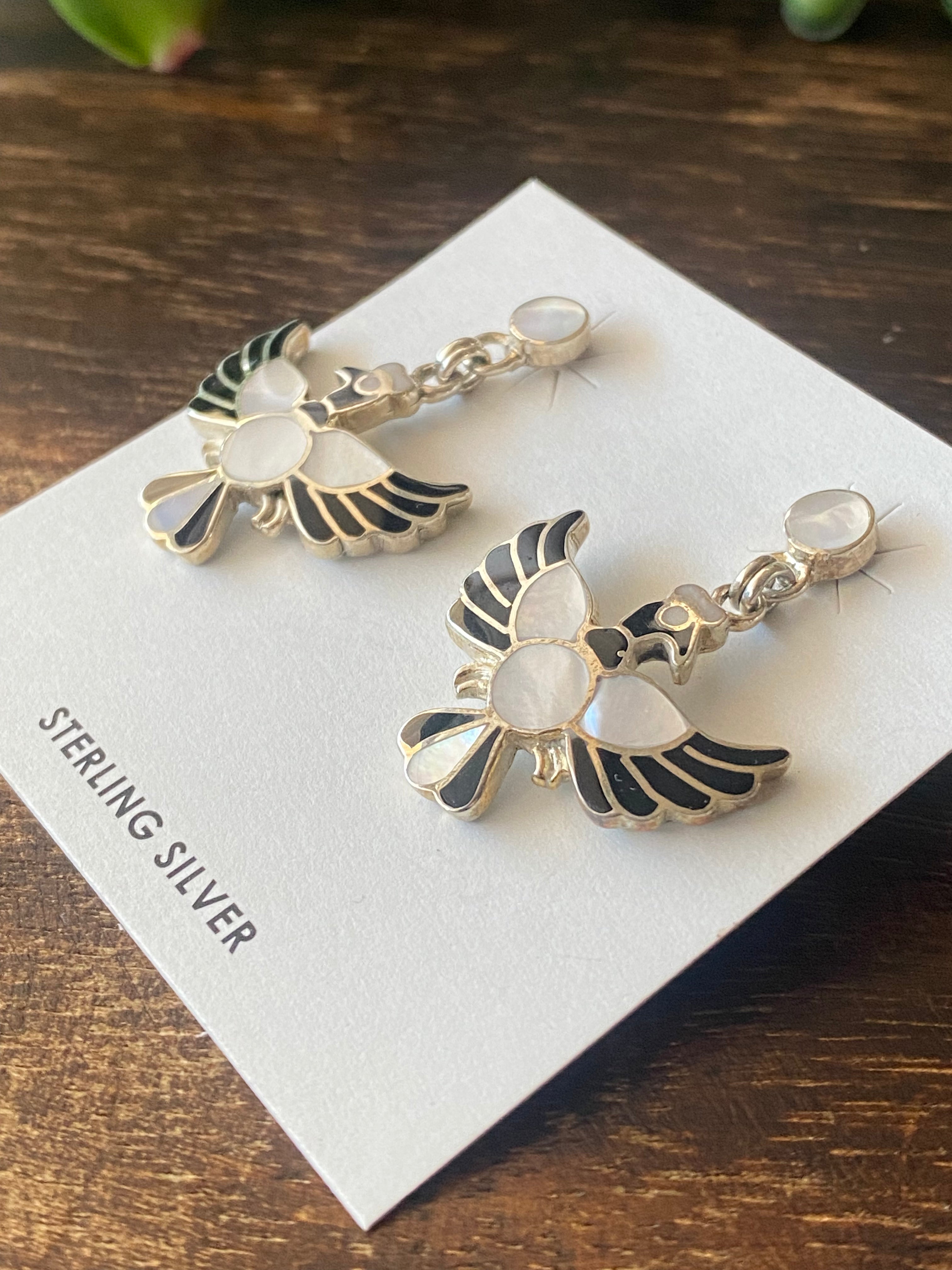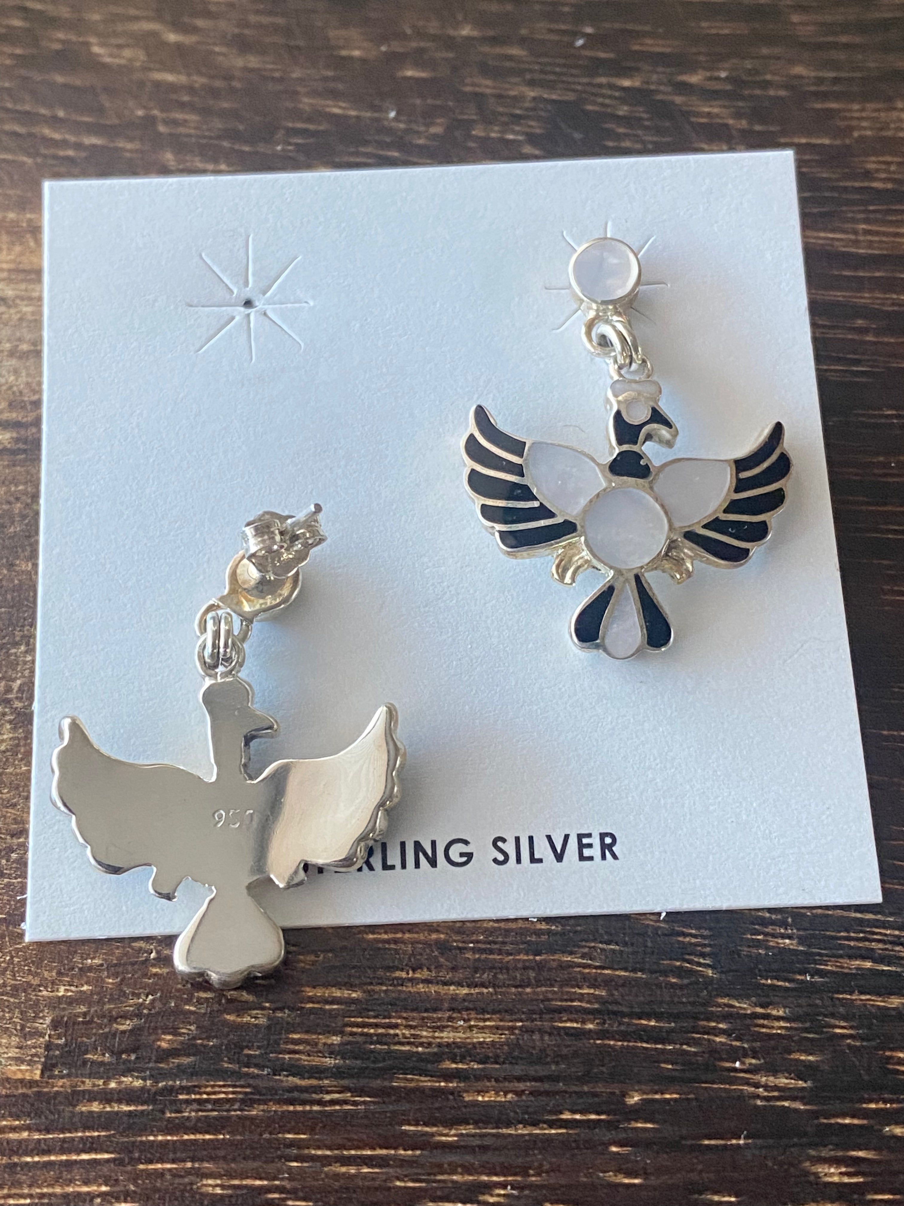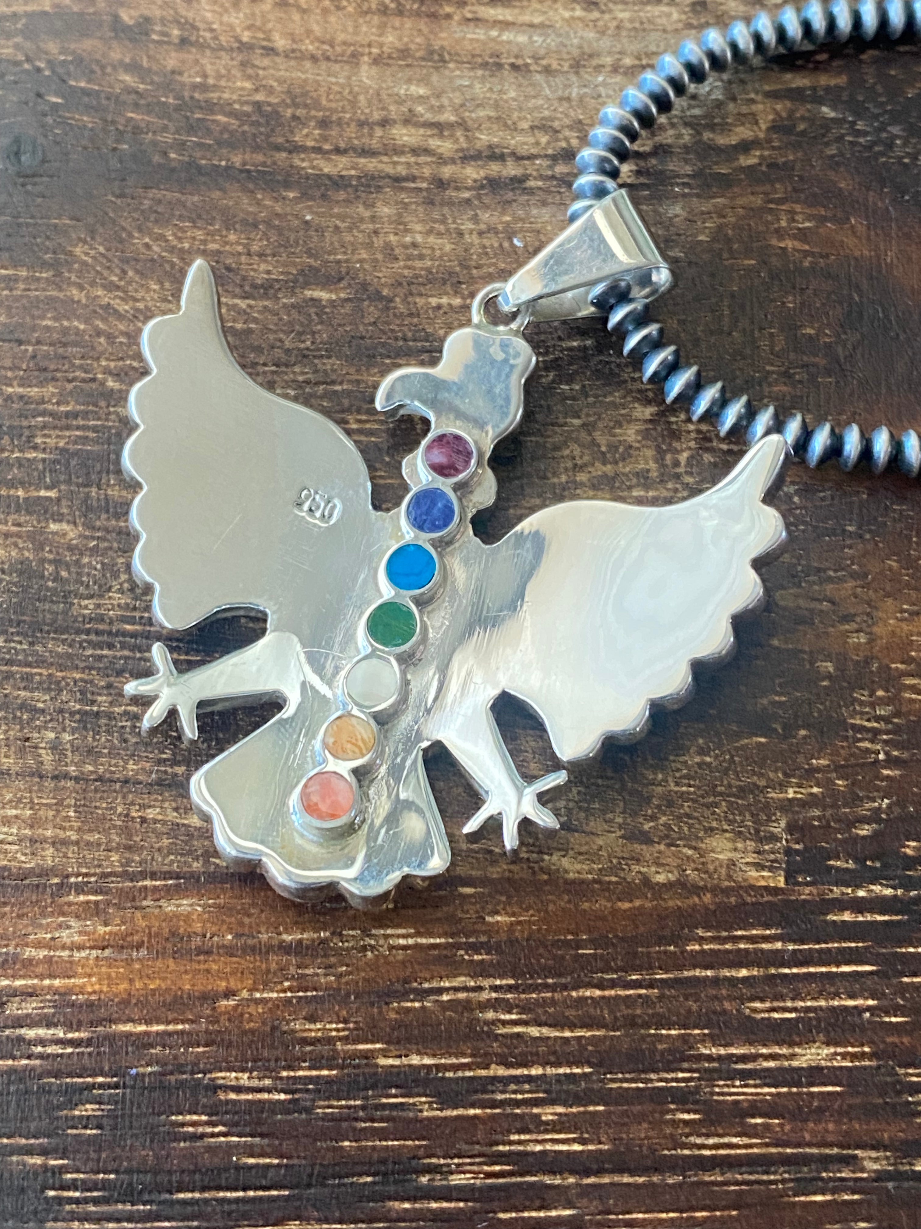Southwest Handmade Multi Stone & Silver Inlay Pendant/Earring Set. The pendant measures 2 1/8 inches long and 1 3/4 inches wide while the earrings measure 1 3/8 inches long and just under 1 inch wide. Necklace not included. Stamped .950 silver.