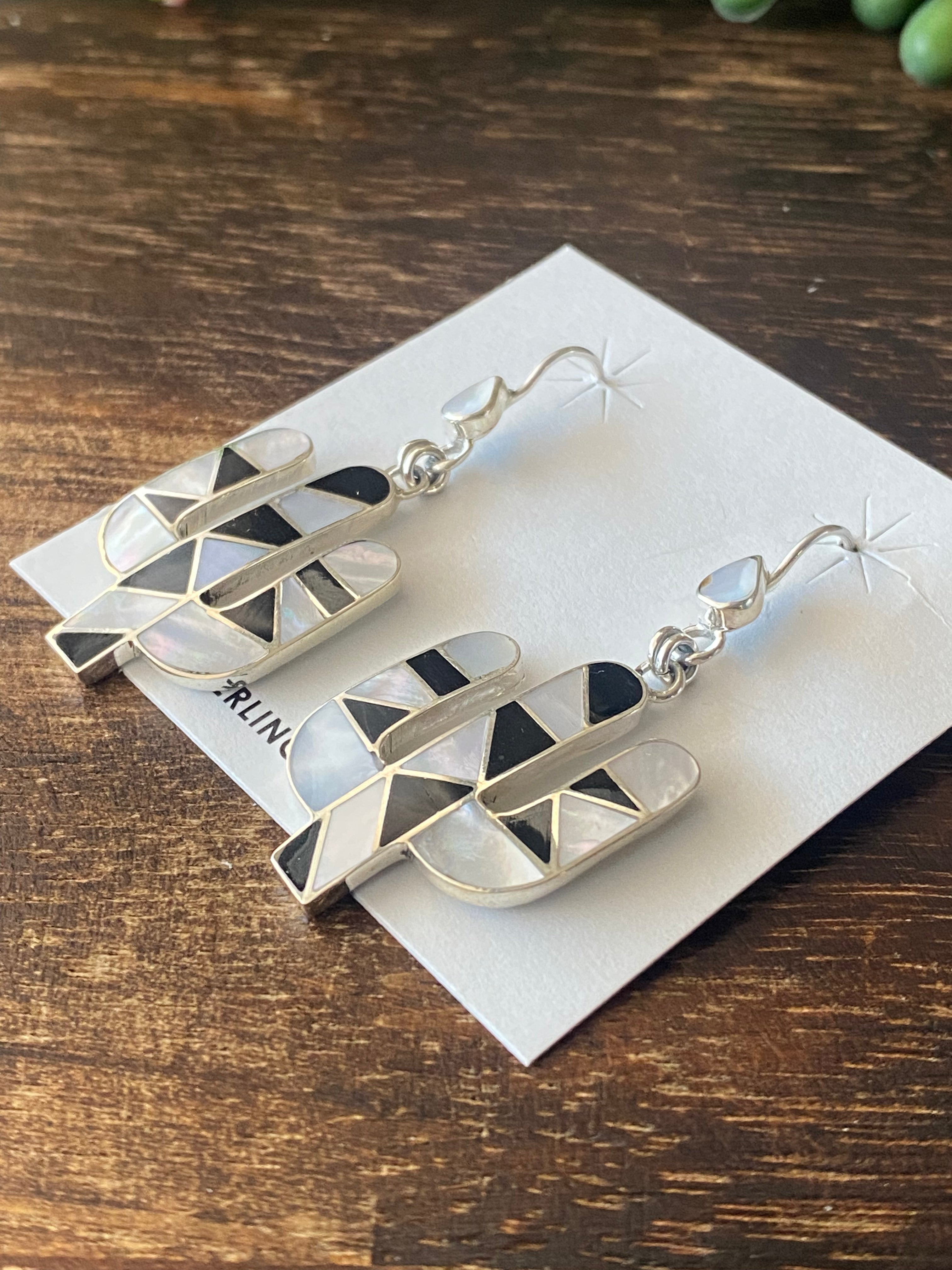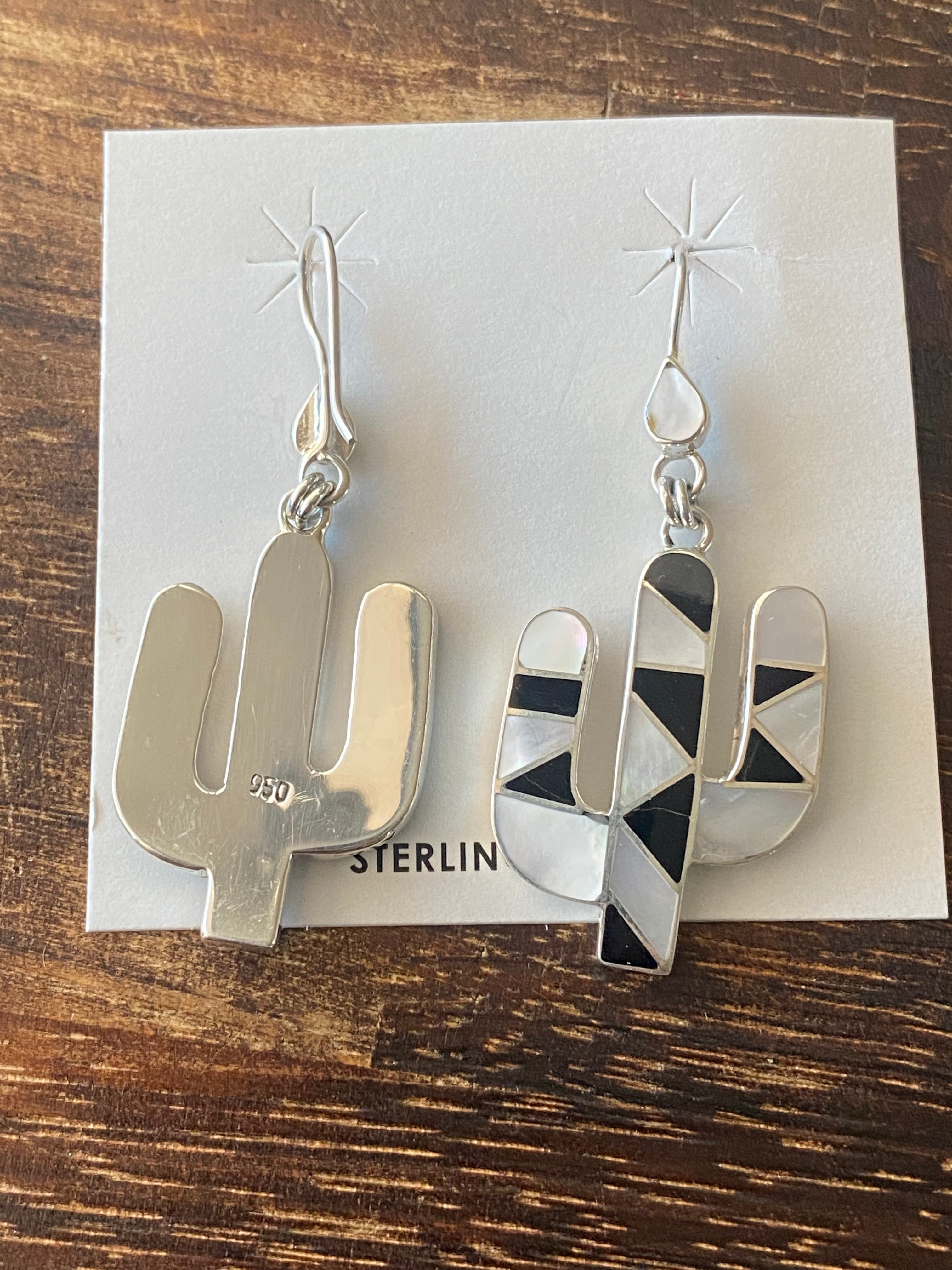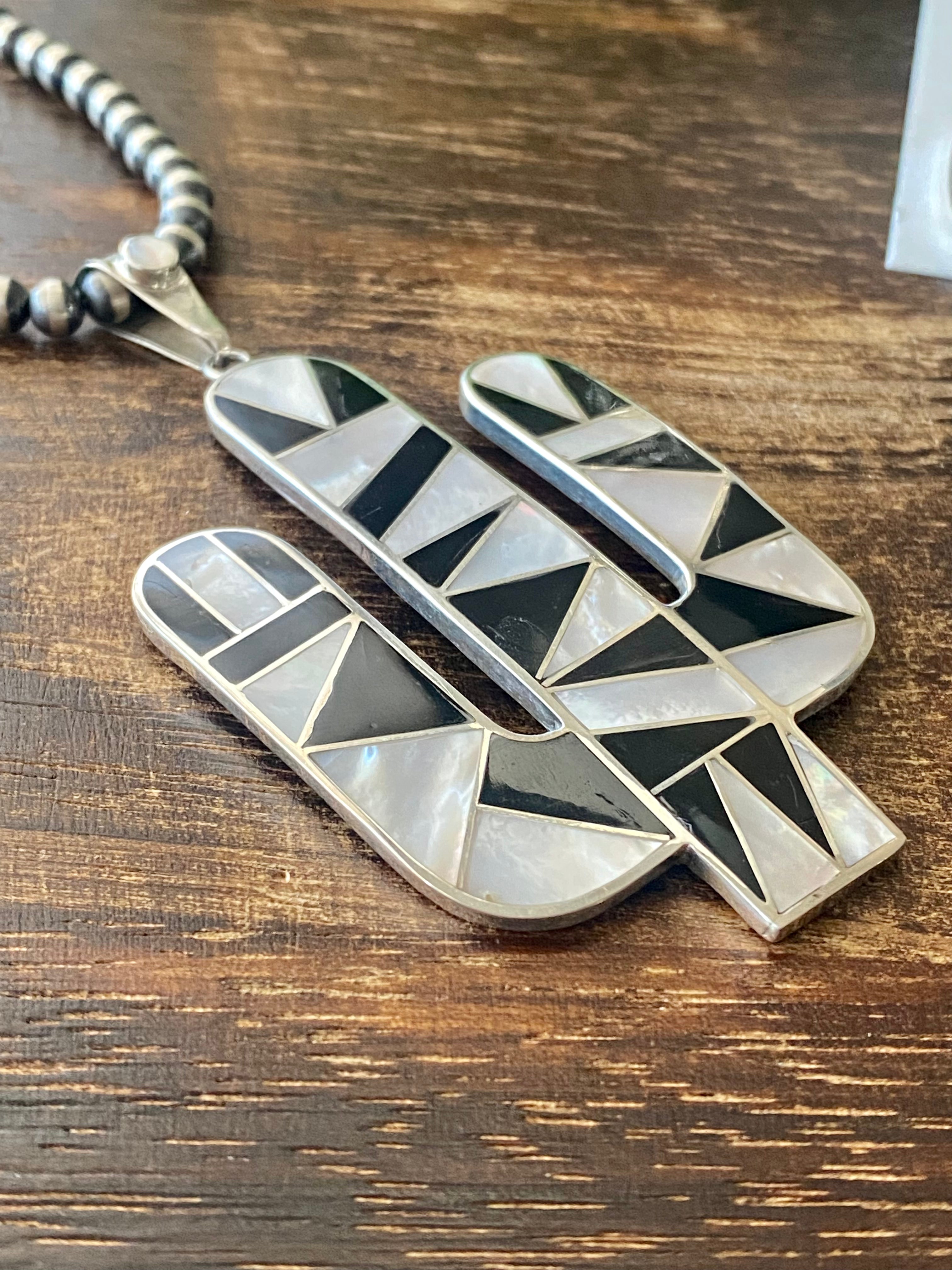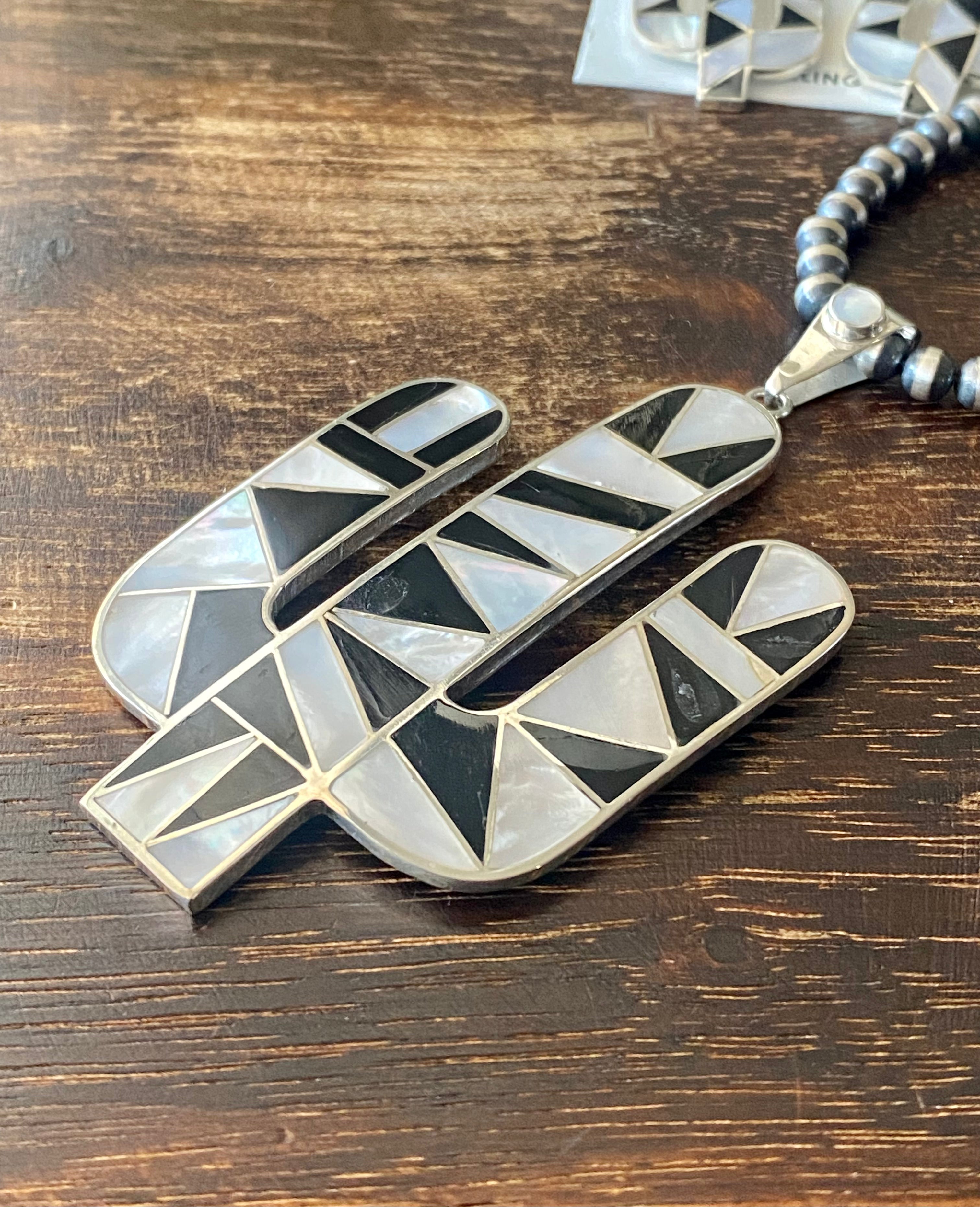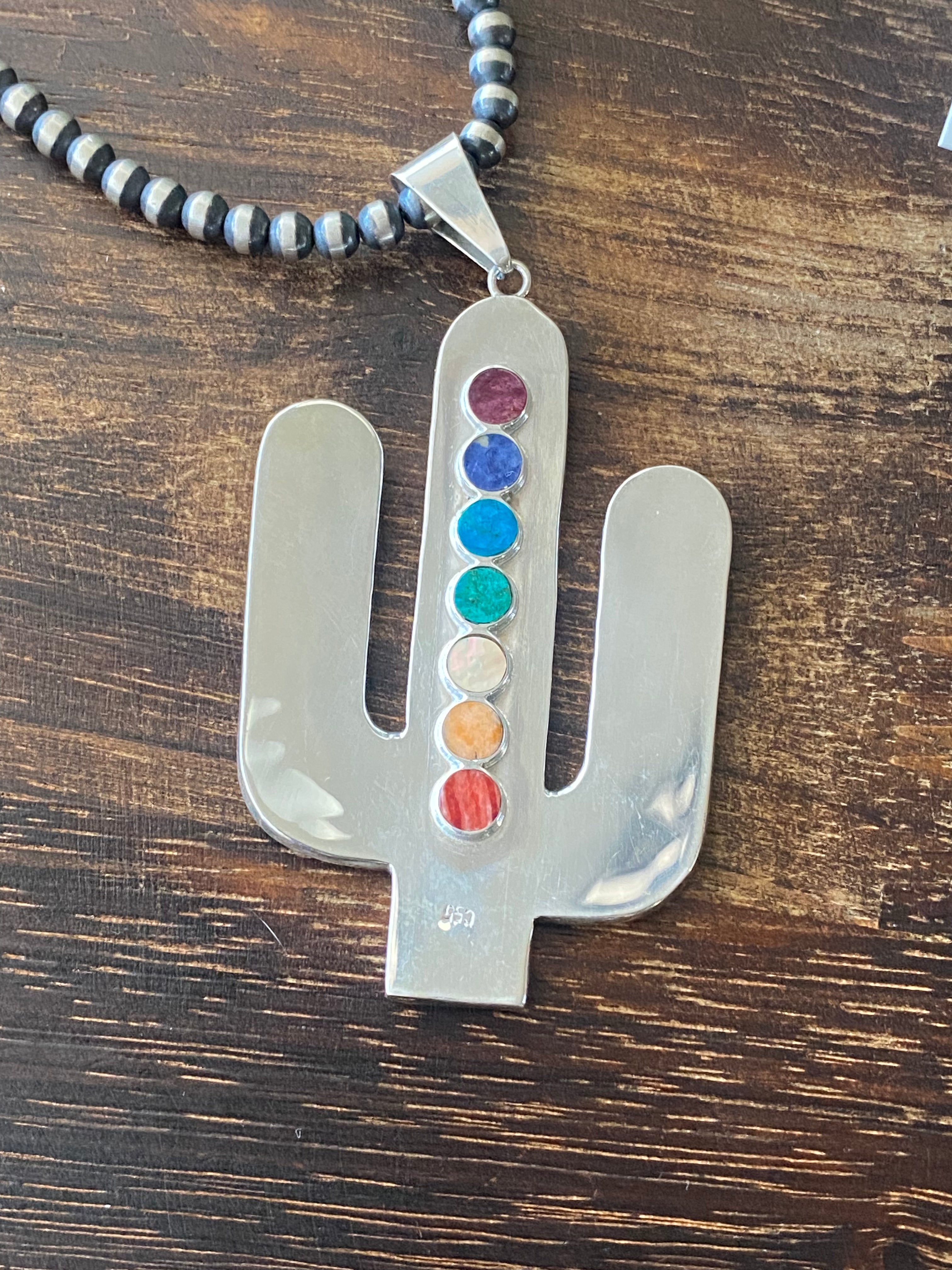 Southwest Handmade Multi Stone & Silver Inlay Pendant/Earring Set. The pendant measures just over 3 1/2 inches long and 1 7/8 inches wide while the earrings measure just over 2 inches long and 7/8 of an inch wide. Necklace not included. Stamped .950 silver.